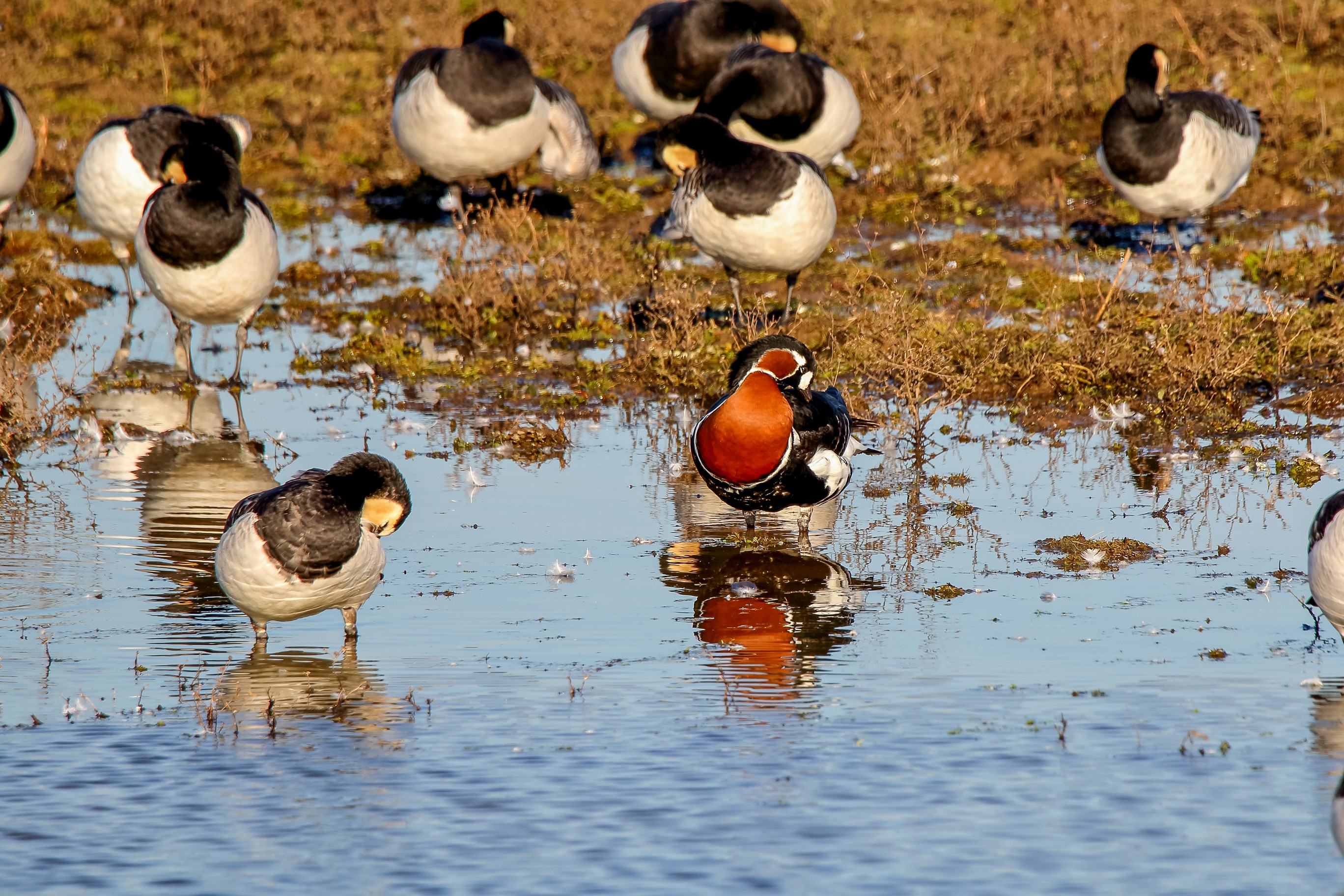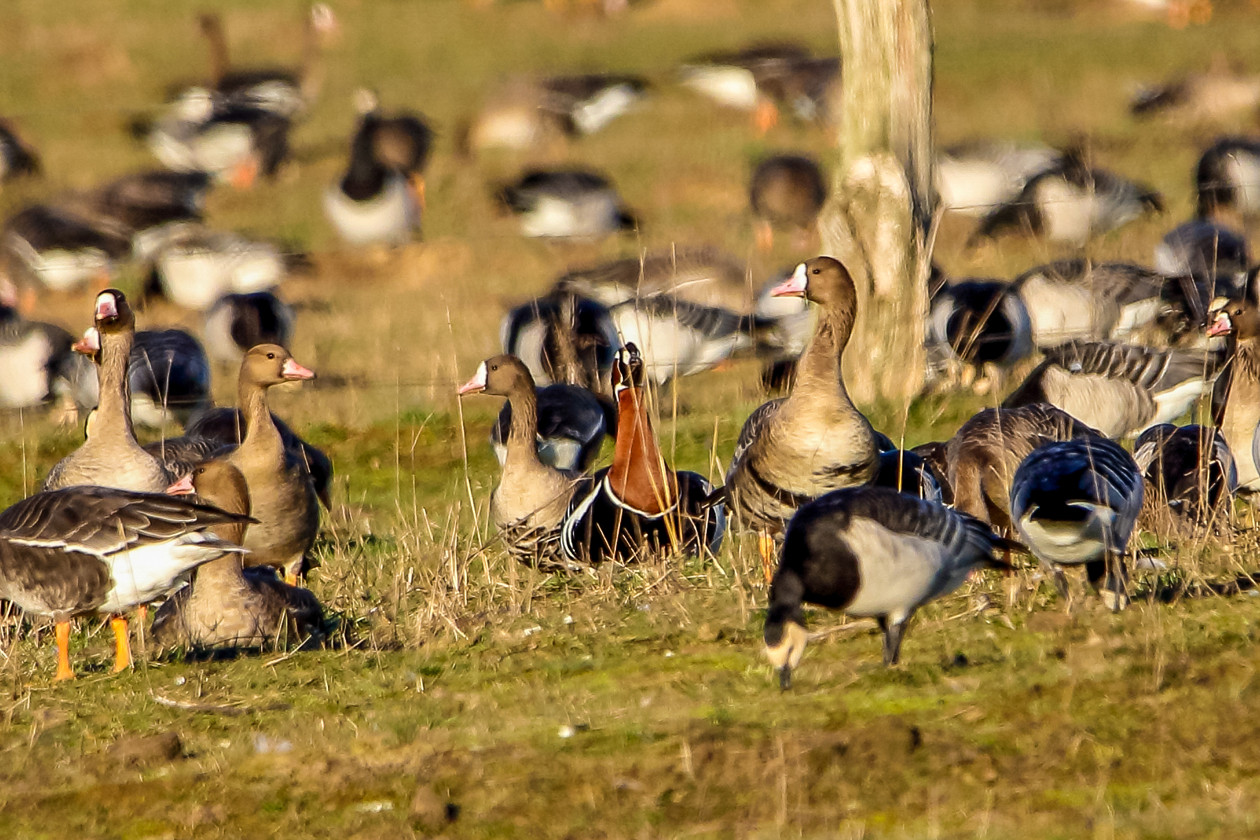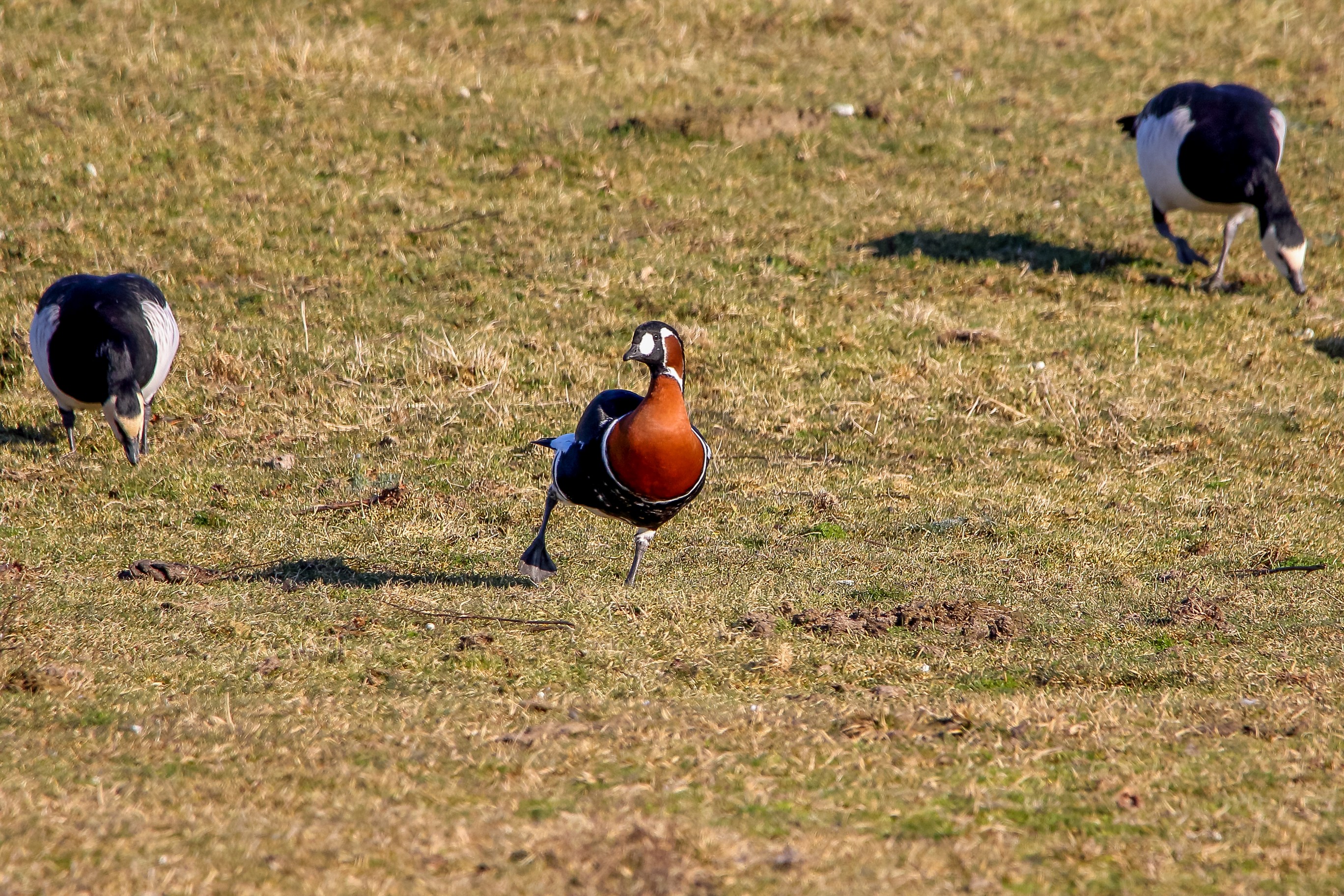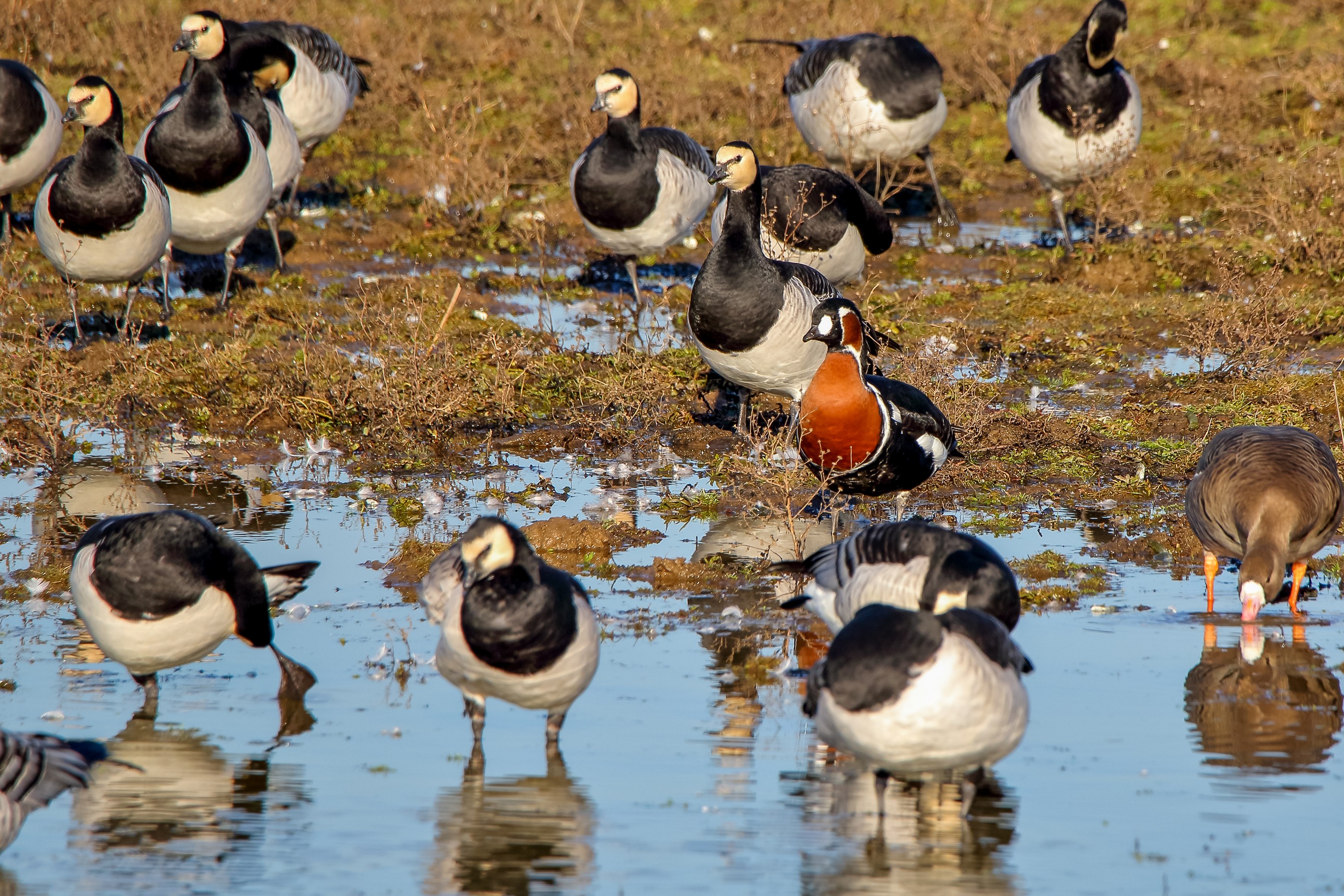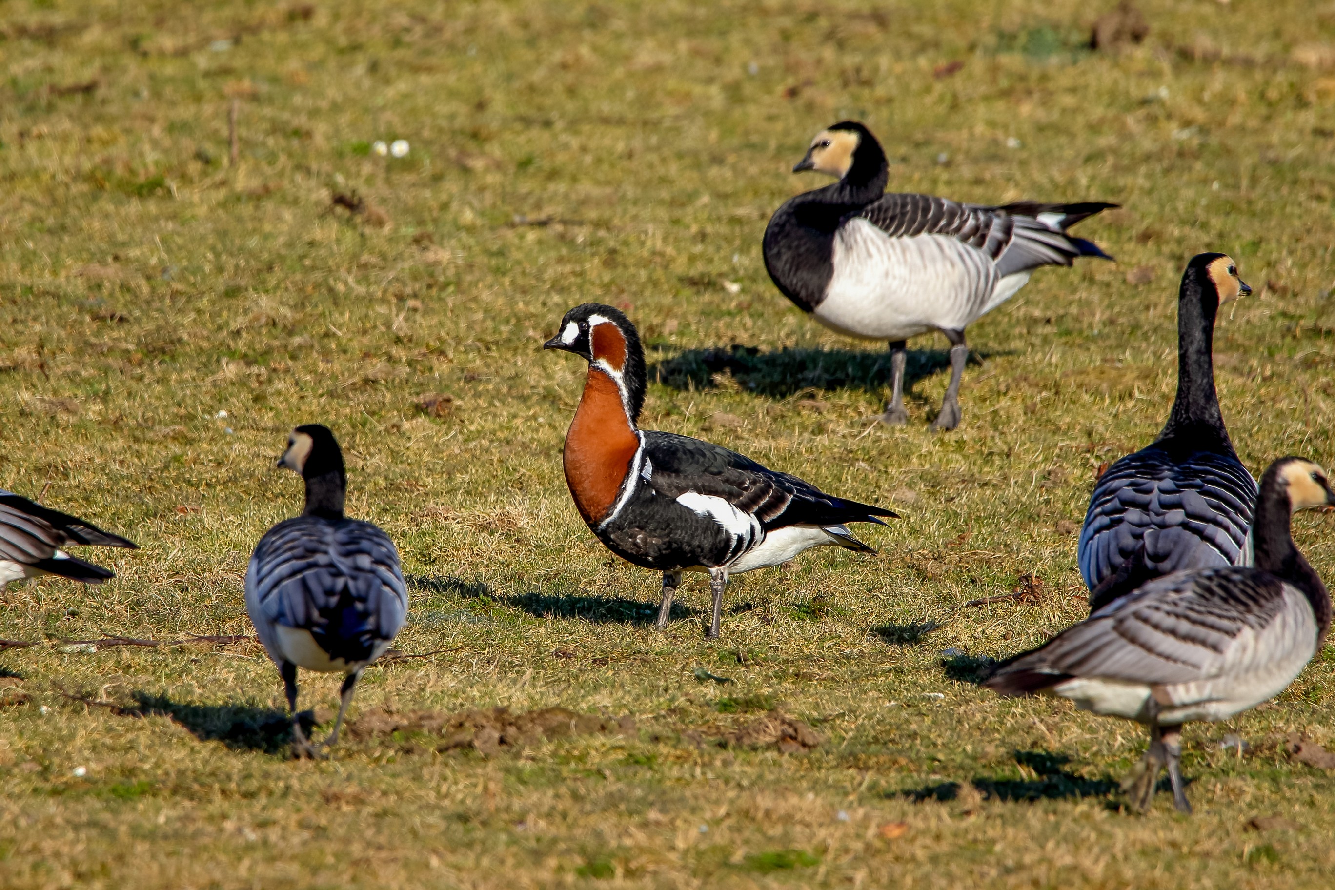 Auch am Niederrhein ist es für Gänsebeobachter ein besonderes Erlebnis, zwischen der großen Anzahl von Weisswangengänsen die sich so gut wie niemals in der ersten Linie aufhaltende Rothalsgans zu sichten. Aus diesem Grund sind Aufnahmen aus kurzer Distanz nur selten zu fertigen.
