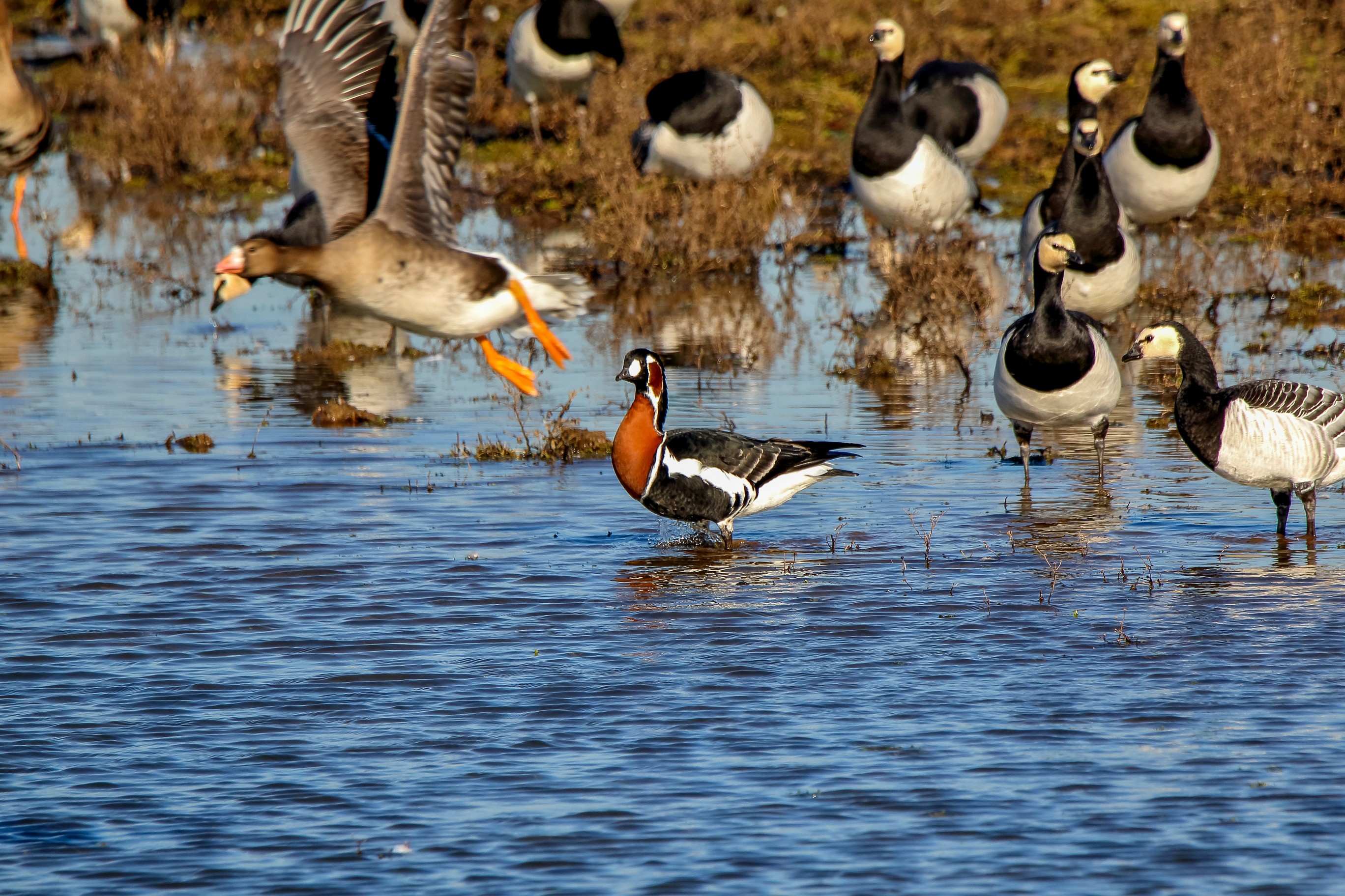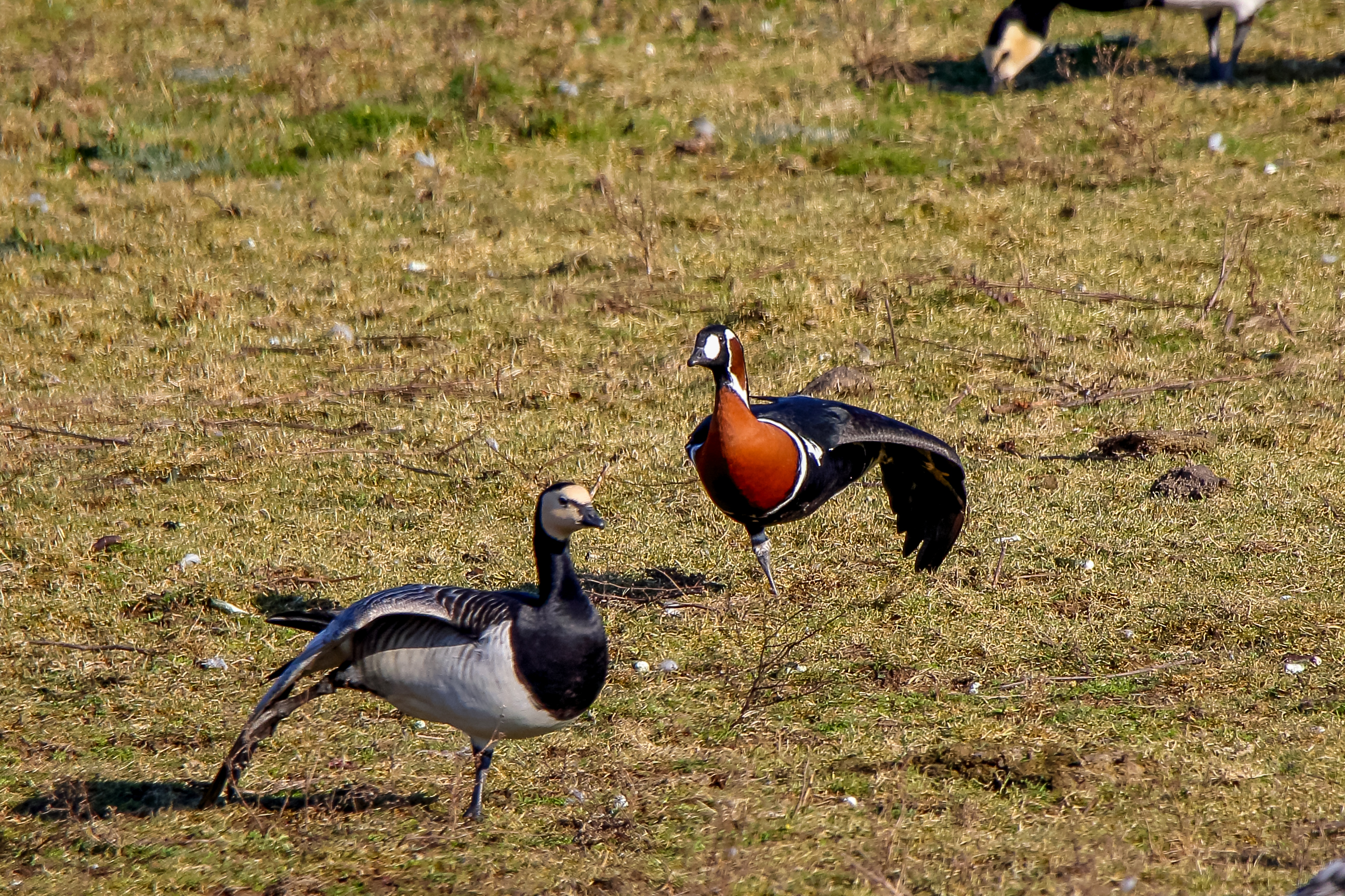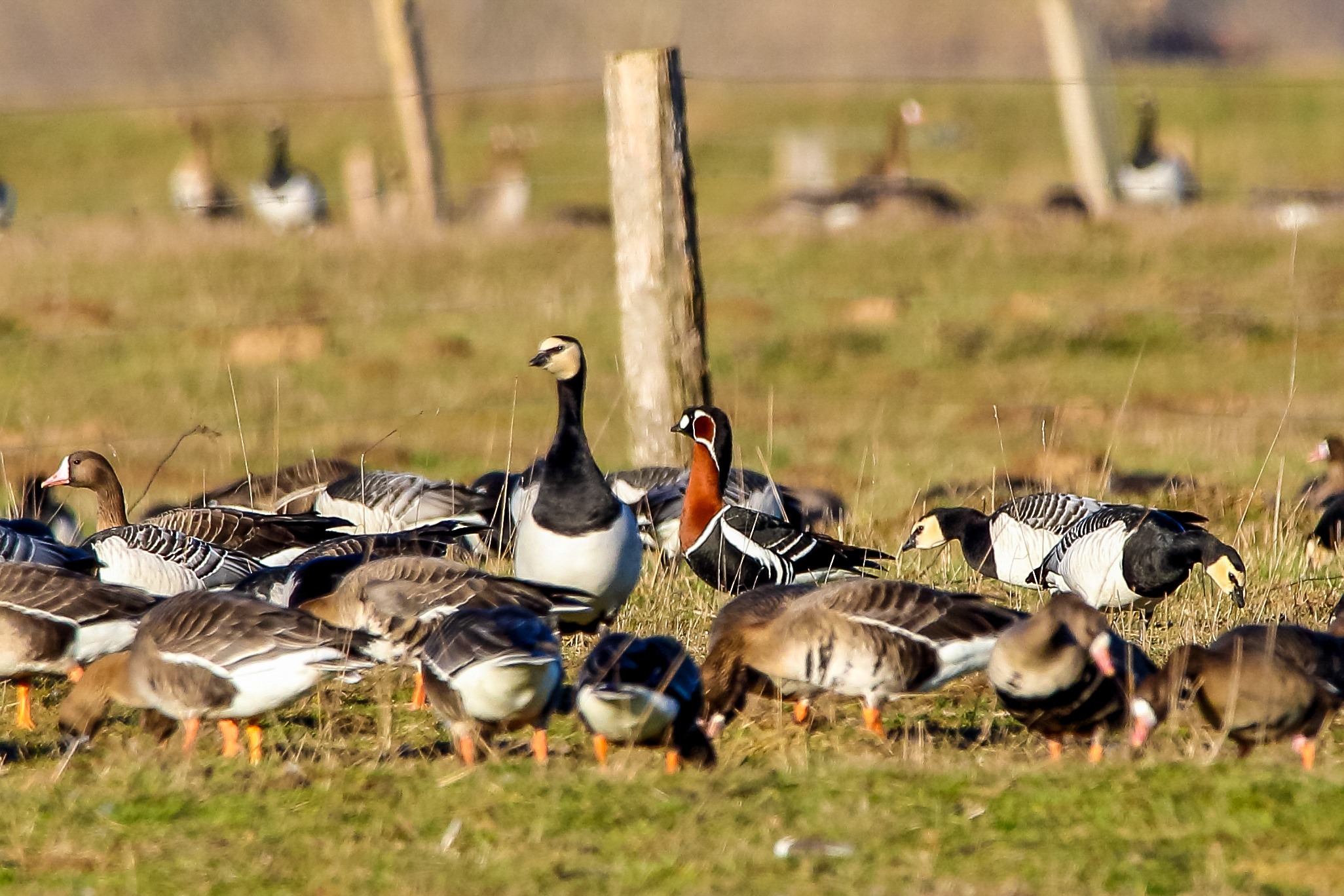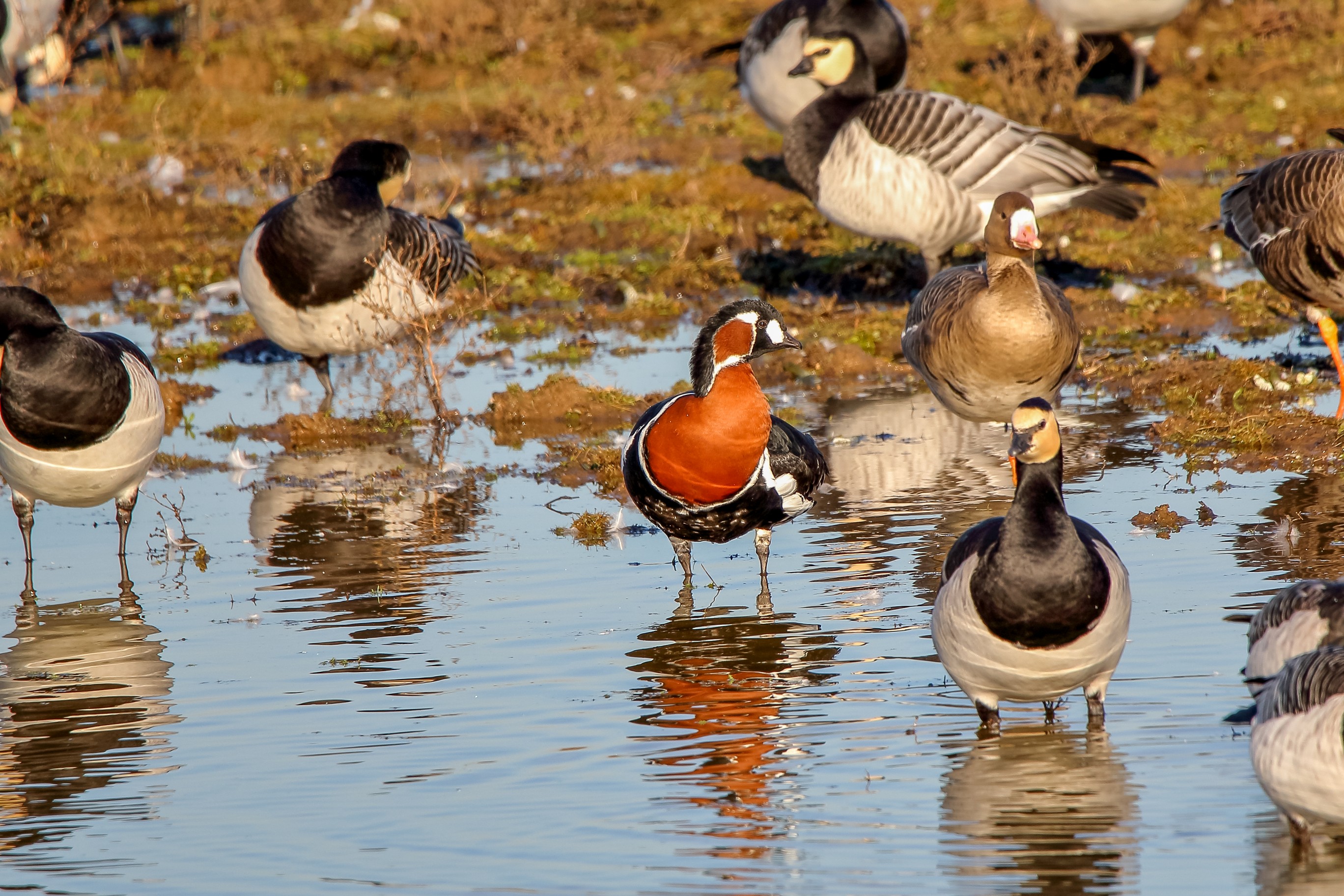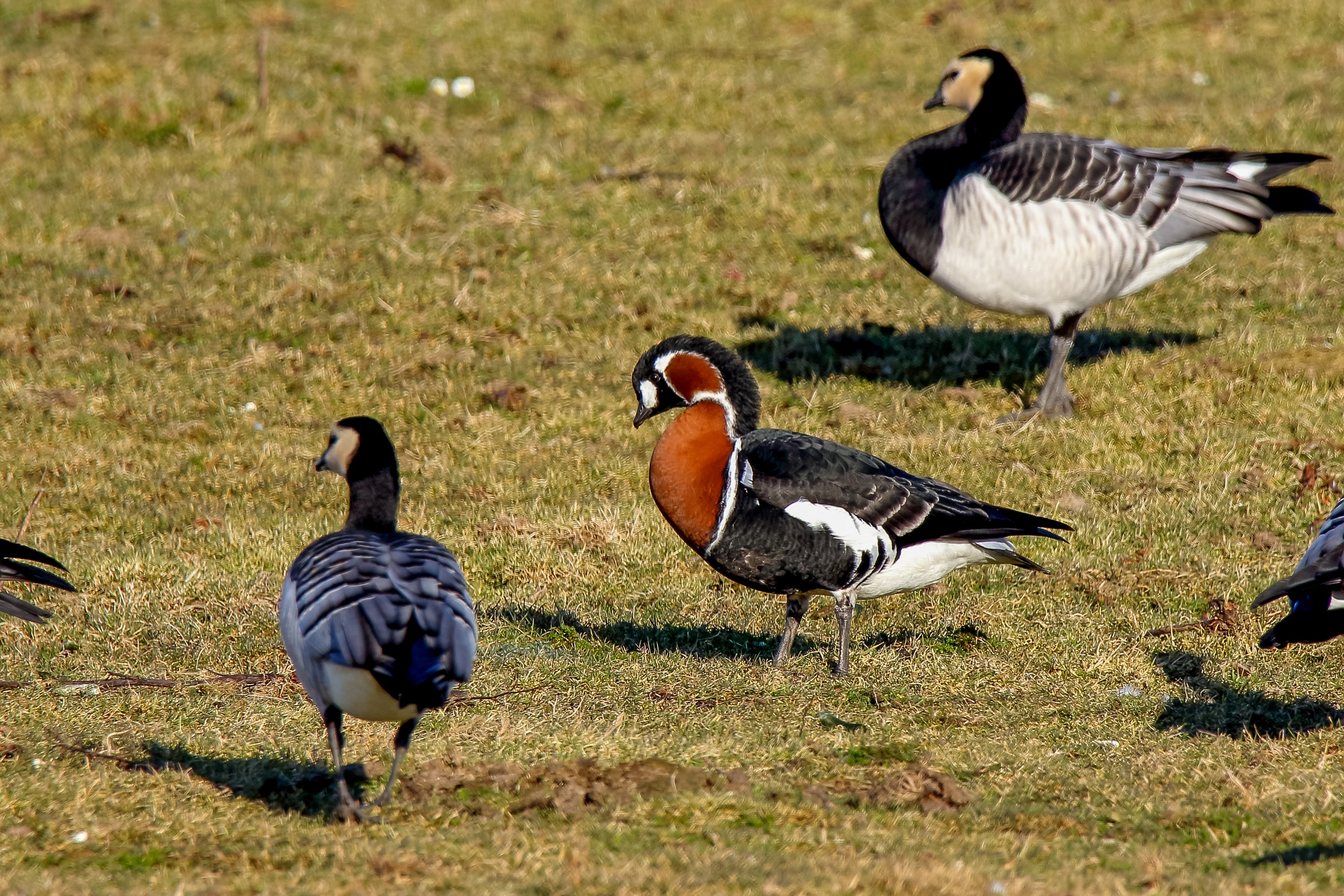 Auch am Niederrhein ist es für Gänsebeobachter ein besonderes Erlebnis, zwischen der großen Anzahl von Weisswangengänsen die sich so gut wie niemals in der ersten Linie aufhaltende Rothalsgans zu sichten. Aus diesem Grund sind Aufnahmen aus kurzer Distanz nur selten zu fertigen.