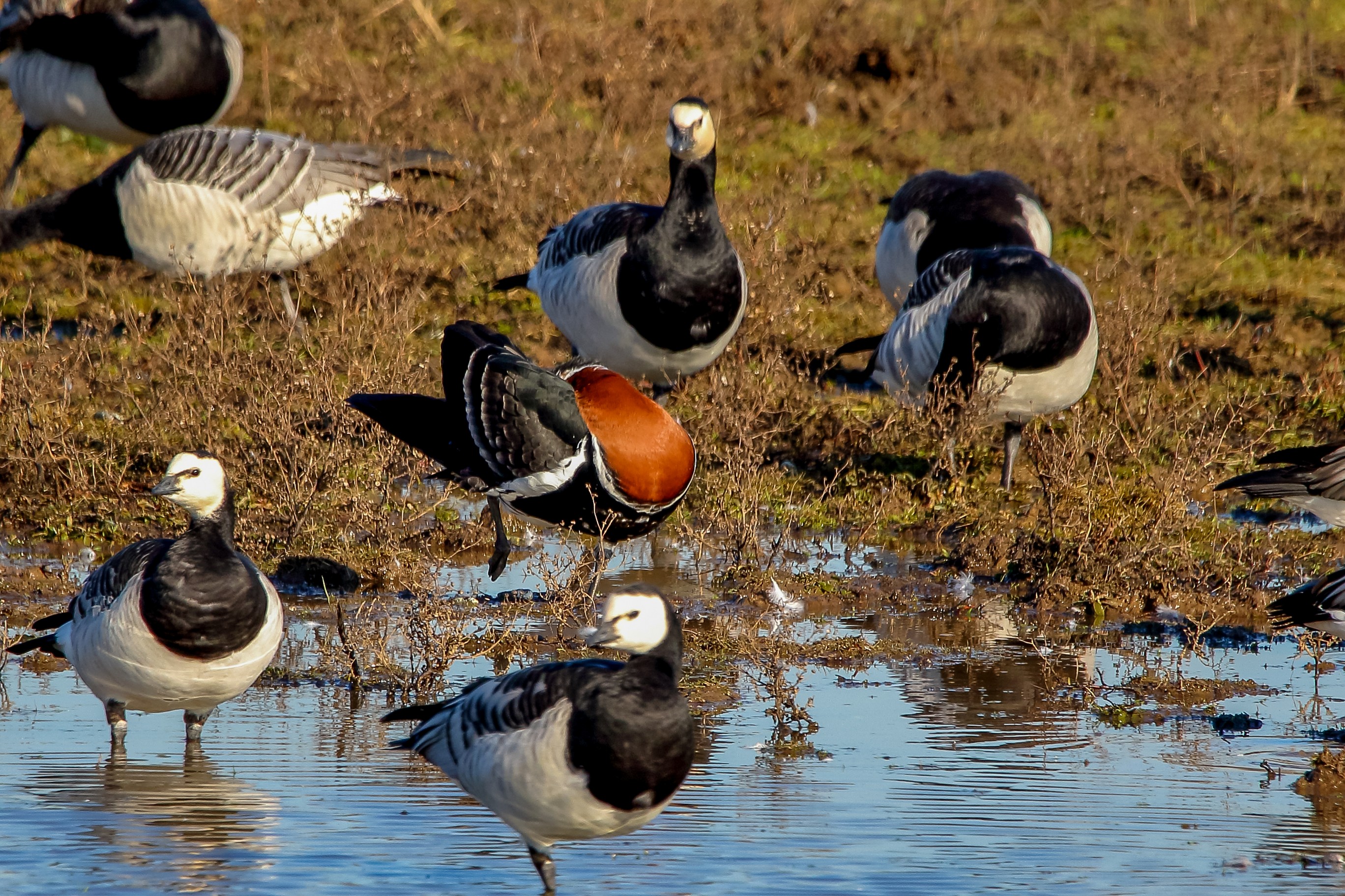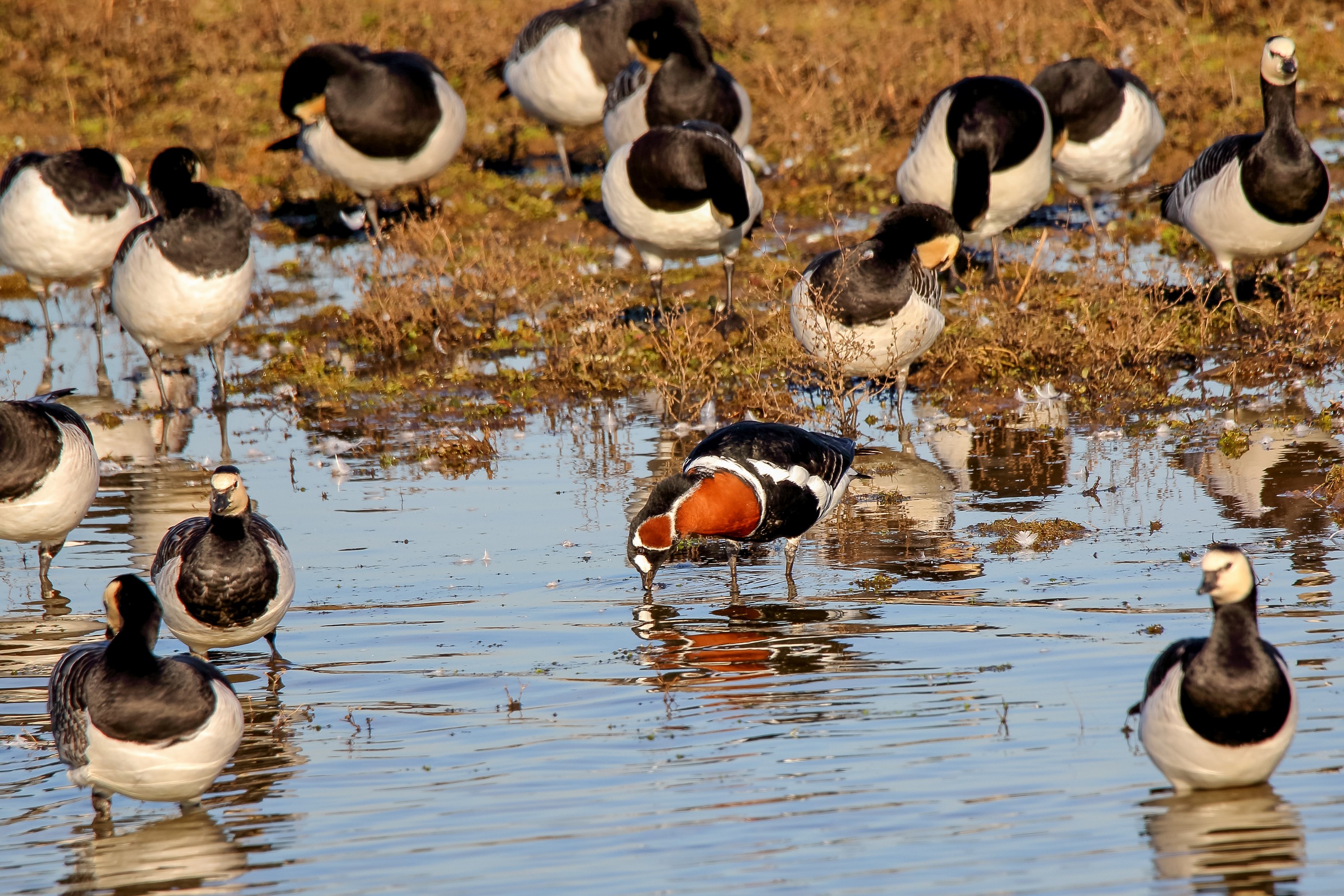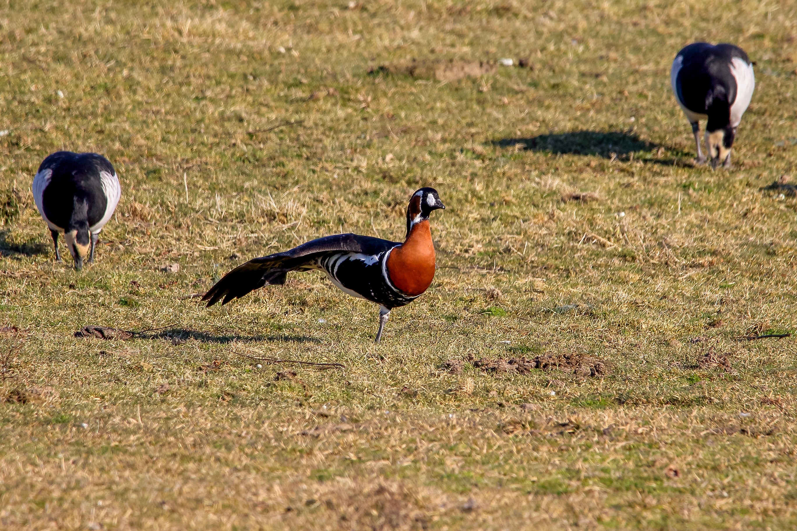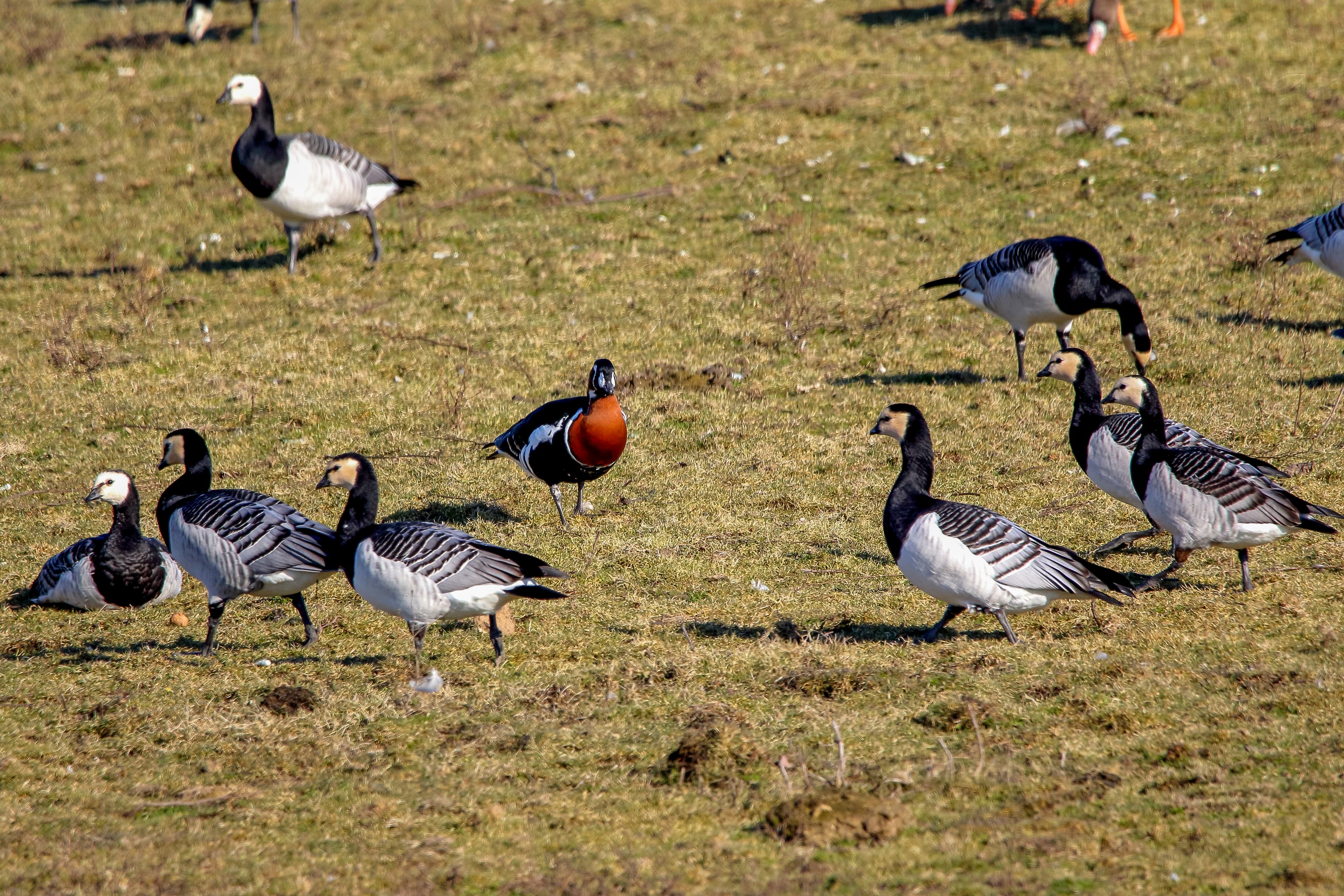 Auch am Niederrhein ist es für Gänsebeobachter ein besonderes Erlebnis, zwischen der großen Anzahl von Weisswangengänsen die sich so gut wie niemals in der ersten Linie aufhaltende Rothalsgans zu sichten. Aus diesem Grund sind Aufnahmen aus kurzer Distanz nur selten zu fertigen.