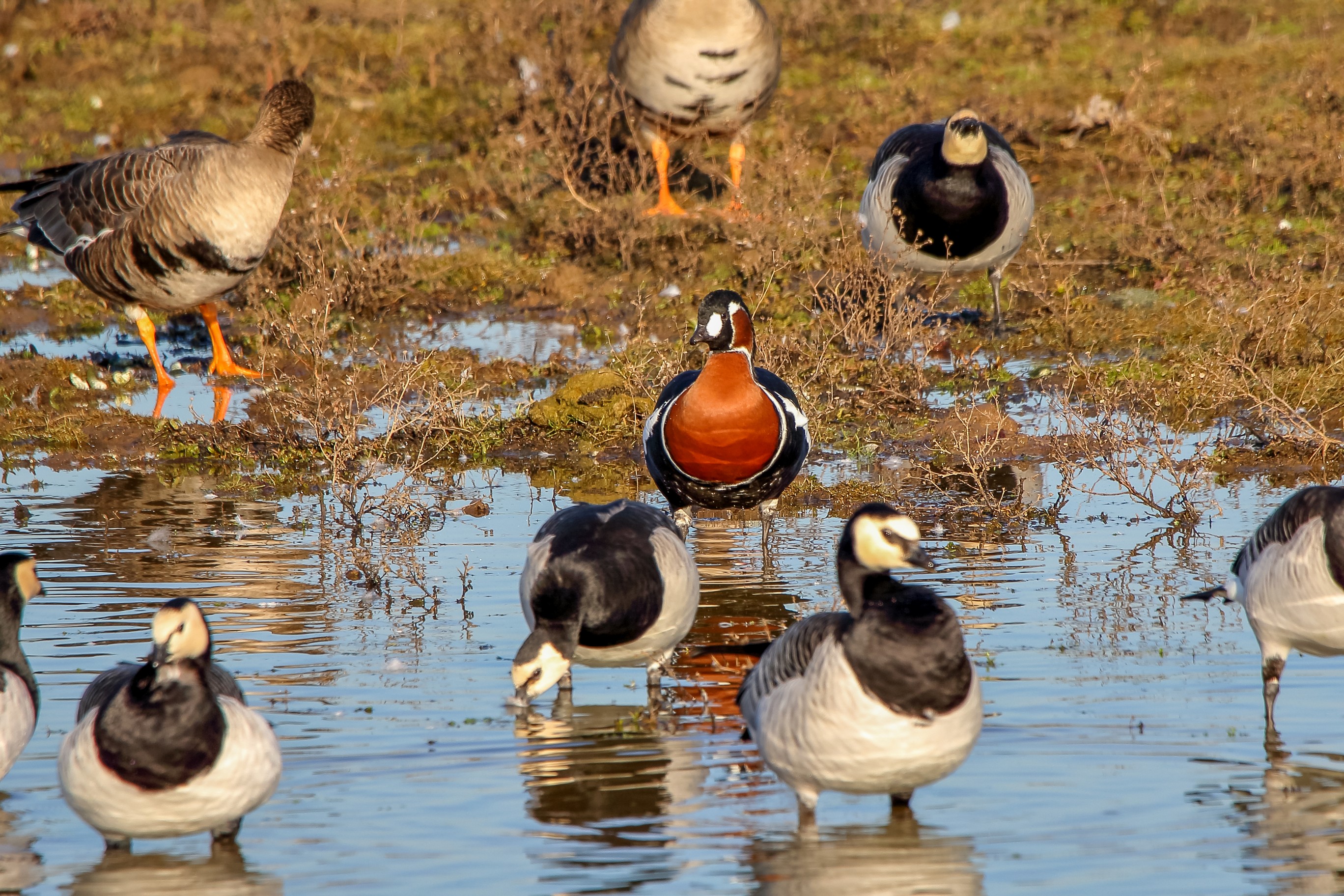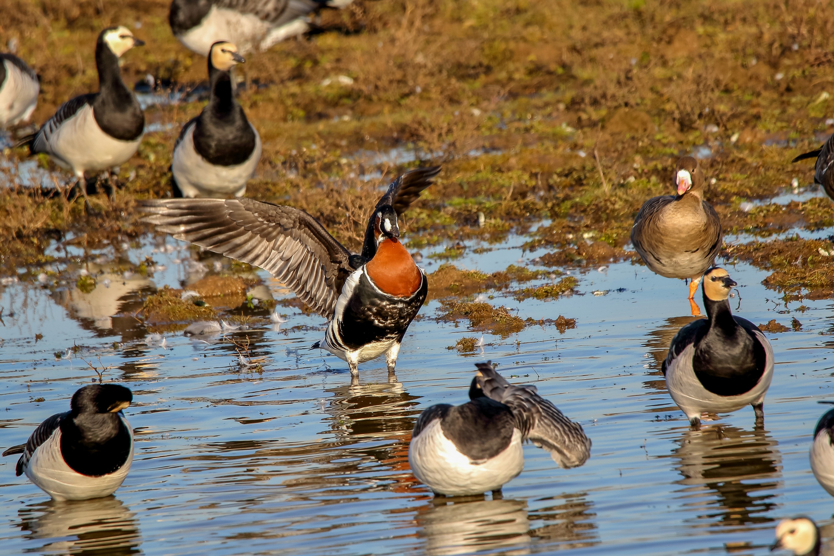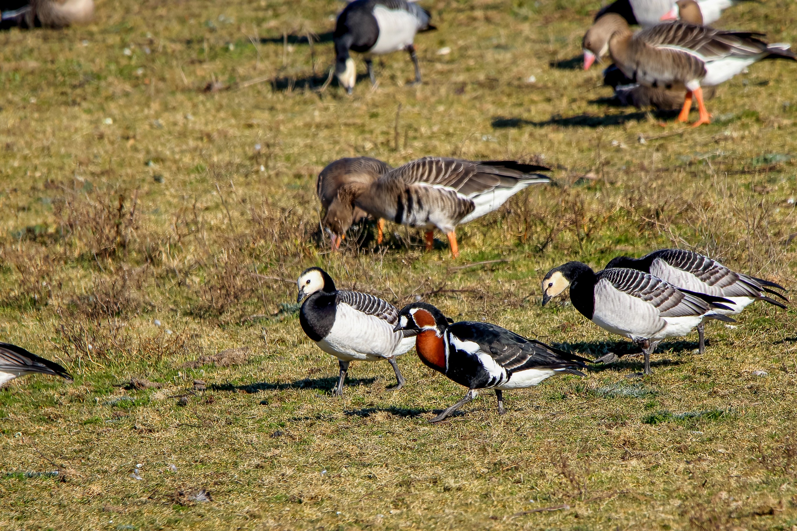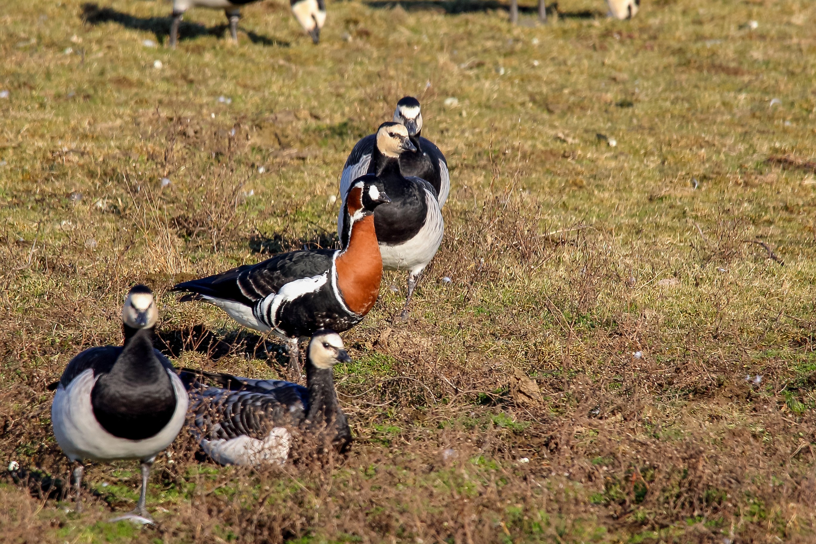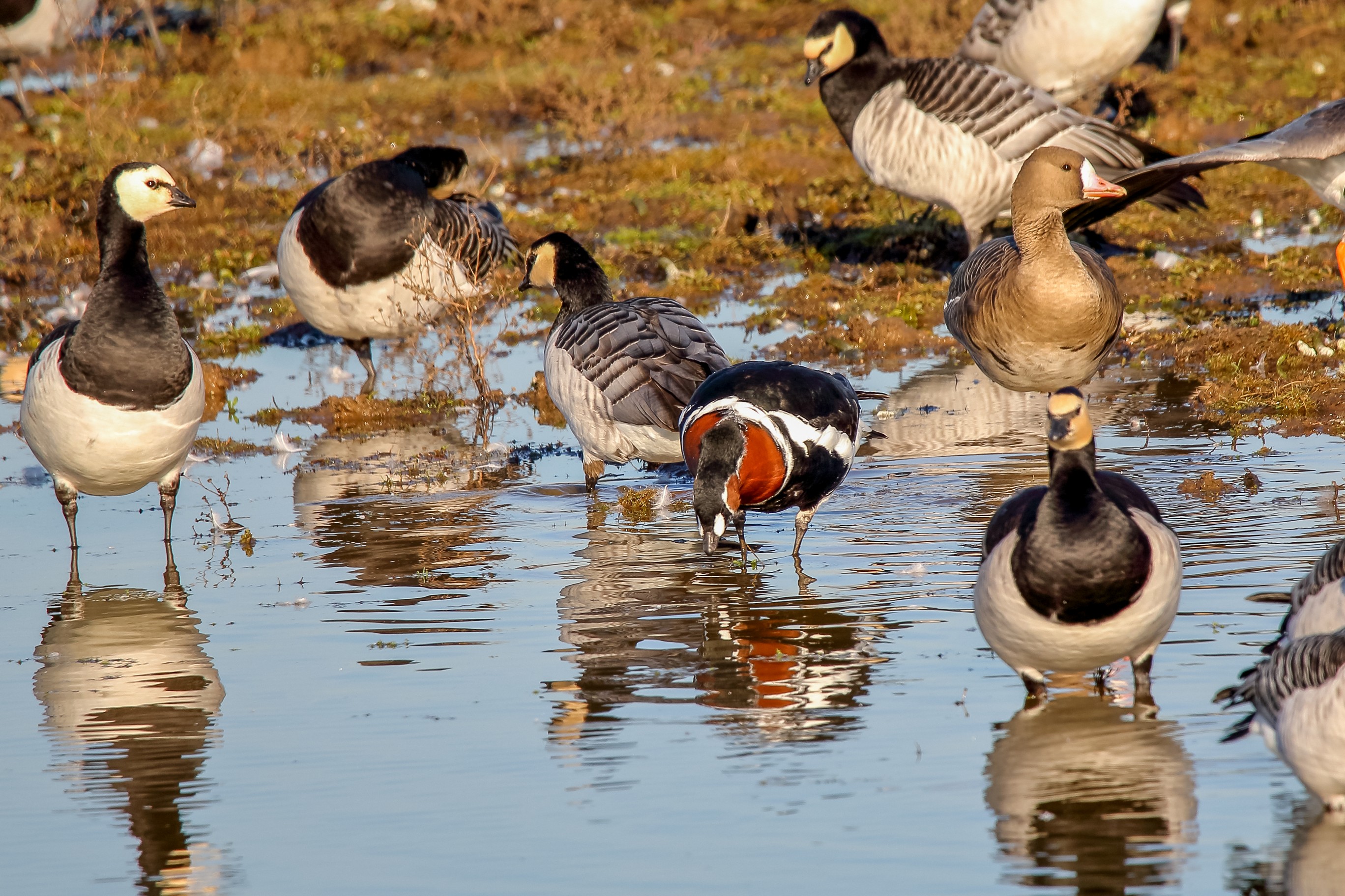 Auch am Niederrhein ist es für Gänsebeobachter ein besonderes Erlebnis, zwischen der großen Anzahl von Weisswangengänsen die sich so gut wie niemals in der ersten Linie aufhaltende Rothalsgans zu sichten. Aus diesem Grund sind Aufnahmen aus kurzer Distanz nur selten zu fertigen.