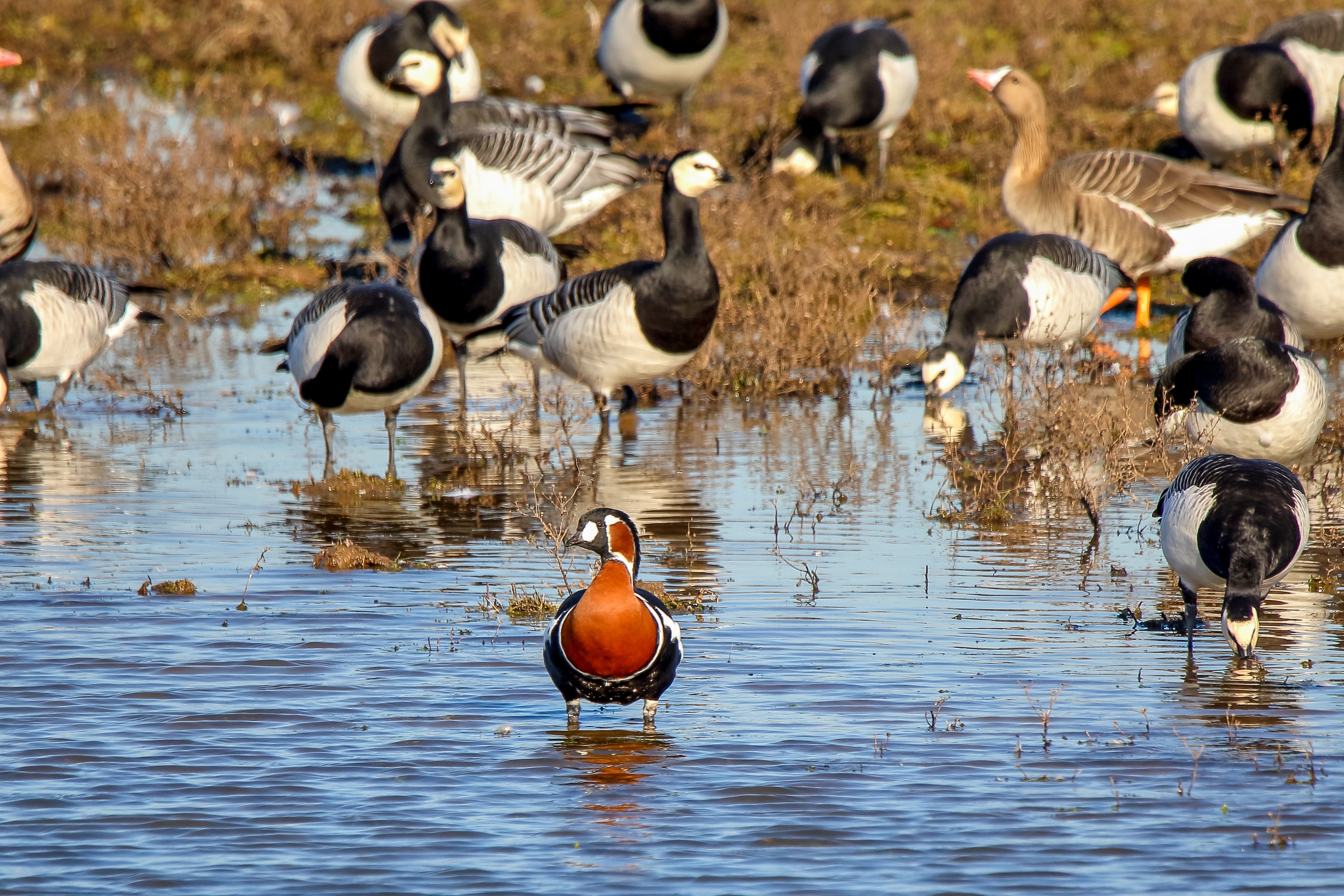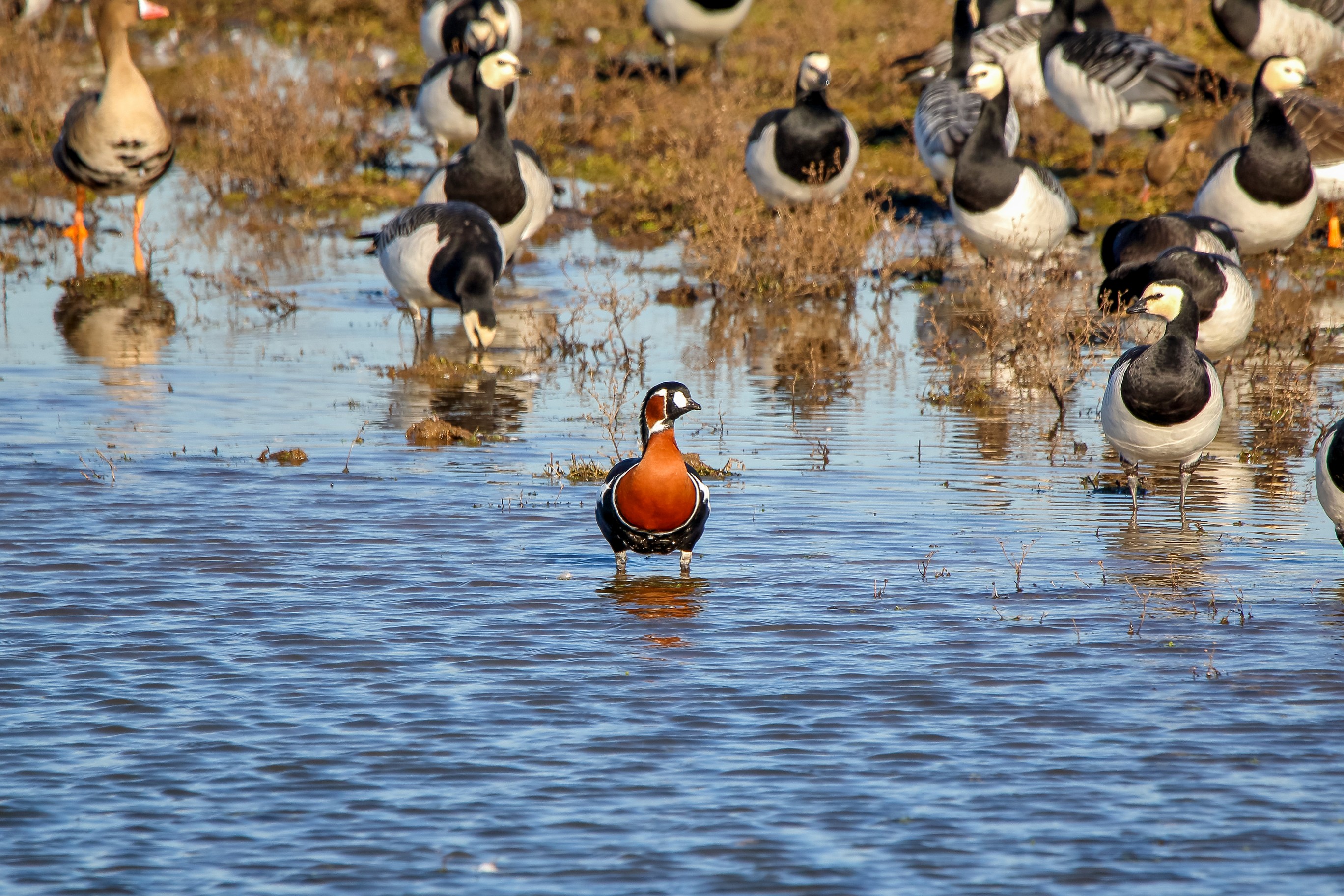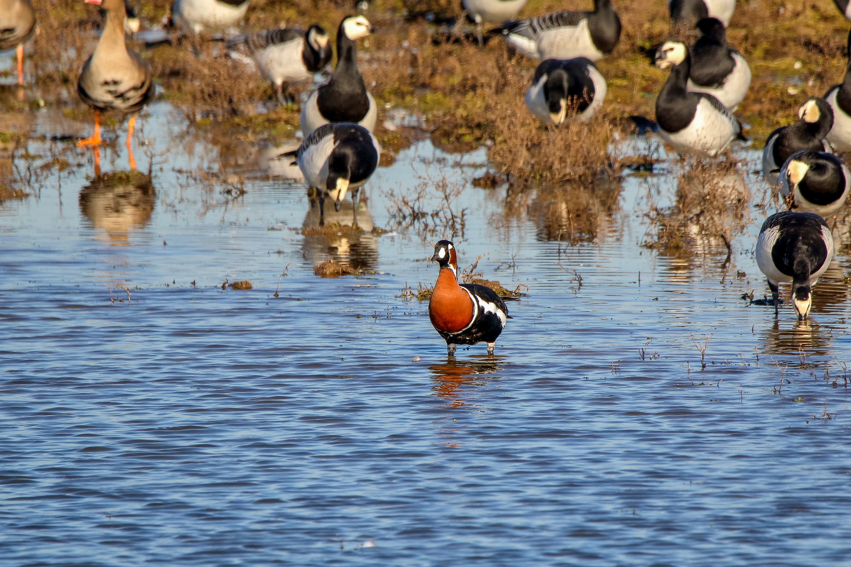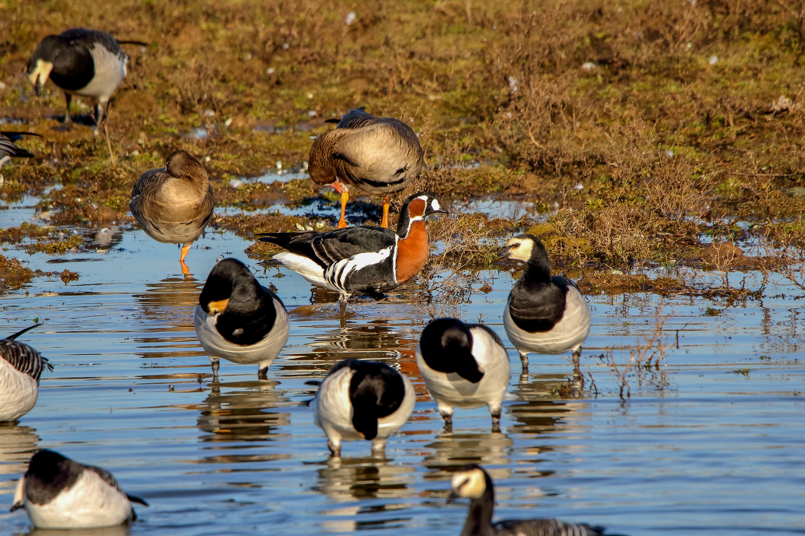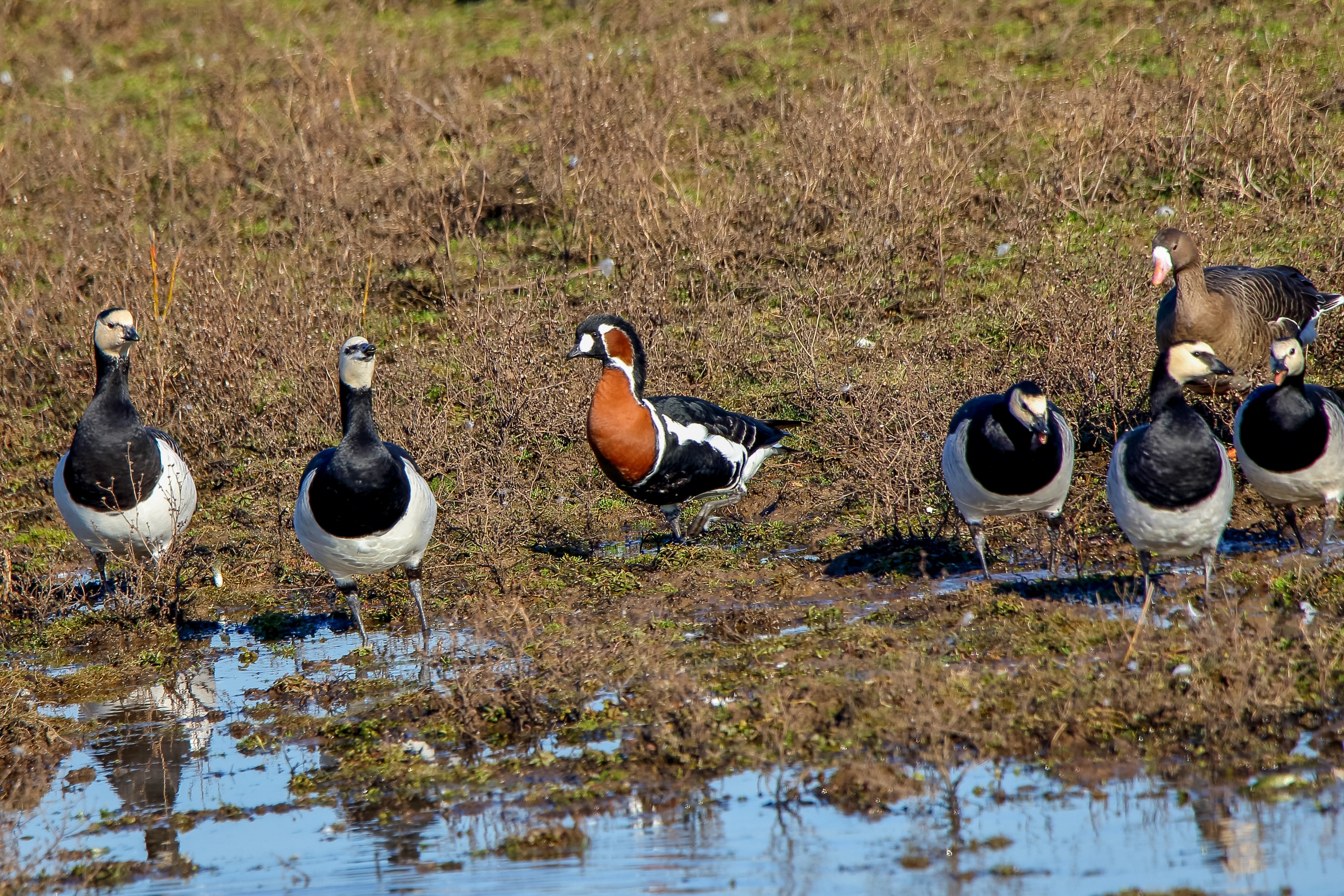 Auch am Niederrhein ist es für Gänsebeobachter ein besonderes Erlebnis, zwischen der großen Anzahl von Weisswangengänsen die sich so gut wie niemals in der ersten Linie aufhaltende Rothalsgans zu sichten. Aus diesem Grund sind Aufnahmen aus kurzer Distanz nur selten zu fertigen.