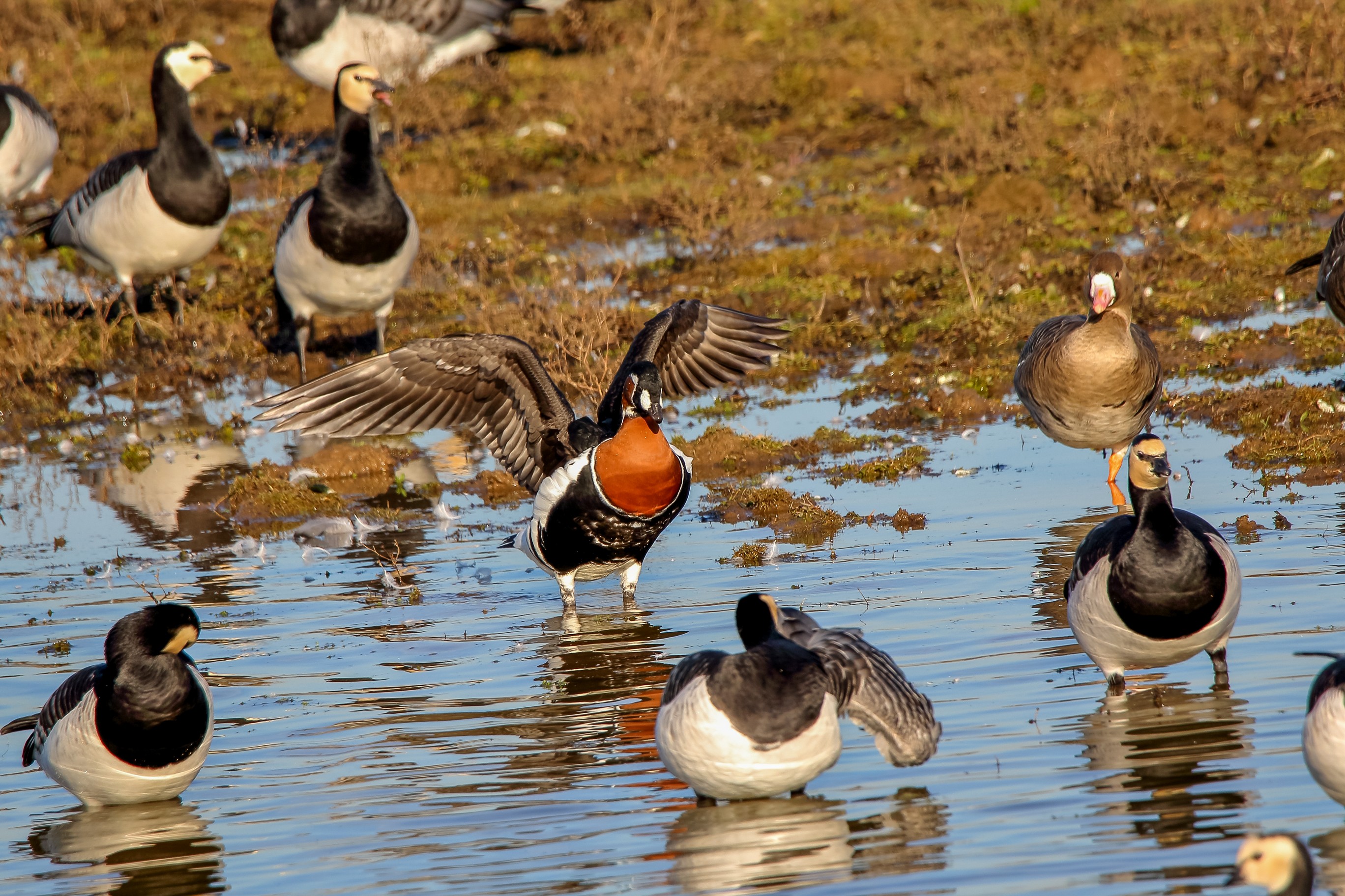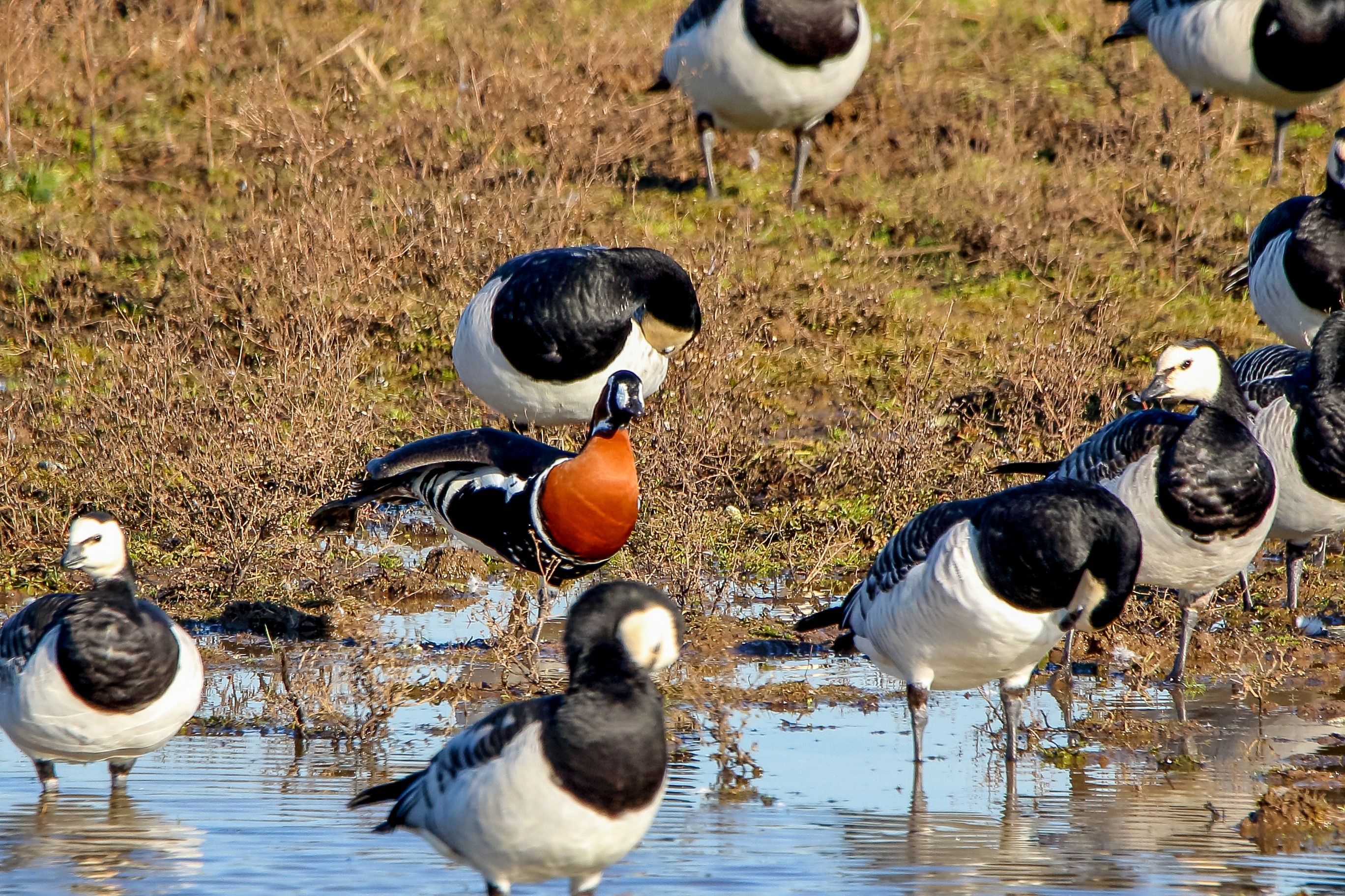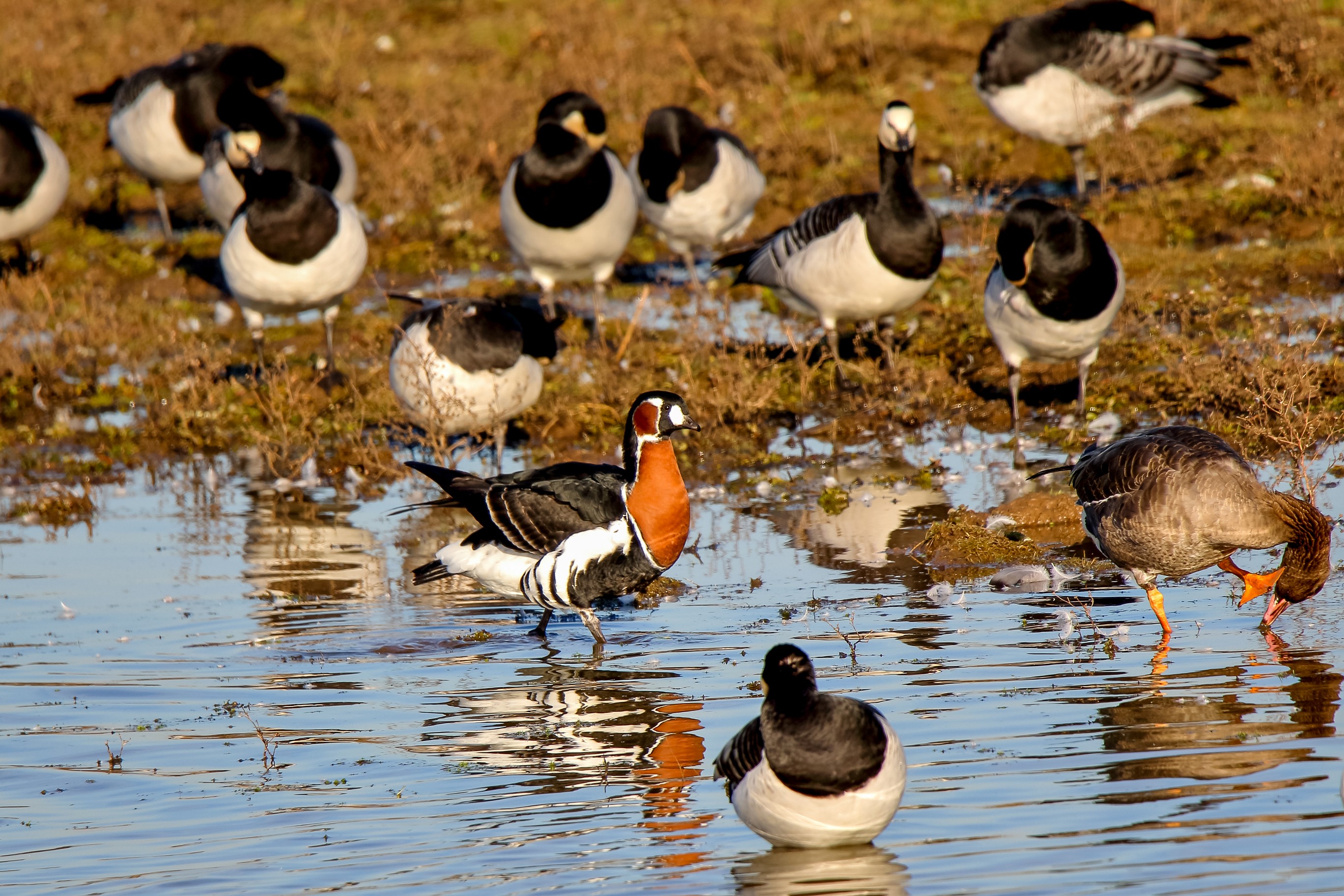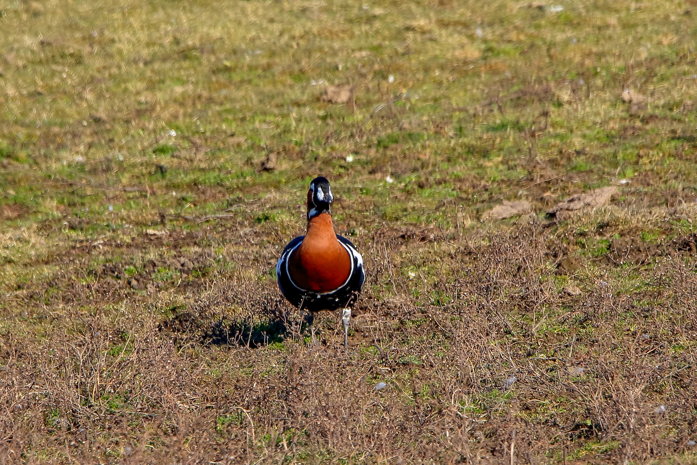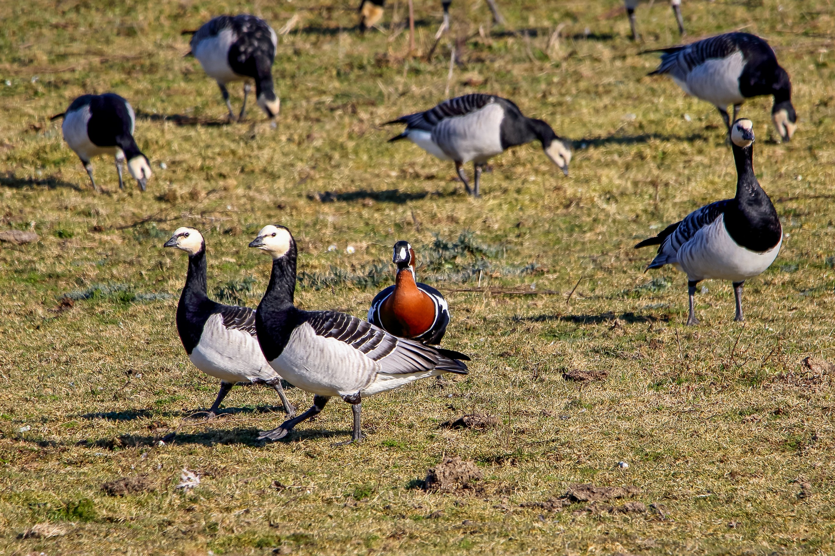 Auch am Niederrhein ist es für Gänsebeobachter ein besonderes Erlebnis, zwischen der großen Anzahl von Weisswangengänsen die sich so gut wie niemals in der ersten Linie aufhaltende Rothalsgans zu sichten. Aus diesem Grund sind Aufnahmen aus kurzer Distanz nur selten zu fertigen.