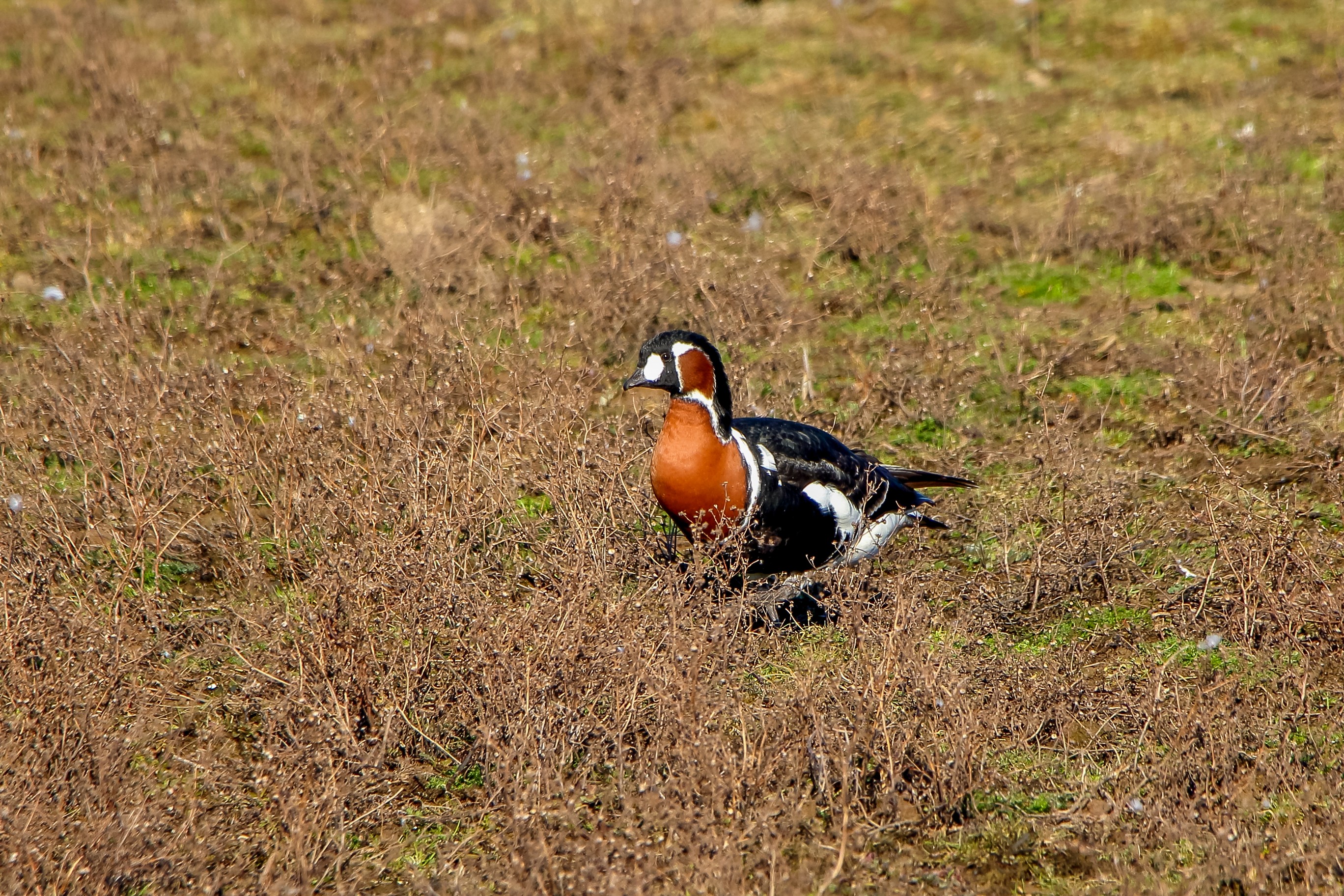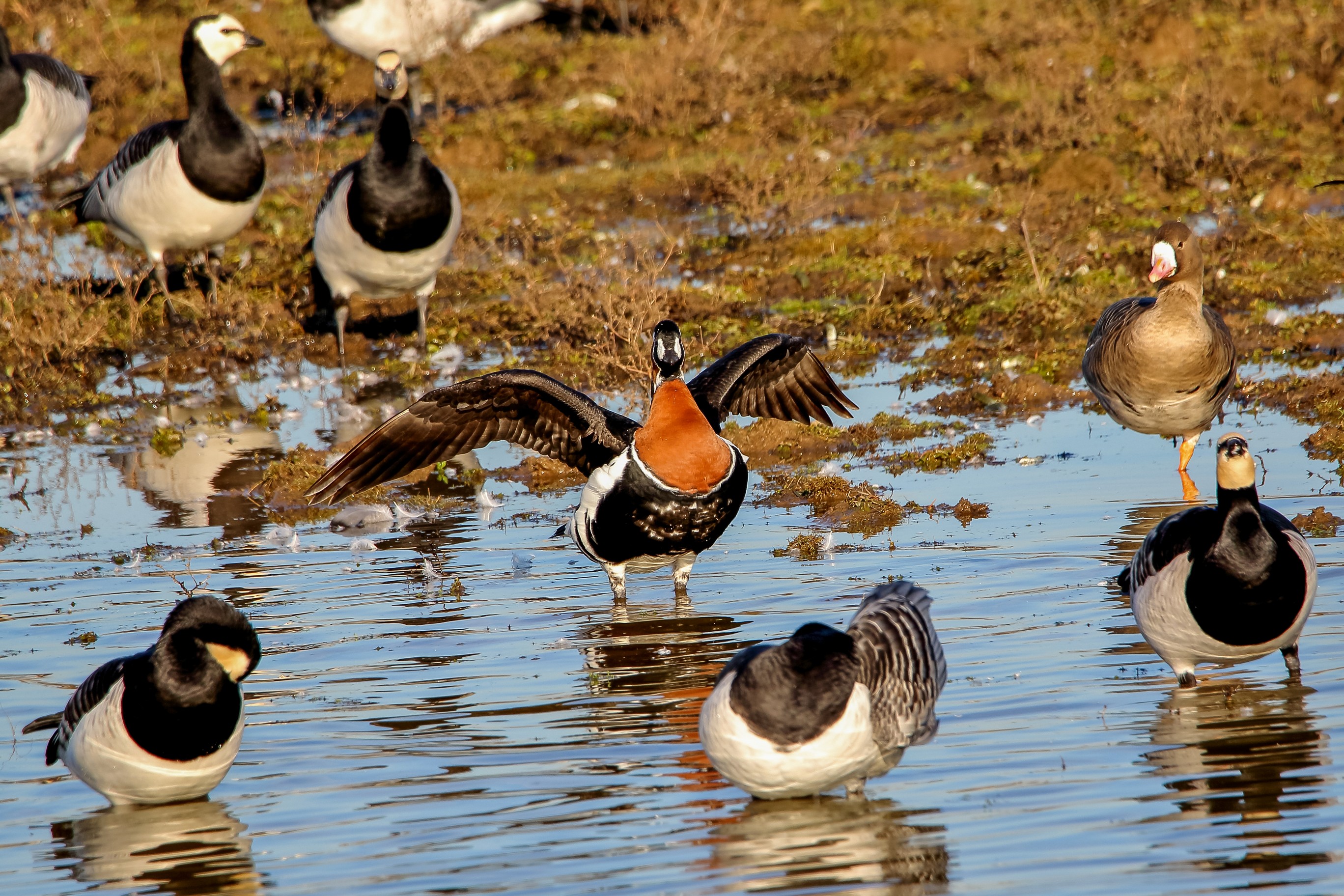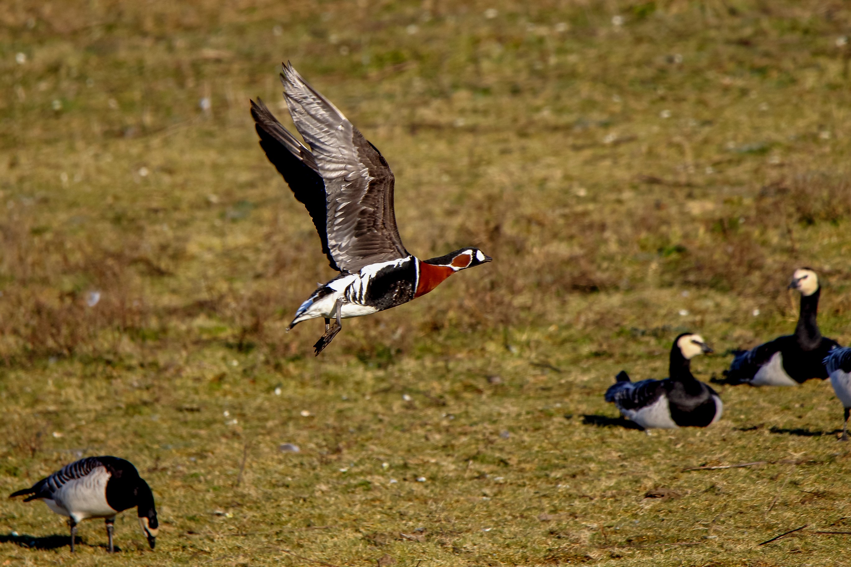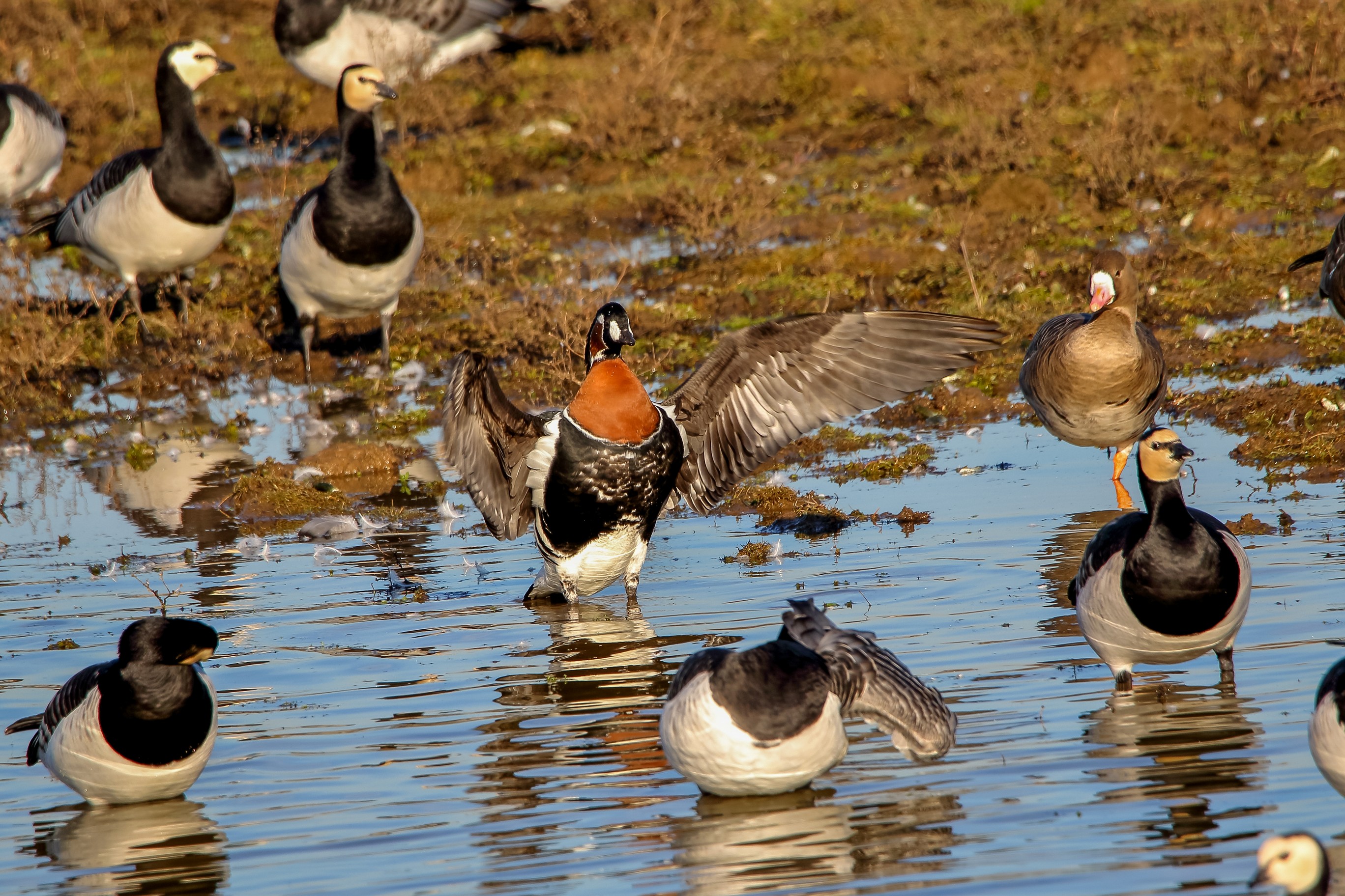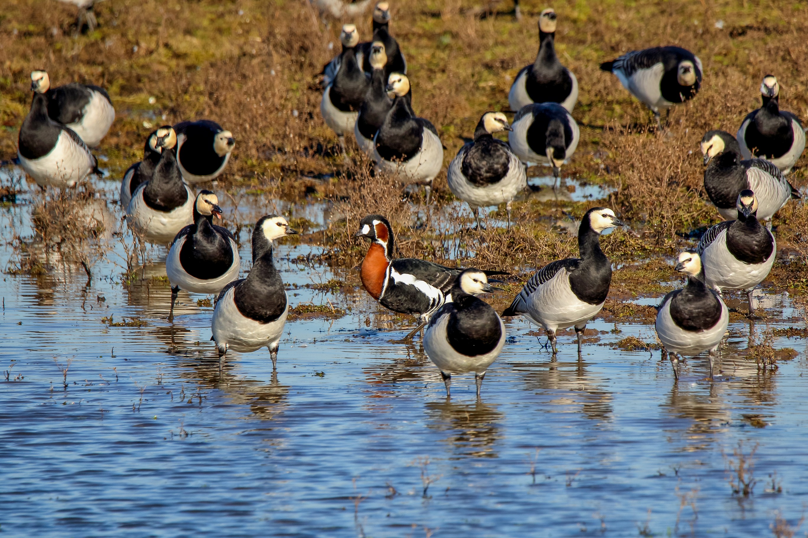 Auch am Niederrhein ist es für Gänsebeobachter ein besonderes Erlebnis, zwischen der großen Anzahl von Weisswangengänsen die sich so gut wie niemals in der ersten Linie aufhaltende Rothalsgans zu sichten. Aus diesem Grund sind Aufnahmen aus kurzer Distanz nur selten zu fertigen.
