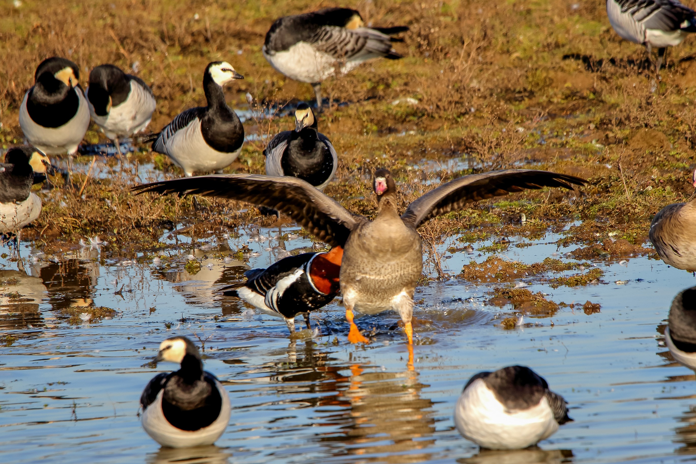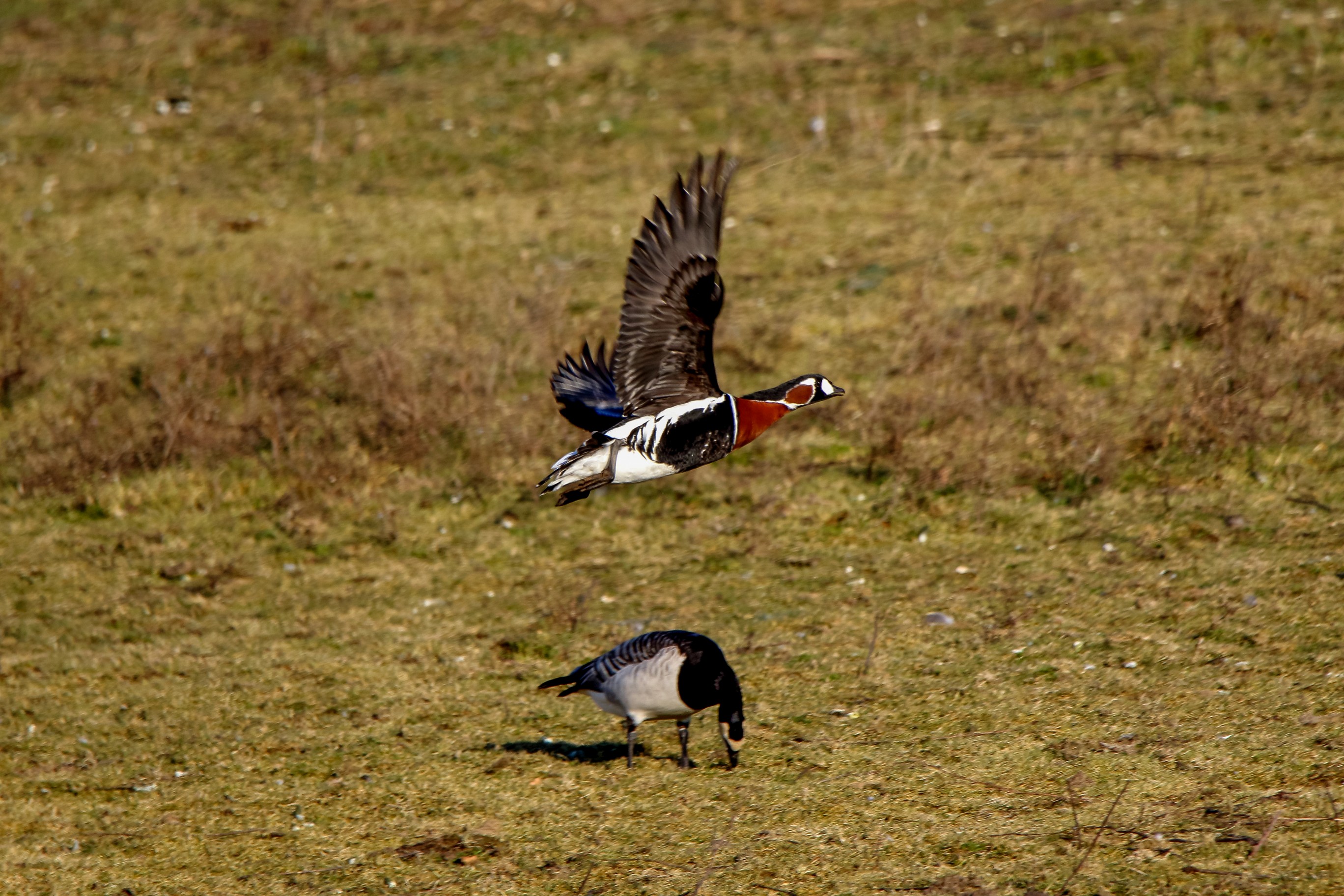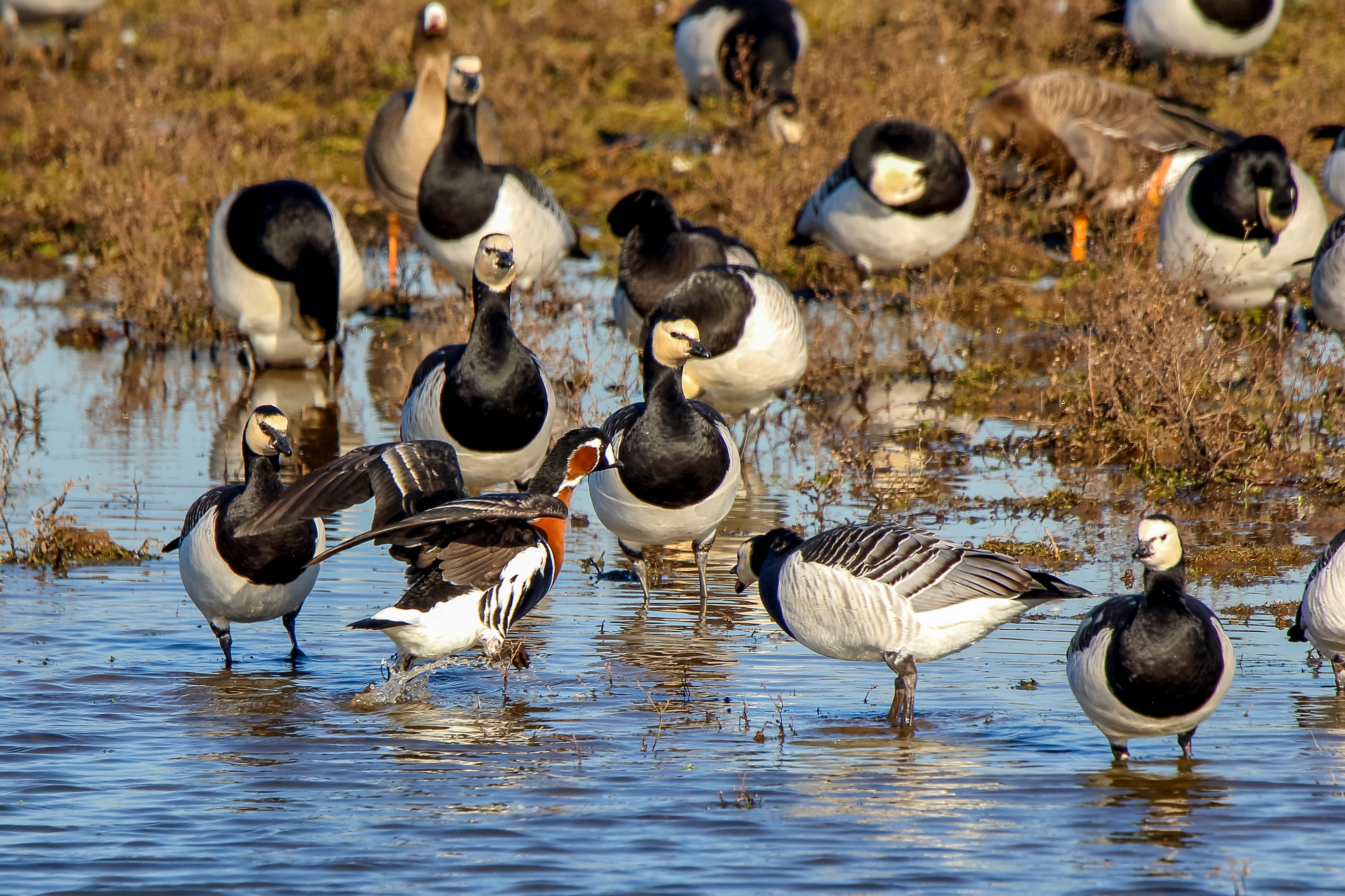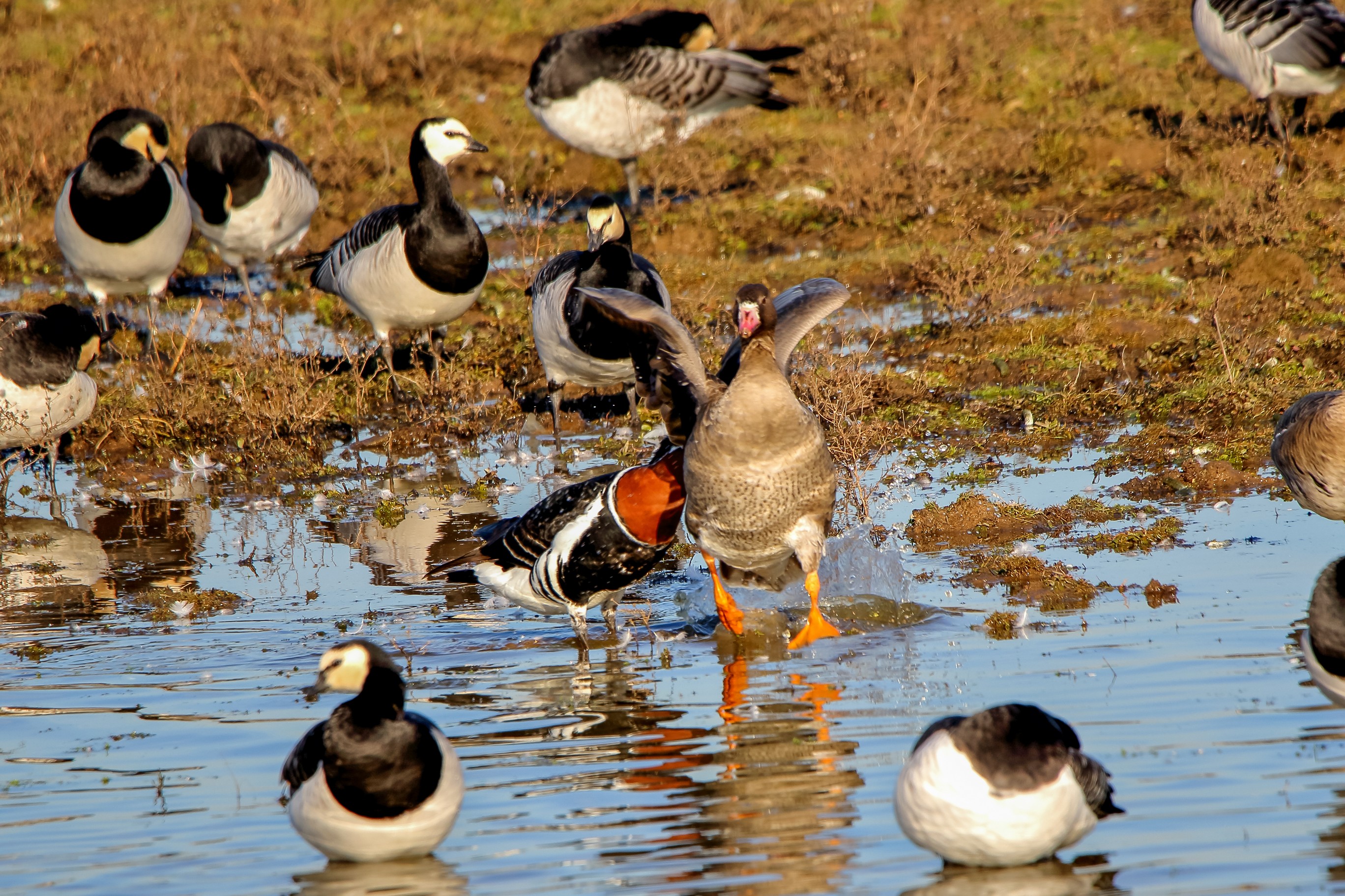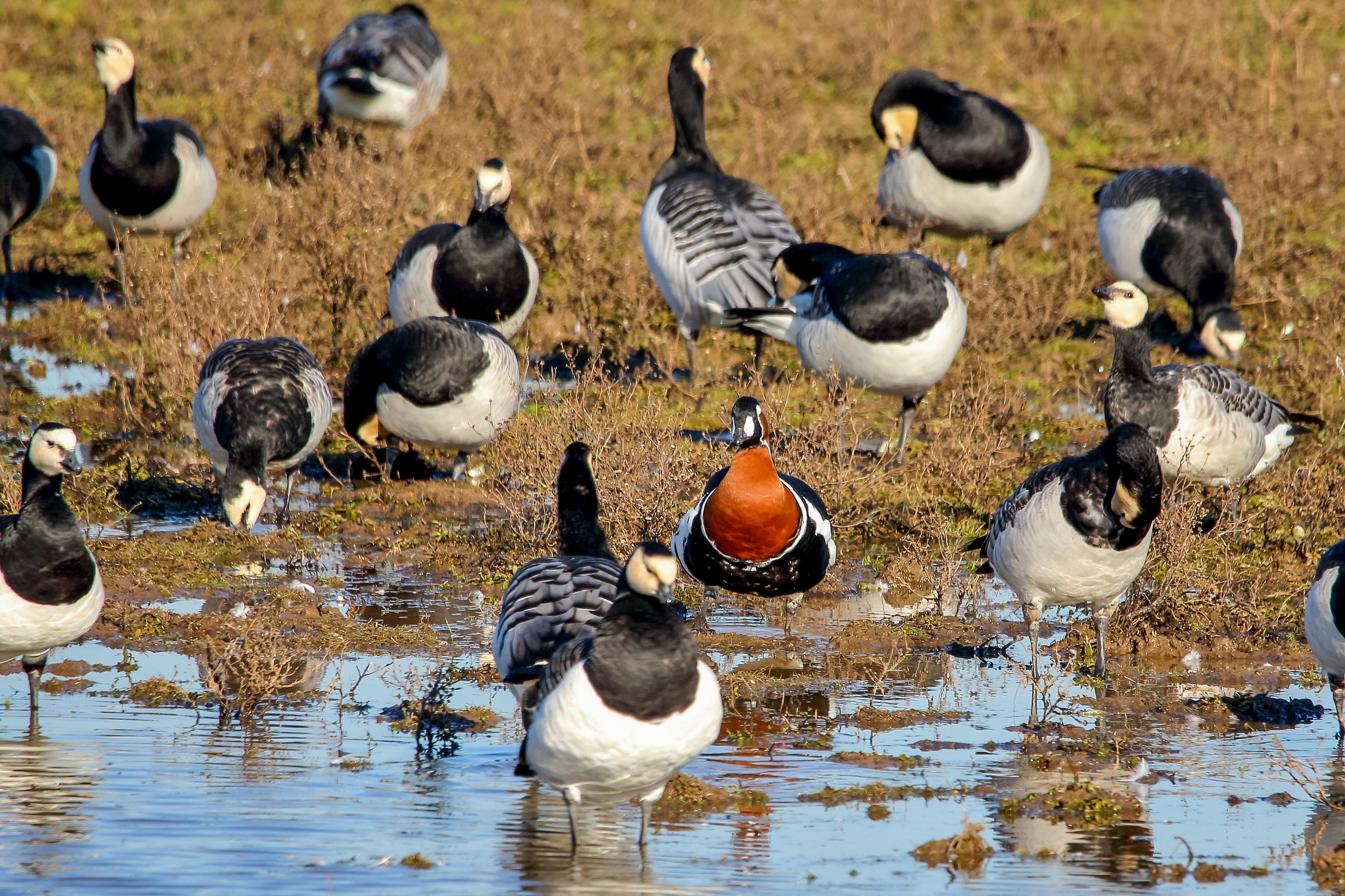 Auch am Niederrhein ist es für Gänsebeobachter ein besonderes Erlebnis, zwischen der großen Anzahl von Weisswangengänsen die sich so gut wie niemals in der ersten Linie aufhaltende Rothalsgans zu sichten. Aus diesem Grund sind Aufnahmen aus kurzer Distanz nur selten zu fertigen.