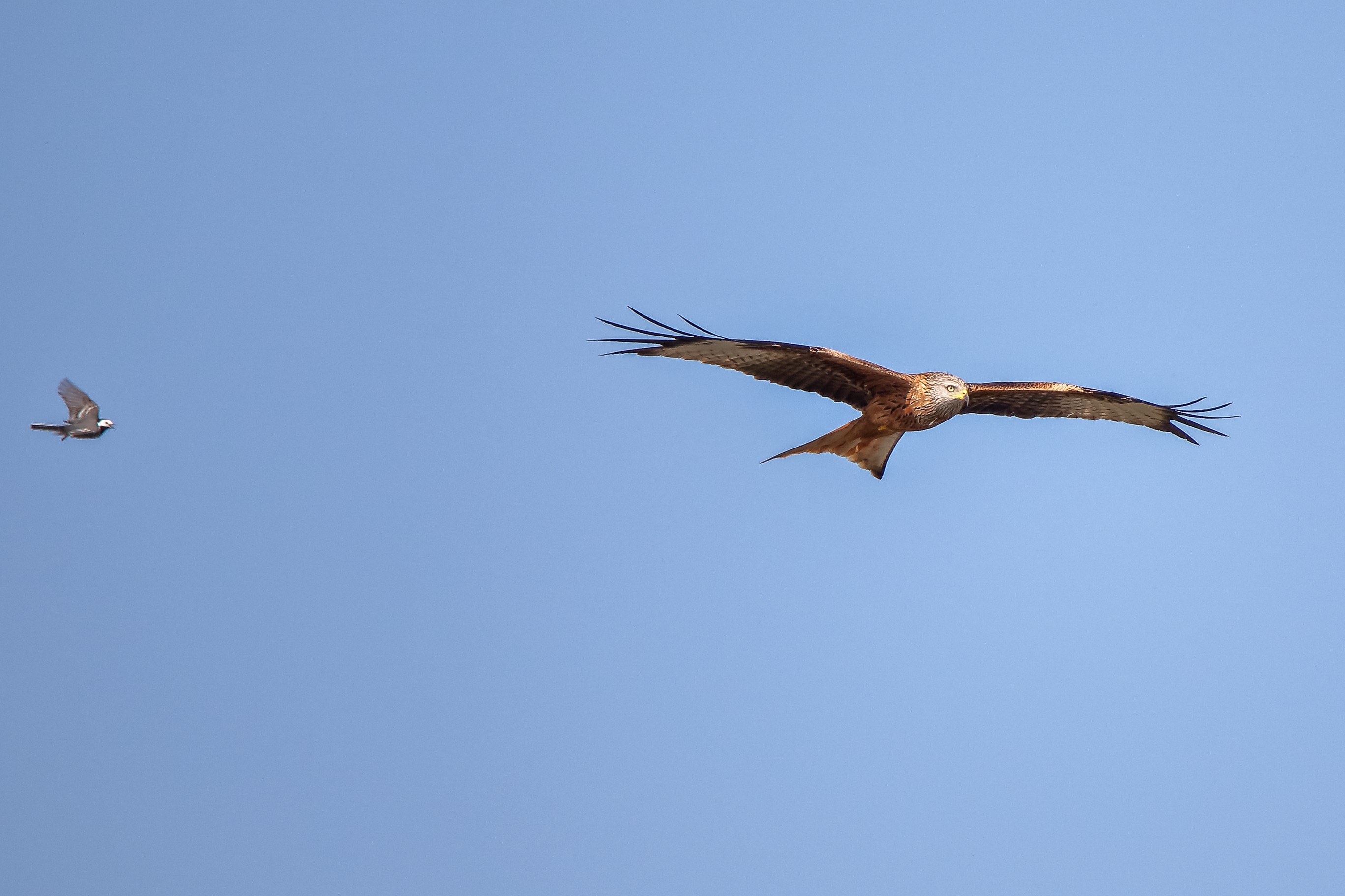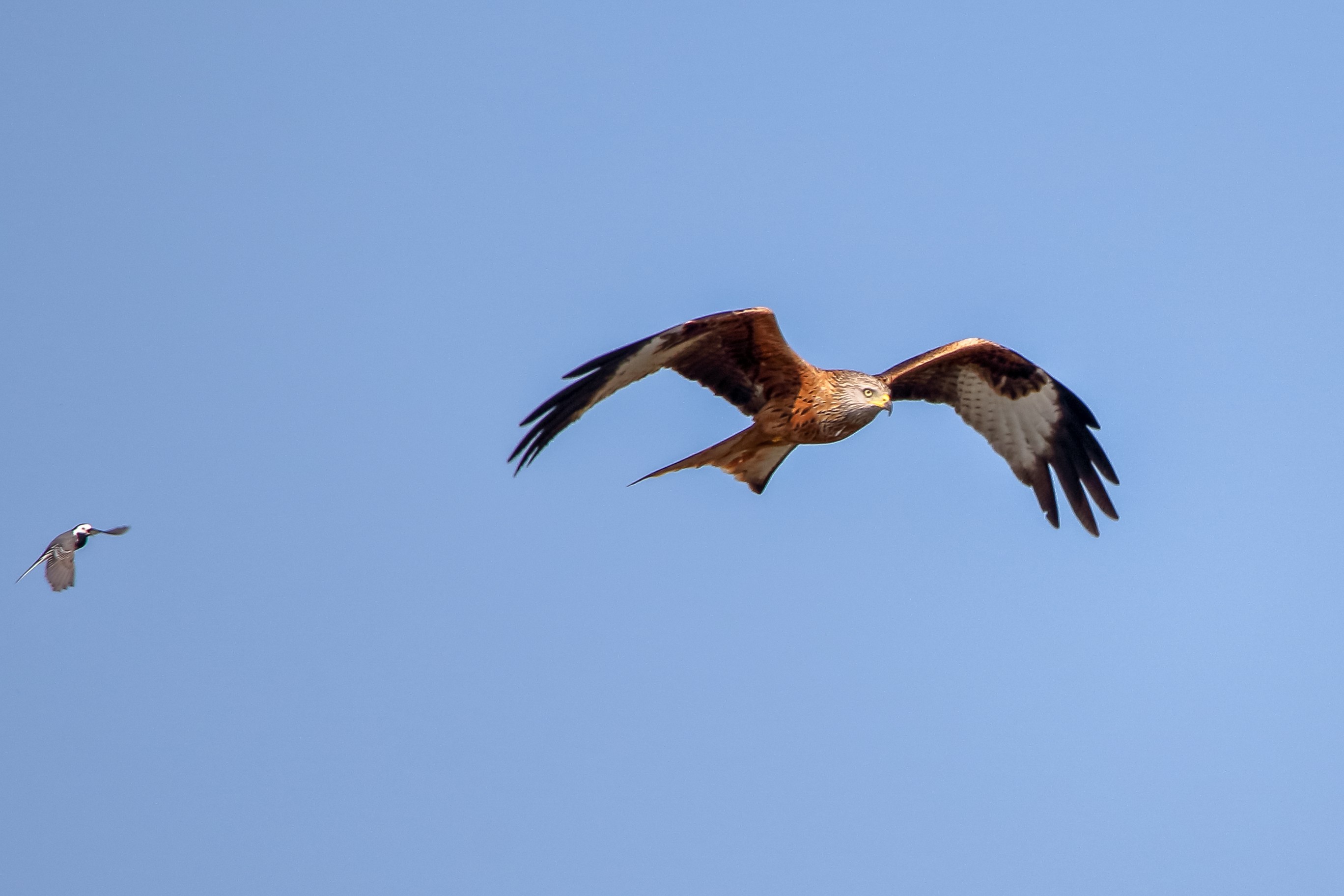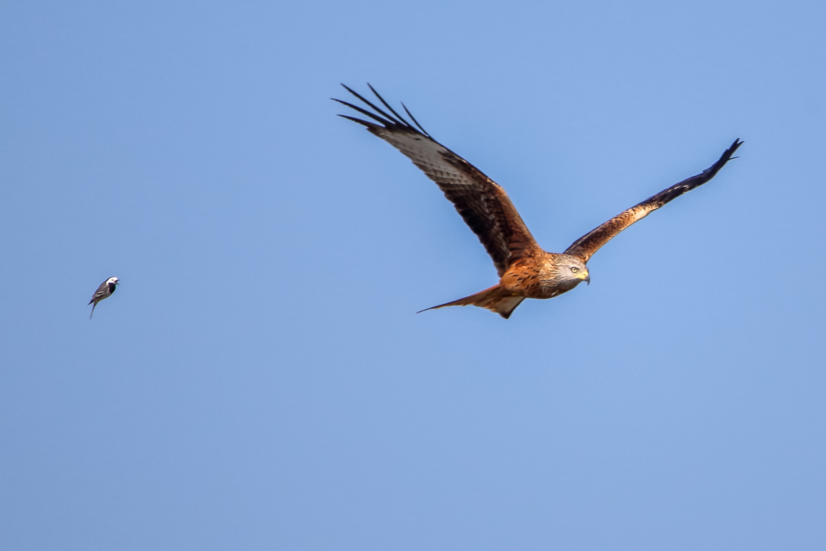 Mutige Bachstelze meckert Rotmilan an