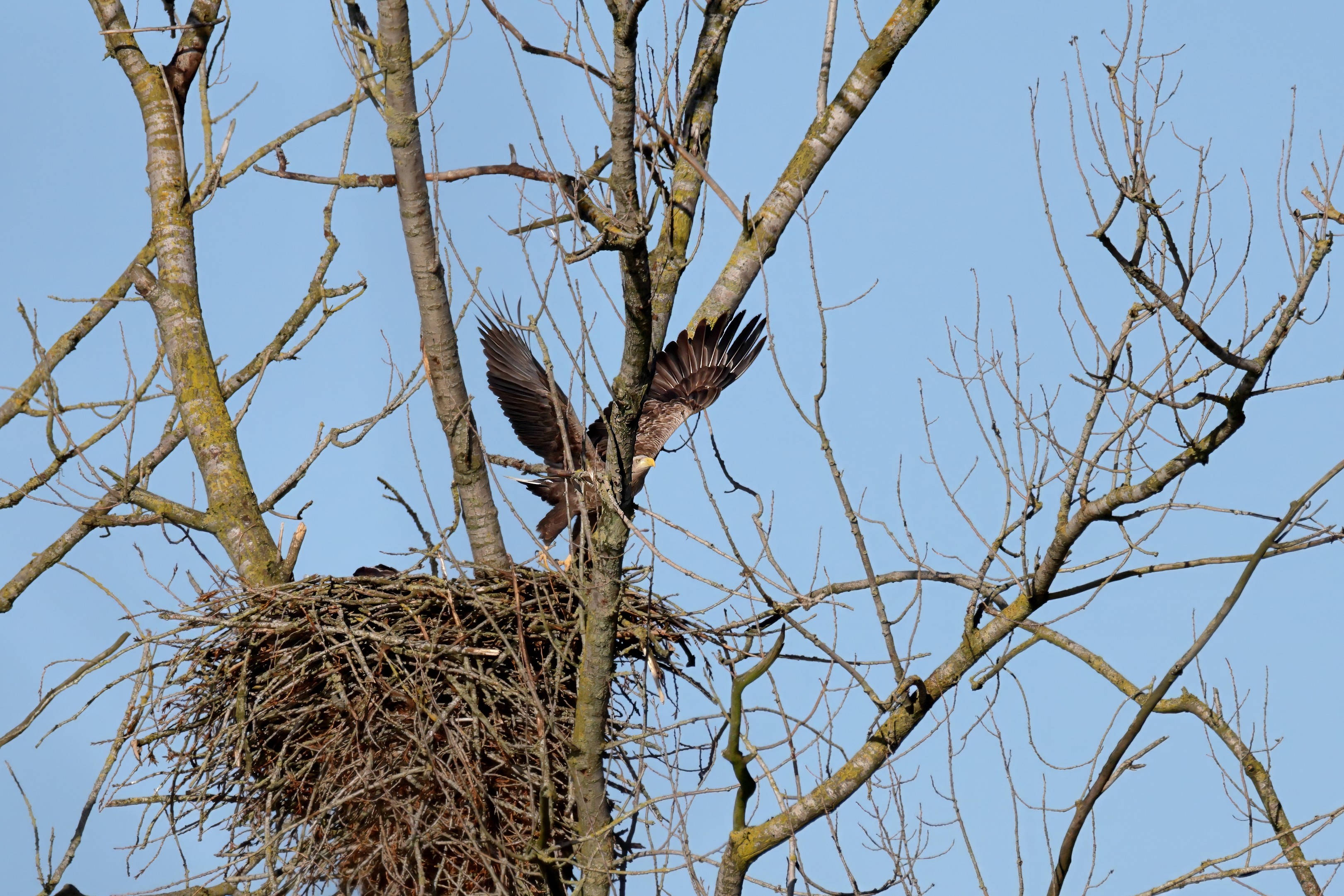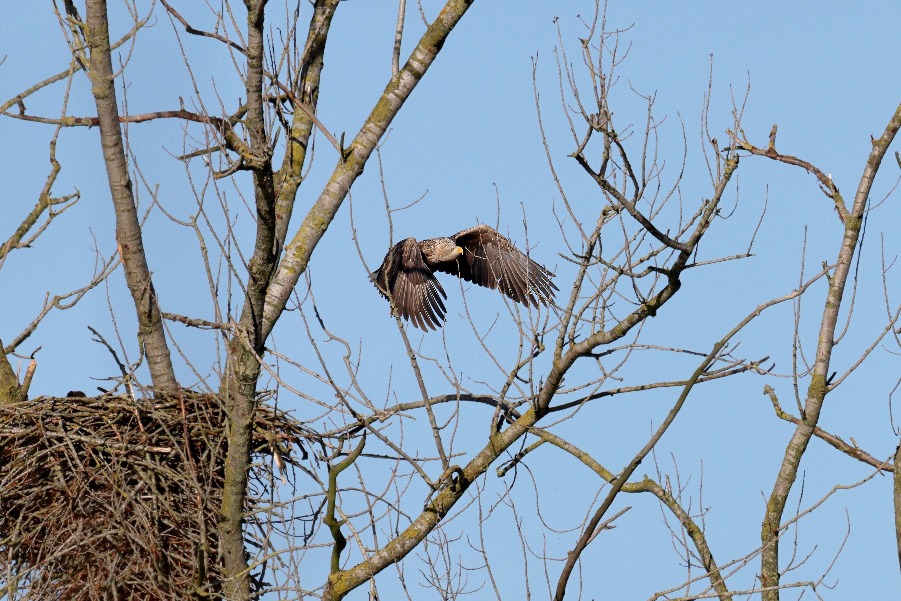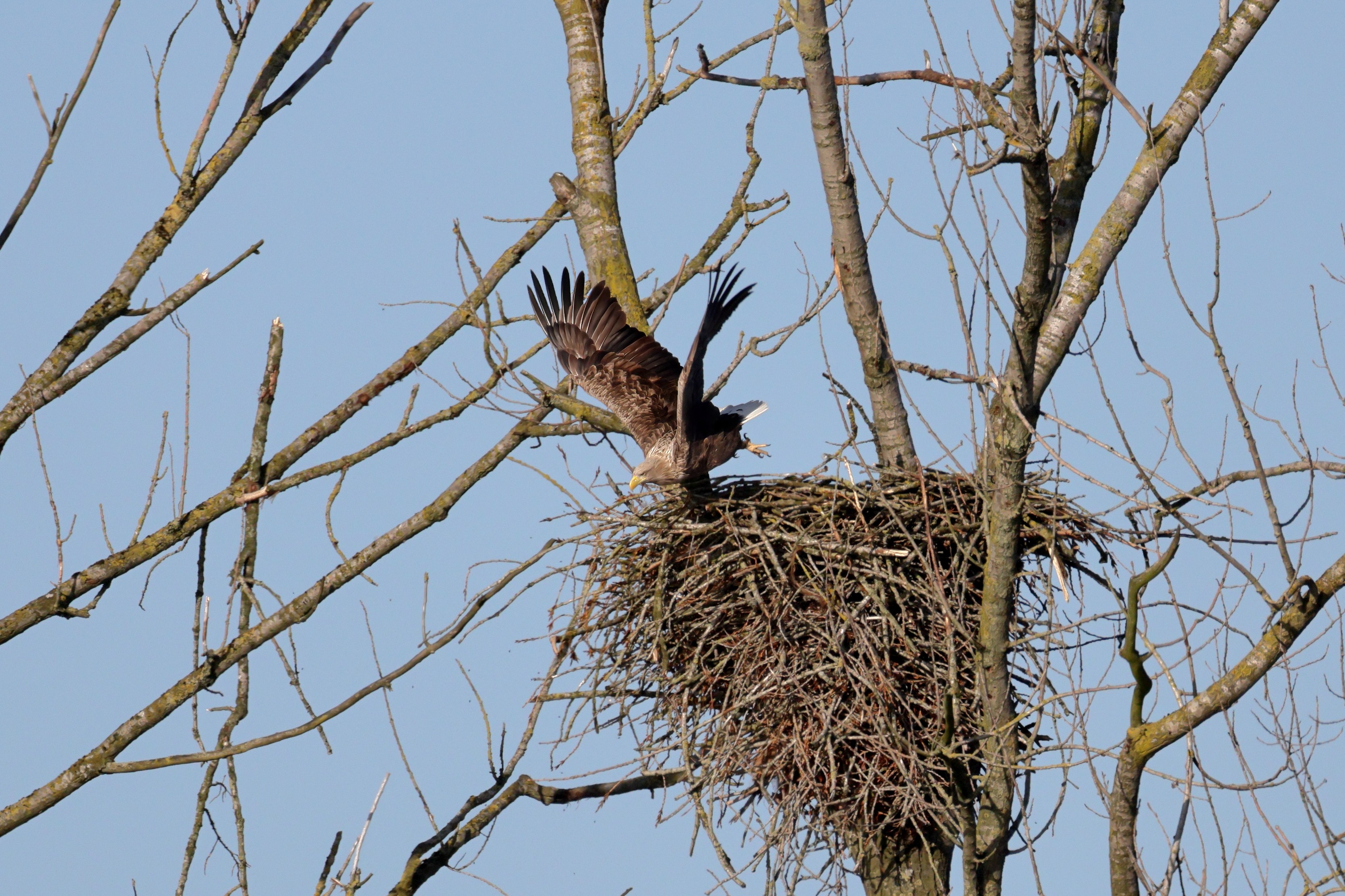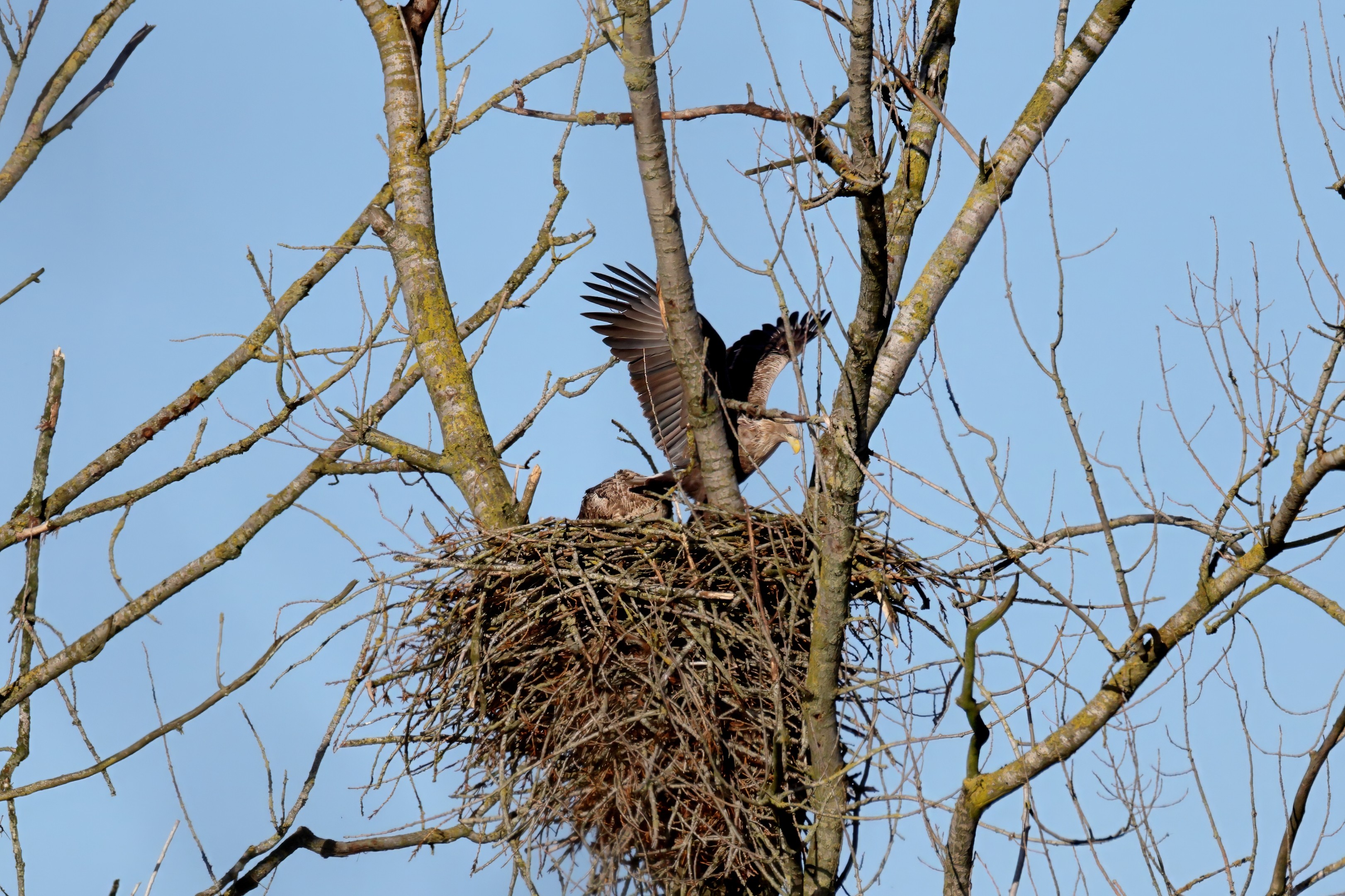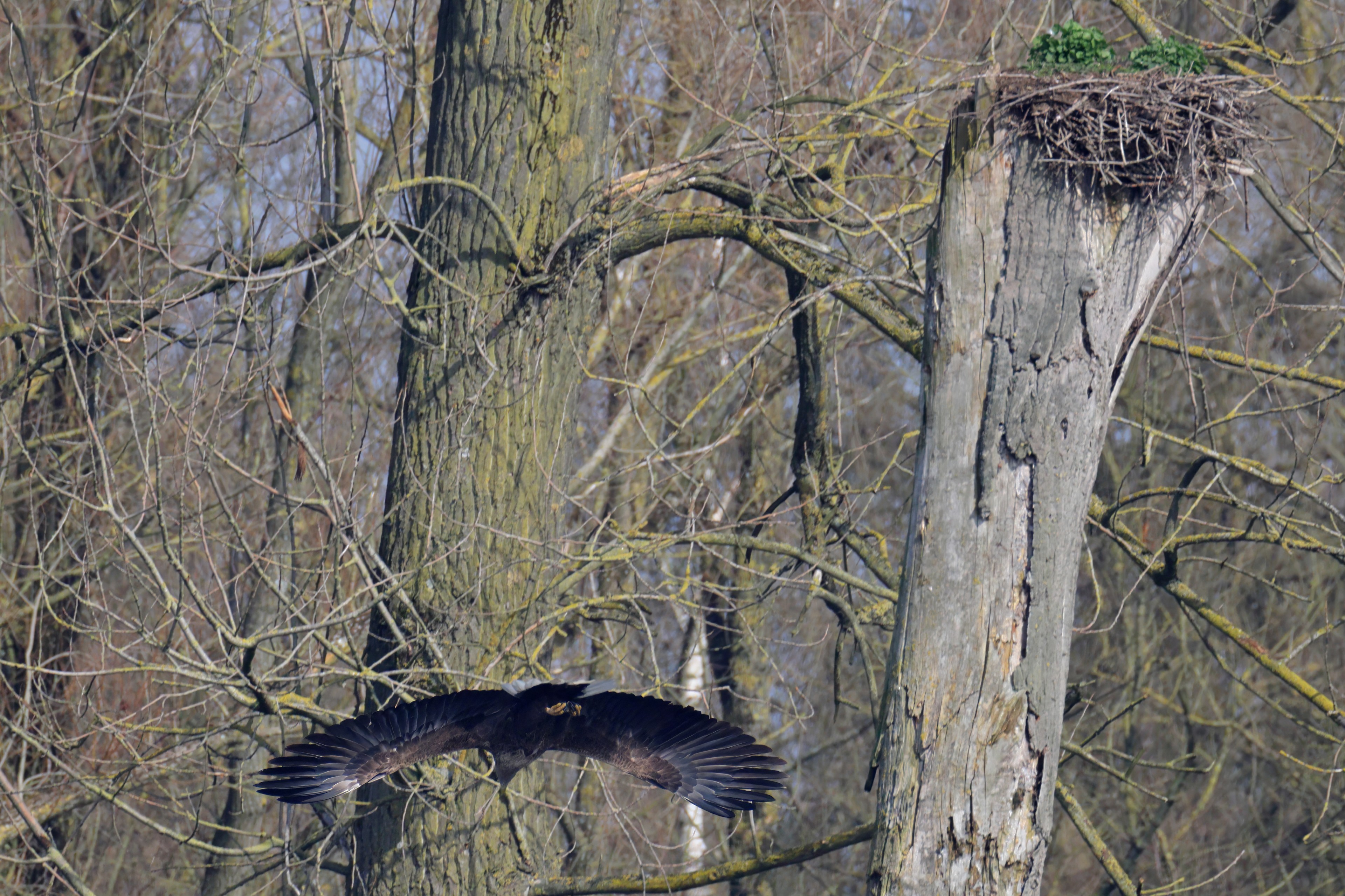 Während der etwa 38 bis 42 Tage dauernden Brutzeit der Seeadler kommt es meist nur zu kurzen Ablösungen zwischen den Partnern. Doch wenn gutes Wetter, die Tageszeit und der natürliche Bewegungsdrang nach den langen Brutsitzungen zusammentreffen, lassen sich vom abgelösten Partner manchmal ganz besondere Aufnahmen gestalten.
