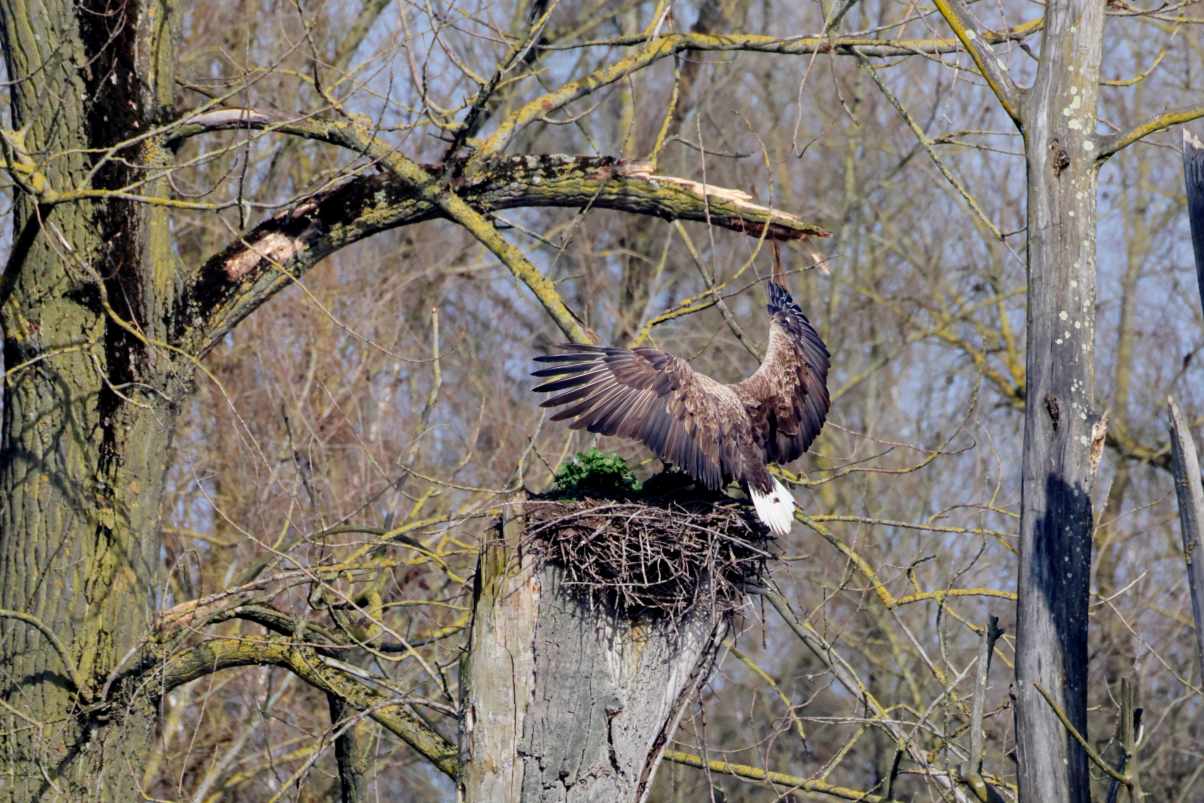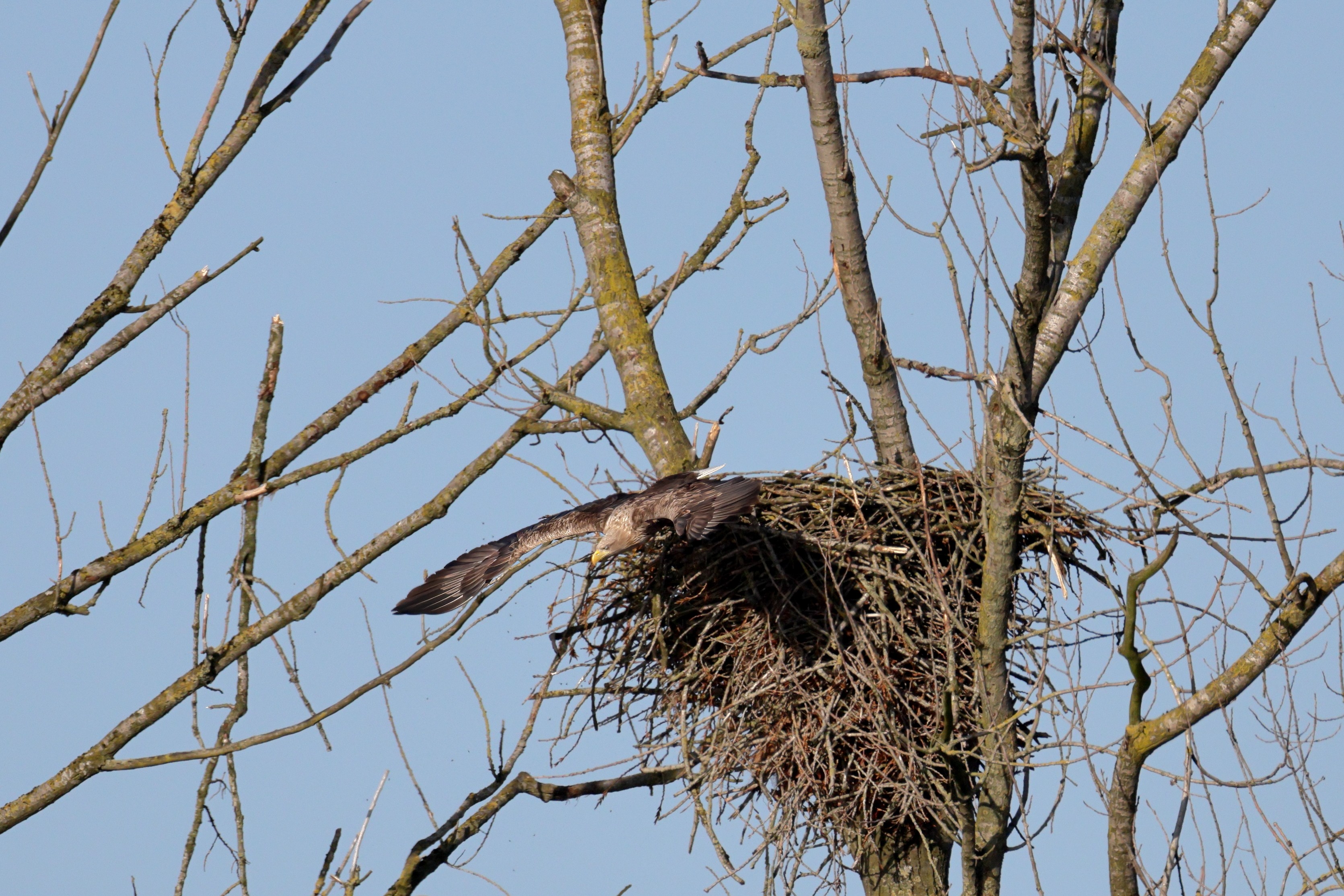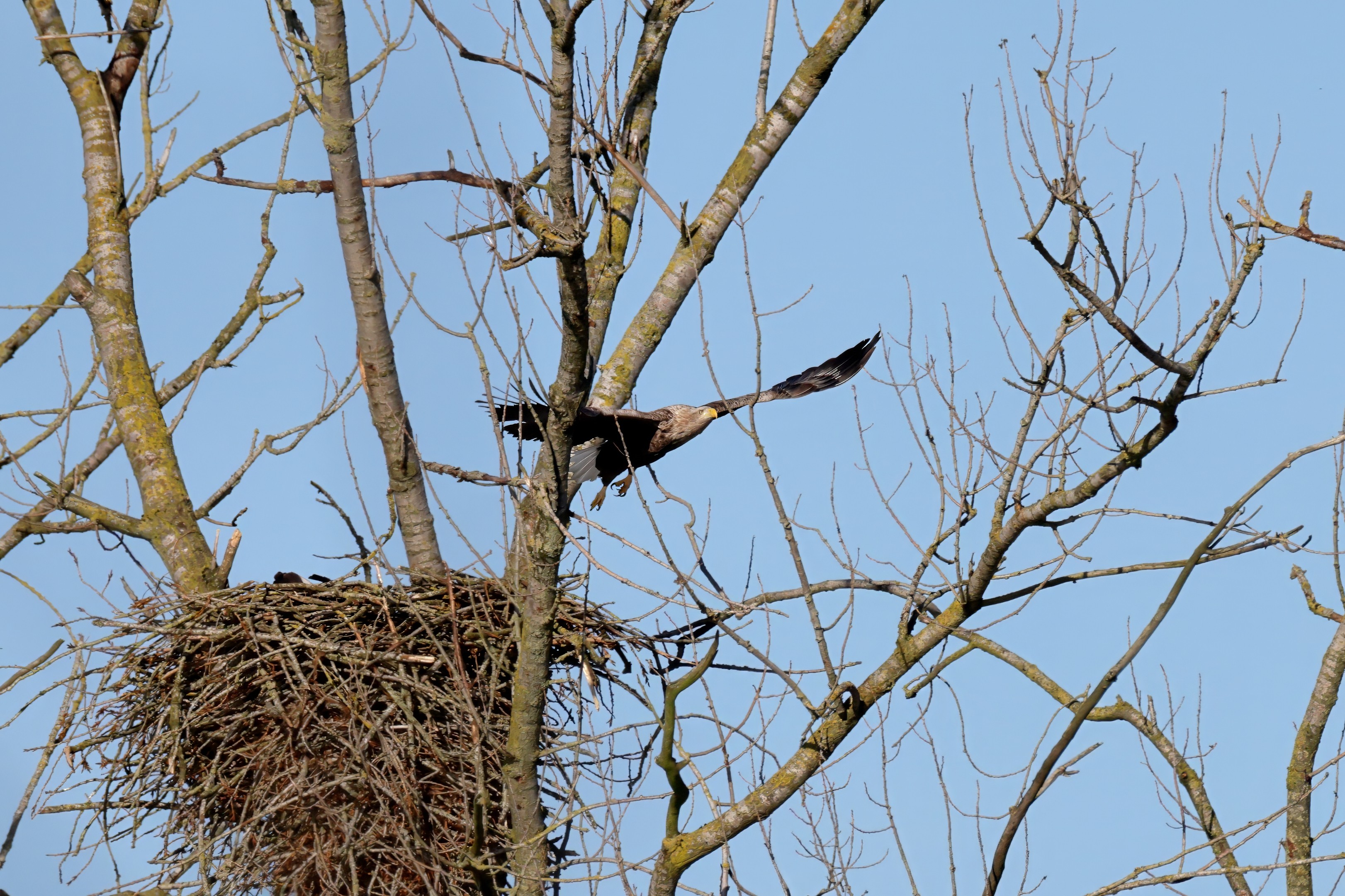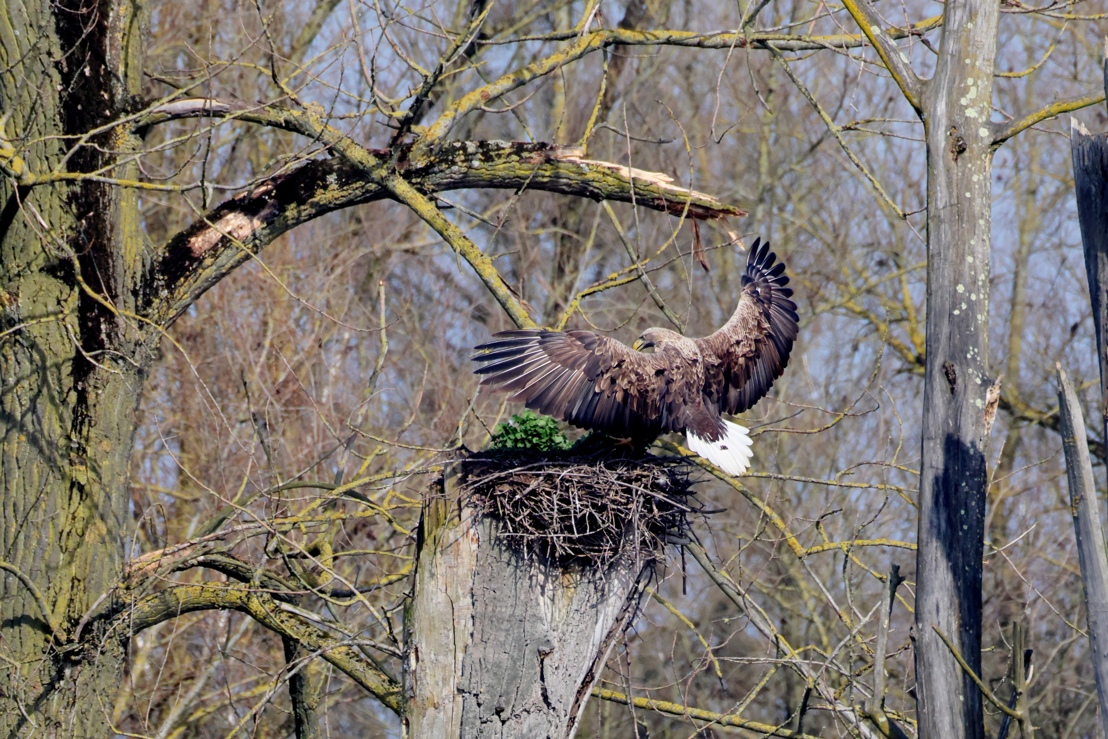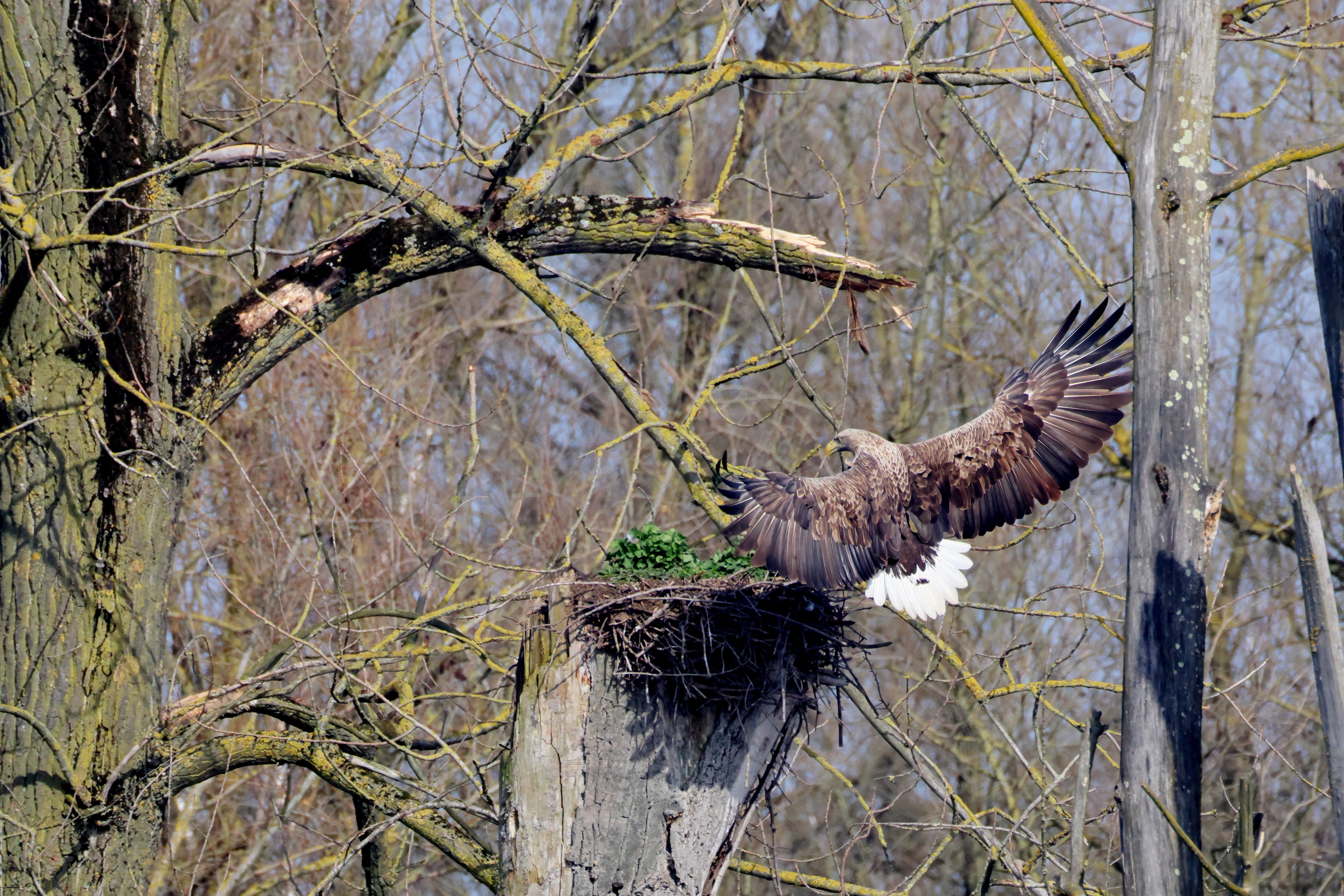 Während der etwa 38 bis 42 Tage dauernden Brutzeit der Seeadler kommt es meist nur zu kurzen Ablösungen zwischen den Partnern. Doch wenn gutes Wetter, die Tageszeit und der natürliche Bewegungsdrang nach den langen Brutsitzungen zusammentreffen, lassen sich vom abgelösten Partner manchmal ganz besondere Aufnahmen gestalten.