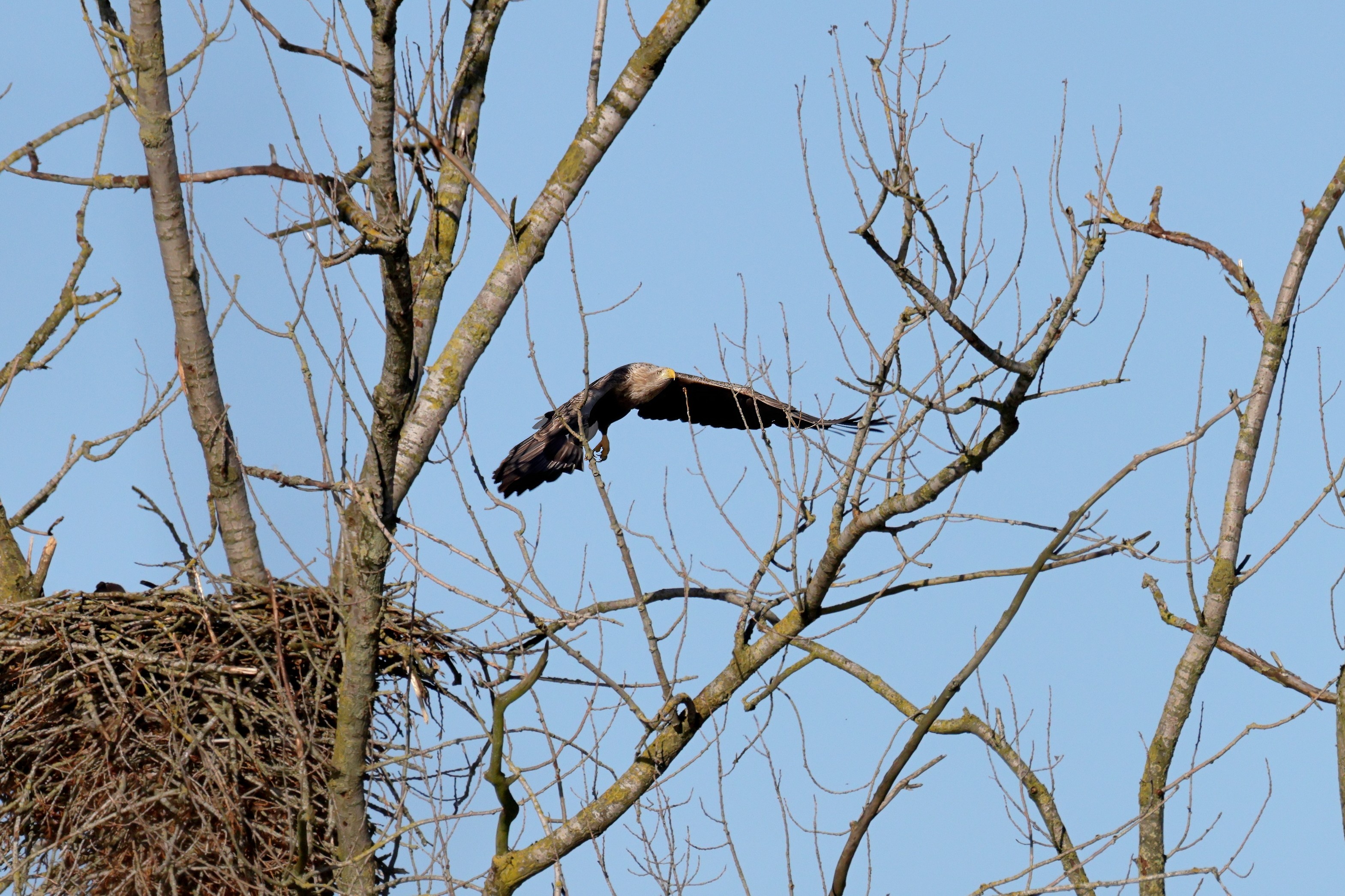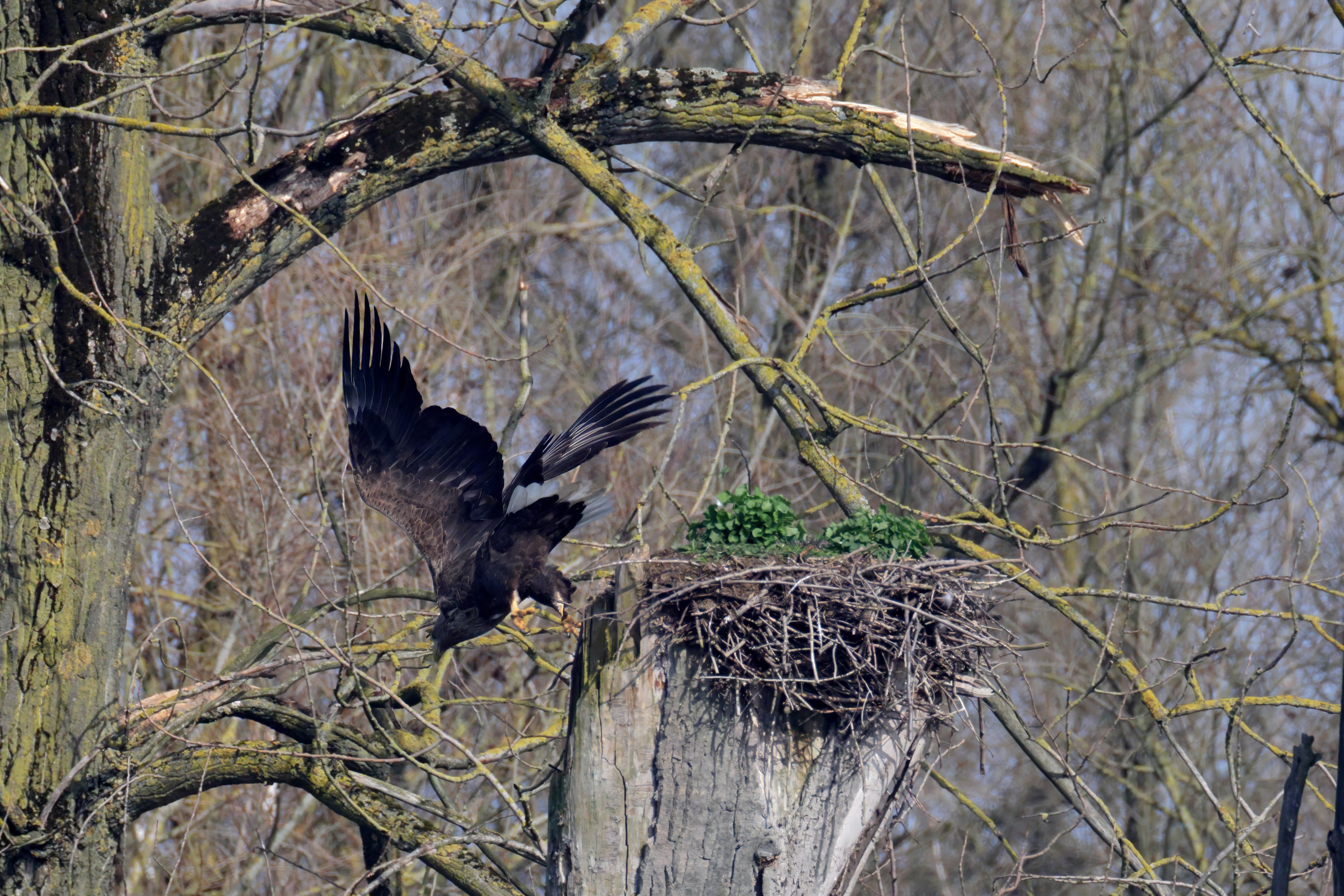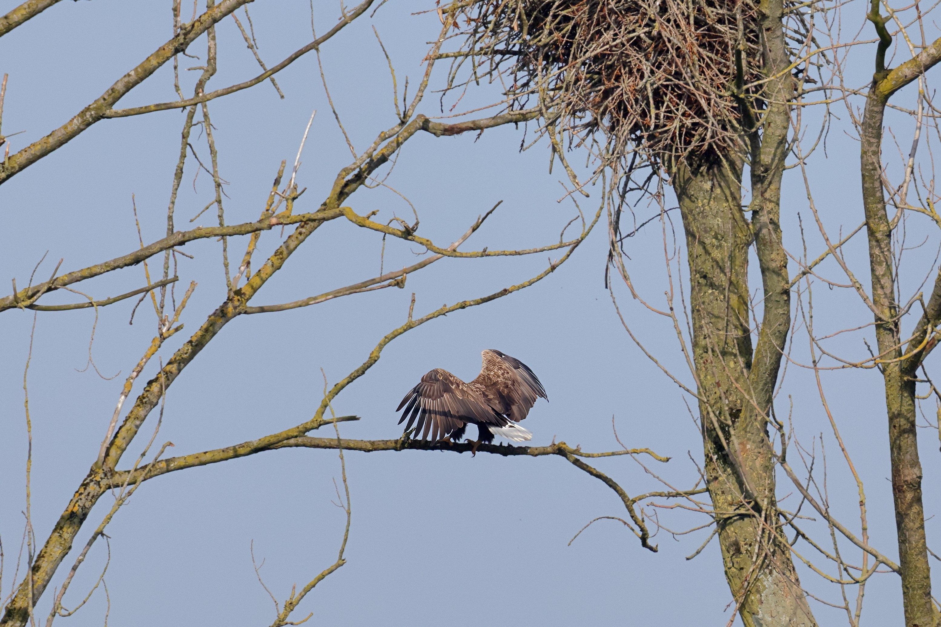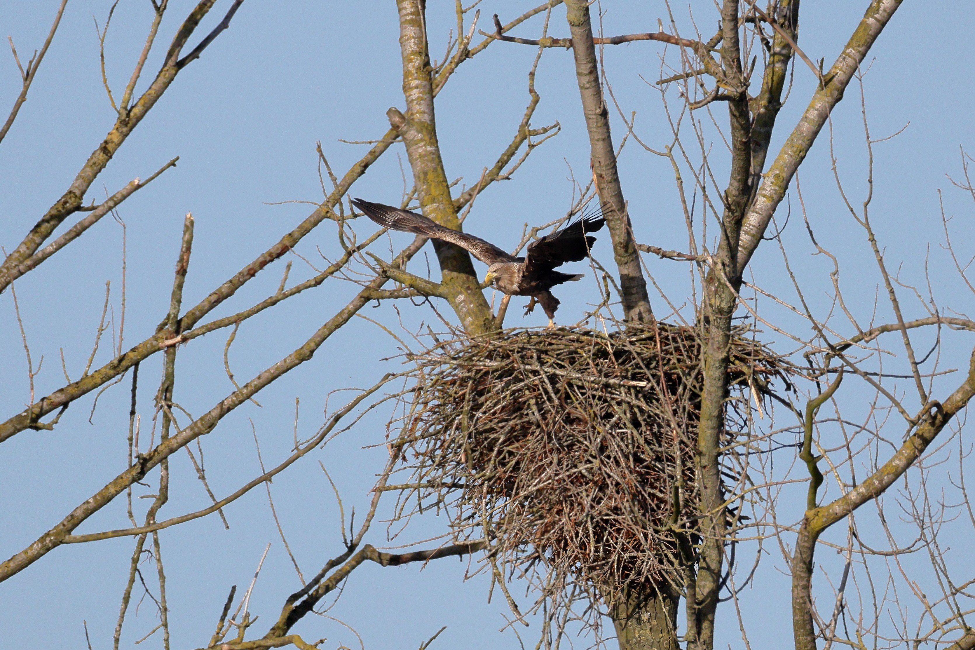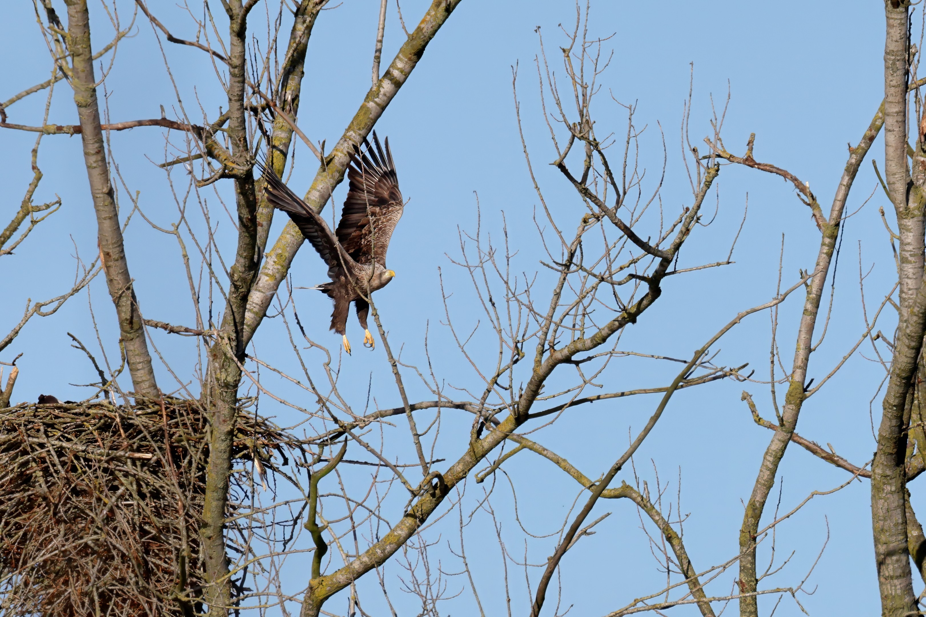 Während der etwa 38 bis 42 Tage dauernden Brutzeit der Seeadler kommt es meist nur zu kurzen Ablösungen zwischen den Partnern. Doch wenn gutes Wetter, die Tageszeit und der natürliche Bewegungsdrang nach den langen Brutsitzungen zusammentreffen, lassen sich vom abgelösten Partner manchmal ganz besondere Aufnahmen gestalten.