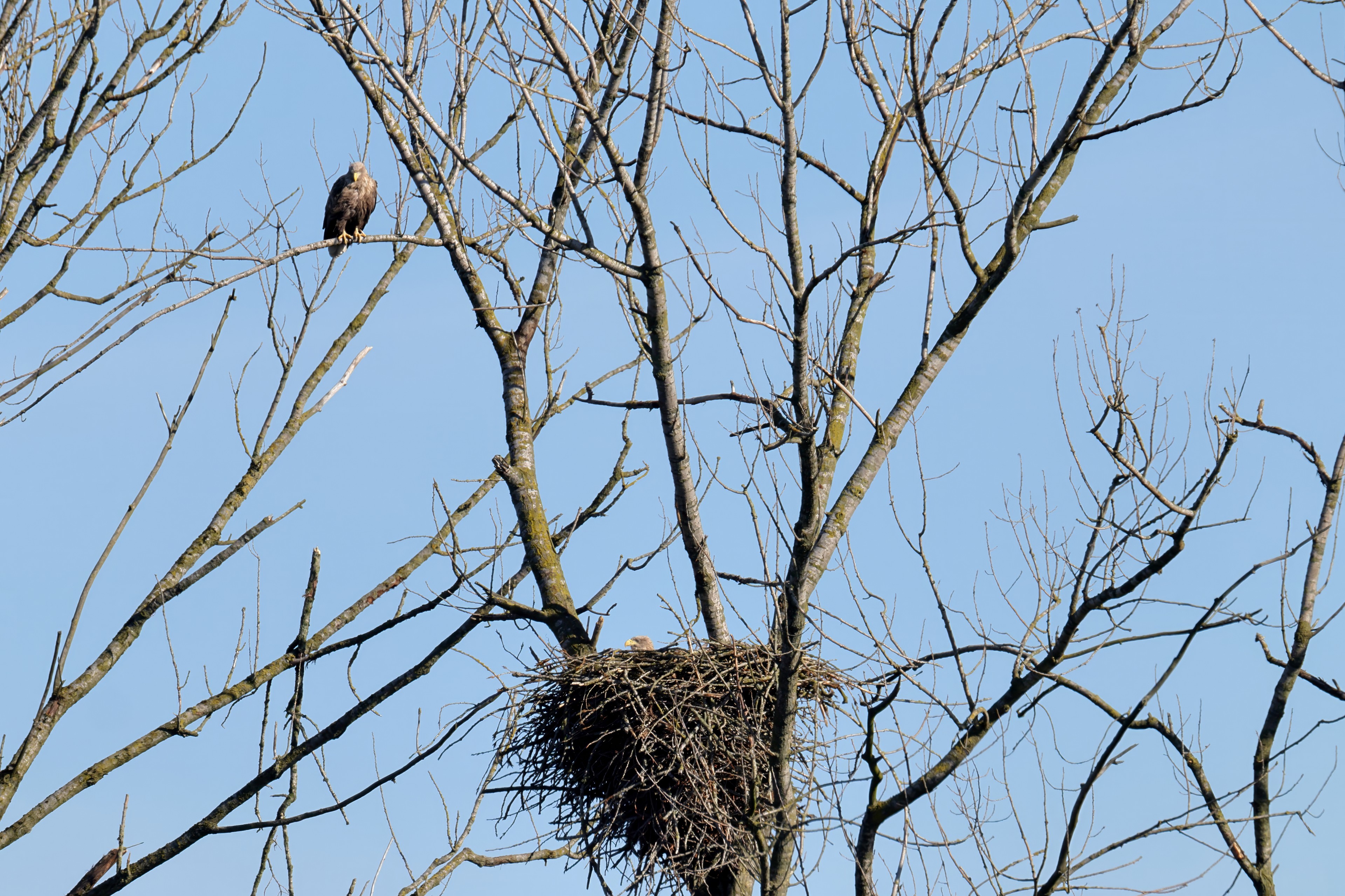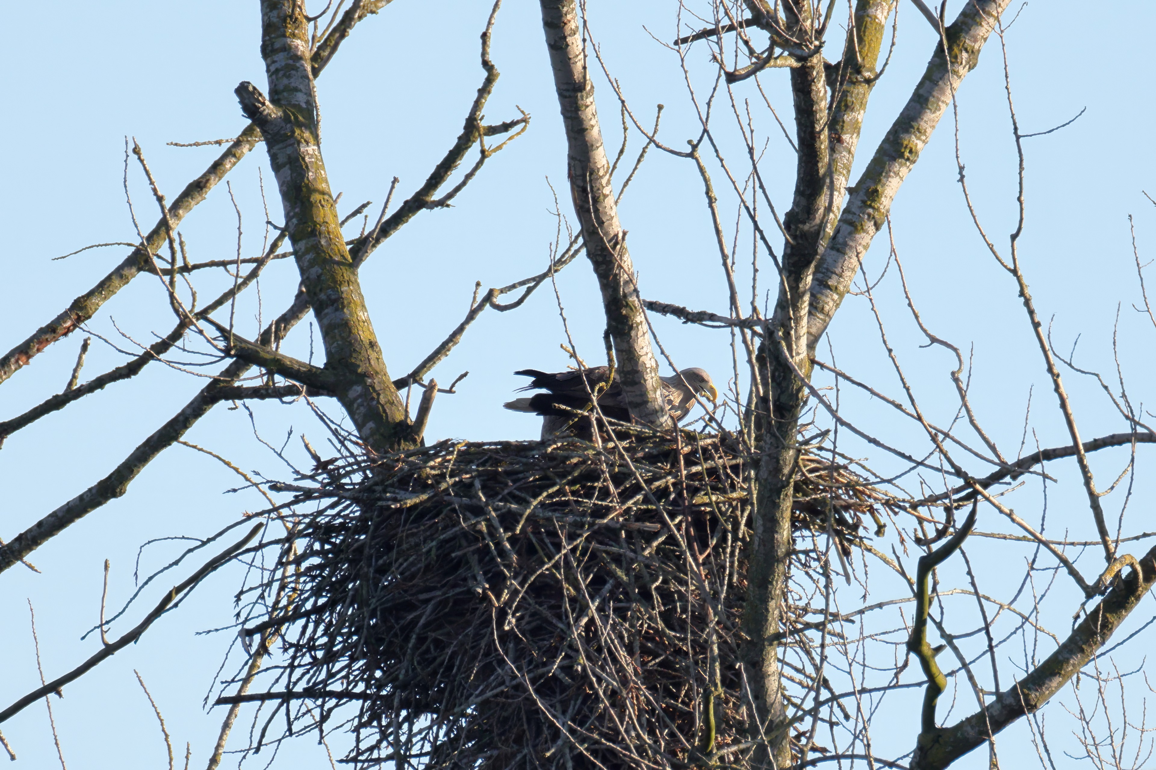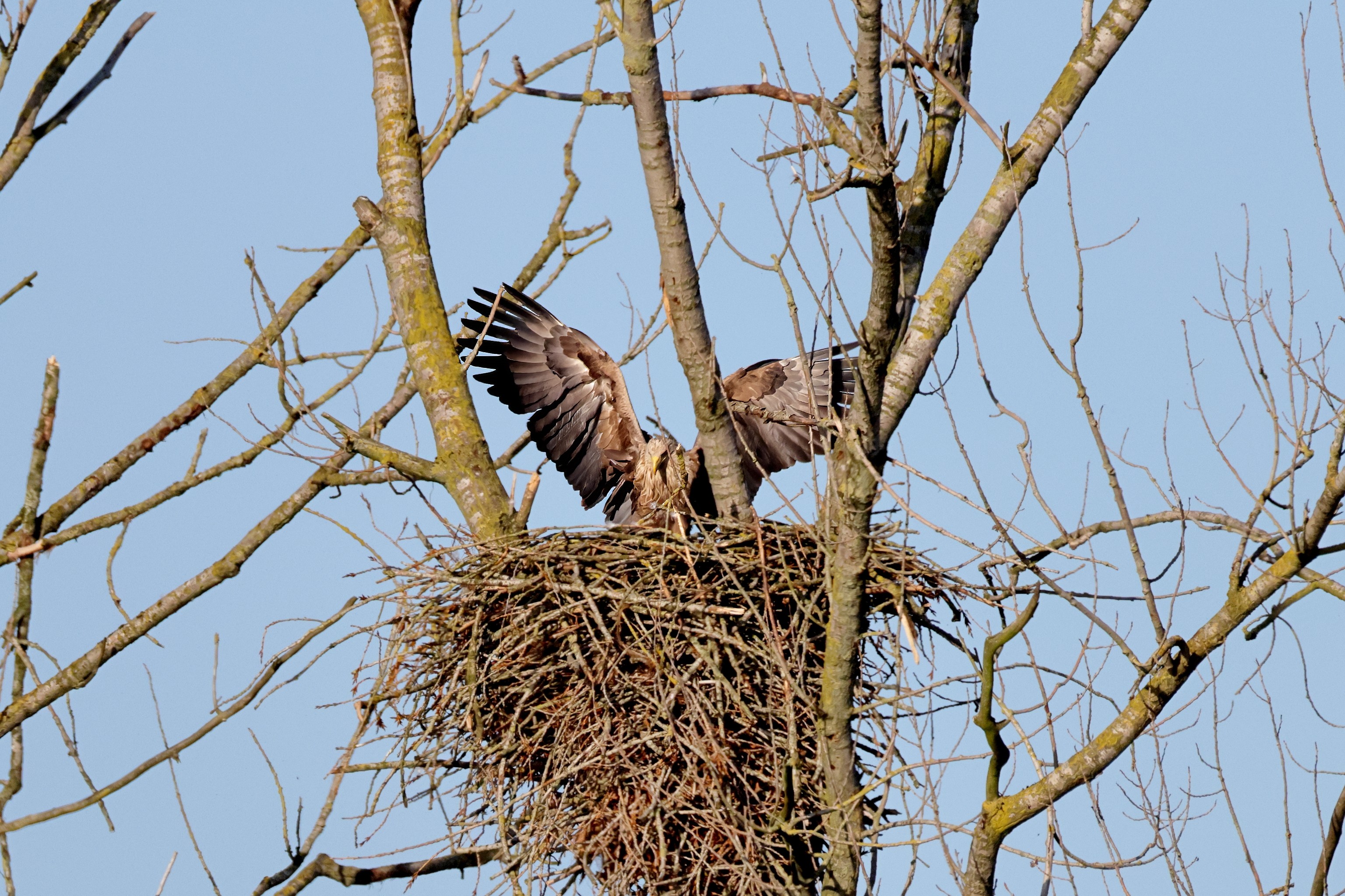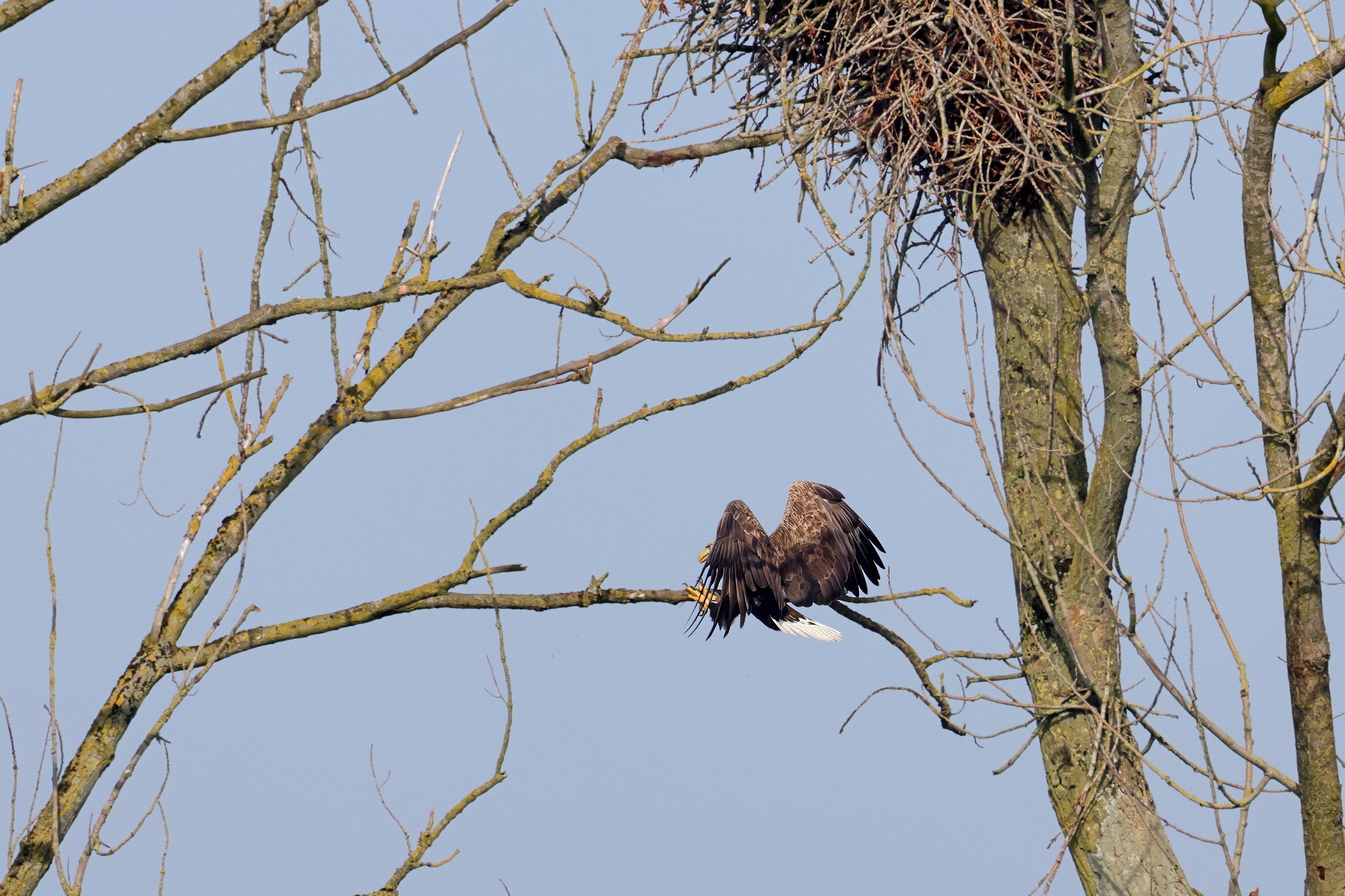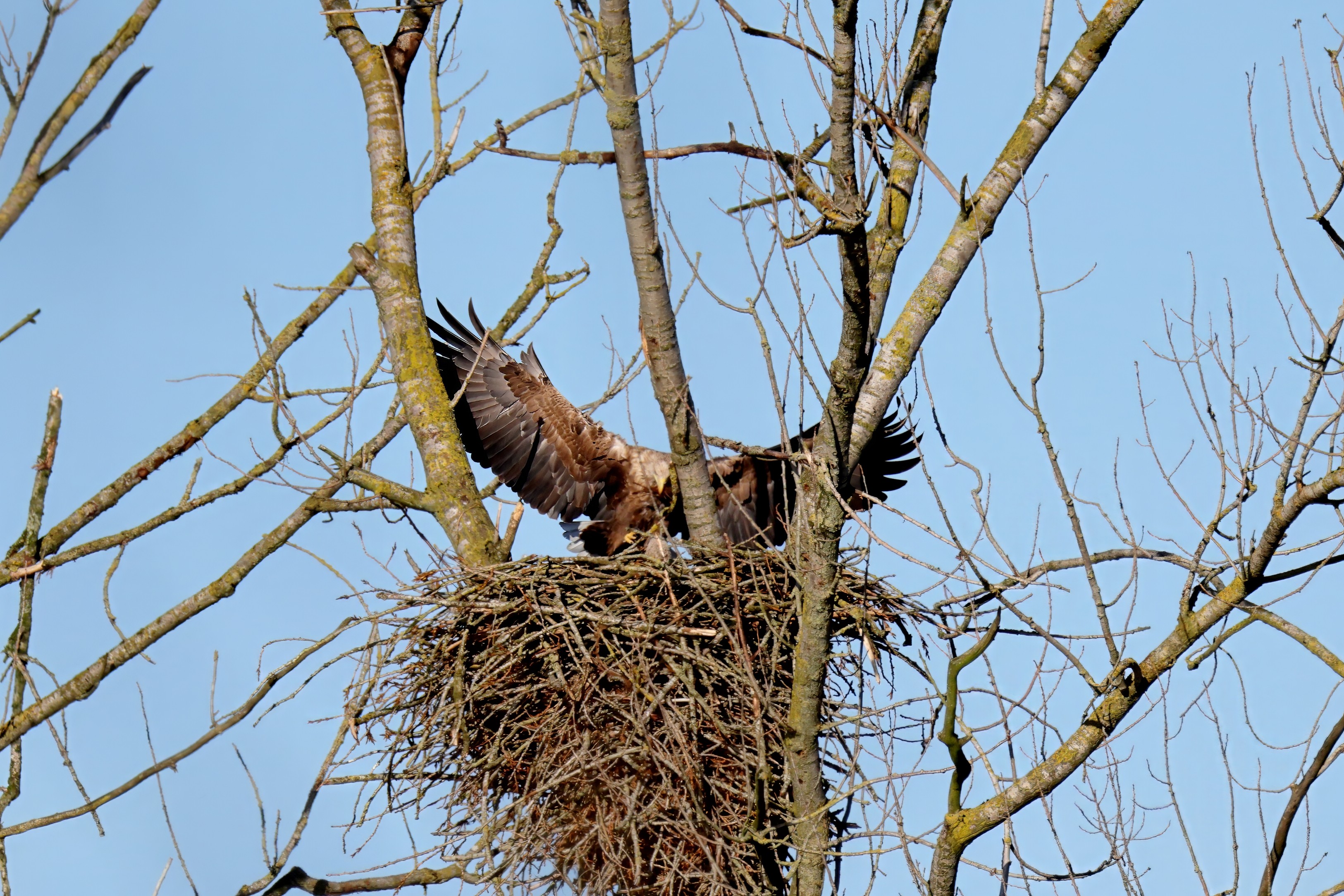 Während der etwa 38 bis 42 Tage dauernden Brutzeit der Seeadler kommt es meist nur zu kurzen Ablösungen zwischen den Partnern. Doch wenn gutes Wetter, die Tageszeit und der natürliche Bewegungsdrang nach den langen Brutsitzungen zusammentreffen, lassen sich vom abgelösten Partner manchmal ganz besondere Aufnahmen gestalten.