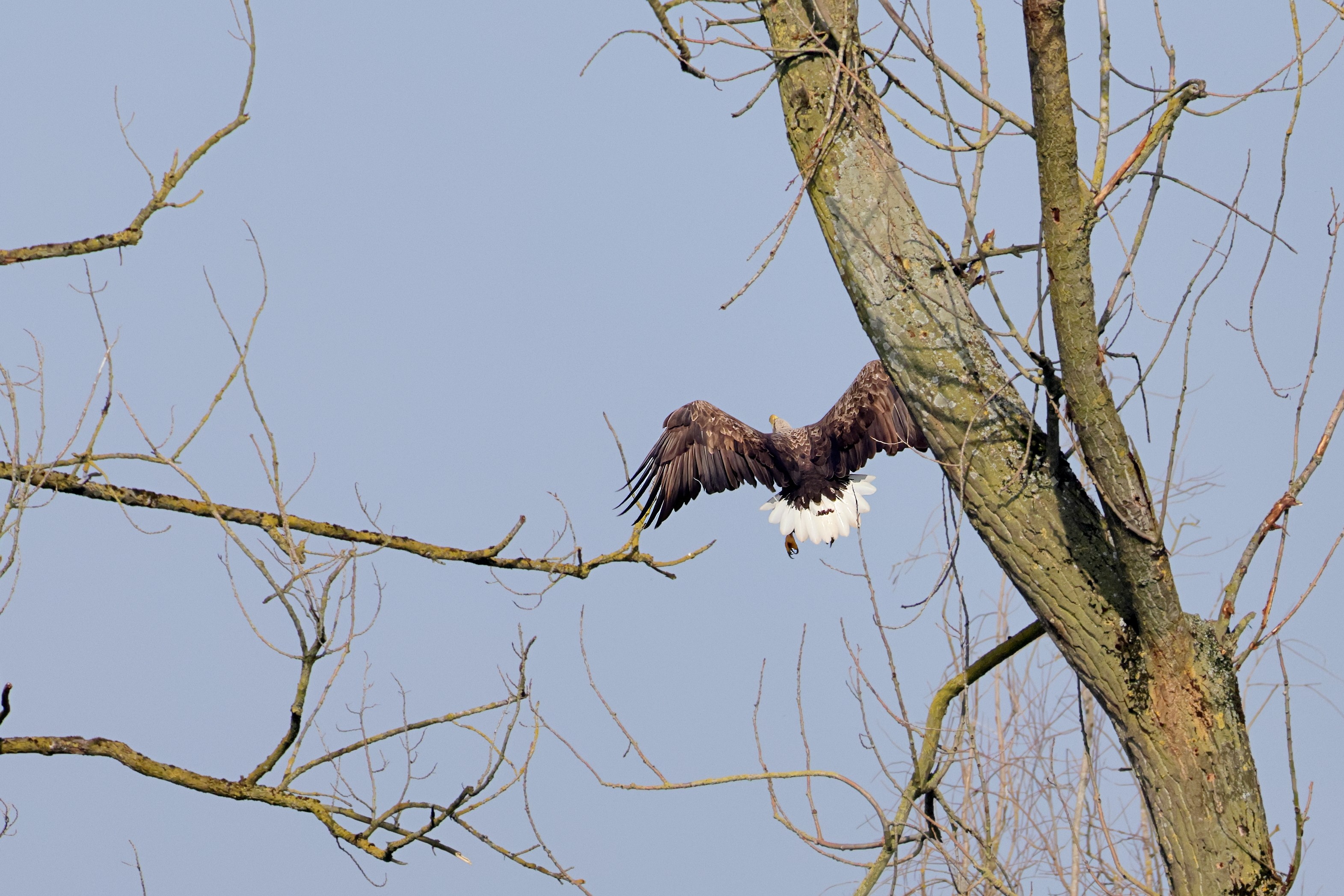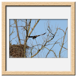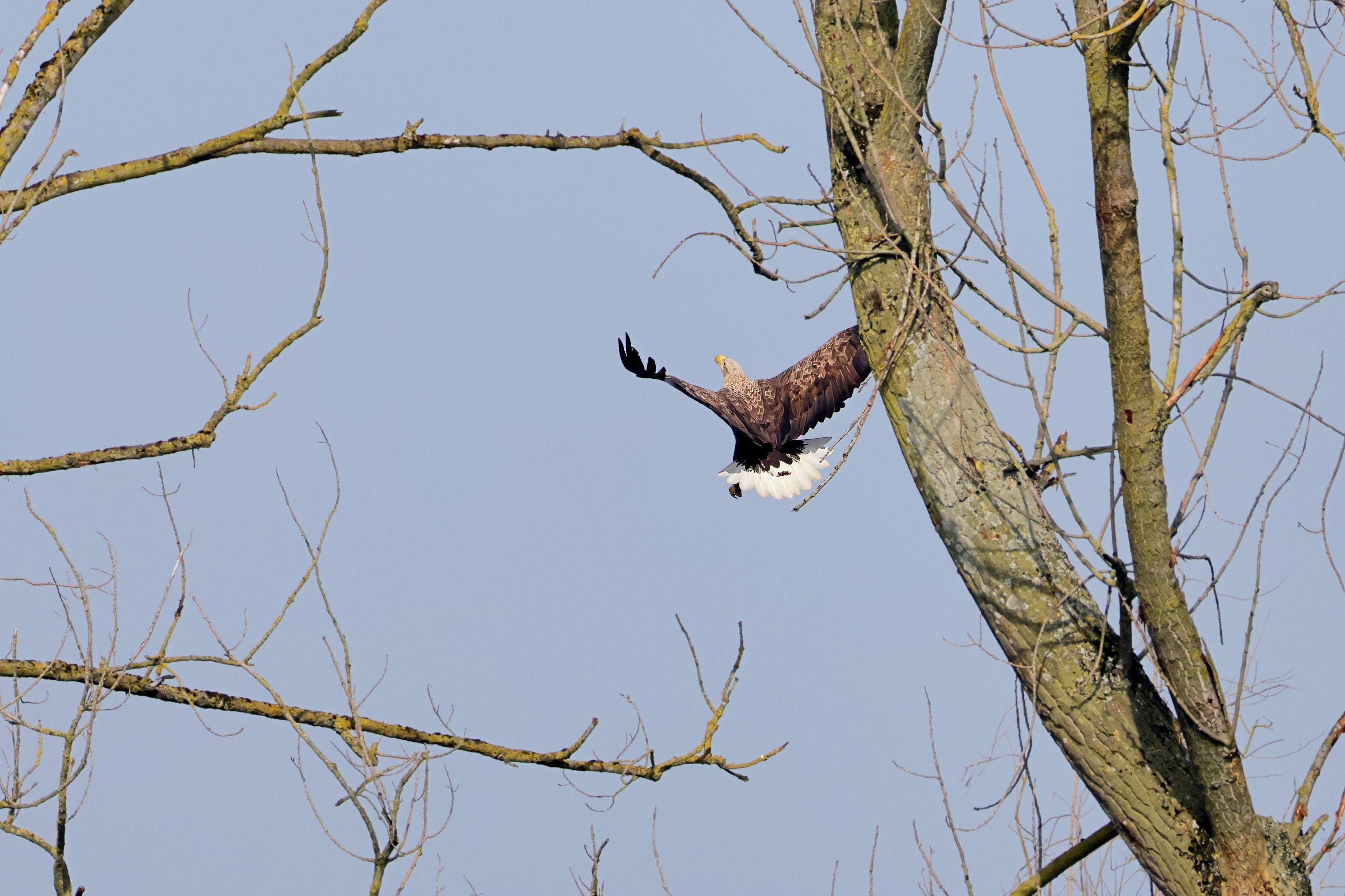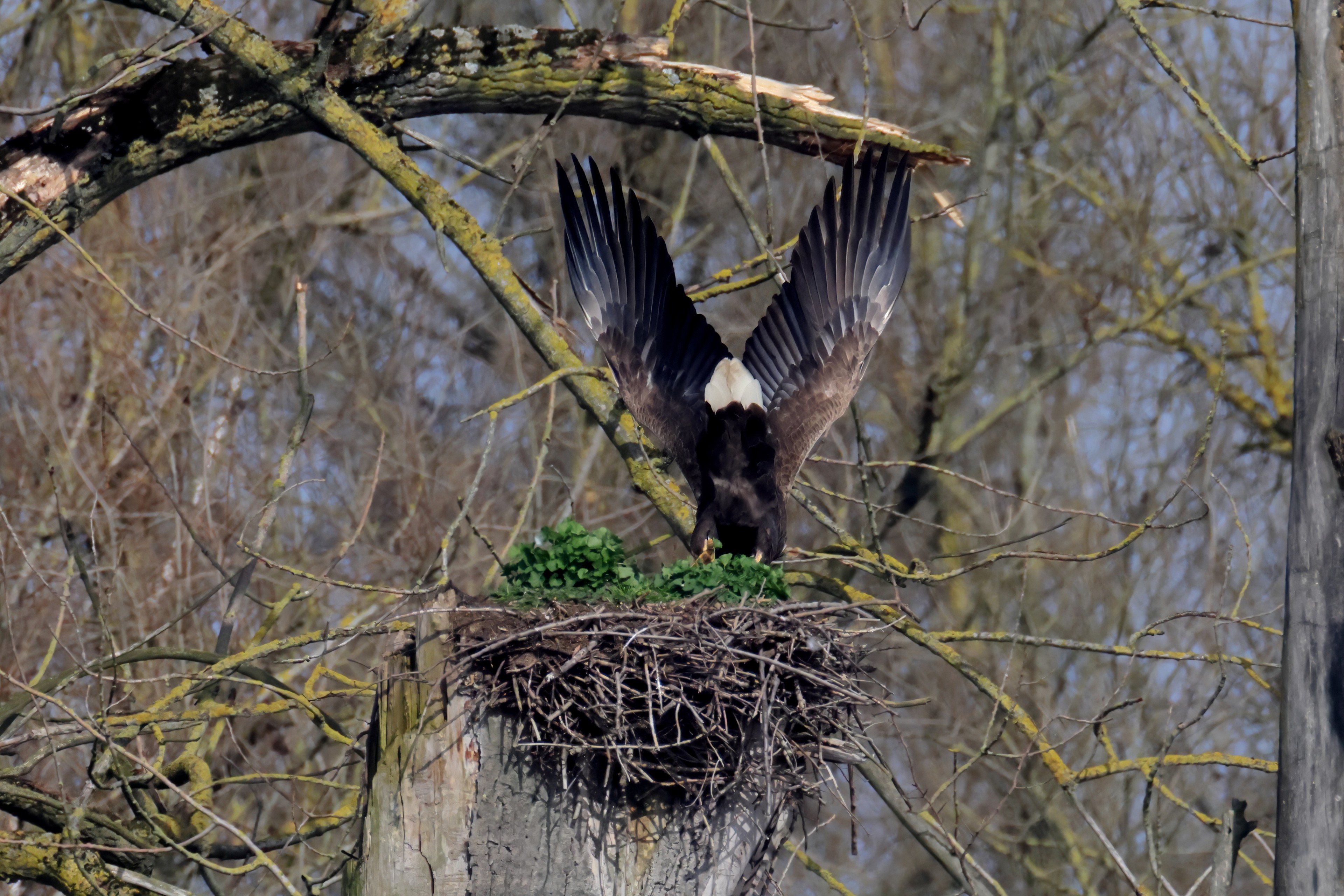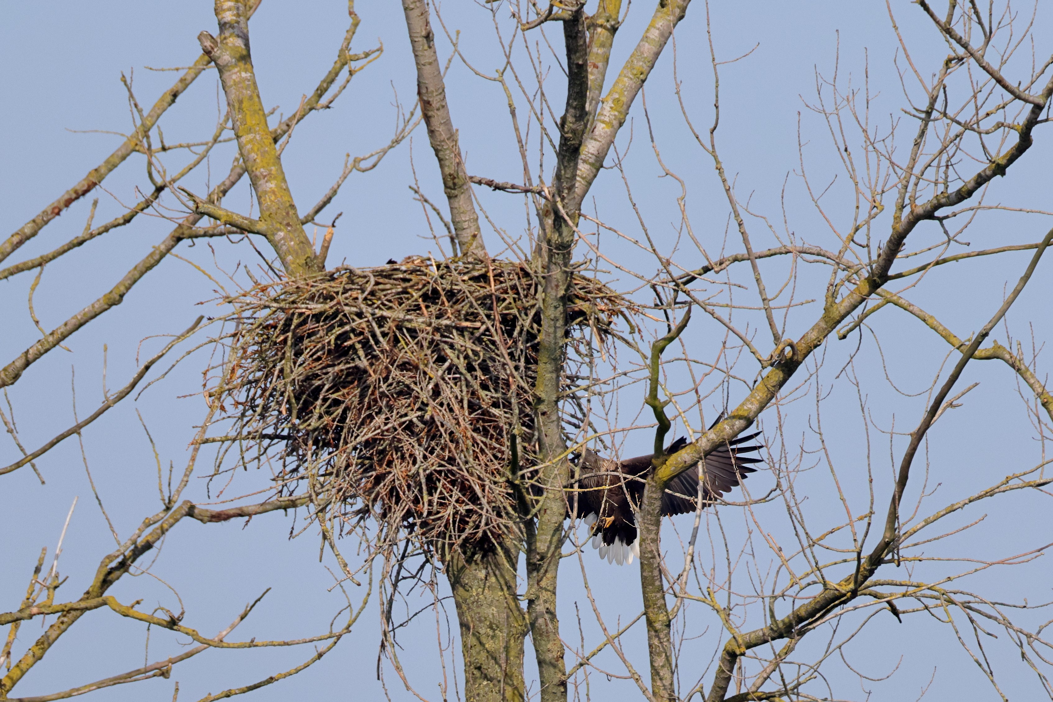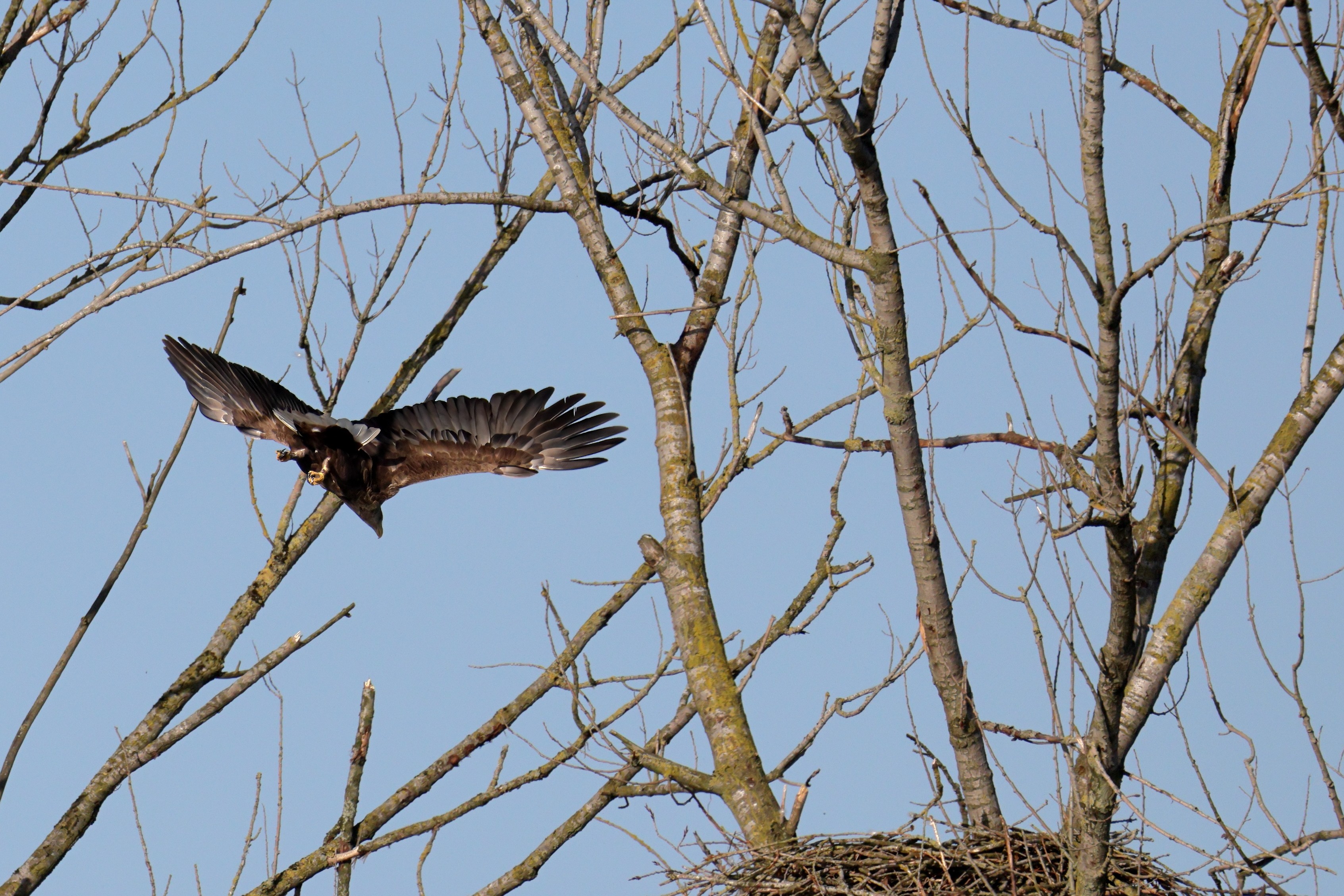 Während der etwa 38 bis 42 Tage dauernden Brutzeit der Seeadler kommt es meist nur zu kurzen Ablösungen zwischen den Partnern. Doch wenn gutes Wetter, die Tageszeit und der natürliche Bewegungsdrang nach den langen Brutsitzungen zusammentreffen, lassen sich vom abgelösten Partner manchmal ganz besondere Aufnahmen gestalten.