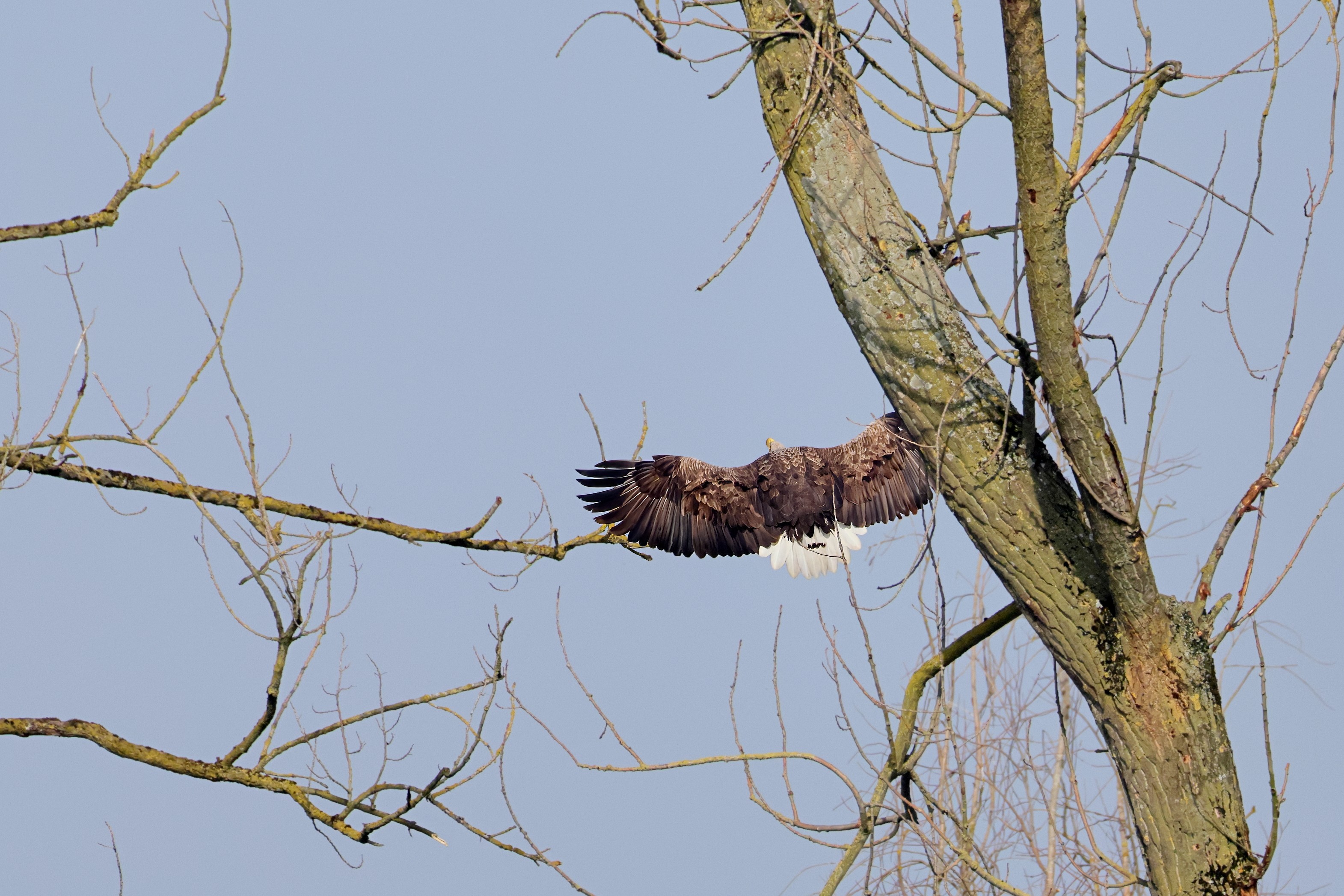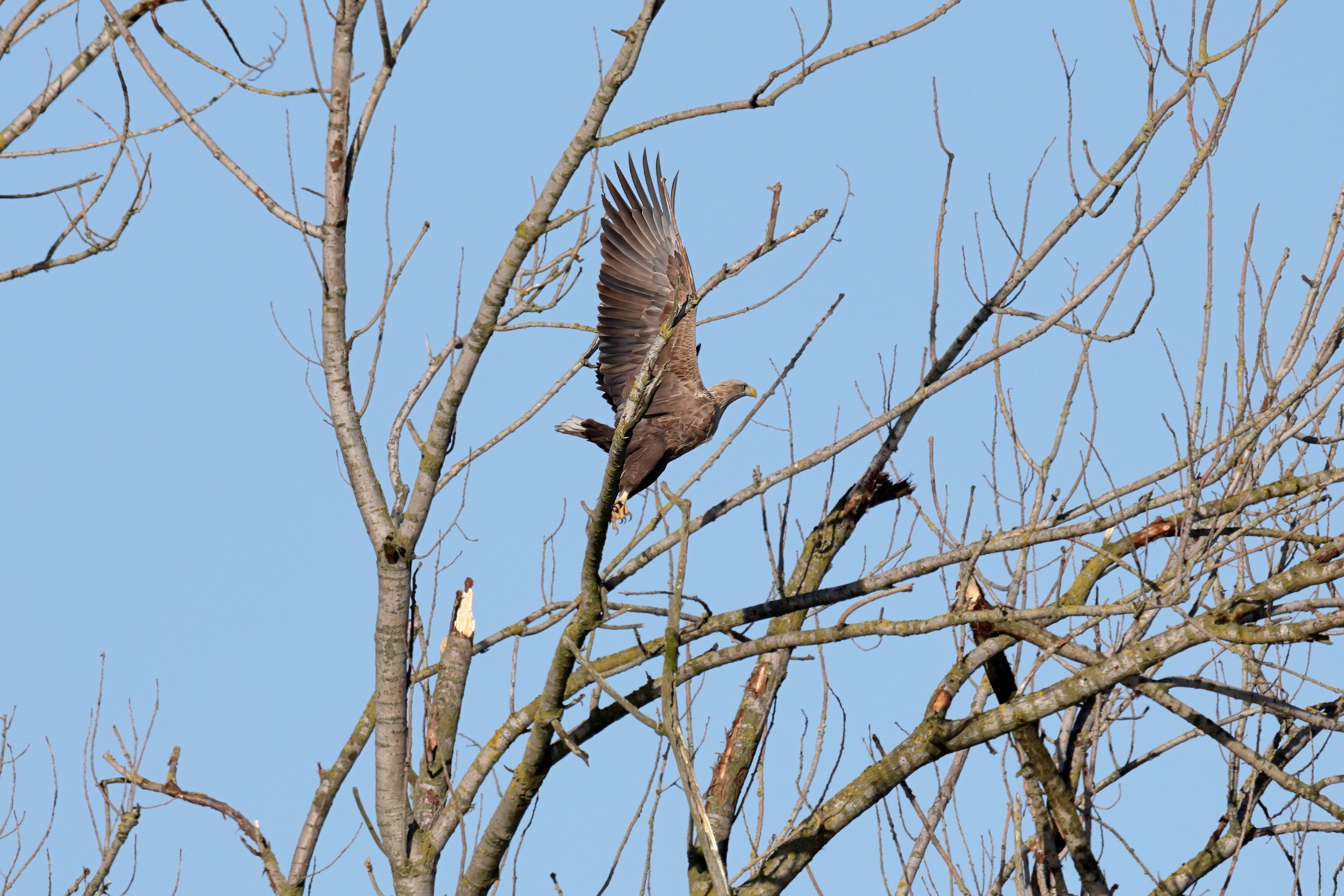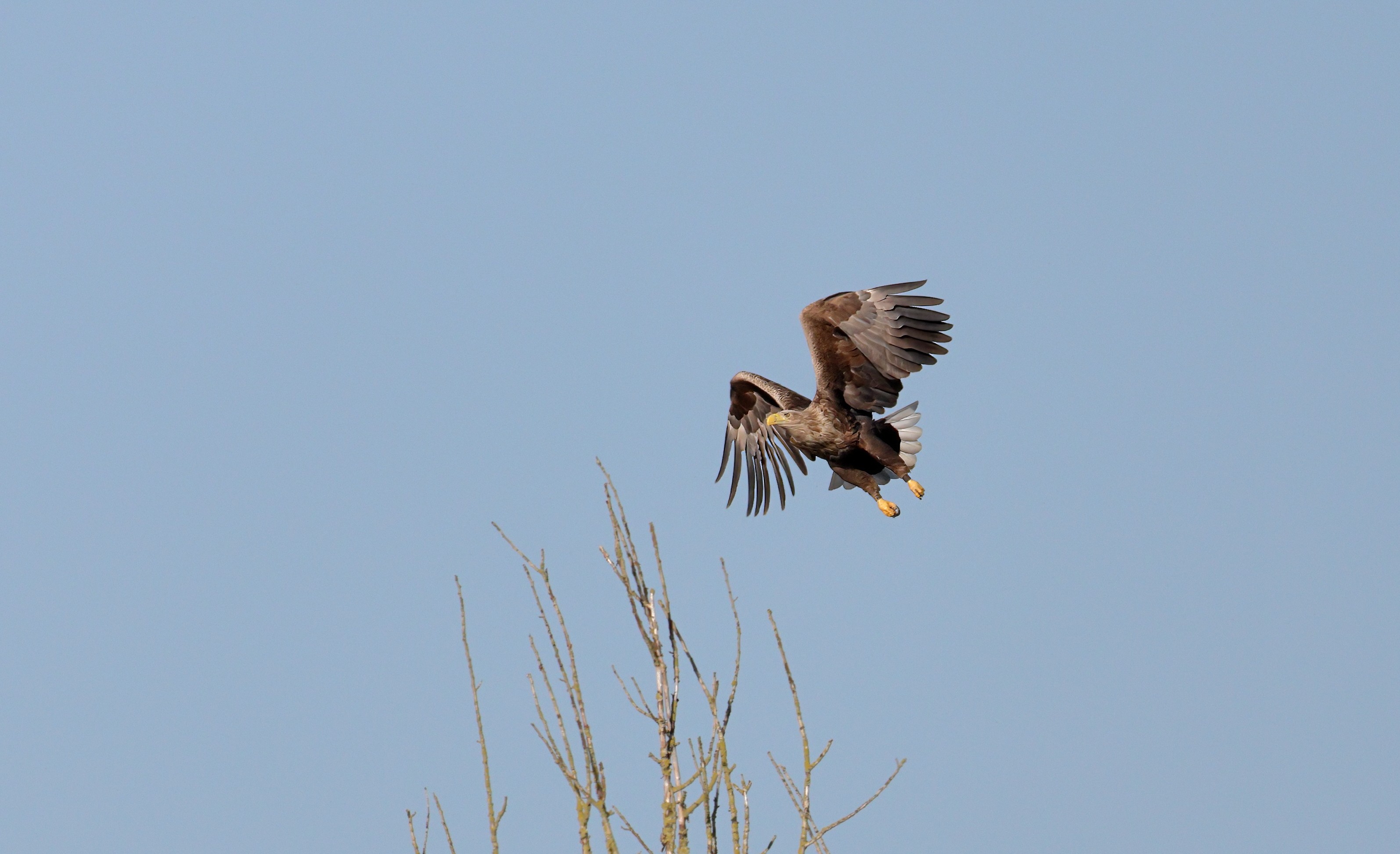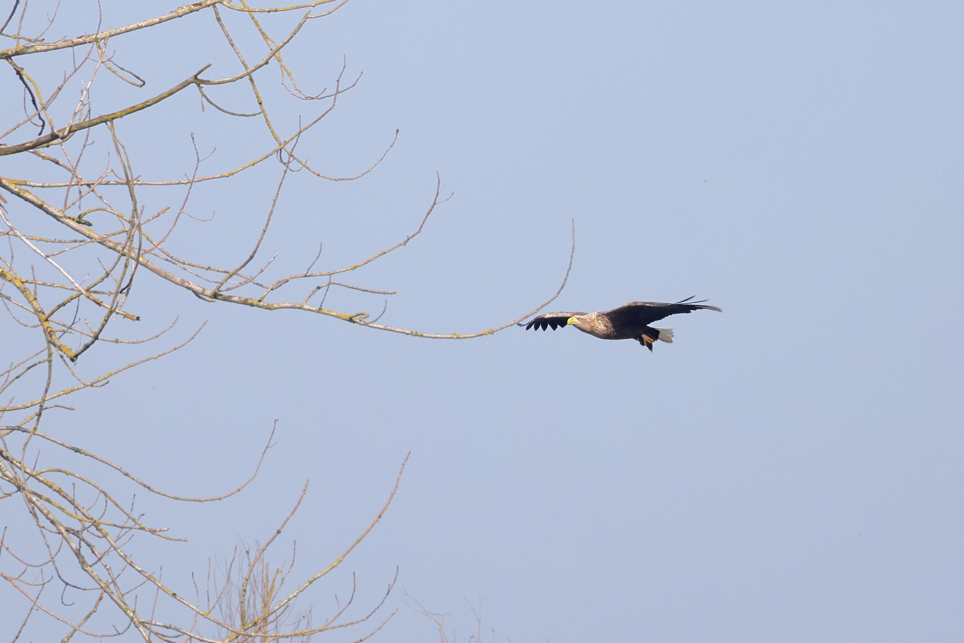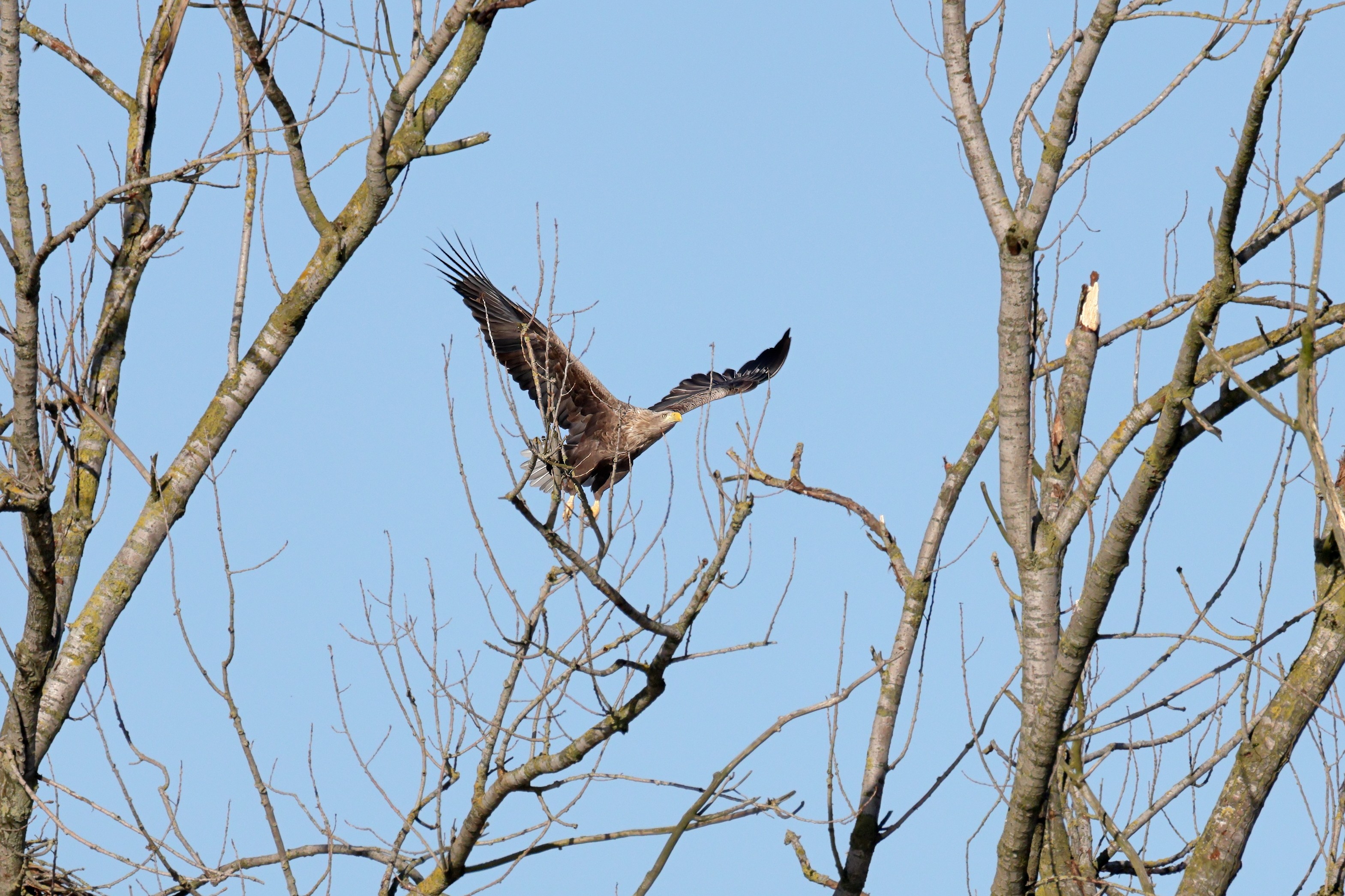 Während der etwa 38 bis 42 Tage dauernden Brutzeit der Seeadler kommt es meist nur zu kurzen Ablösungen zwischen den Partnern. Doch wenn gutes Wetter, die Tageszeit und der natürliche Bewegungsdrang nach den langen Brutsitzungen zusammentreffen, lassen sich vom abgelösten Partner manchmal ganz besondere Aufnahmen gestalten.