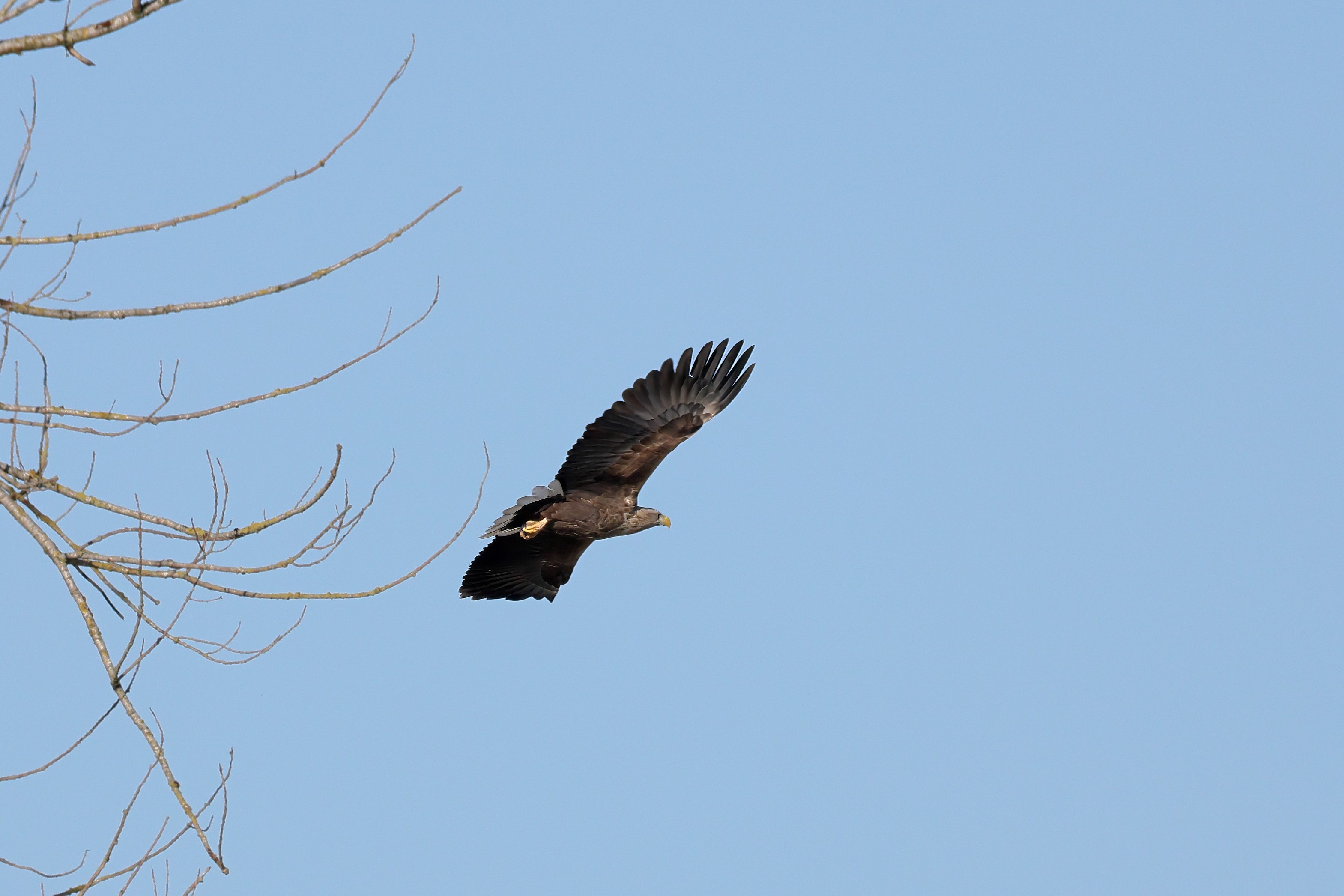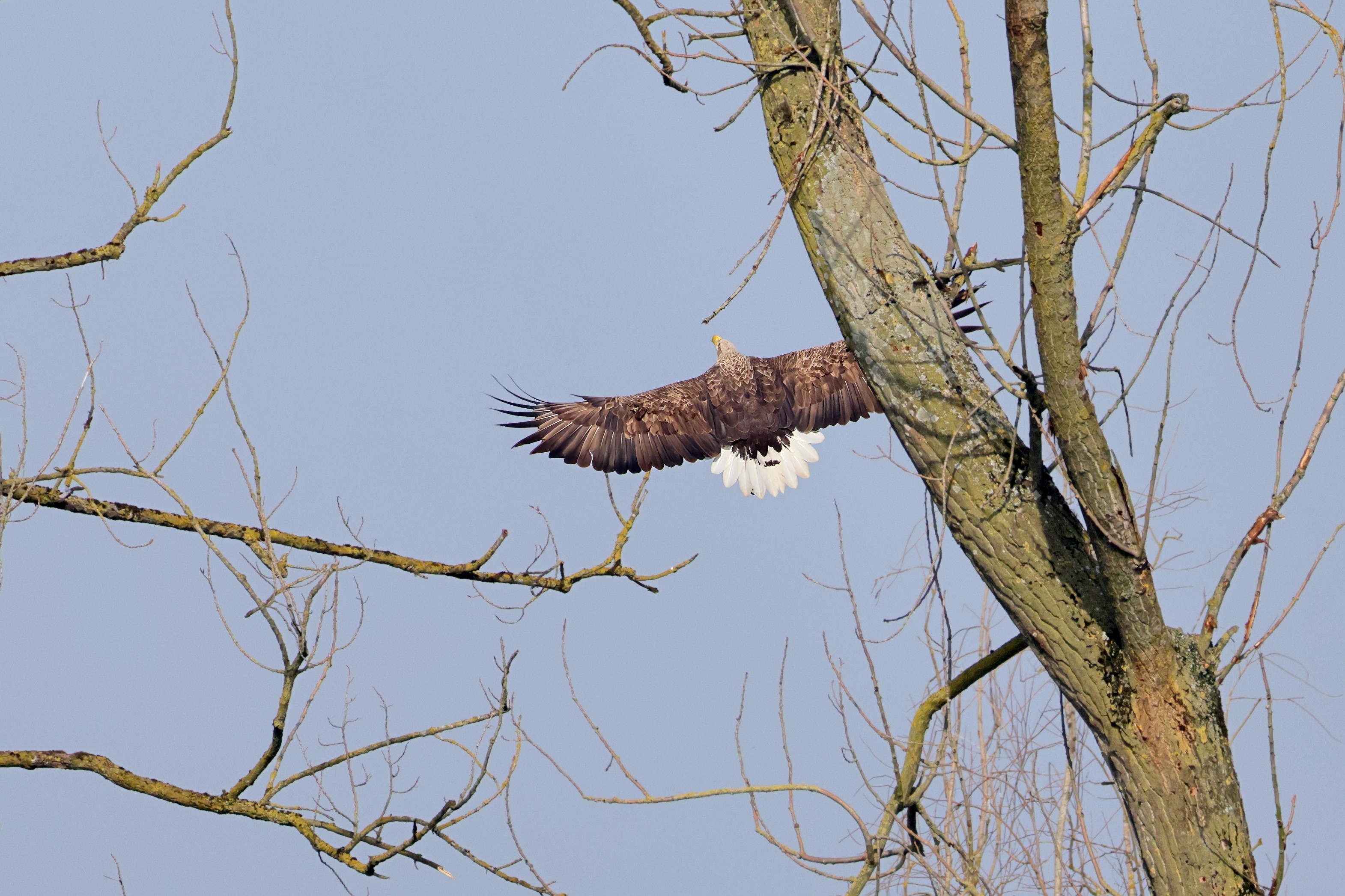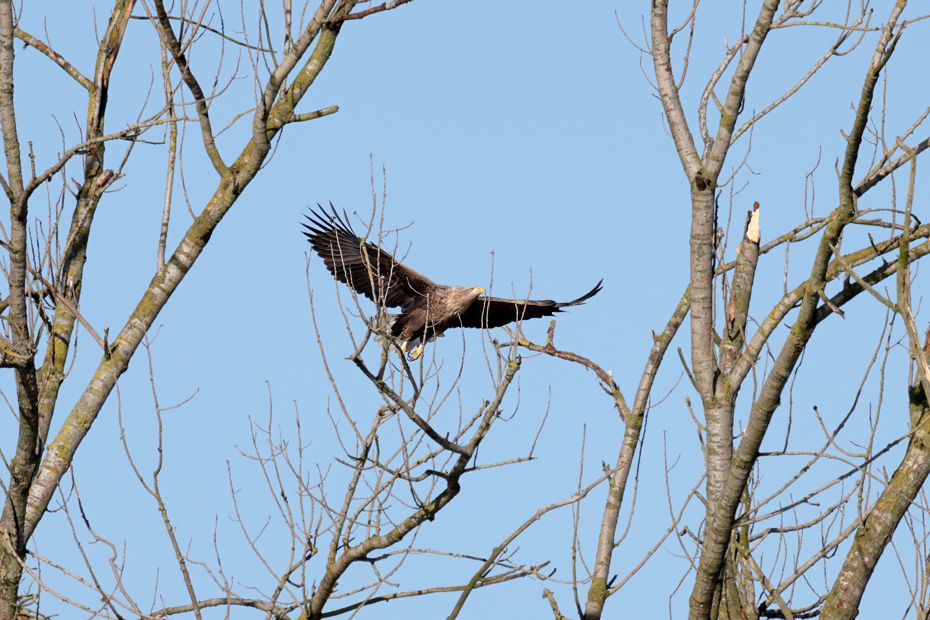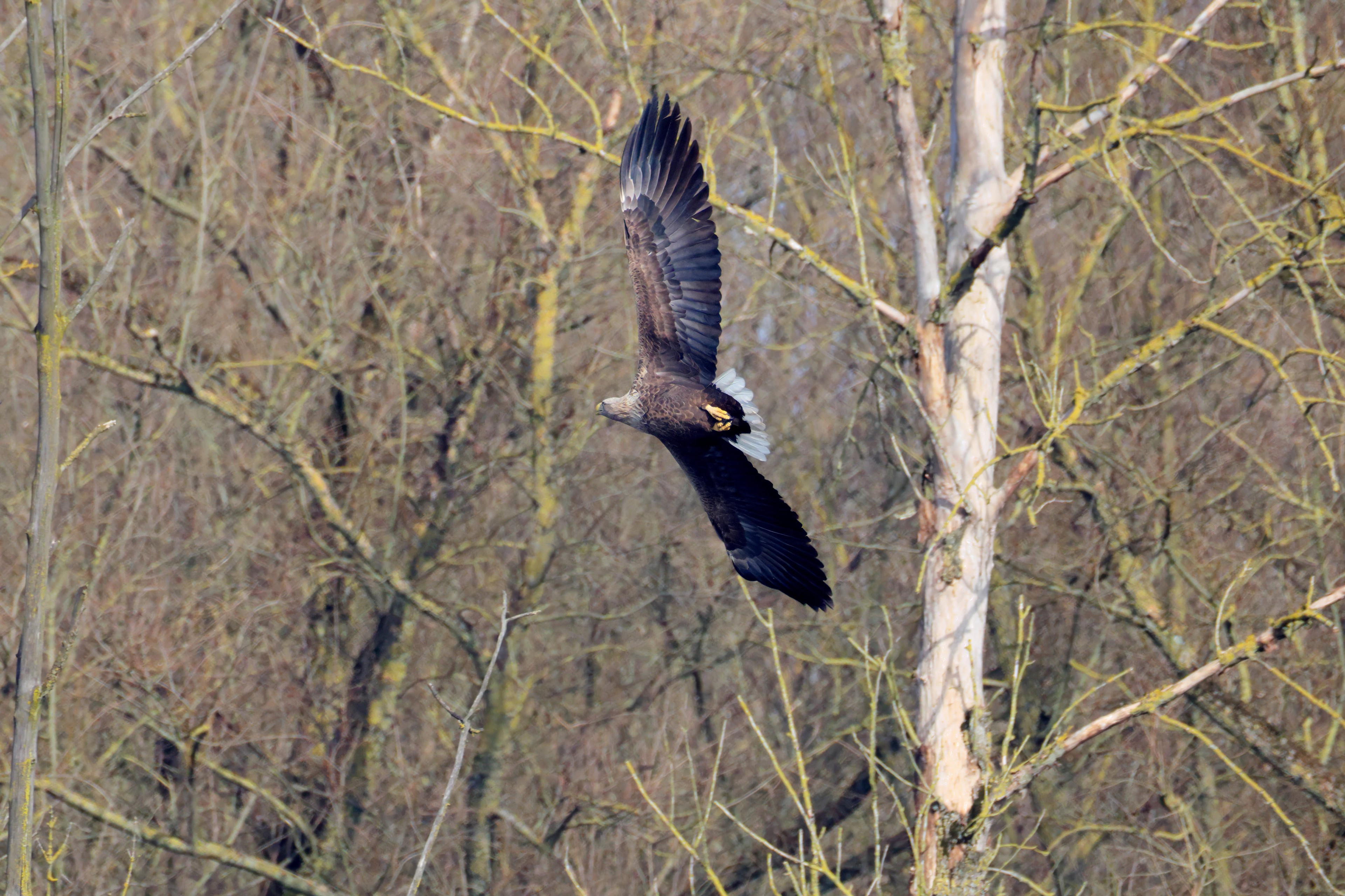Während der etwa 38 bis 42 Tage dauernden Brutzeit der Seeadler kommt es meist nur zu kurzen Ablösungen zwischen den Partnern. Doch wenn gutes Wetter, die Tageszeit und der natürliche Bewegungsdrang nach den langen Brutsitzungen zusammentreffen, lassen sich vom abgelösten Partner manchmal ganz besondere Aufnahmen gestalten.