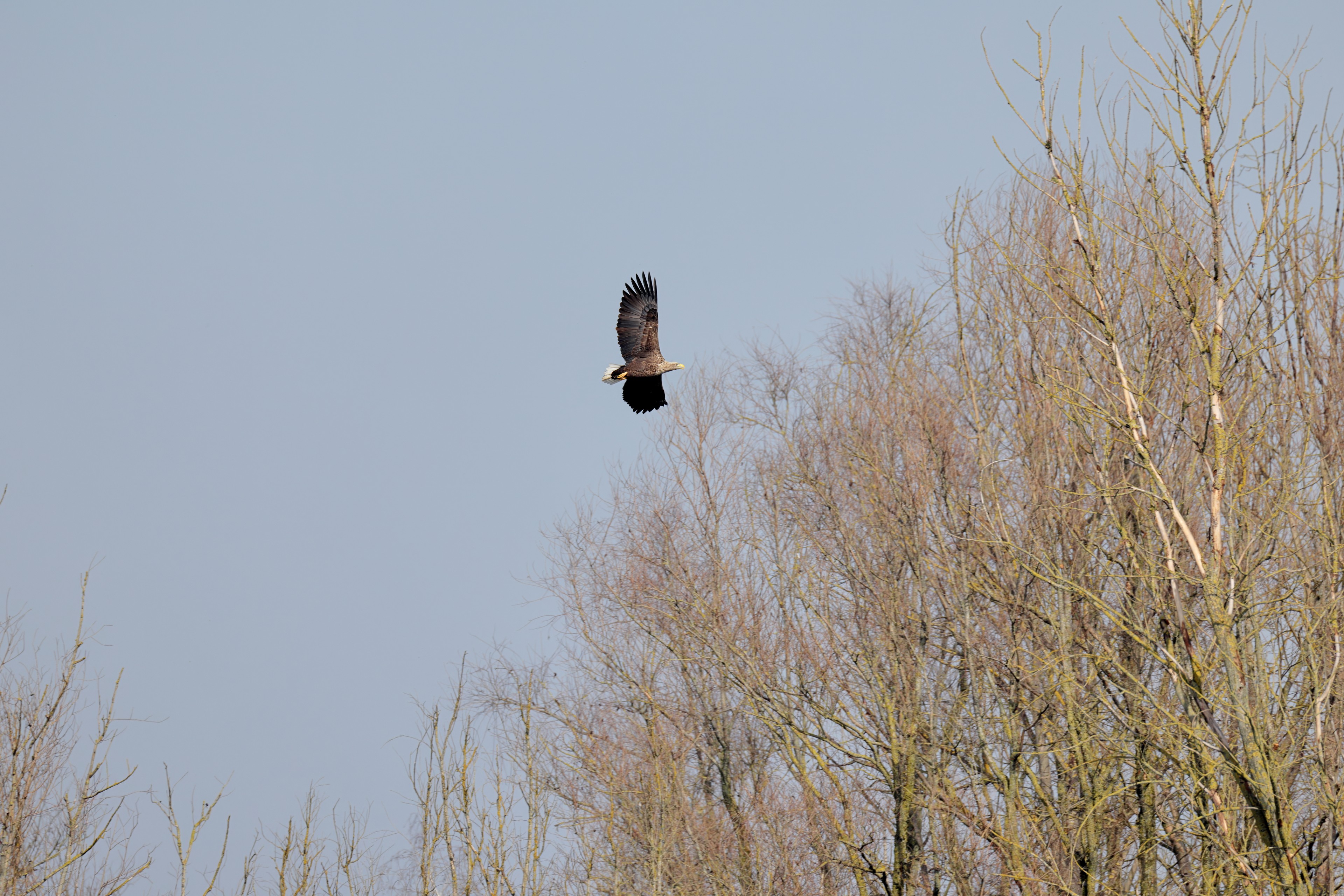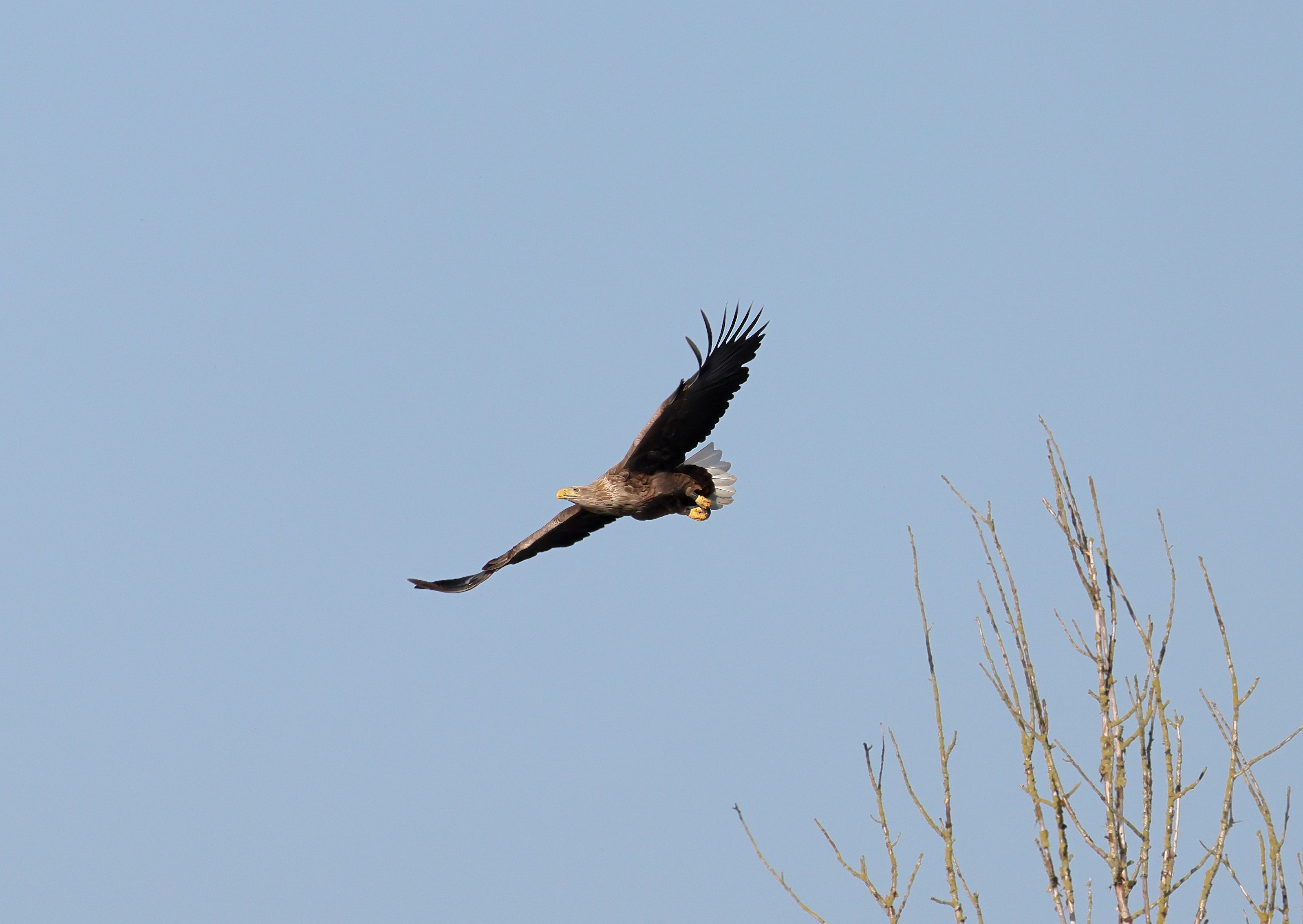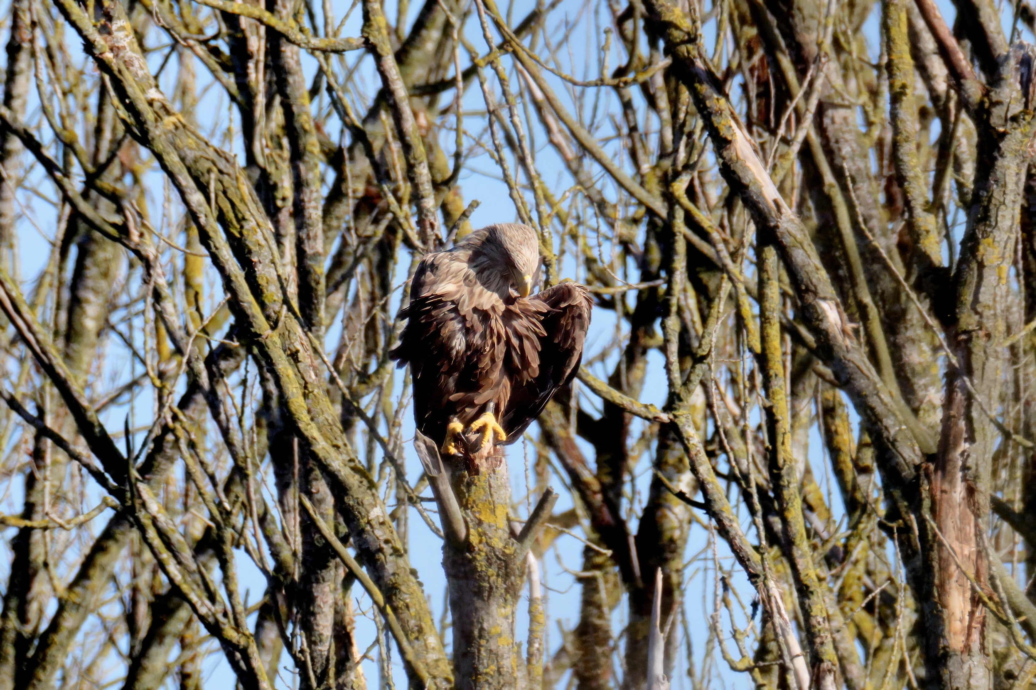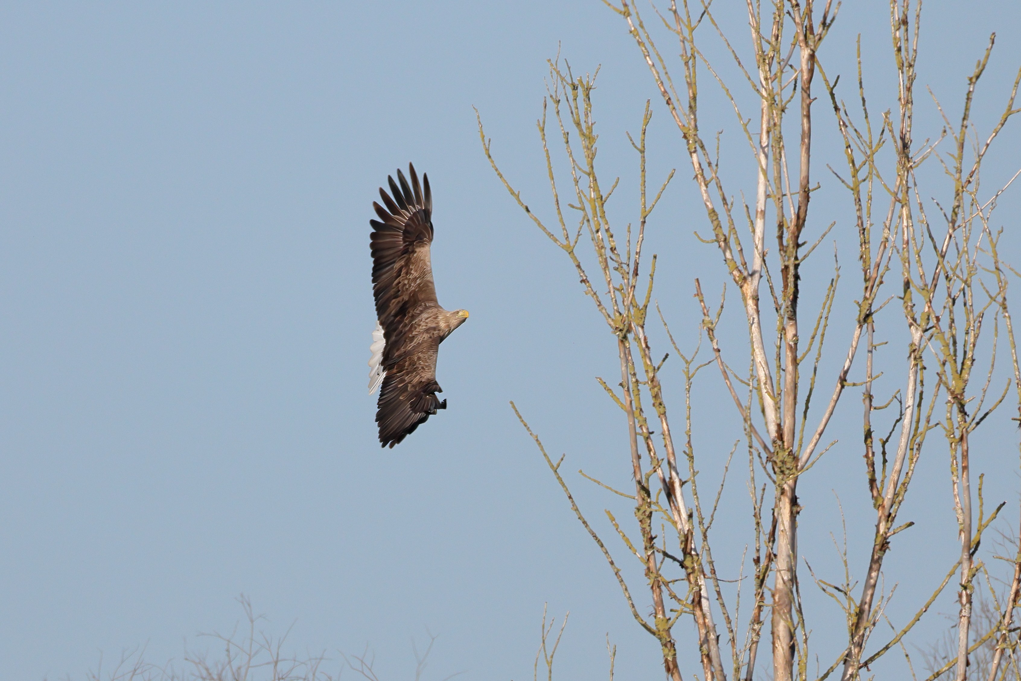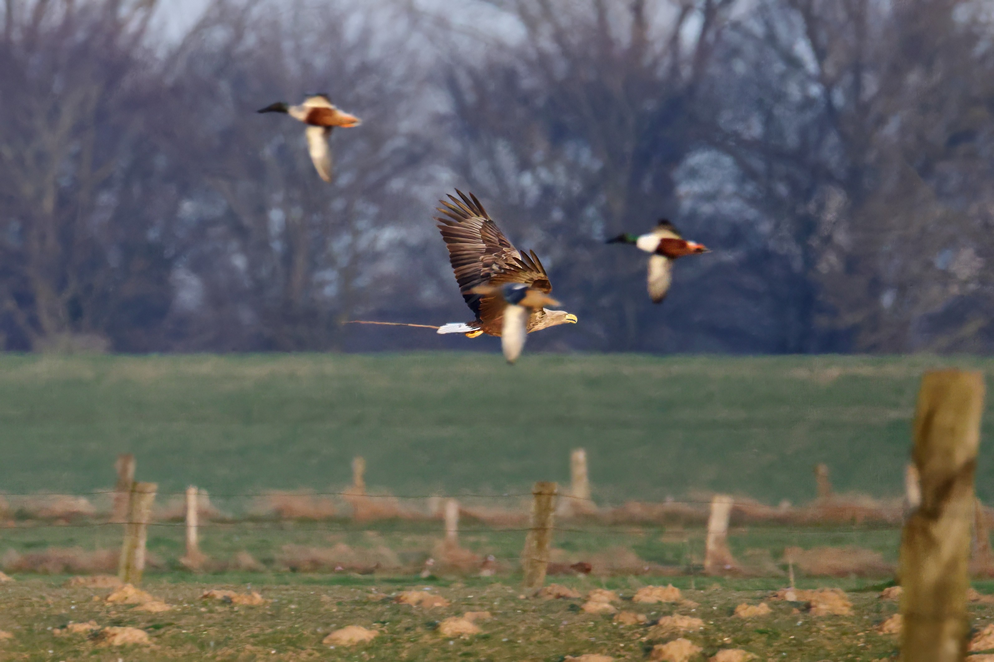 Während der etwa 38 bis 42 Tage dauernden Brutzeit der Seeadler kommt es meist nur zu kurzen Ablösungen zwischen den Partnern. Doch wenn gutes Wetter, die Tageszeit und der natürliche Bewegungsdrang nach den langen Brutsitzungen zusammentreffen, lassen sich vom abgelösten Partner manchmal ganz besondere Aufnahmen gestalten.