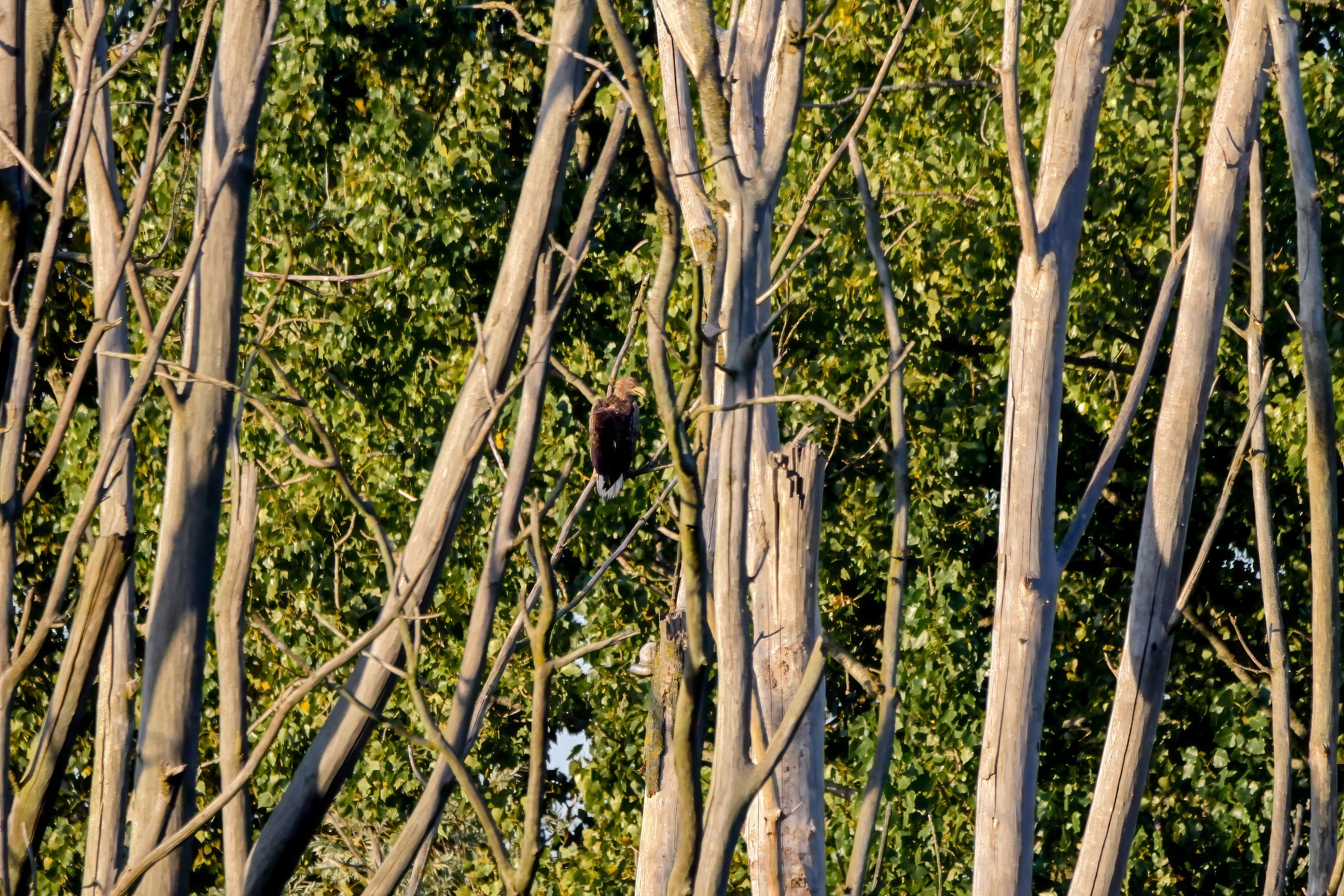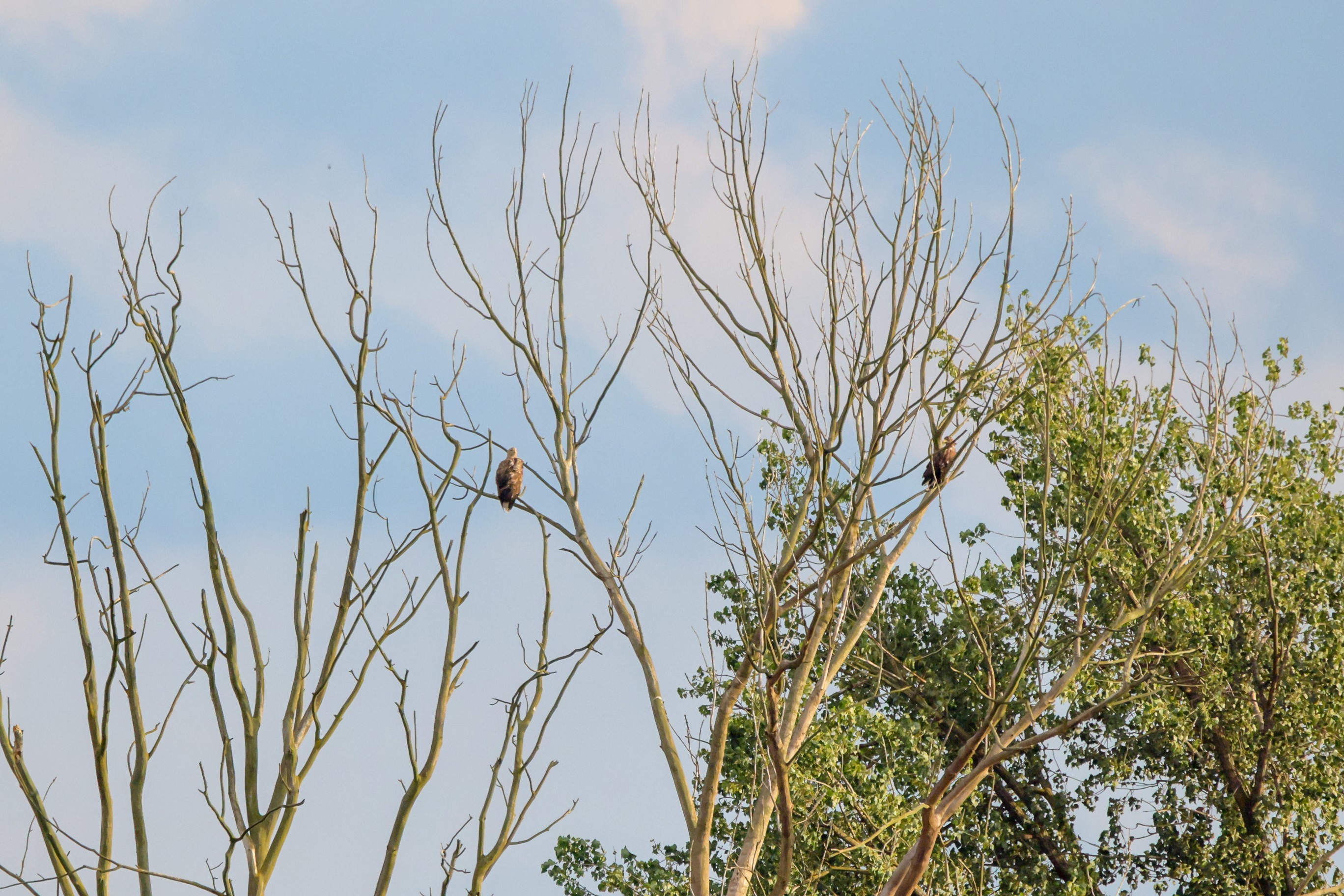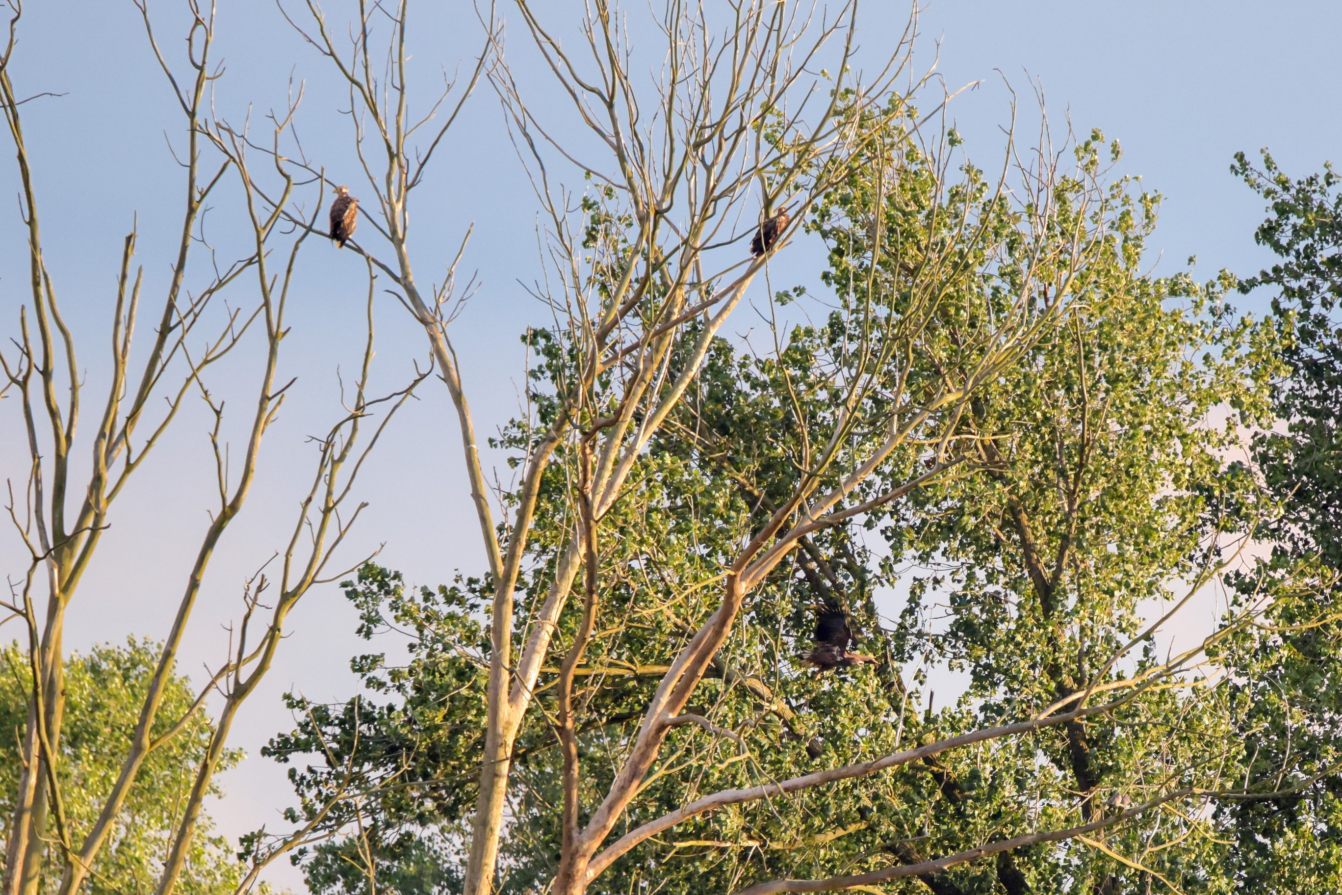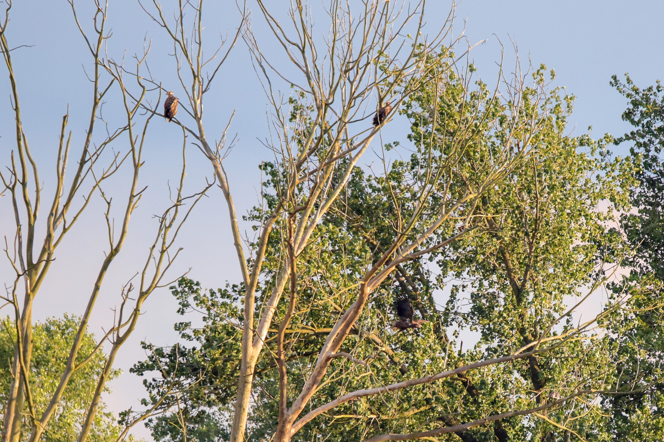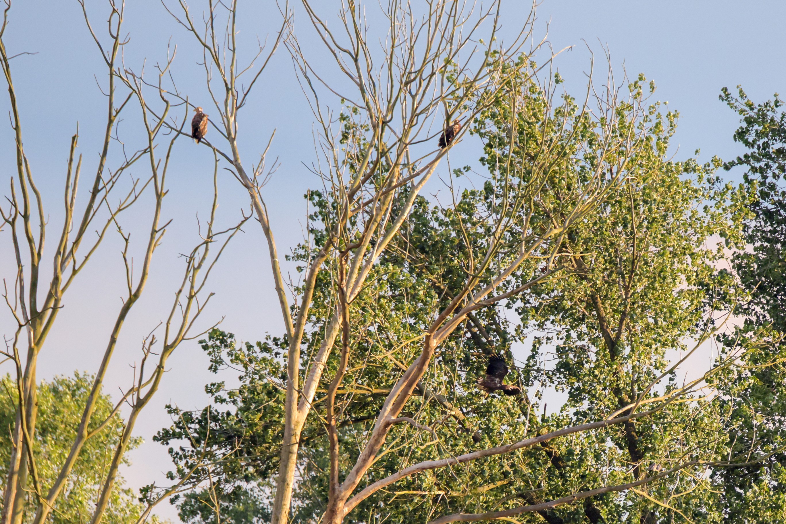 Ende Juni konnte das Seeadlerweibchen mit ihrem Nachwuchs gemeinsam von der Beobachtungshütte III, zur linken Seite in dem bevorzugten Baum am Gewässerrand, beobachtet werden. Zu dieser Zeit zeigte sich schon ein neuer männlicher Seeadler, der beidseitig beringt und mit einer rötlichen Besenderung ausgestattet und wohl dem dritten Kalenderjahres zuzuordnen ist. Anfänglich wurde er vom Seeadlerweibchen permanent verjagt. Er ließ sich über Wochen nicht davon beeindrucken und blieb im Habitat. Seit Mitte August konnte das Seeadlerweib und der neue Verehrer sehr häufig im gleichen Baum auf einer Warte sitzend und bei gemeinsamen Flügen beobachtet werden. Das neue Seeadlermännchen stammt nach mir bekannten Informationen aus dem Bereich Oostvaardersplassen Nationalpark Nieuw Land in den Niederlanden. Ab dem vierten bis fünften Lebensjahr setzt die Geschlechtsreife bei den Seeadlern ein und lässt somit auf eine Paarbildung zwischen den beiden hoffen, welches die Fortführung des Habitats auf der Bislicher Insel mit weiteren Reproduktionen der Seeadler gewährleisten könnte.