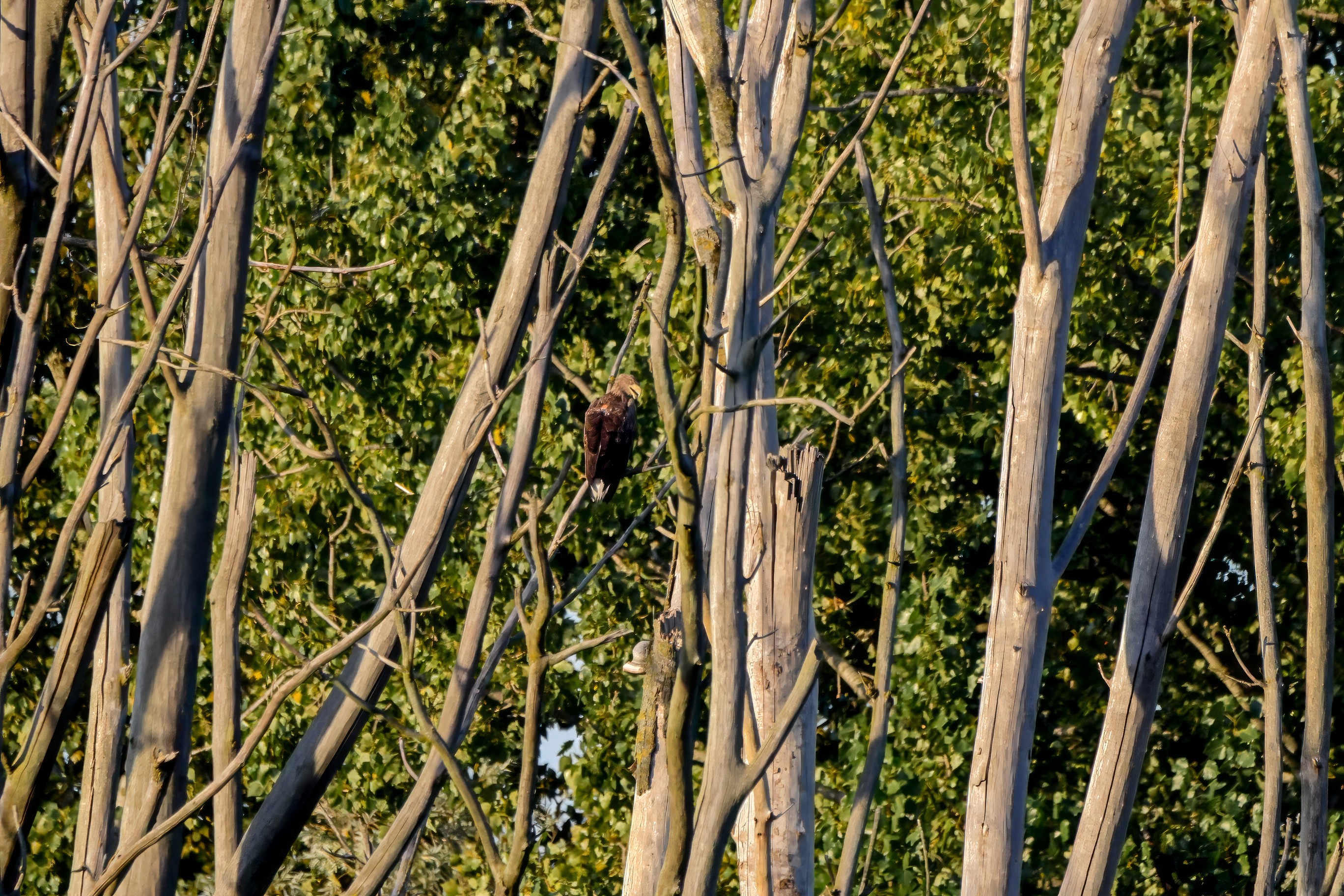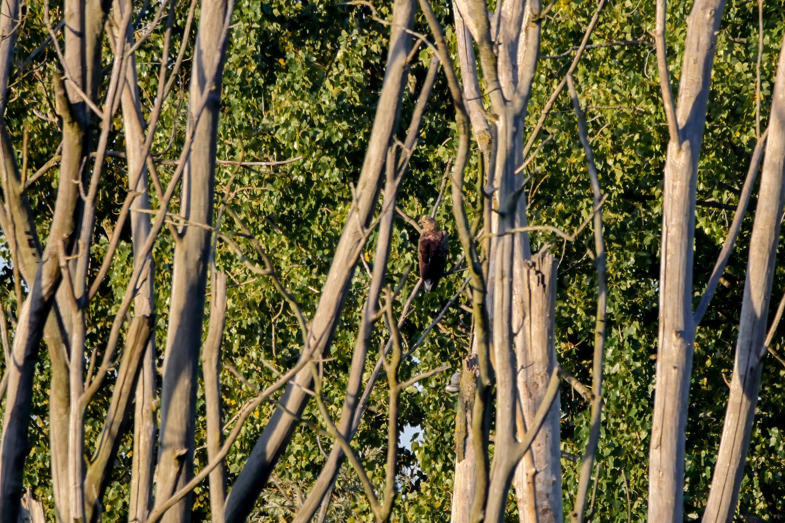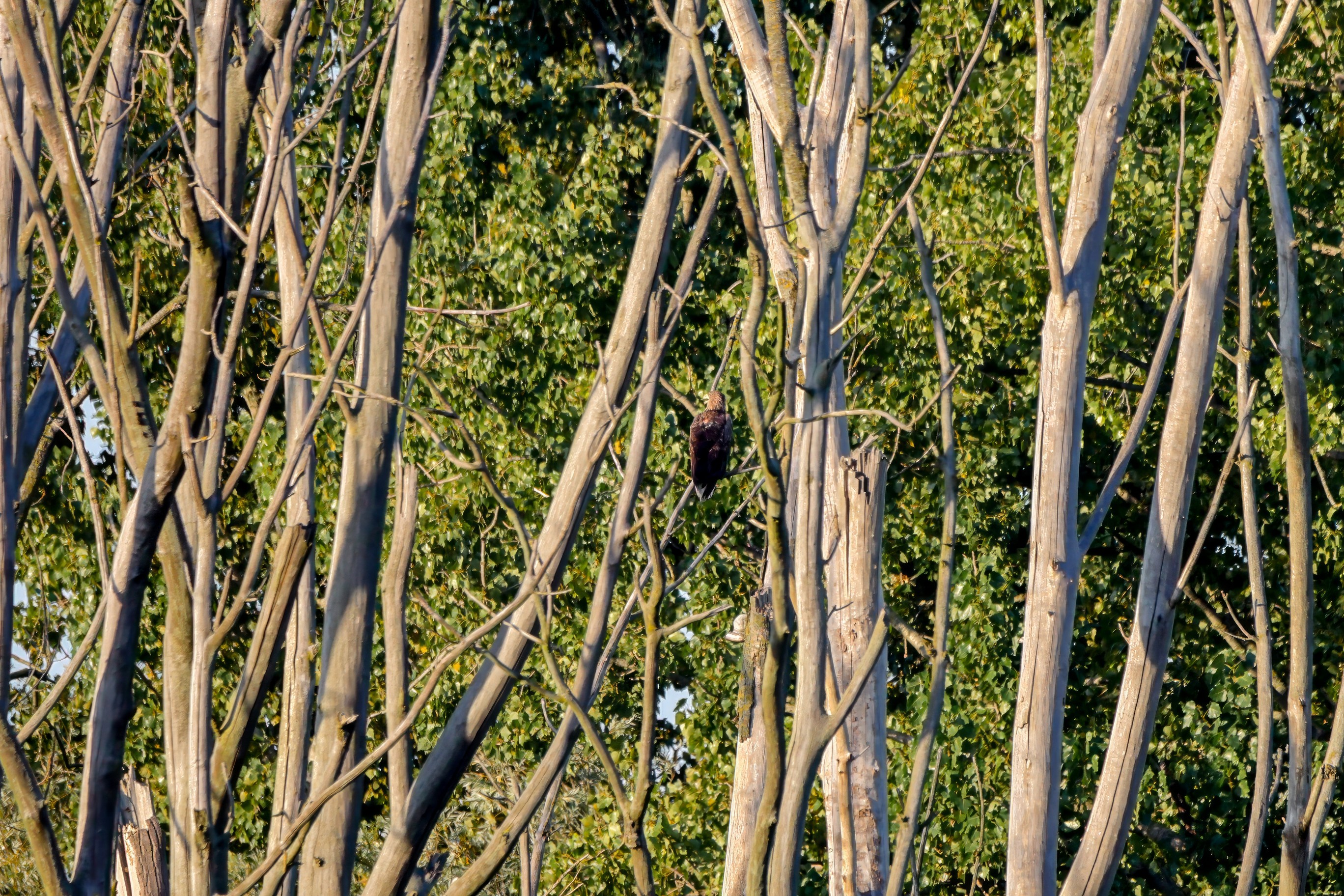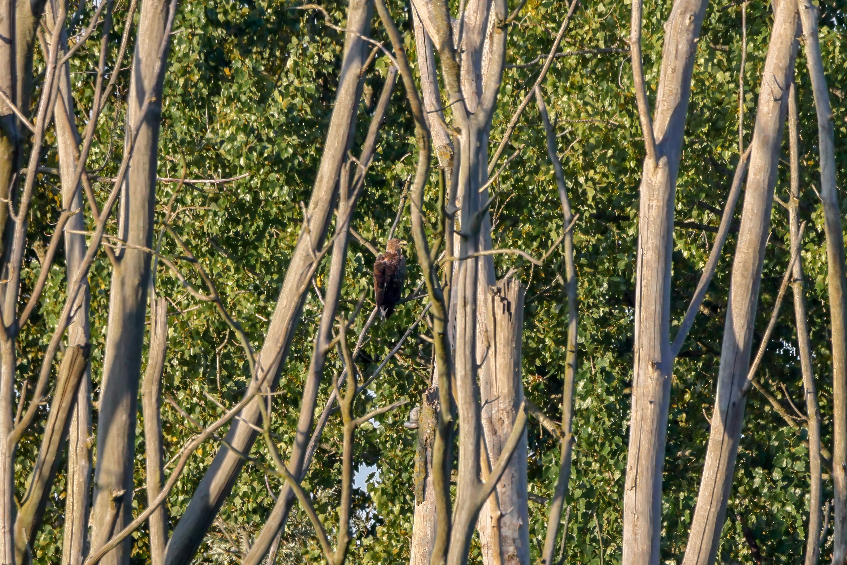 Ende Juni konnte das Seeadlerweibchen mit ihrem Nachwuchs gemeinsam von der Beobachtungshütte III, zur linken Seite in dem bevorzugten Baum am Gewässerrand, beobachtet werden. Zu dieser Zeit zeigte sich schon ein neuer männlicher Seeadler, der beidseitig beringt und mit einer rötlichen Besenderung ausgestattet und wohl dem dritten Kalenderjahres zuzuordnen ist. Anfänglich wurde er vom Seeadlerweibchen permanent verjagt. Er ließ sich über Wochen nicht davon beeindrucken und blieb im Habitat. Seit Mitte August konnte das Seeadlerweib und der neue Verehrer sehr häufig im gleichen Baum auf einer Warte sitzend und bei gemeinsamen Flügen beobachtet werden. Das neue Seeadlermännchen stammt nach mir bekannten Informationen aus dem Bereich Oostvaardersplassen Nationalpark Nieuw Land in den Niederlanden. Ab dem vierten bis fünften Lebensjahr setzt die Geschlechtsreife bei den Seeadlern ein und lässt somit auf eine Paarbildung zwischen den beiden hoffen, welches die Fortführung des Habitats auf der Bislicher Insel mit weiteren Reproduktionen der Seeadler gewährleisten könnte.