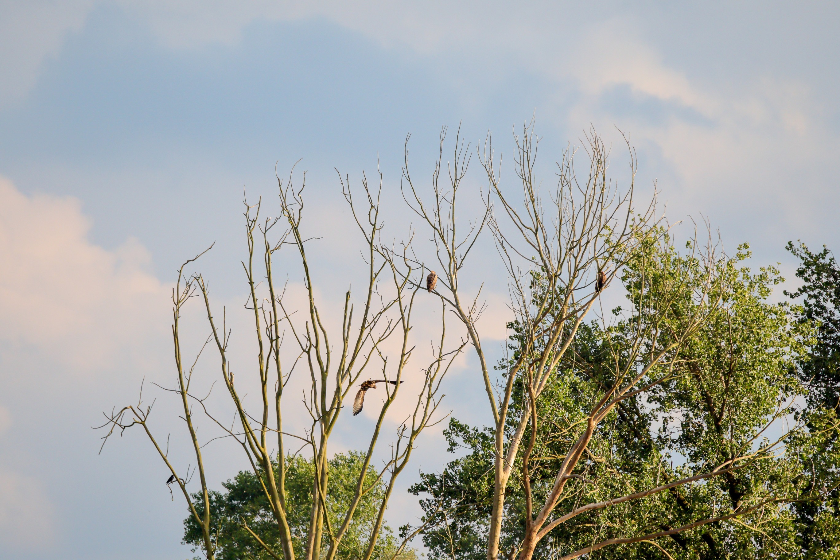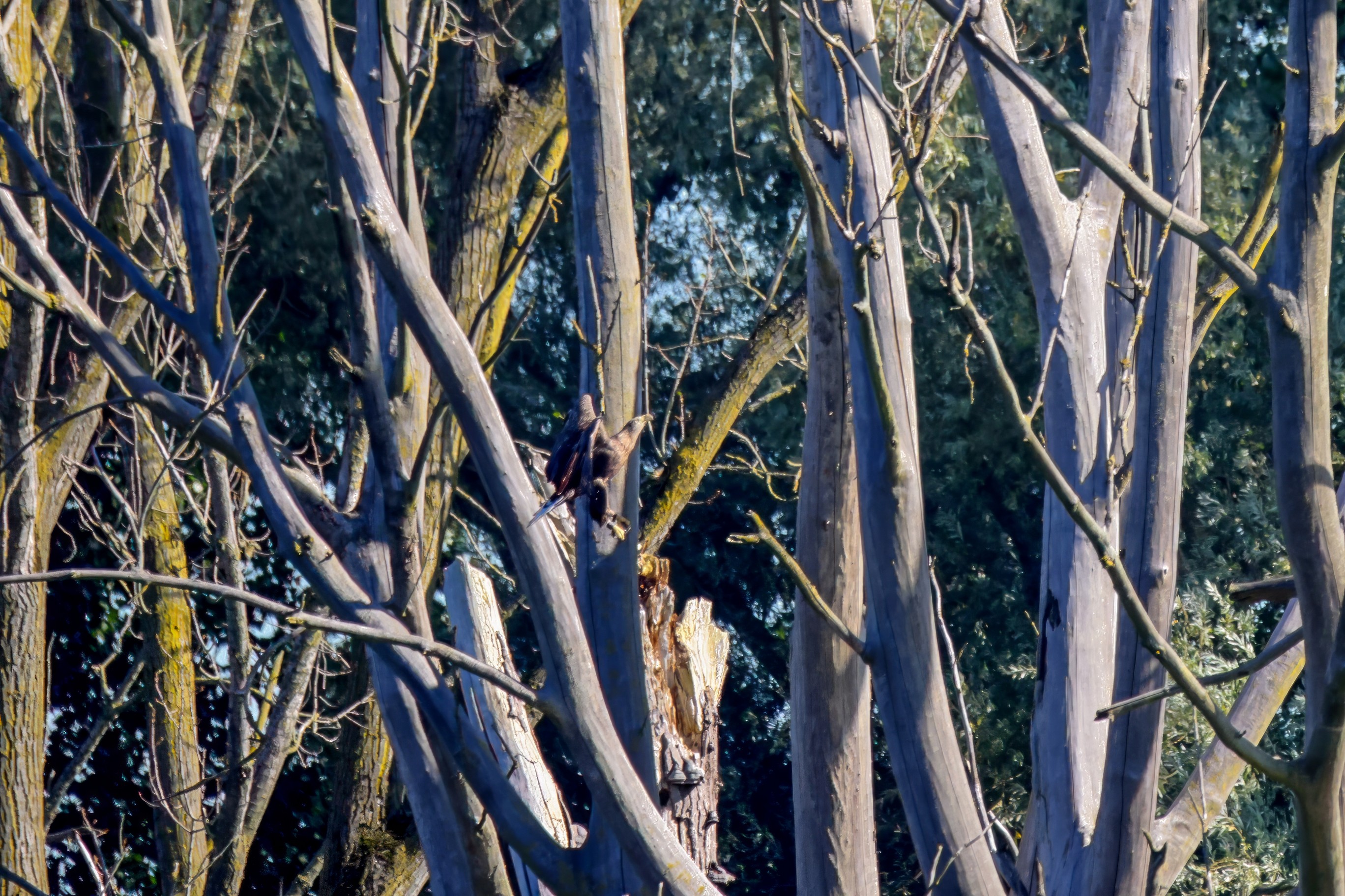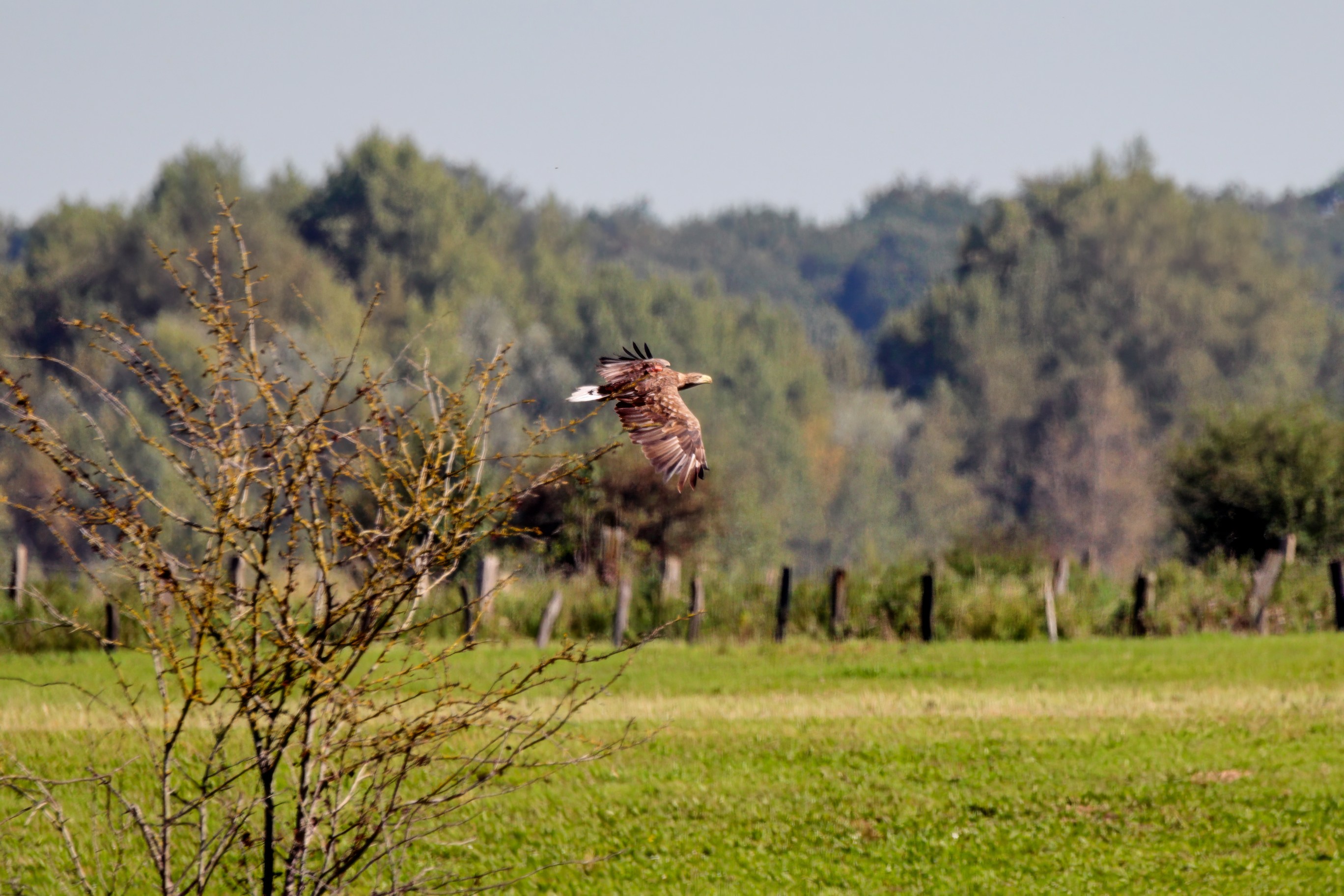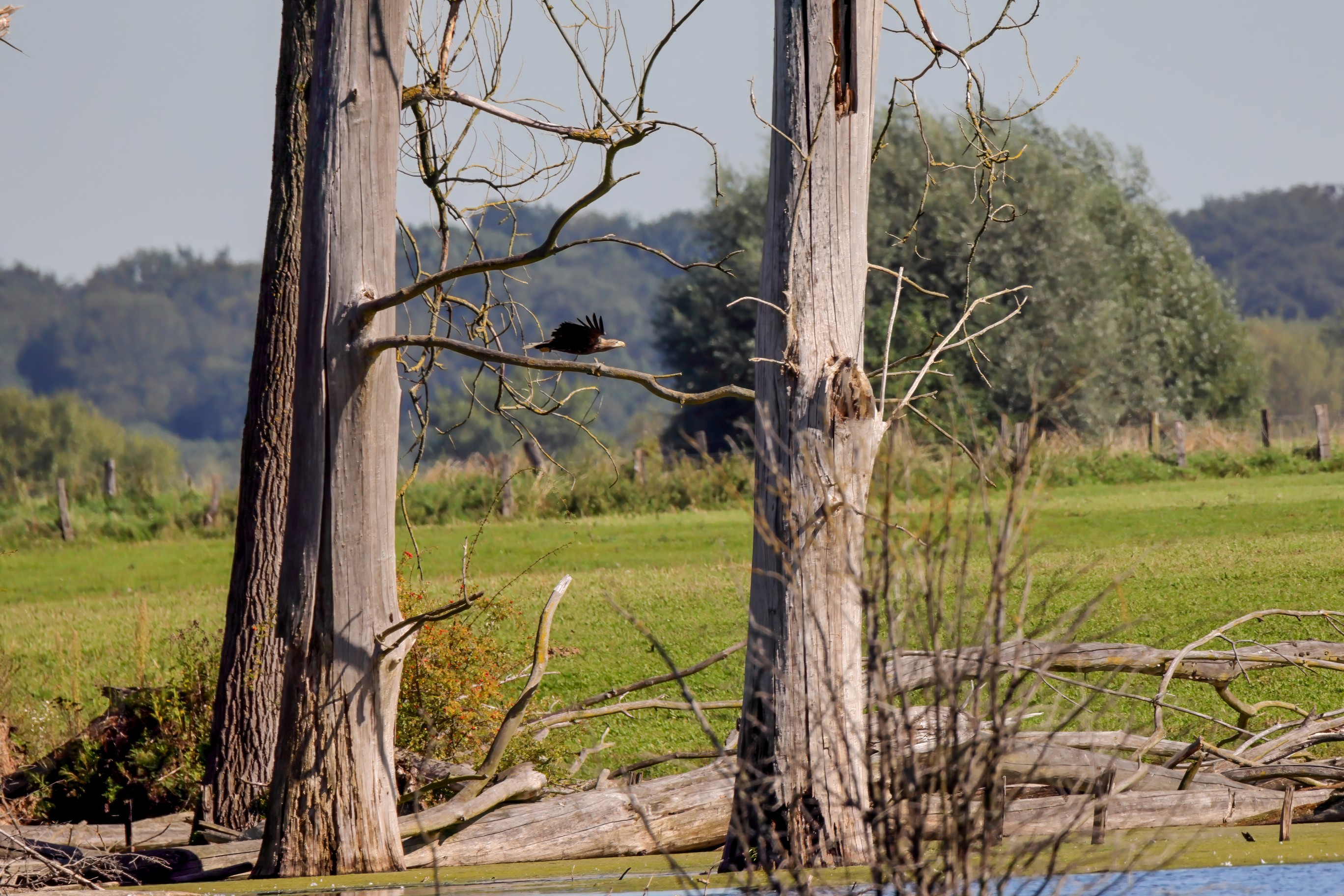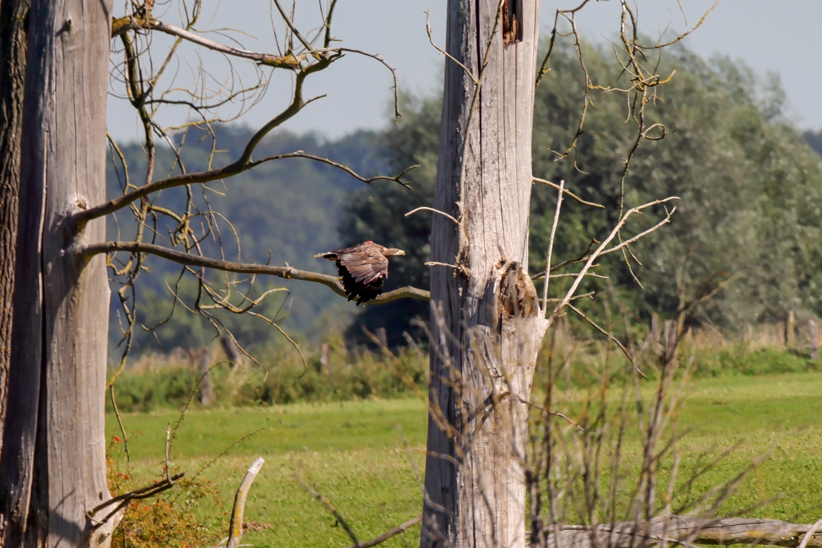 Ende Juni konnte das Seeadlerweibchen mit ihrem Nachwuchs gemeinsam von der Beobachtungshütte III, zur linken Seite in dem bevorzugten Baum am Gewässerrand, beobachtet werden. Zu dieser Zeit zeigte sich schon ein neuer männlicher Seeadler, der beidseitig beringt und mit einer rötlichen Besenderung ausgestattet und wohl dem dritten Kalenderjahres zuzuordnen ist. Anfänglich wurde er vom Seeadlerweibchen permanent verjagt. Er ließ sich über Wochen nicht davon beeindrucken und blieb im Habitat. Seit Mitte August konnte das Seeadlerweib und der neue Verehrer sehr häufig im gleichen Baum auf einer Warte sitzend und bei gemeinsamen Flügen beobachtet werden. Das neue Seeadlermännchen stammt nach mir bekannten Informationen aus dem Bereich Oostvaardersplassen Nationalpark Nieuw Land in den Niederlanden. Ab dem vierten bis fünften Lebensjahr setzt die Geschlechtsreife bei den Seeadlern ein und lässt somit auf eine Paarbildung zwischen den beiden hoffen, welches die Fortführung des Habitats auf der Bislicher Insel mit weiteren Reproduktionen der Seeadler gewährleisten könnte.