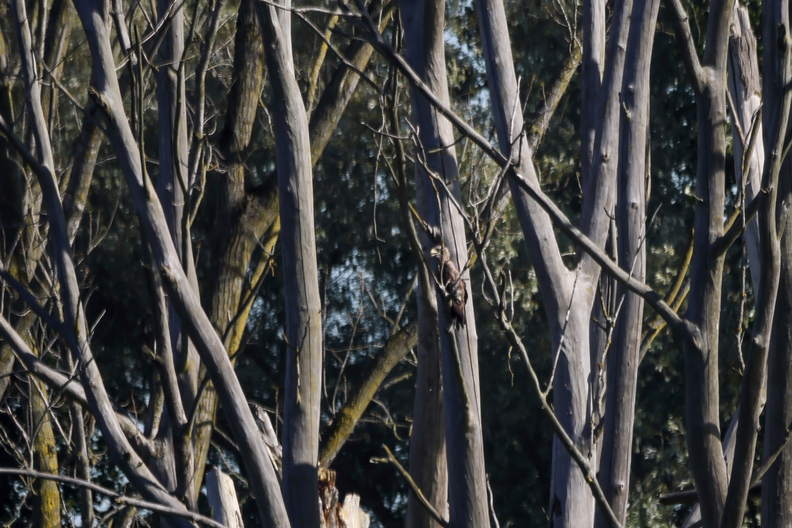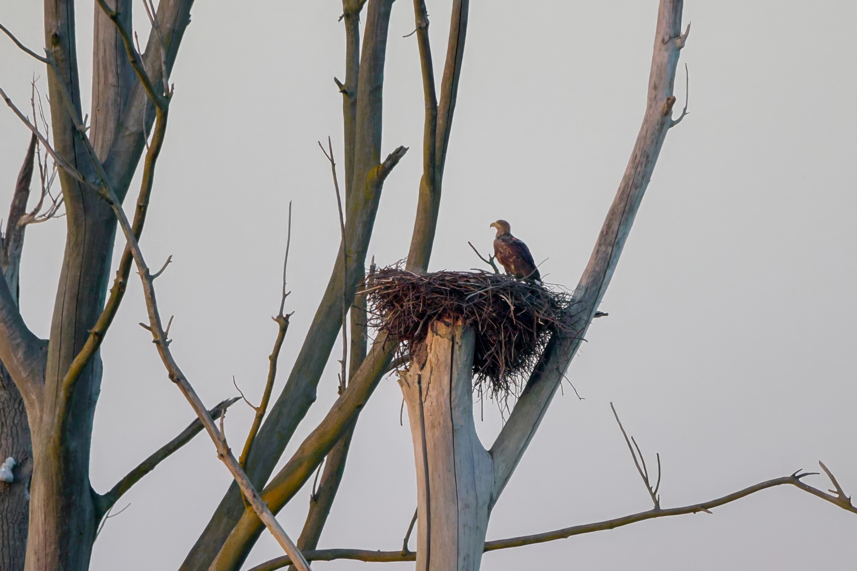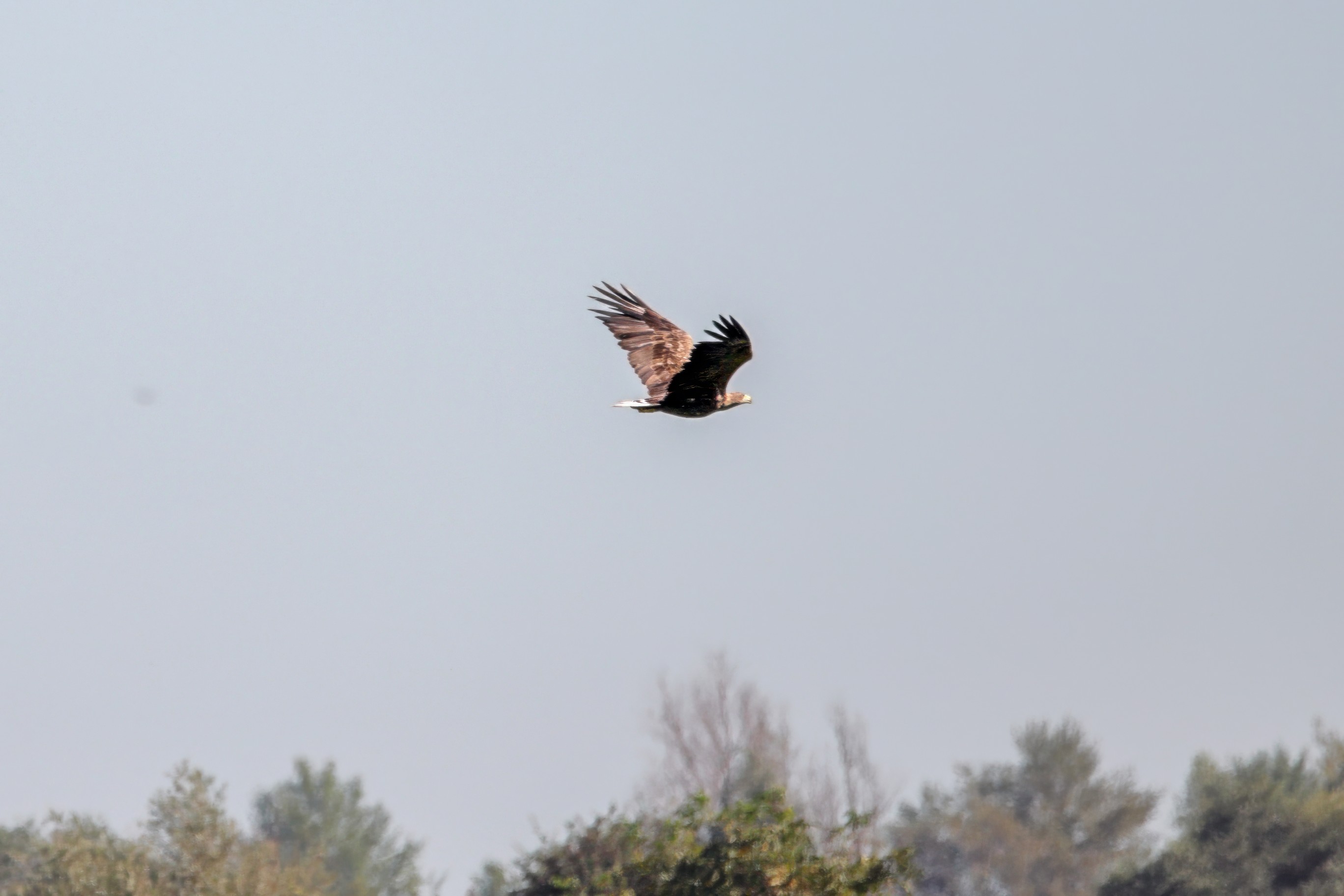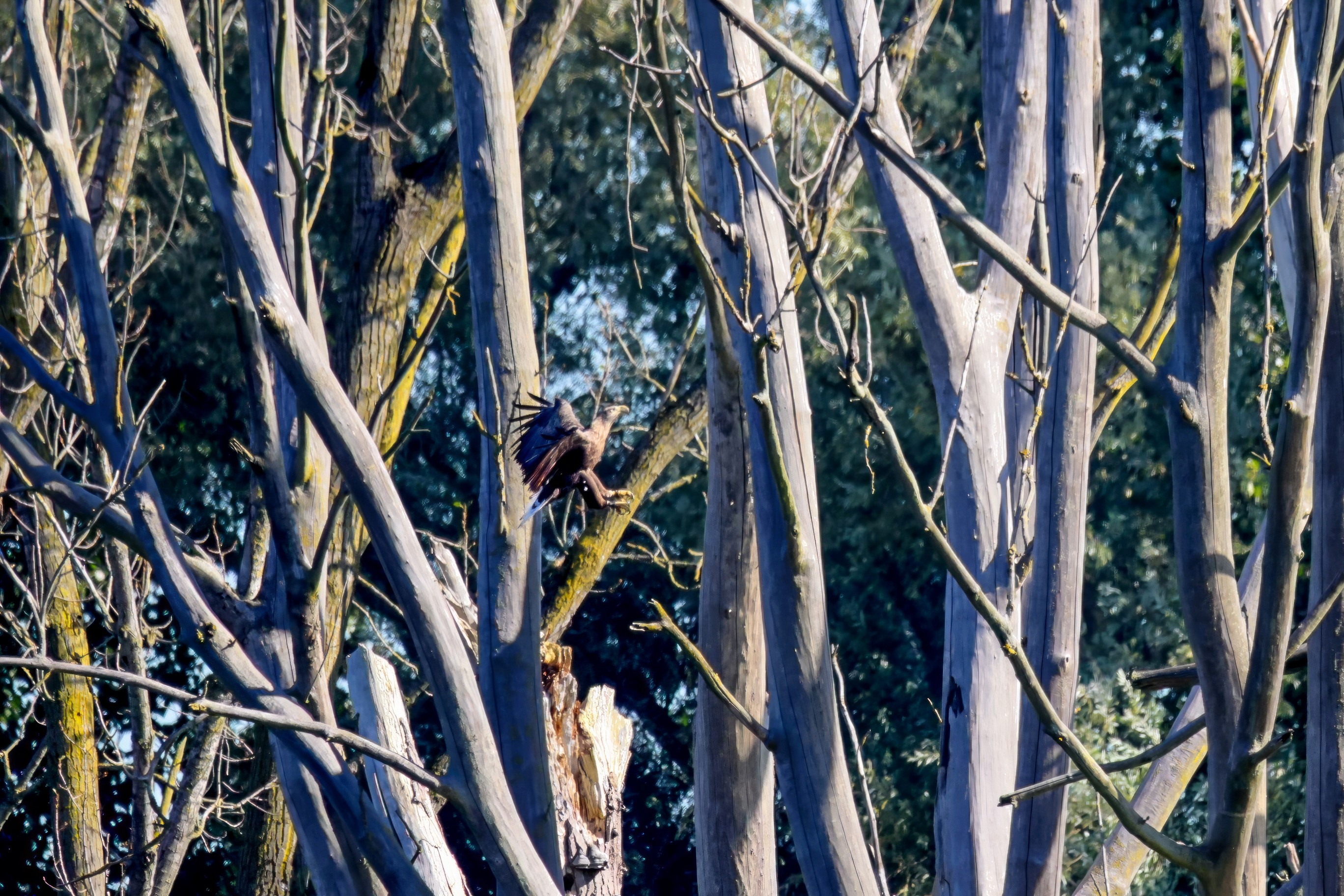 Ende Juni konnte das Seeadlerweibchen mit ihrem Nachwuchs gemeinsam von der Beobachtungshütte III, zur linken Seite in dem bevorzugten Baum am Gewässerrand, beobachtet werden. Zu dieser Zeit zeigte sich schon ein neuer männlicher Seeadler, der beidseitig beringt und mit einer rötlichen Besenderung ausgestattet und wohl dem dritten Kalenderjahres zuzuordnen ist. Anfänglich wurde er vom Seeadlerweibchen permanent verjagt. Er ließ sich über Wochen nicht davon beeindrucken und blieb im Habitat. Seit Mitte August konnte das Seeadlerweib und der neue Verehrer sehr häufig im gleichen Baum auf einer Warte sitzend und bei gemeinsamen Flügen beobachtet werden. Das neue Seeadlermännchen stammt nach mir bekannten Informationen aus dem Bereich Oostvaardersplassen Nationalpark Nieuw Land in den Niederlanden. Ab dem vierten bis fünften Lebensjahr setzt die Geschlechtsreife bei den Seeadlern ein und lässt somit auf eine Paarbildung zwischen den beiden hoffen, welches die Fortführung des Habitats auf der Bislicher Insel mit weiteren Reproduktionen der Seeadler gewährleisten könnte.