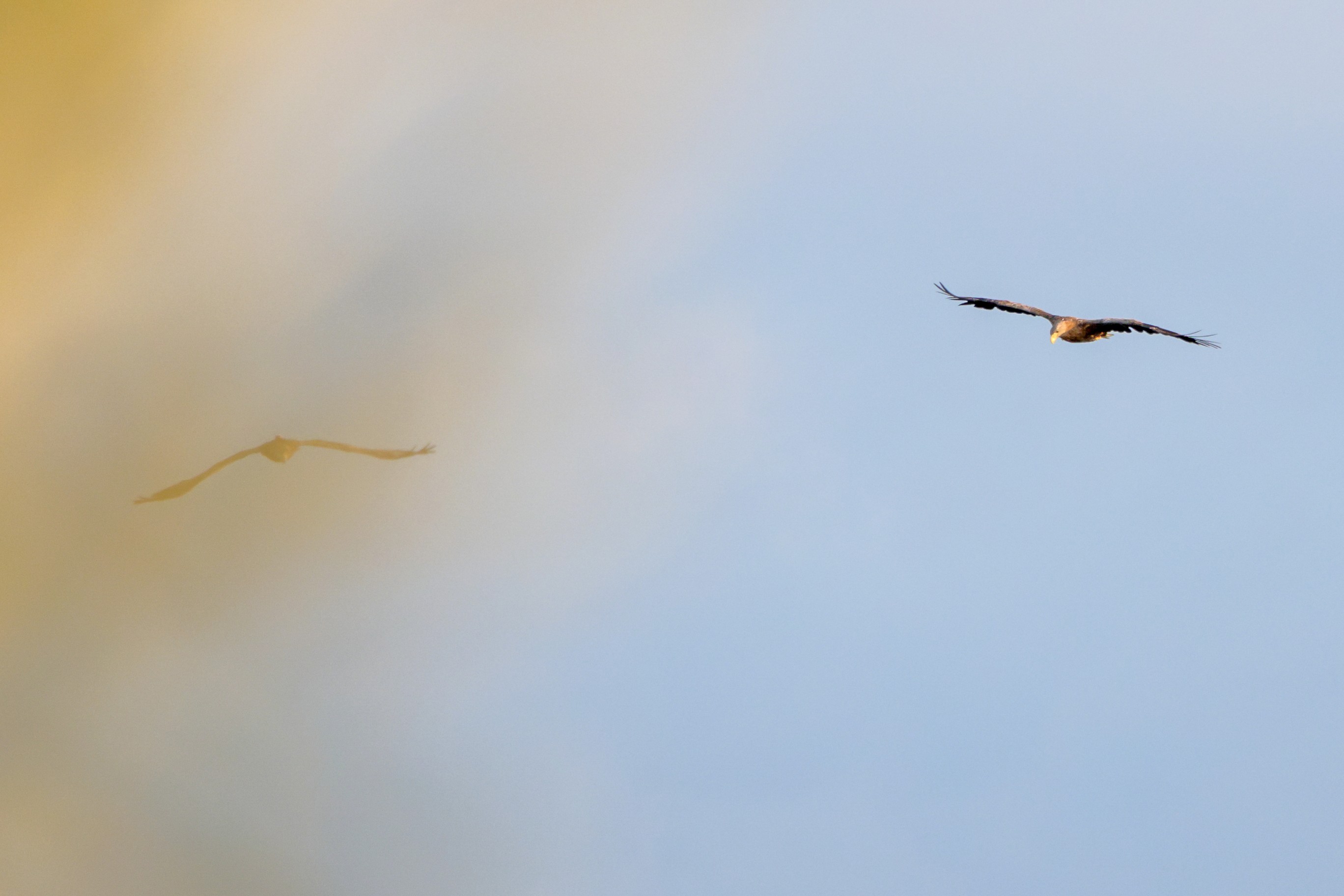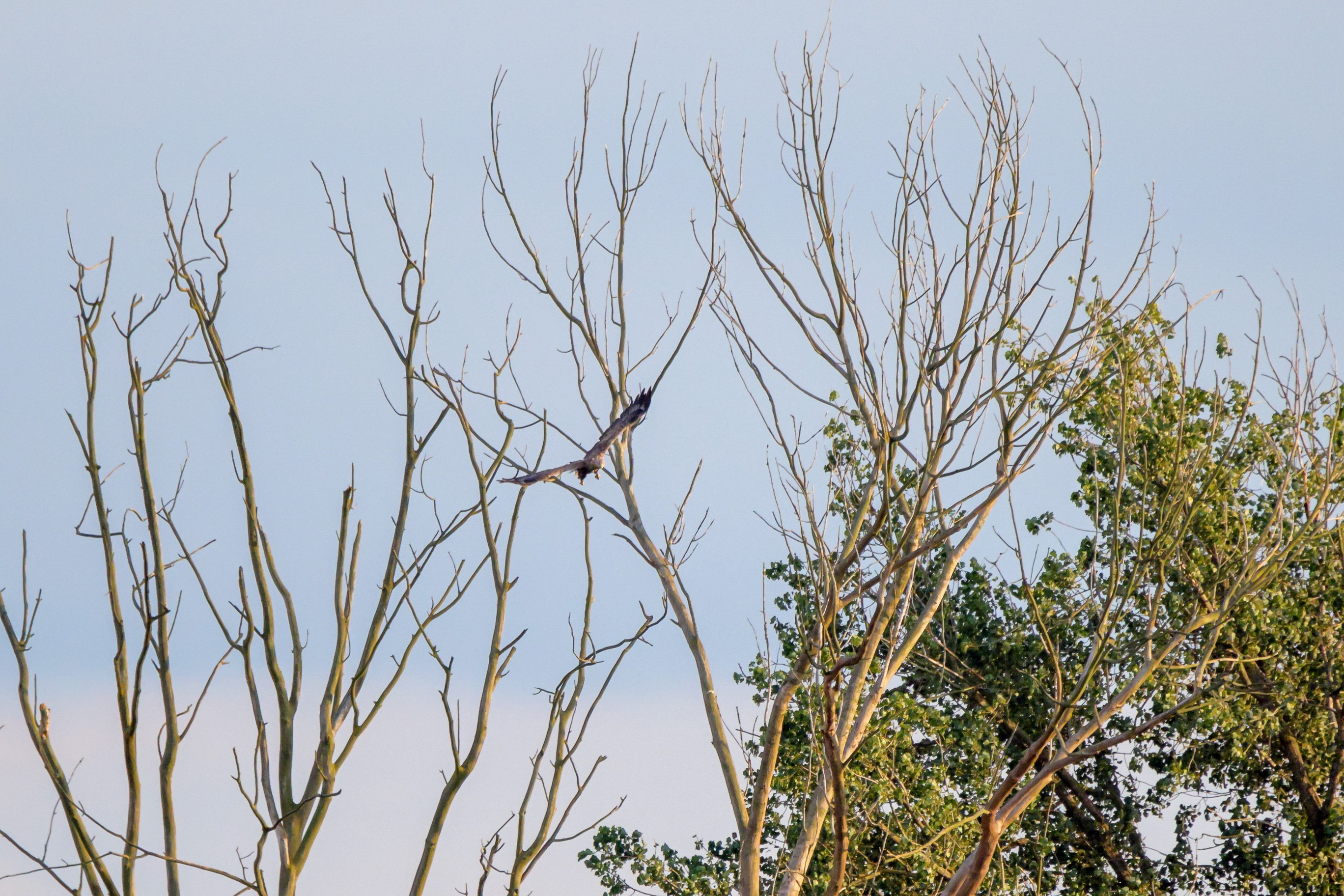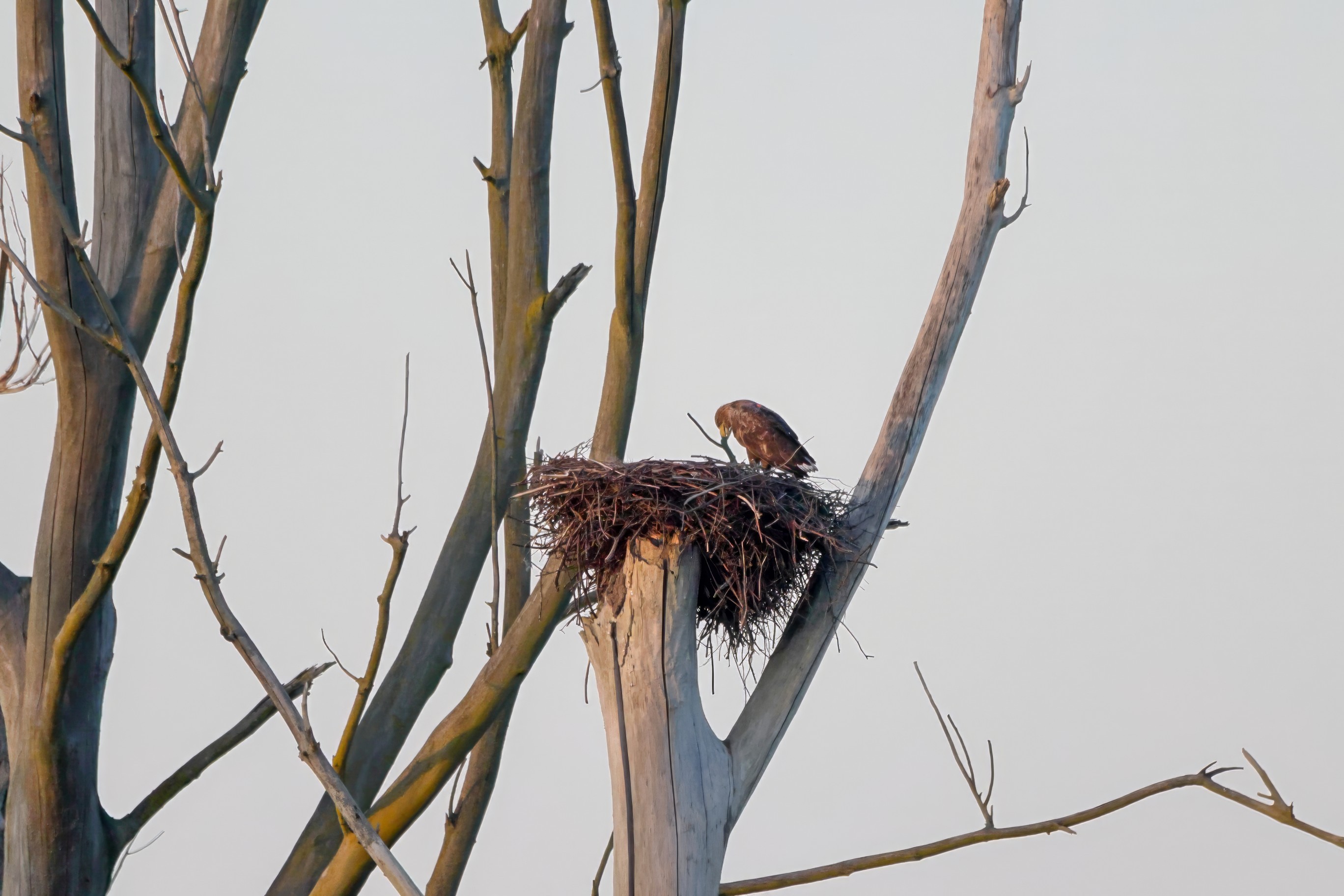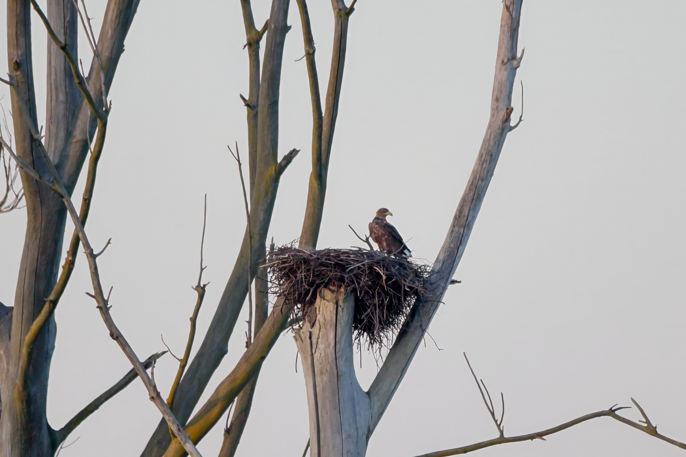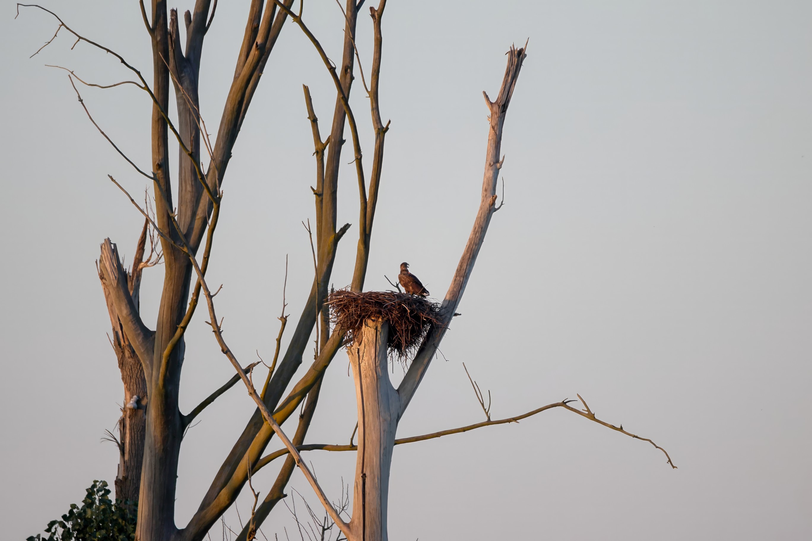 Ende Juni konnte das Seeadlerweibchen mit ihrem Nachwuchs gemeinsam von der Beobachtungshütte III, zur linken Seite in dem bevorzugten Baum am Gewässerrand, beobachtet werden. Zu dieser Zeit zeigte sich schon ein neuer männlicher Seeadler, der beidseitig beringt und mit einer rötlichen Besenderung ausgestattet und wohl dem dritten Kalenderjahres zuzuordnen ist. Anfänglich wurde er vom Seeadlerweibchen permanent verjagt. Er ließ sich über Wochen nicht davon beeindrucken und blieb im Habitat. Seit Mitte August konnte das Seeadlerweib und der neue Verehrer sehr häufig im gleichen Baum auf einer Warte sitzend und bei gemeinsamen Flügen beobachtet werden. Das neue Seeadlermännchen stammt nach mir bekannten Informationen aus dem Bereich Oostvaardersplassen Nationalpark Nieuw Land in den Niederlanden. Ab dem vierten bis fünften Lebensjahr setzt die Geschlechtsreife bei den Seeadlern ein und lässt somit auf eine Paarbildung zwischen den beiden hoffen, welches die Fortführung des Habitats auf der Bislicher Insel mit weiteren Reproduktionen der Seeadler gewährleisten könnte.