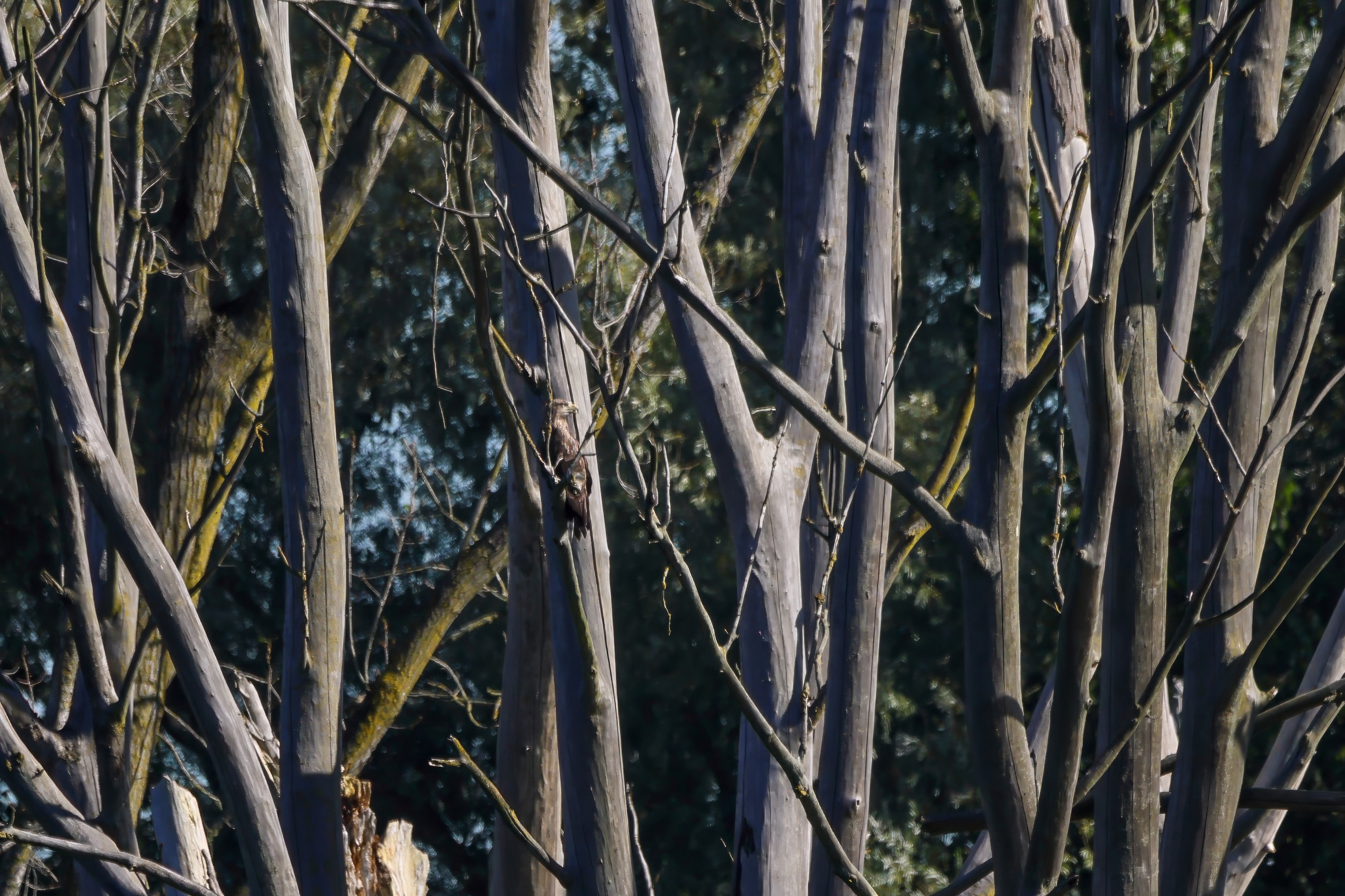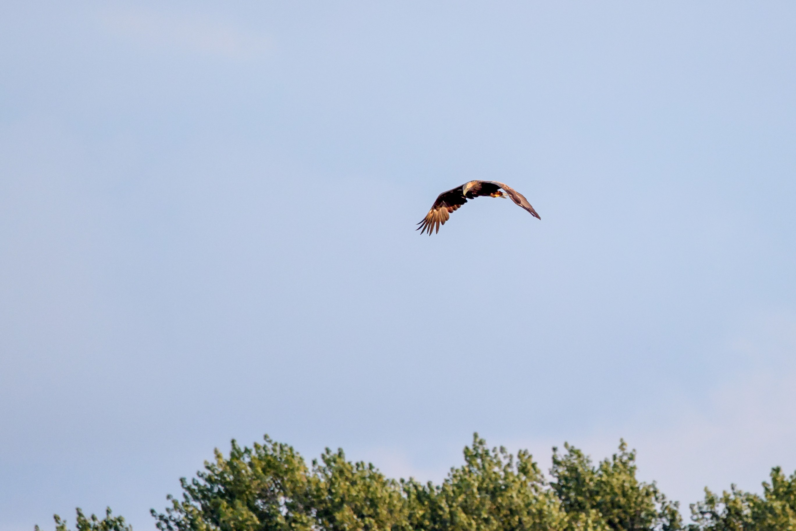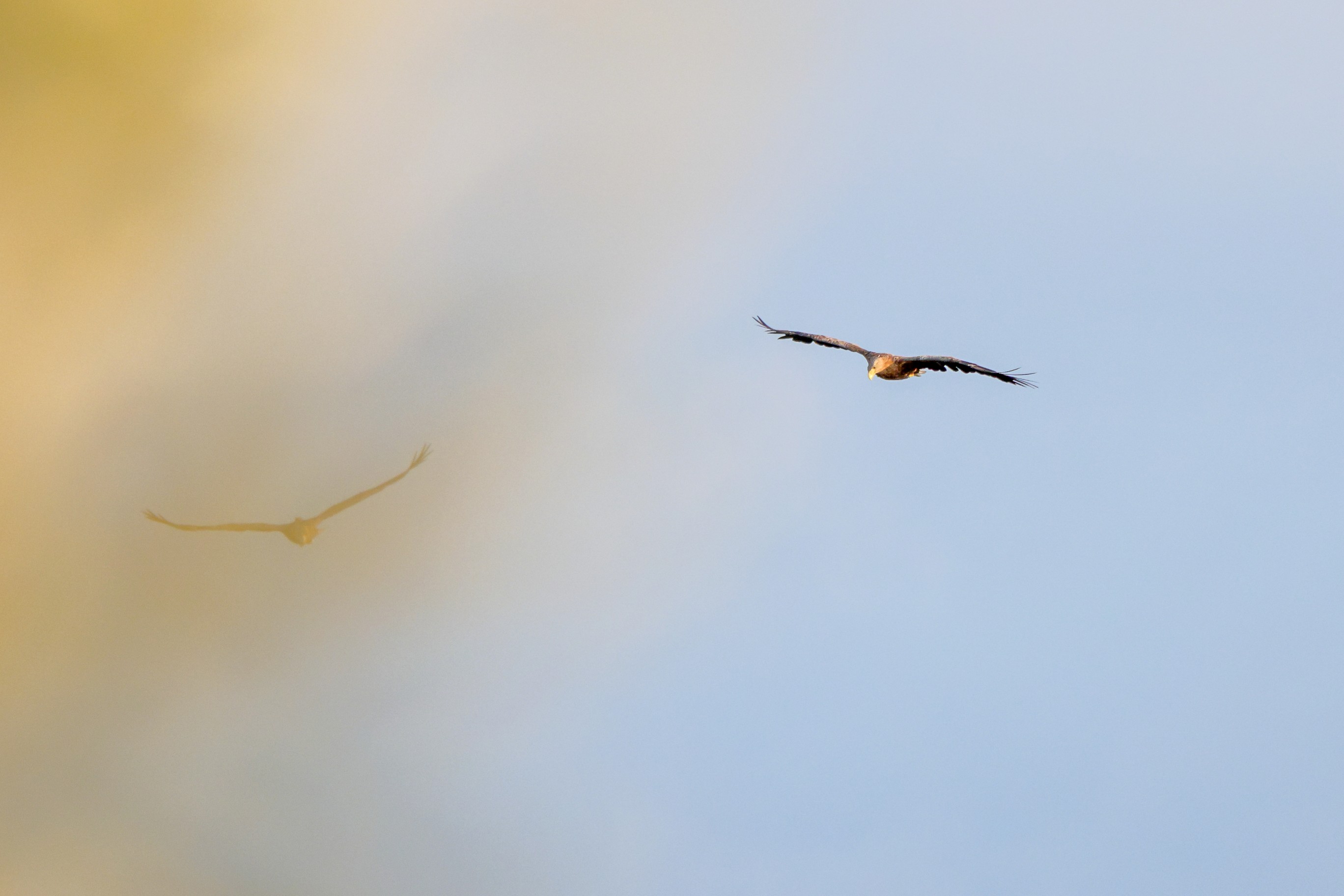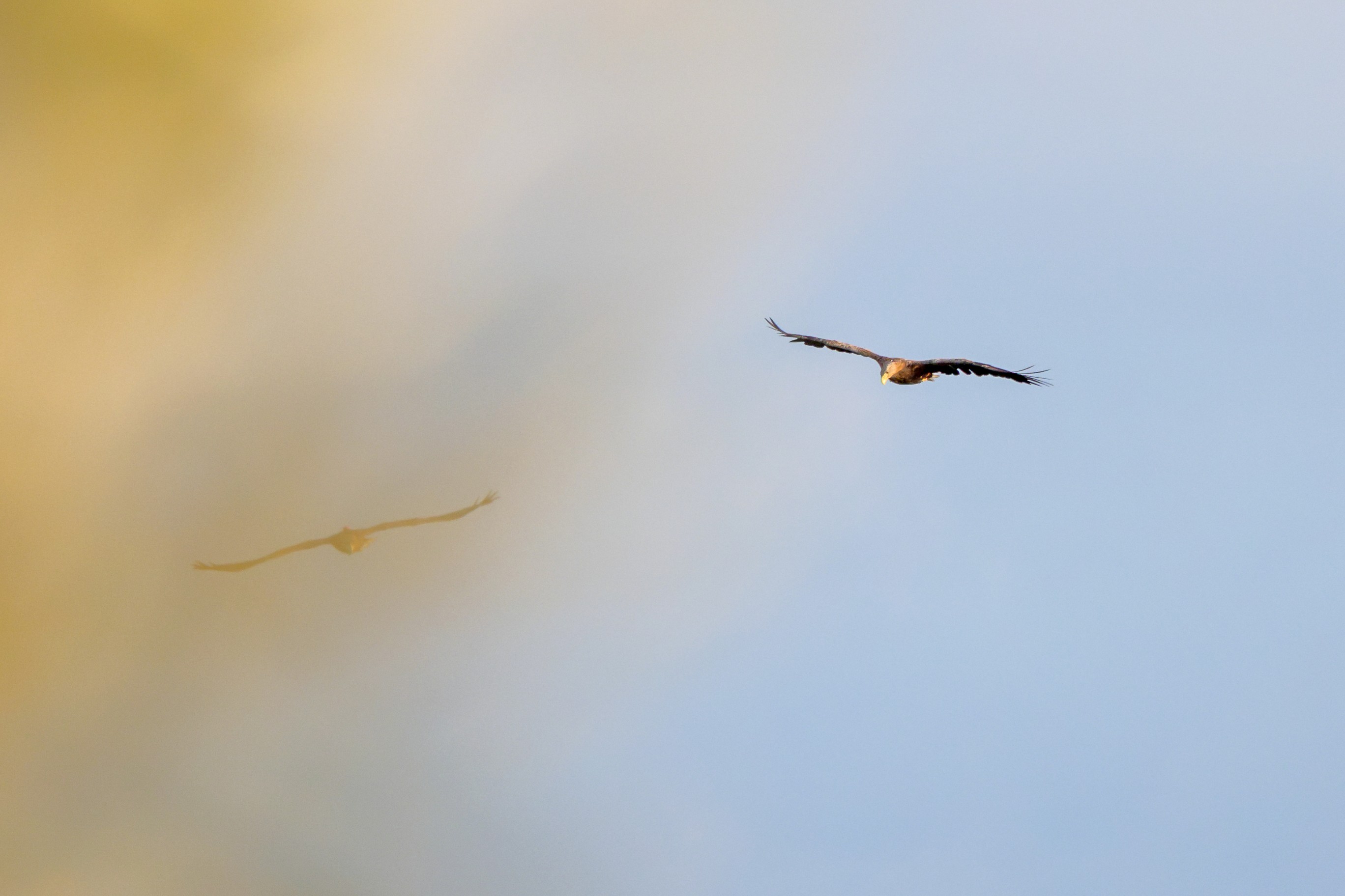 Ende Juni konnte das Seeadlerweibchen mit ihrem Nachwuchs gemeinsam von der Beobachtungshütte III, zur linken Seite in dem bevorzugten Baum am Gewässerrand, beobachtet werden. Zu dieser Zeit zeigte sich schon ein neuer männlicher Seeadler, der beidseitig beringt und mit einer rötlichen Besenderung ausgestattet und wohl dem dritten Kalenderjahres zuzuordnen ist. Anfänglich wurde er vom Seeadlerweibchen permanent verjagt. Er ließ sich über Wochen nicht davon beeindrucken und blieb im Habitat. Seit Mitte August konnte das Seeadlerweib und der neue Verehrer sehr häufig im gleichen Baum auf einer Warte sitzend und bei gemeinsamen Flügen beobachtet werden. Das neue Seeadlermännchen stammt nach mir bekannten Informationen aus dem Bereich Oostvaardersplassen Nationalpark Nieuw Land in den Niederlanden. Ab dem vierten bis fünften Lebensjahr setzt die Geschlechtsreife bei den Seeadlern ein und lässt somit auf eine Paarbildung zwischen den beiden hoffen, welches die Fortführung des Habitats auf der Bislicher Insel mit weiteren Reproduktionen der Seeadler gewährleisten könnte.