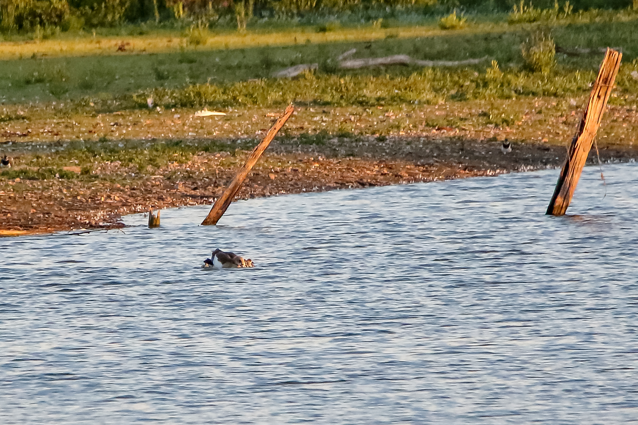 Diese kleine Bildstrecke besitzt leider keine ausreichende Bildqualität. Sie soll vielmehr als Dokumentation über die Verteidigungsbereitschaft einer wehrhaften Nilgans, die ihren Nachwuchs verteidigt, dienen. Erstaunlich, wie Muttertiere sich für ihren Nachwuchs einsetzen und sich nicht von übermächtigen Beutegreifern beeindrucken lassen.