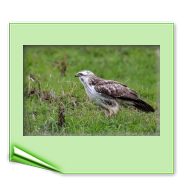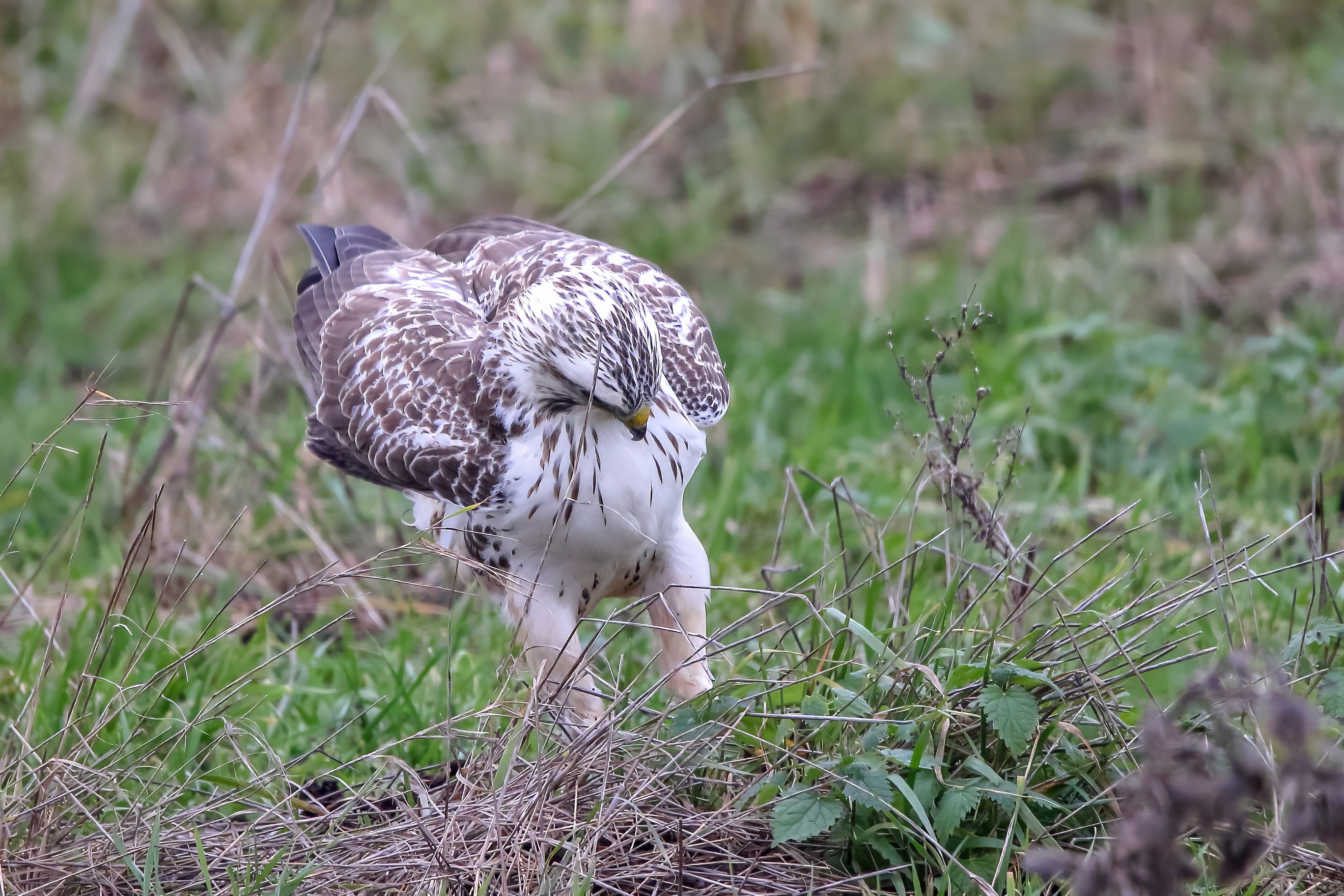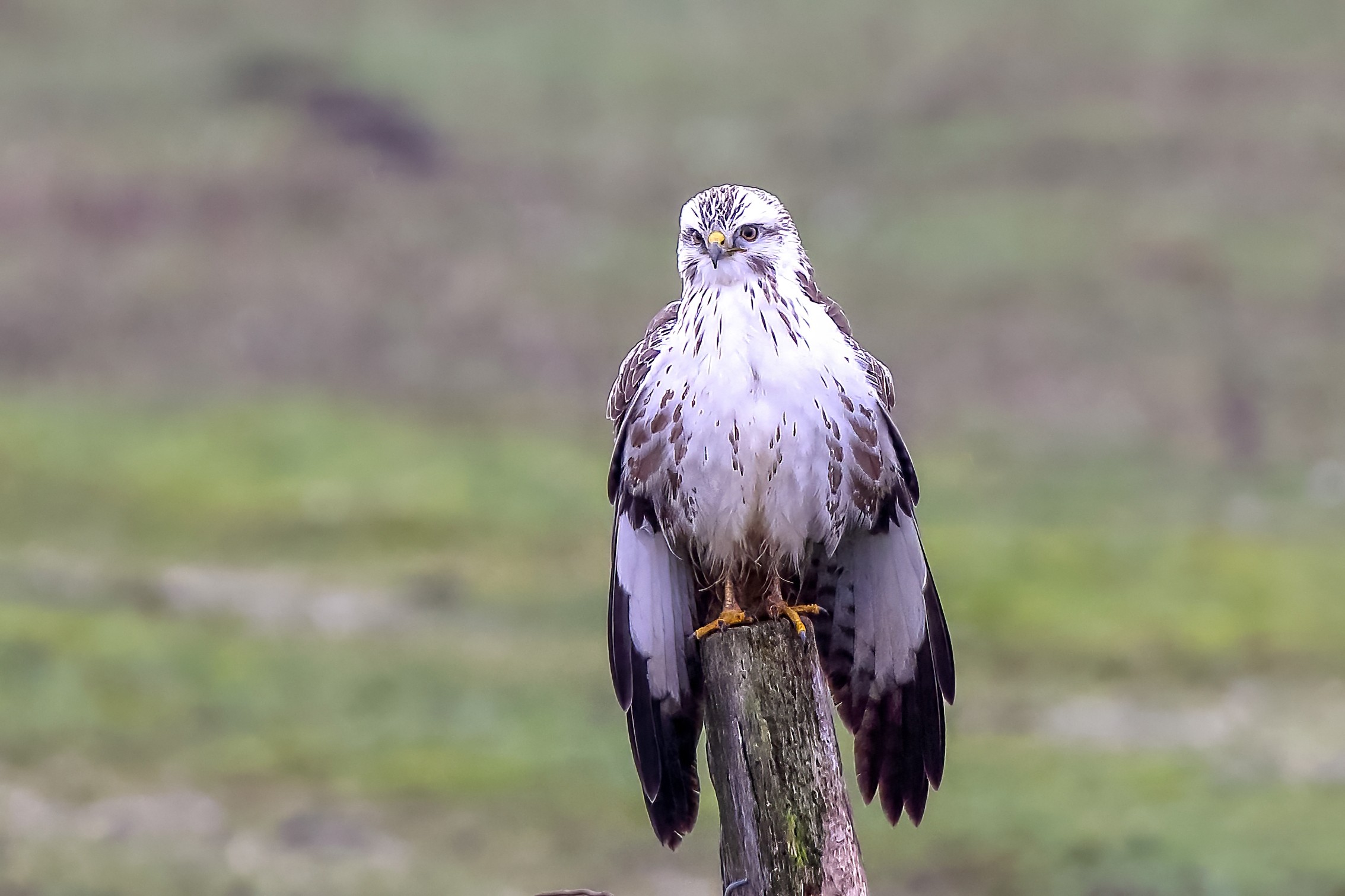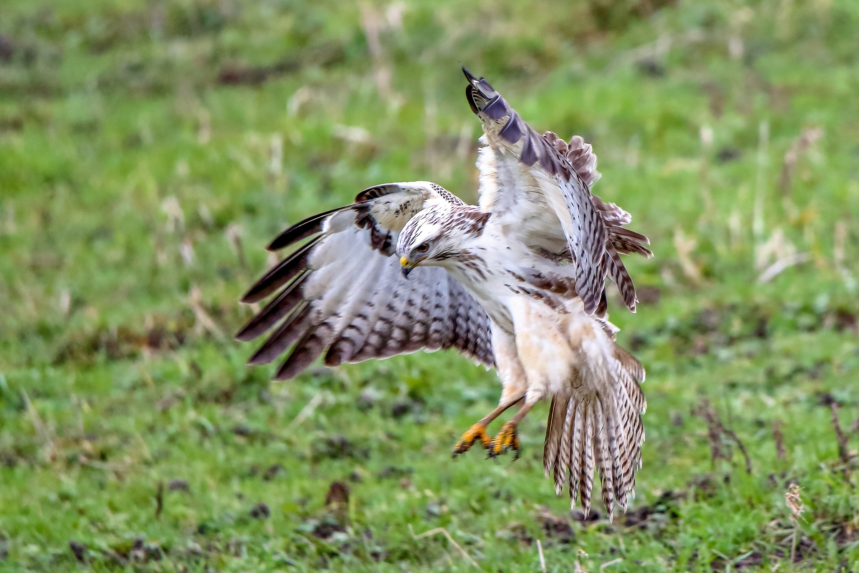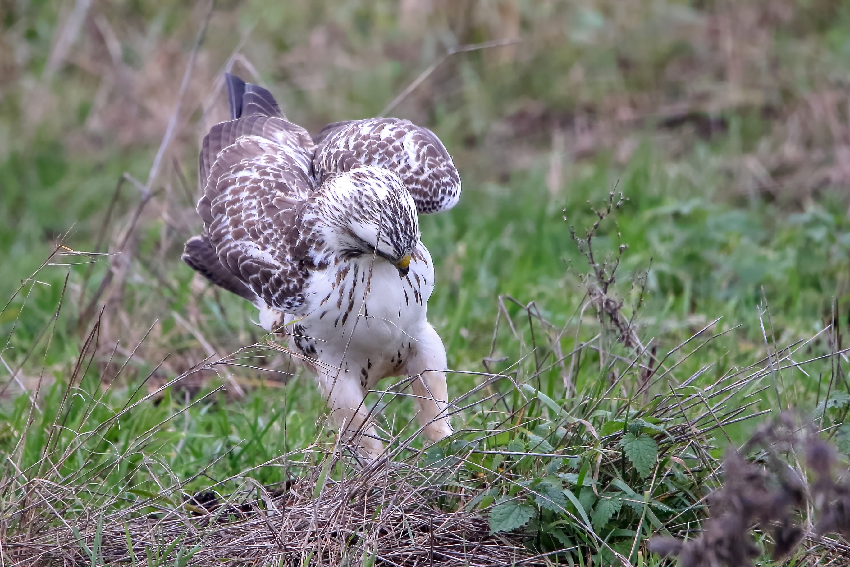 Bussarde haben sehr unterschiedliche Federkleider. Eine seltene und auffällige Farbgebung des Federkleides, wie auf diesen Aufnahmen zu sehen, nennt man helle Farbmorphe. Stets Abstand vom Fotografen einnehmend präsentiert er sich meist mit in größerer Entfernung.