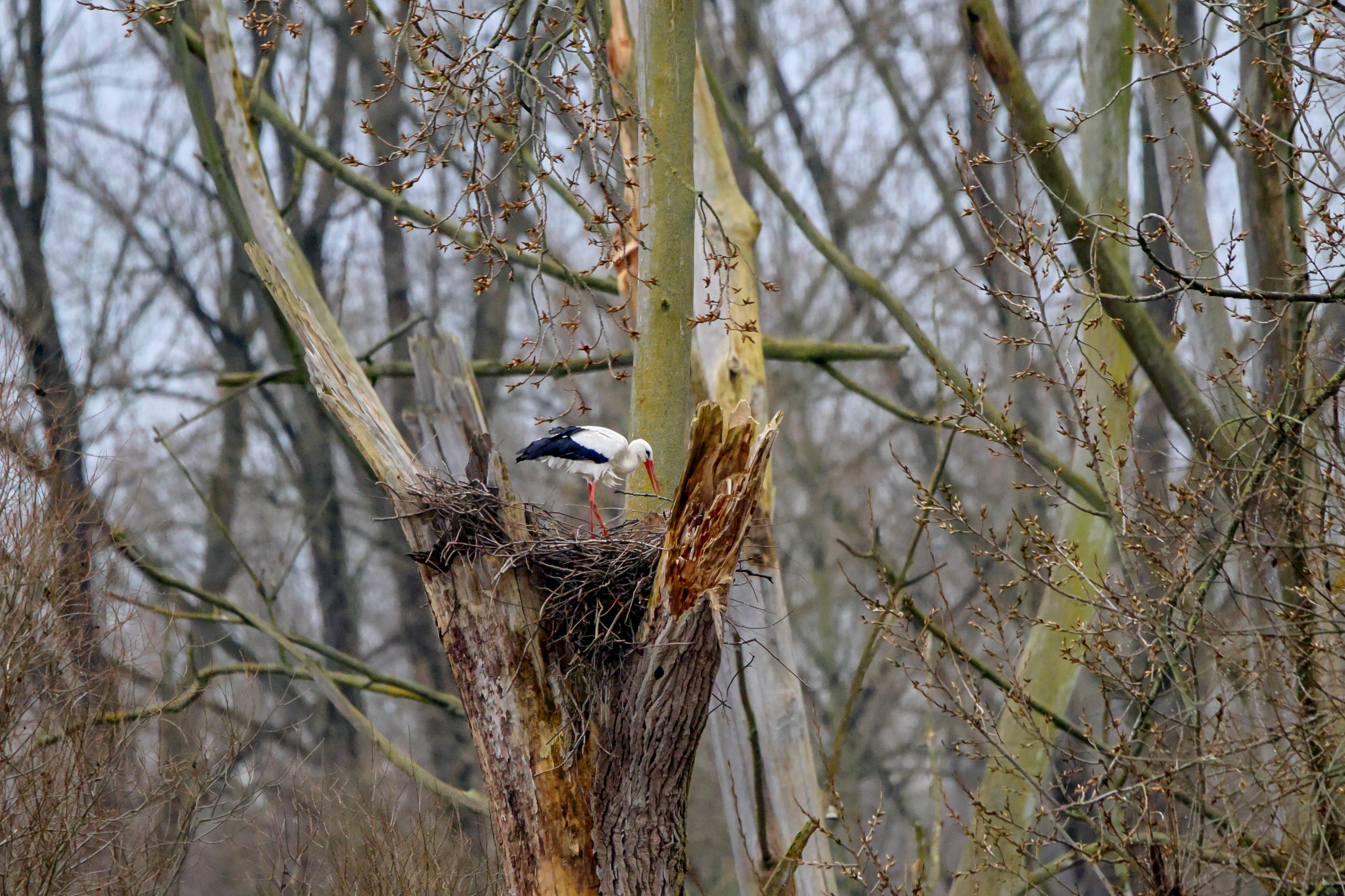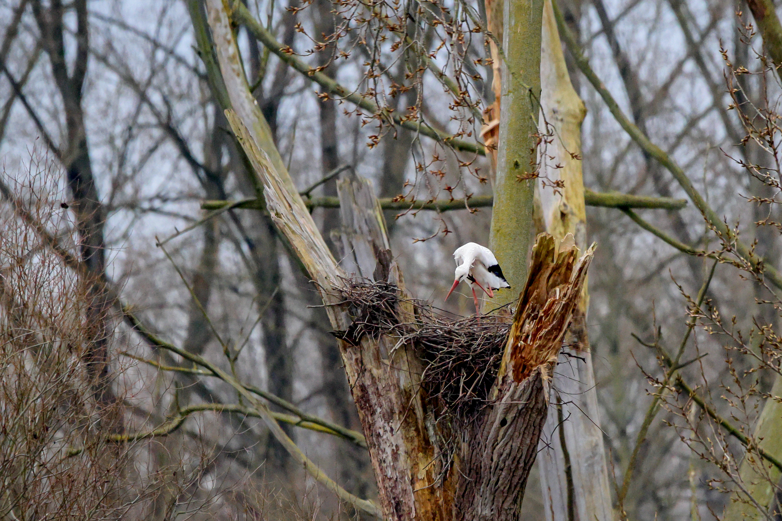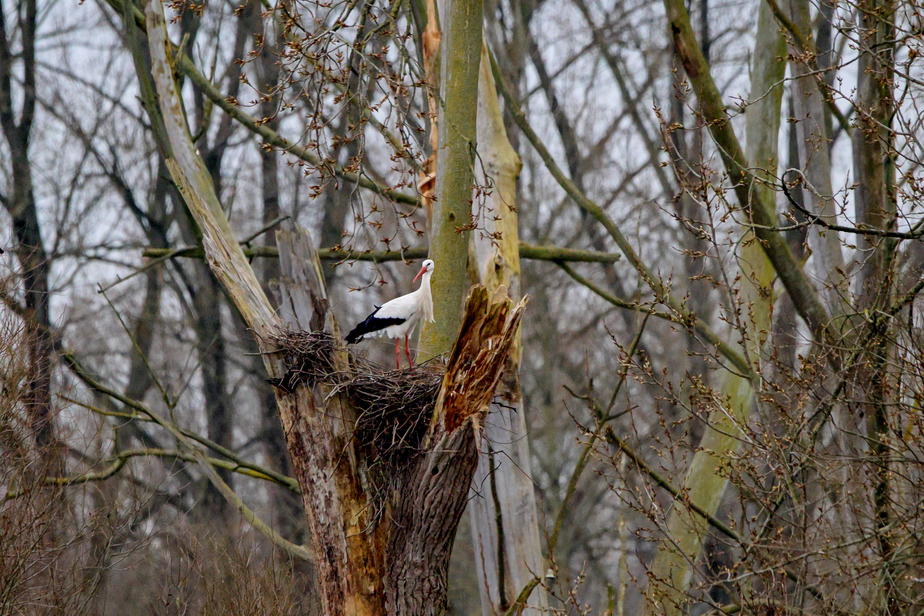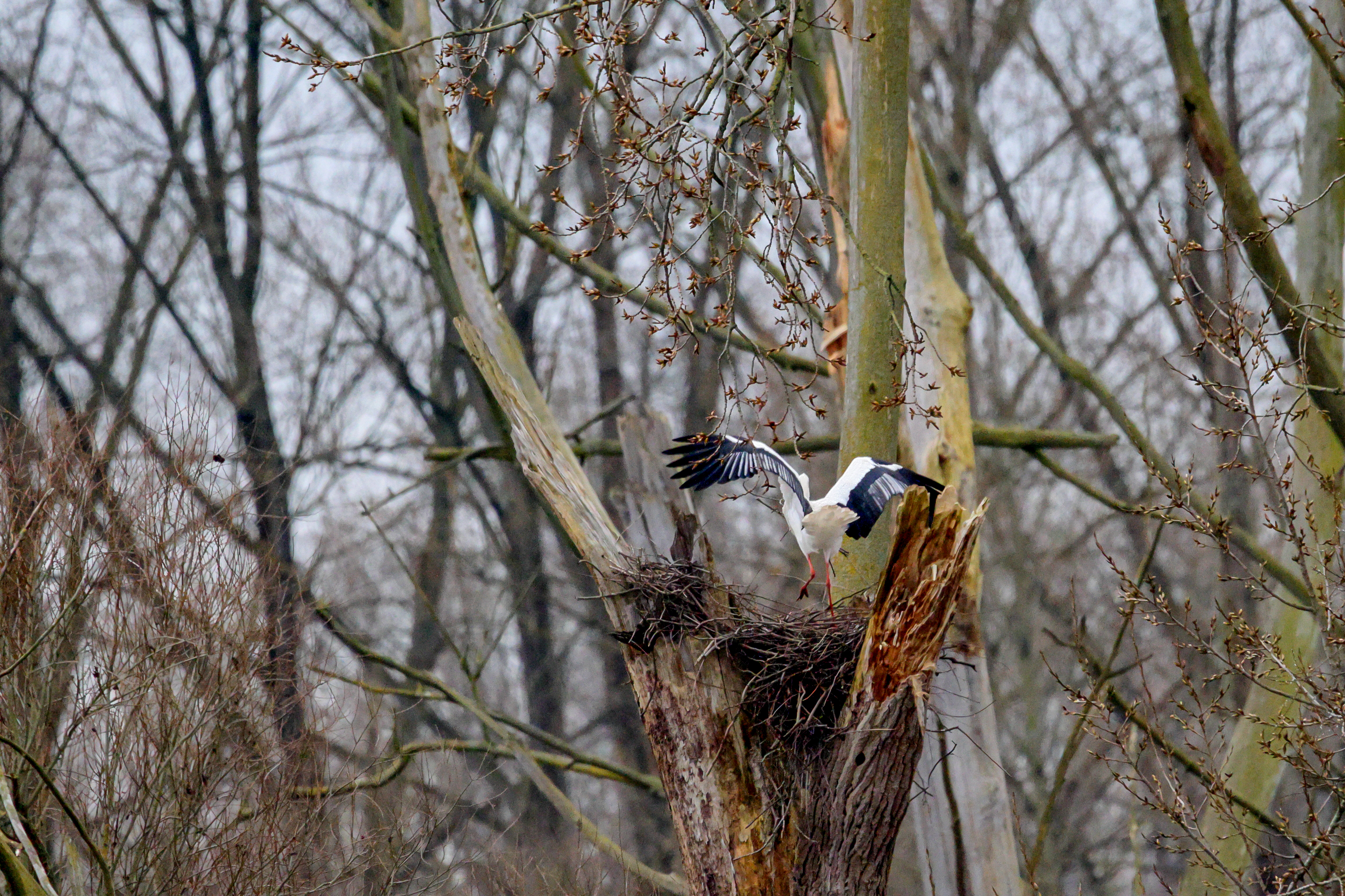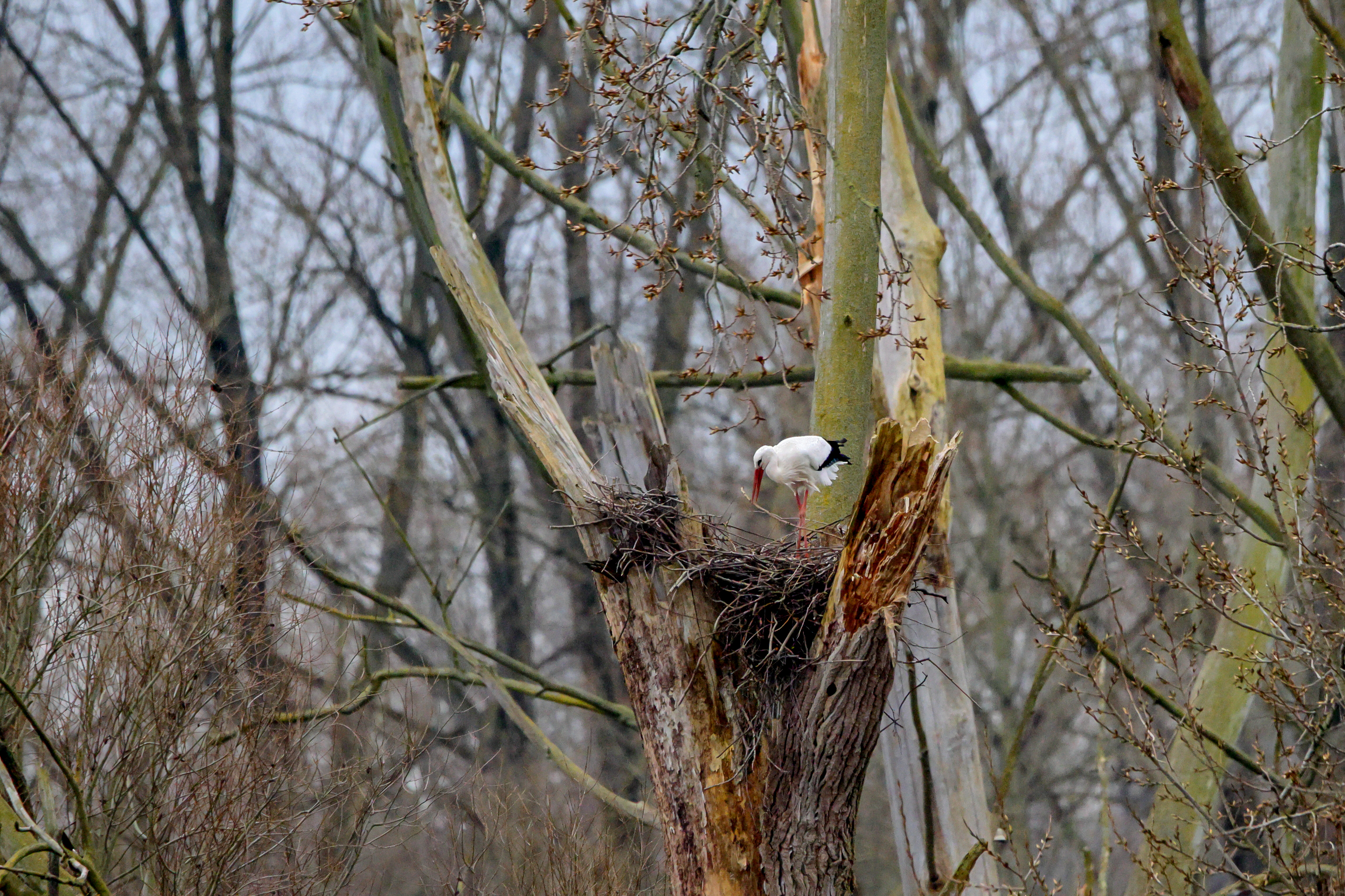 Das Anfang des Winters durch einen Sturm zerstörte Storchenest im Bereich der Beobachtungshütte II muss nun durch das Storchenmännchen eine Etage tiefer, in den Überresten des abgebrochenen Baumes, wieder aufgebaut werden. Sein etwas später eintreffendes Storchenweibchen wird seine Fleißarbeit mit goßer Zuneigung belohnen.