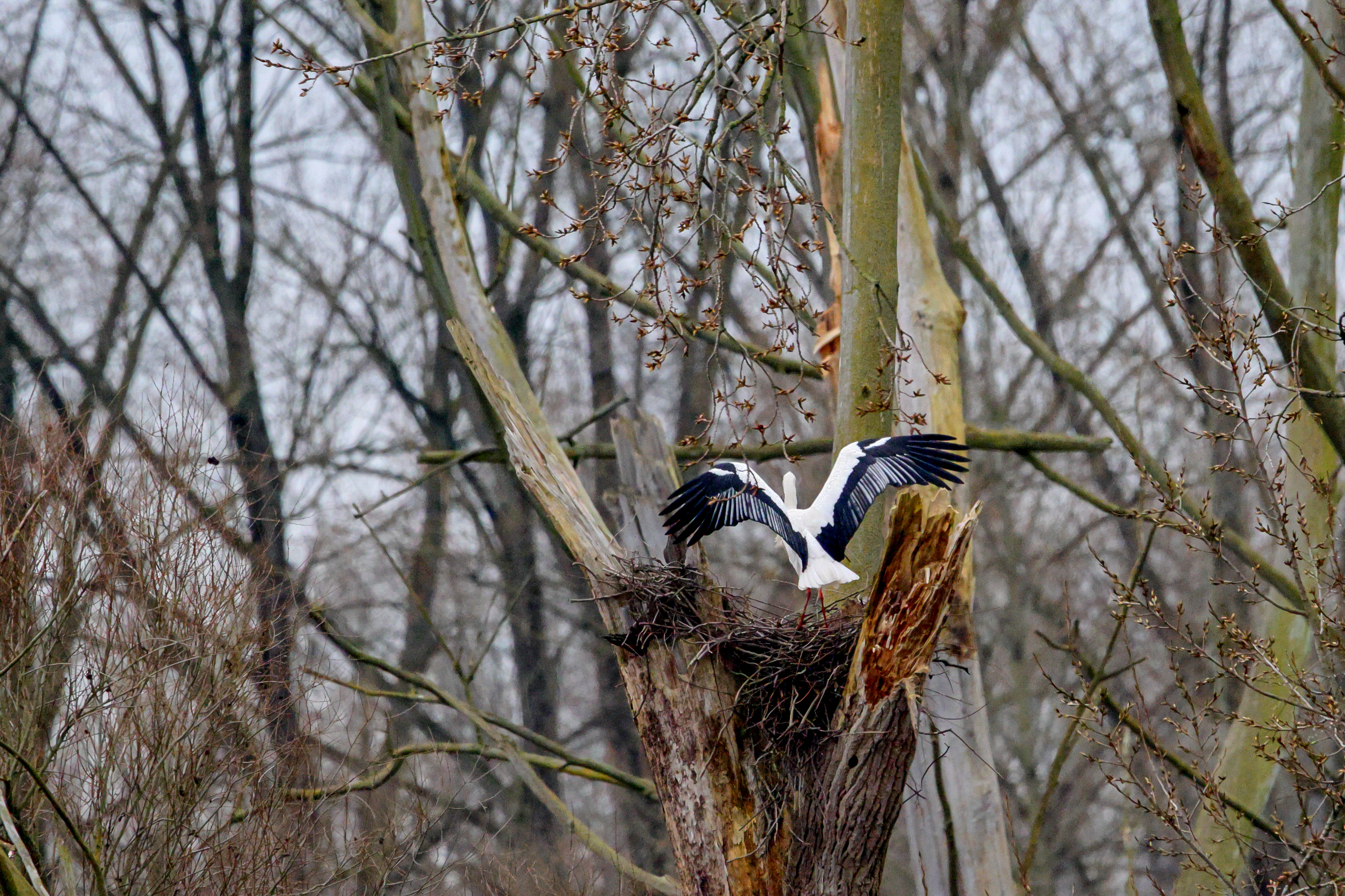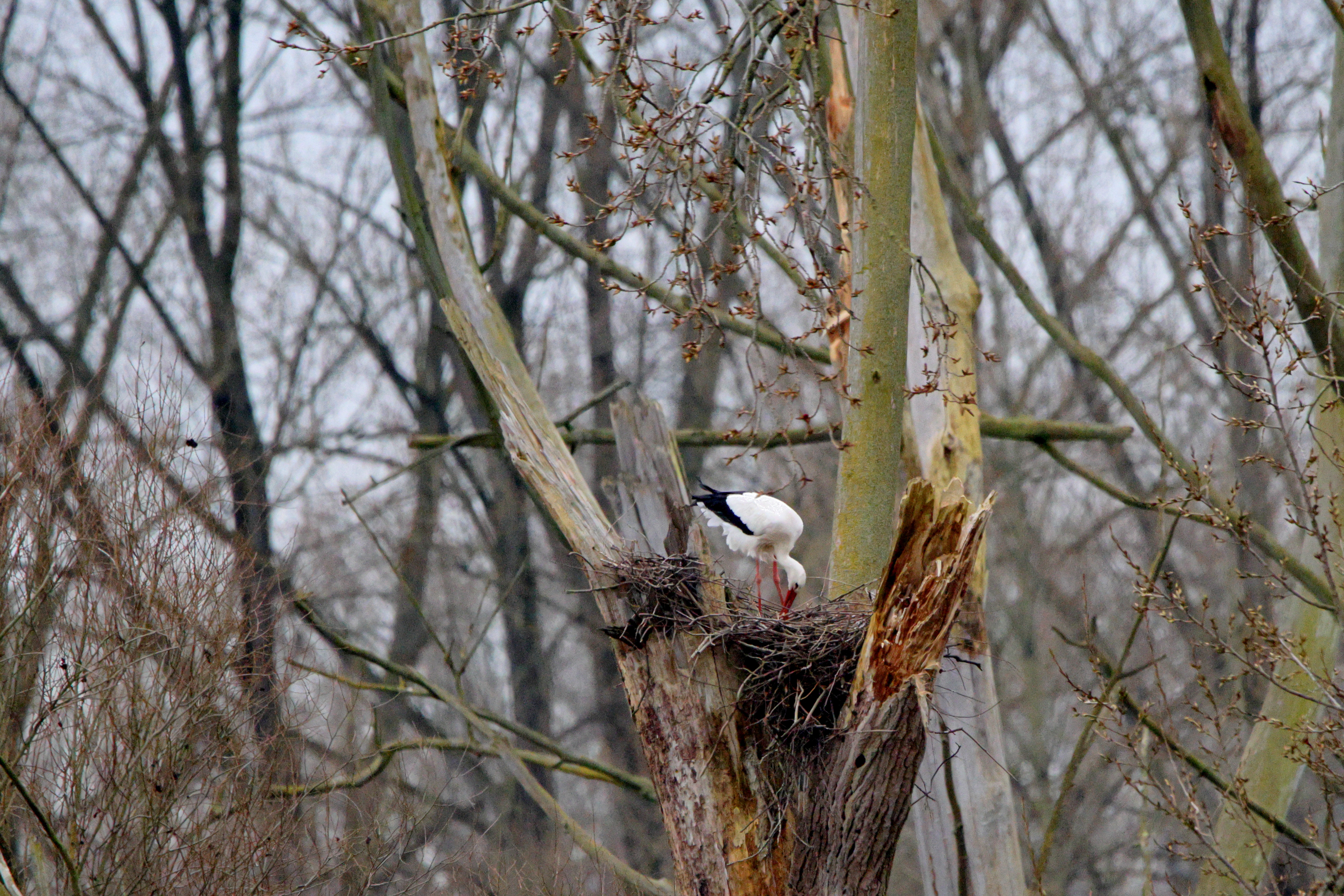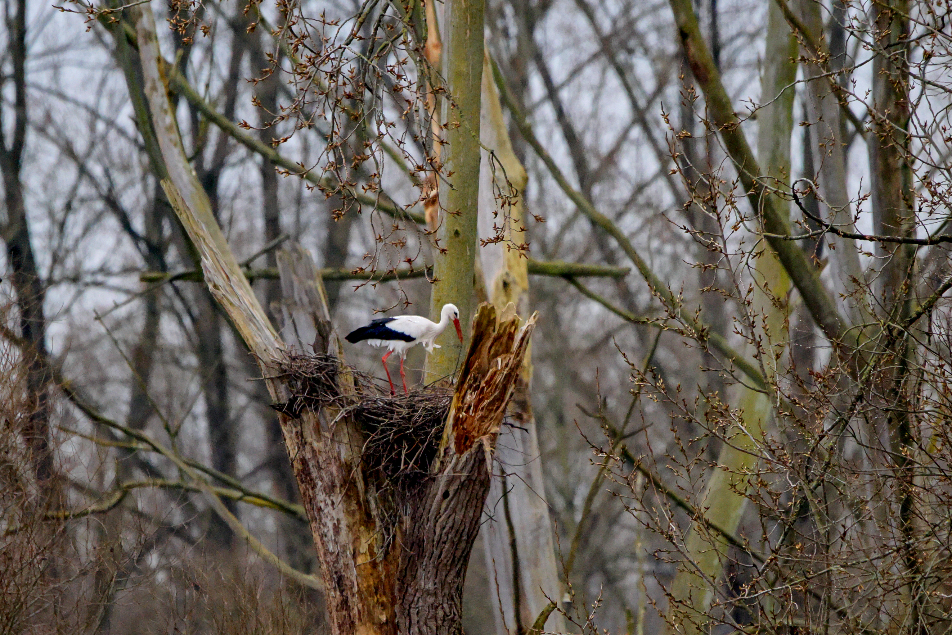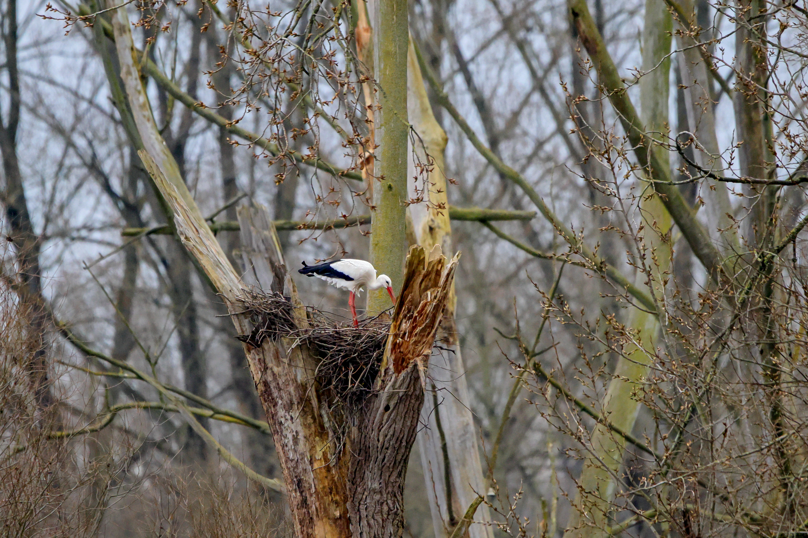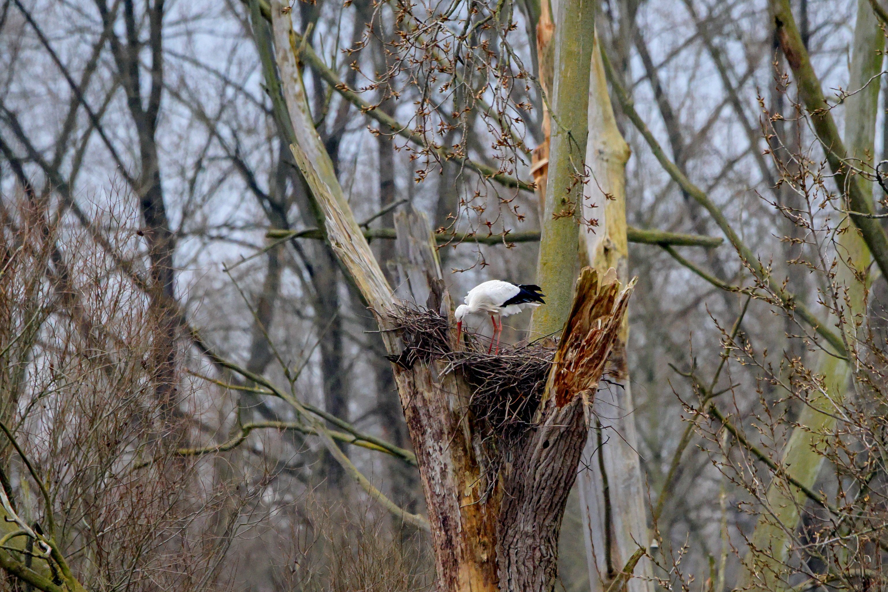 Das Anfang des Winters durch einen Sturm zerstörte Storchenest im Bereich der Beobachtungshütte II muss nun durch das Storchenmännchen eine Etage tiefer, in den Überresten des abgebrochenen Baumes, wieder aufgebaut werden. Sein etwas später eintreffendes Storchenweibchen wird seine Fleißarbeit mit goßer Zuneigung belohnen.