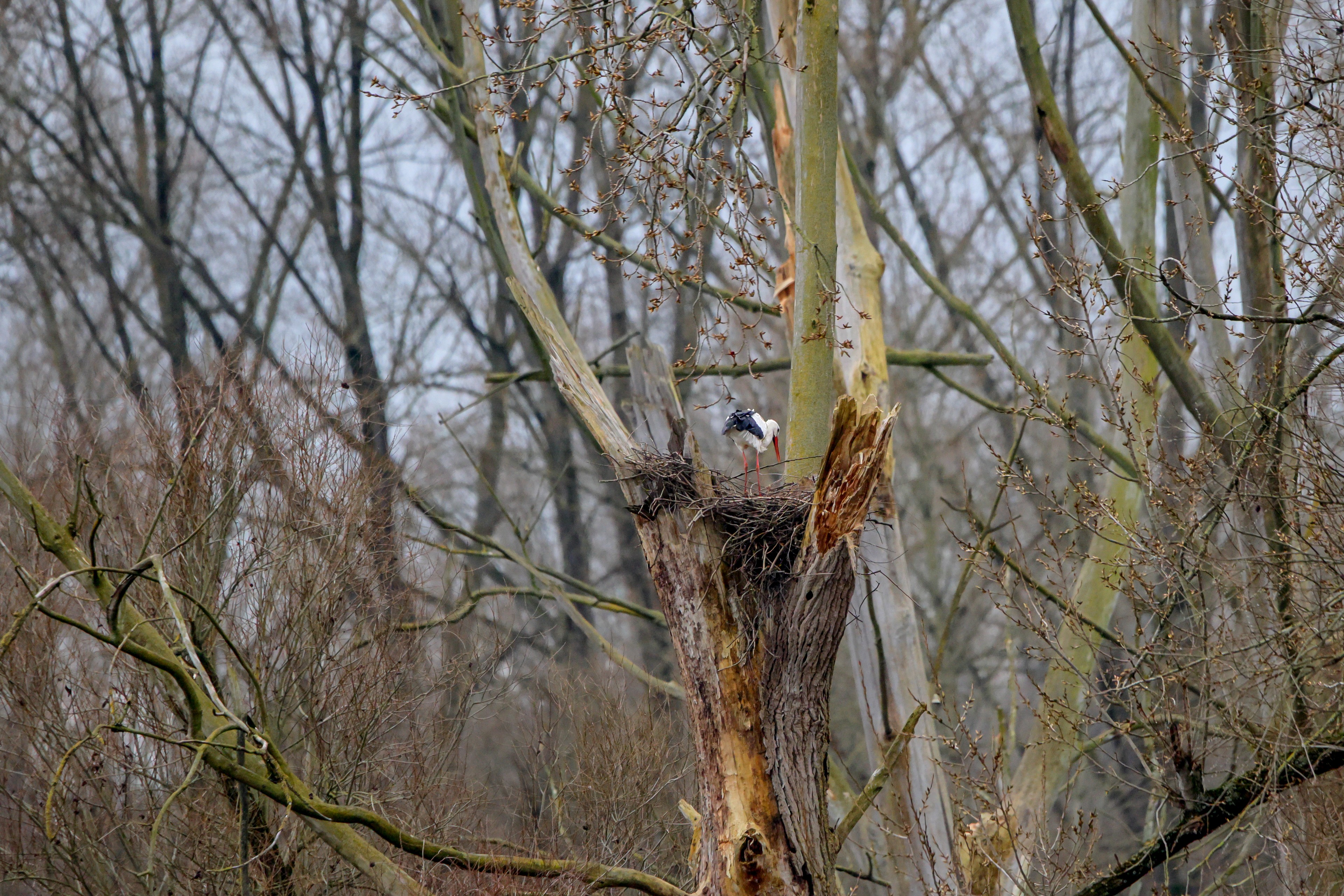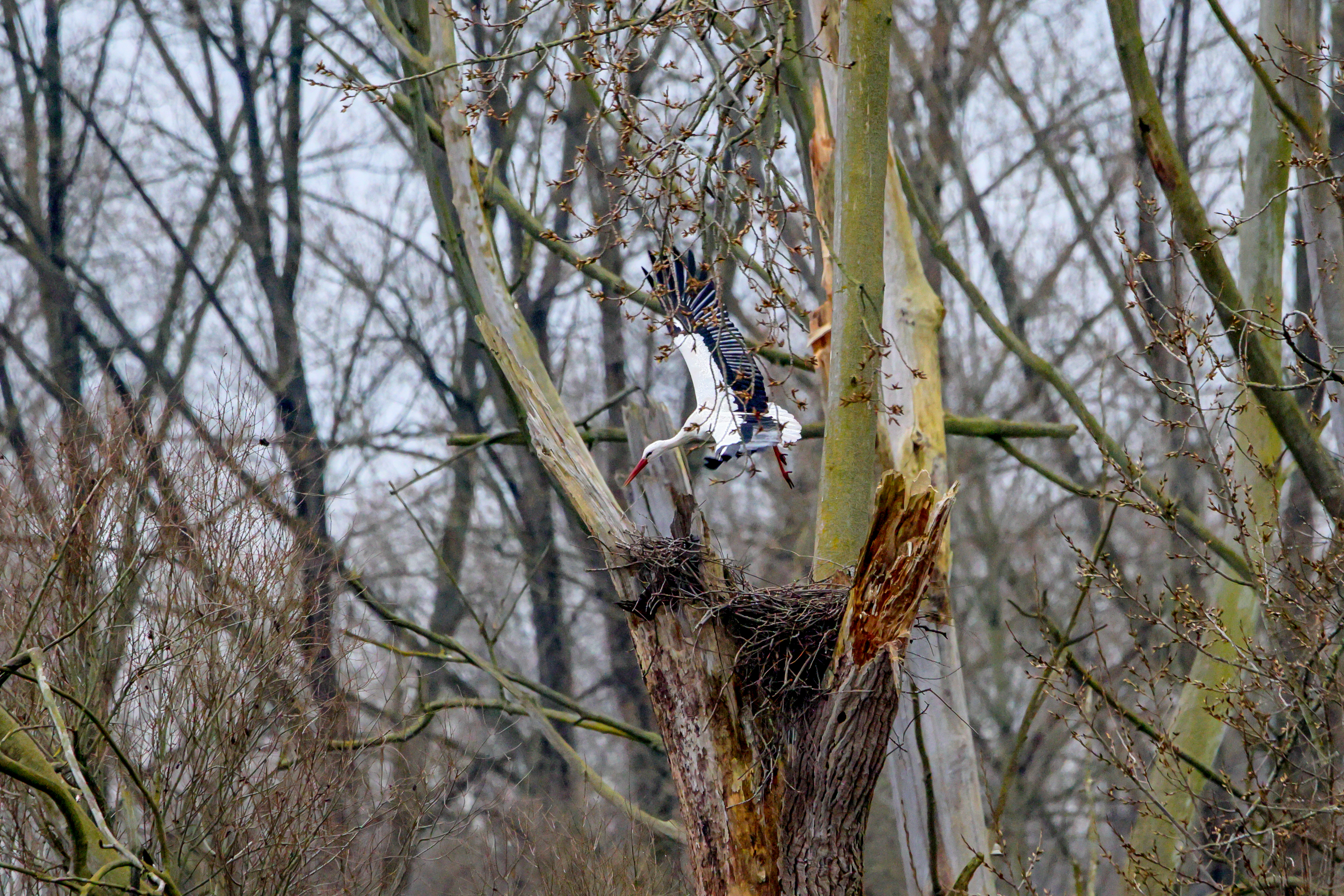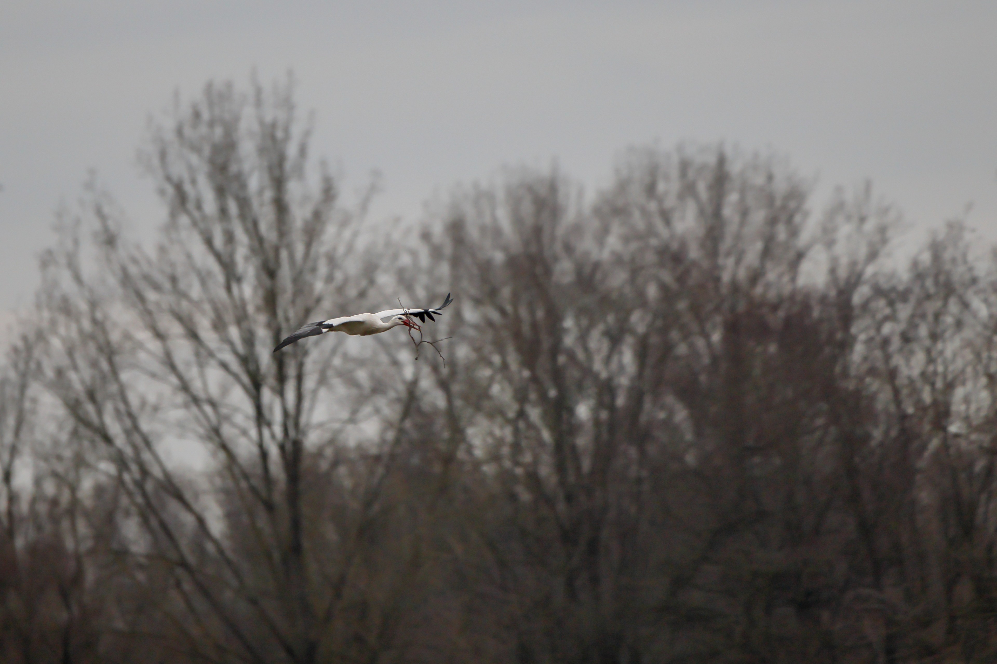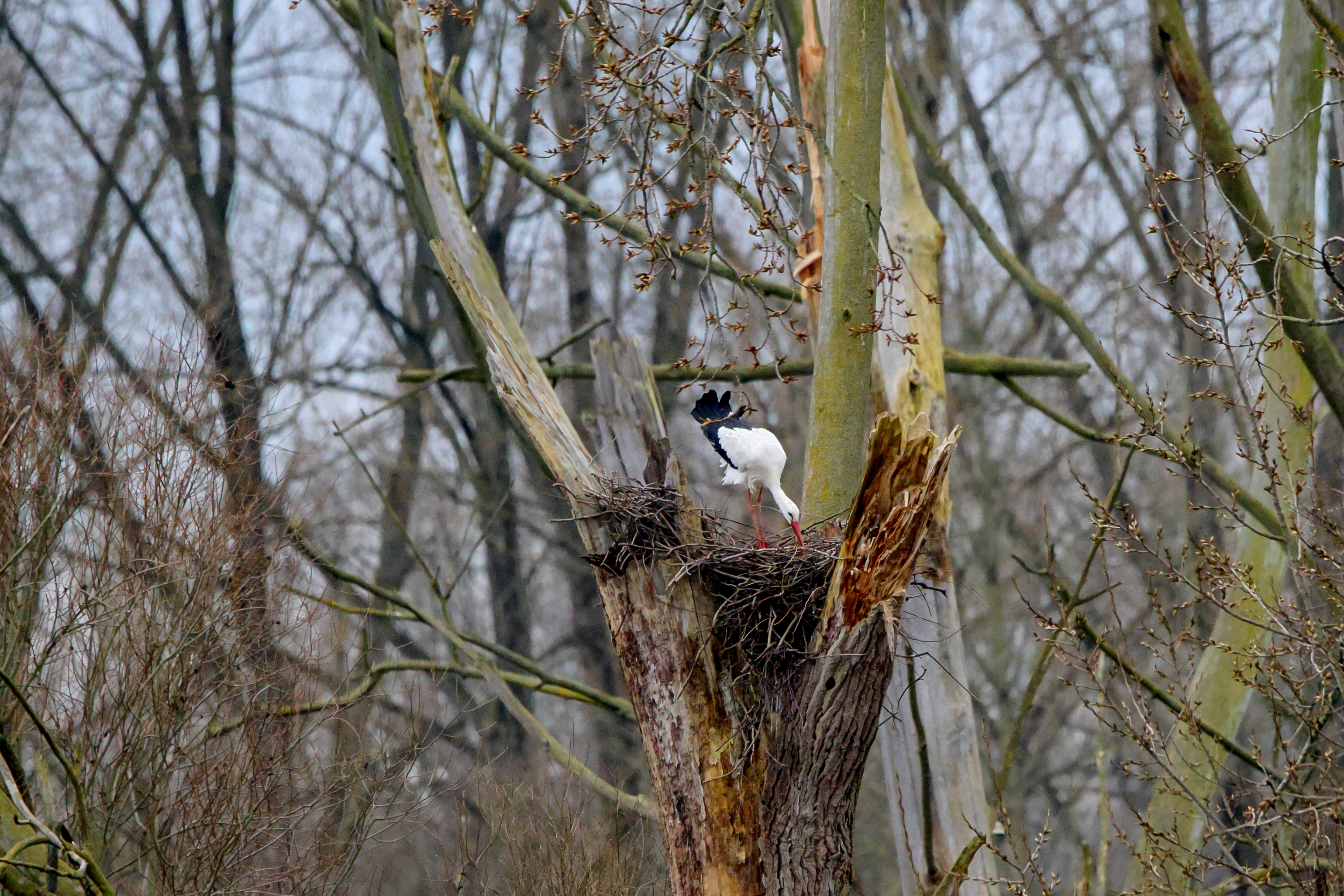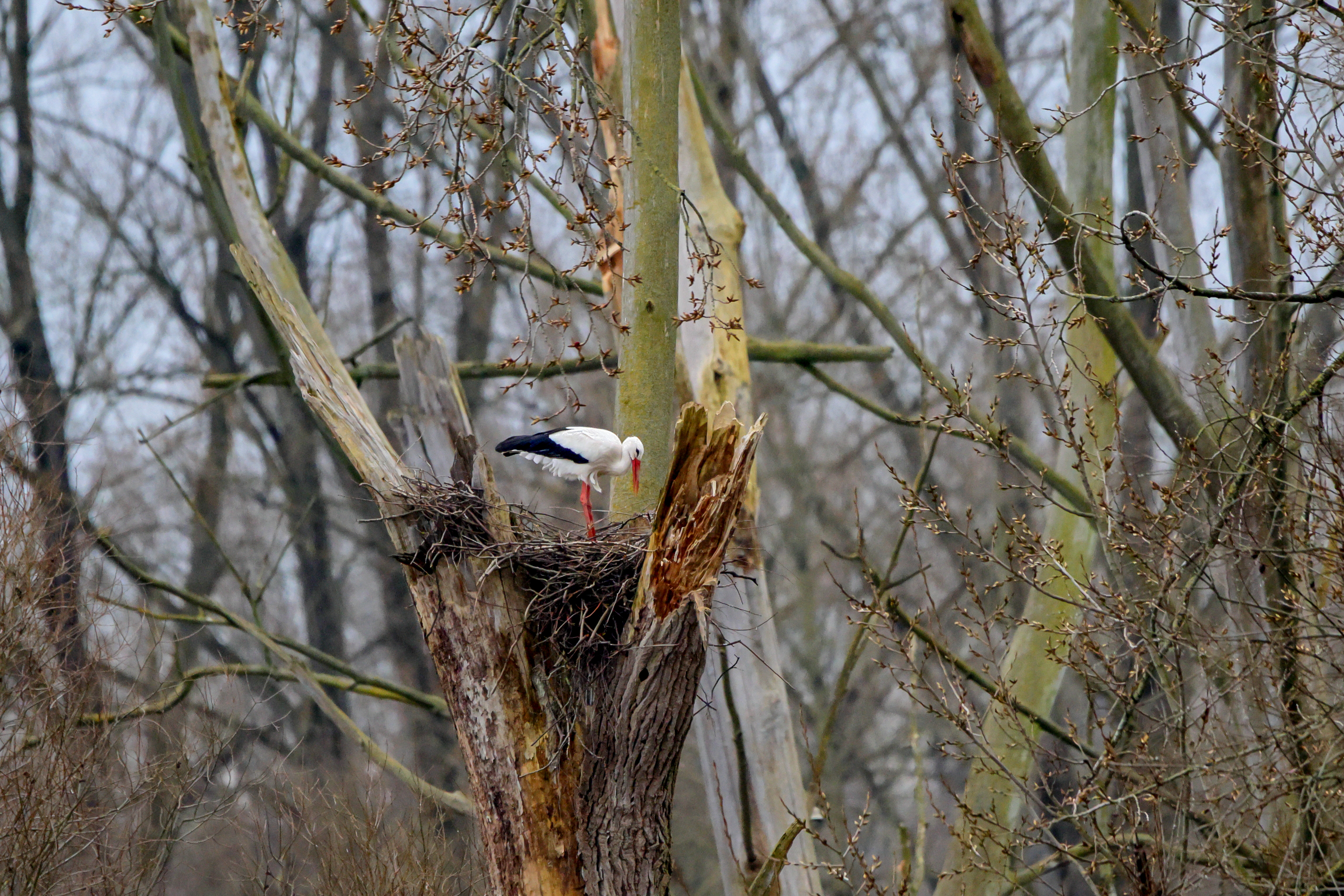 Das Anfang des Winters durch einen Sturm zerstörte Storchenest im Bereich der Beobachtungshütte II muss nun durch das Storchenmännchen eine Etage tiefer, in den Überresten des abgebrochenen Baumes, wieder aufgebaut werden. Sein etwas später eintreffendes Storchenweibchen wird seine Fleißarbeit mit goßer Zuneigung belohnen.
