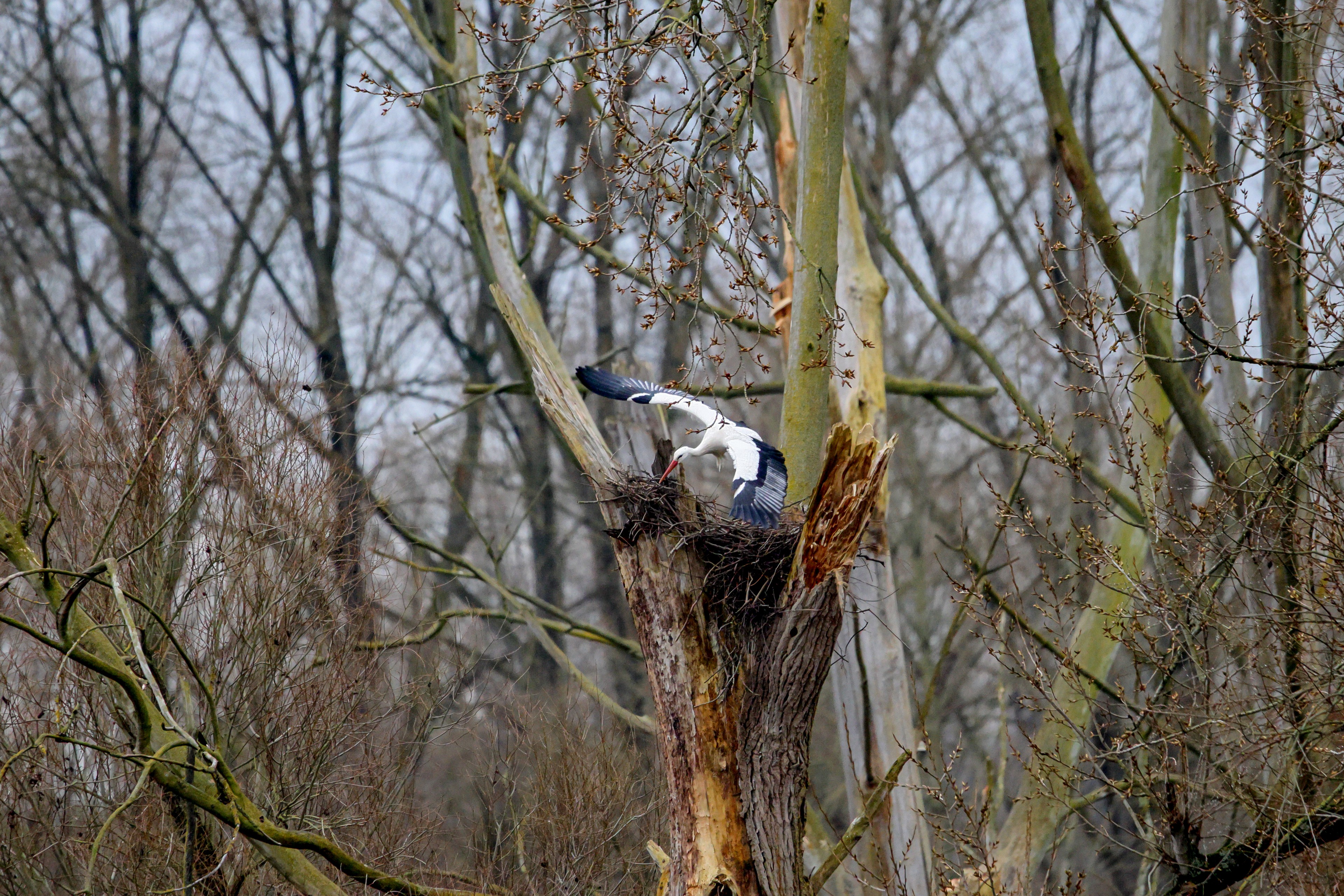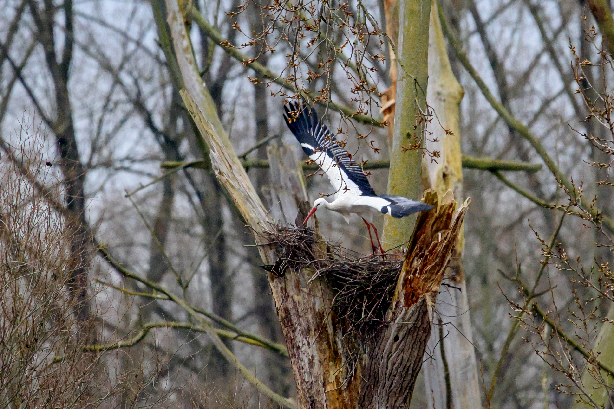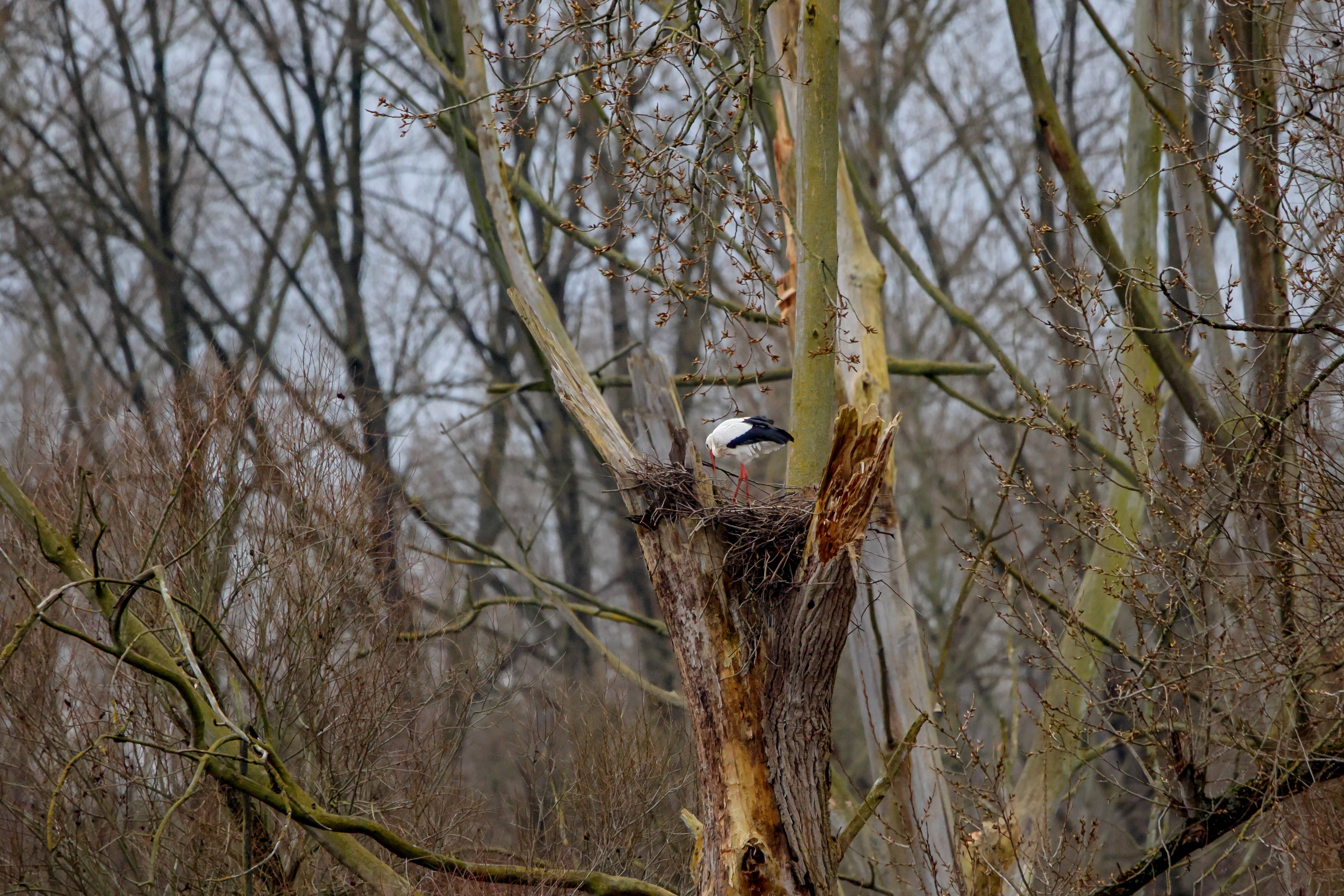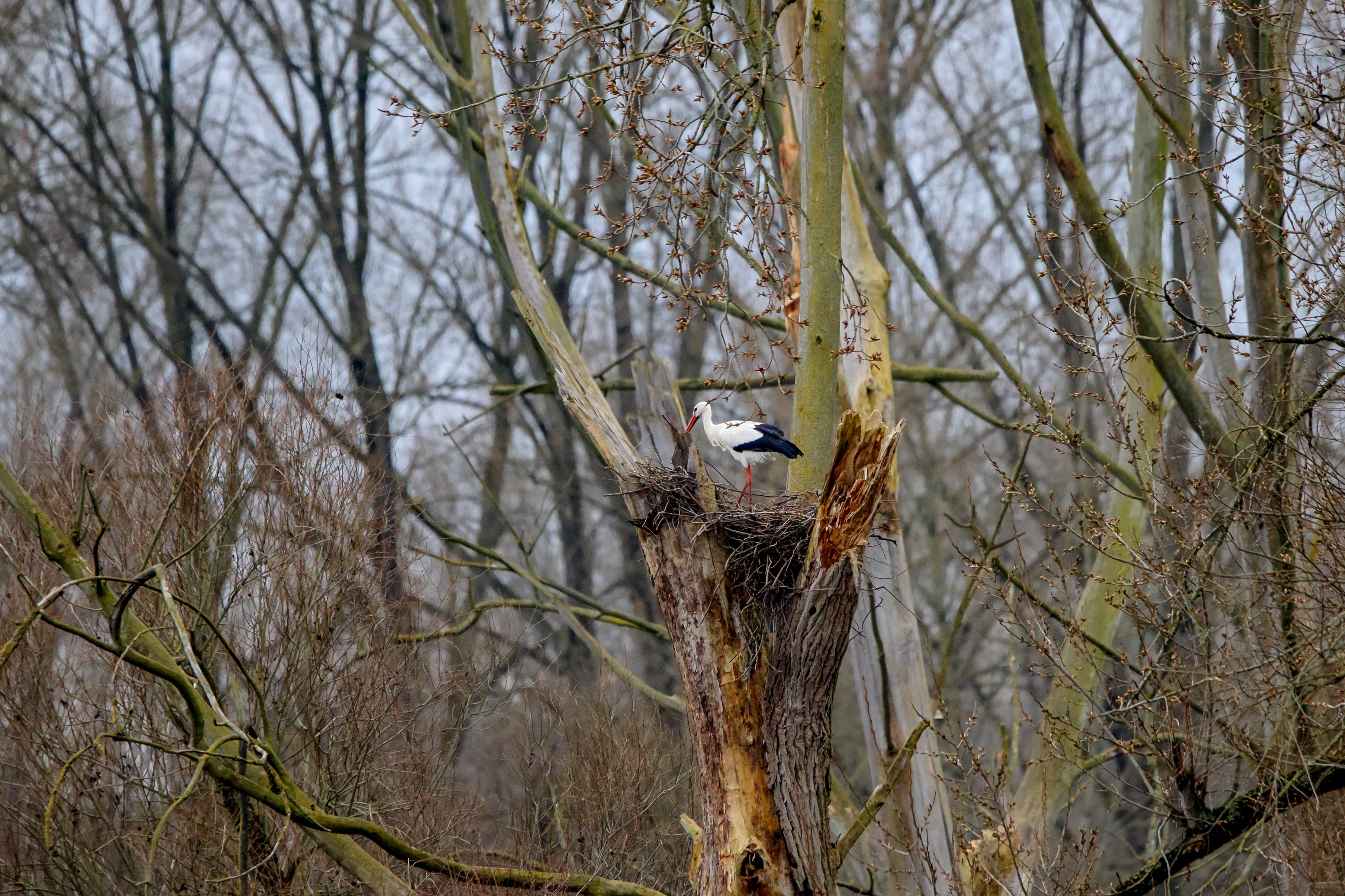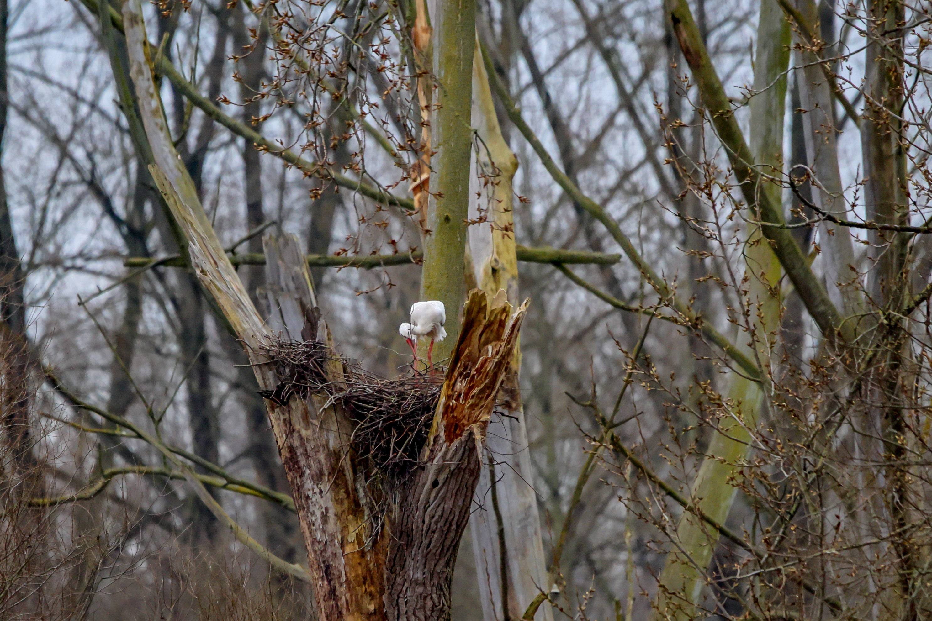 Das Anfang des Winters durch einen Sturm zerstörte Storchenest im Bereich der Beobachtungshütte II muss nun durch das Storchenmännchen eine Etage tiefer, in den Überresten des abgebrochenen Baumes, wieder aufgebaut werden. Sein etwas später eintreffendes Storchenweibchen wird seine Fleißarbeit mit goßer Zuneigung belohnen.
