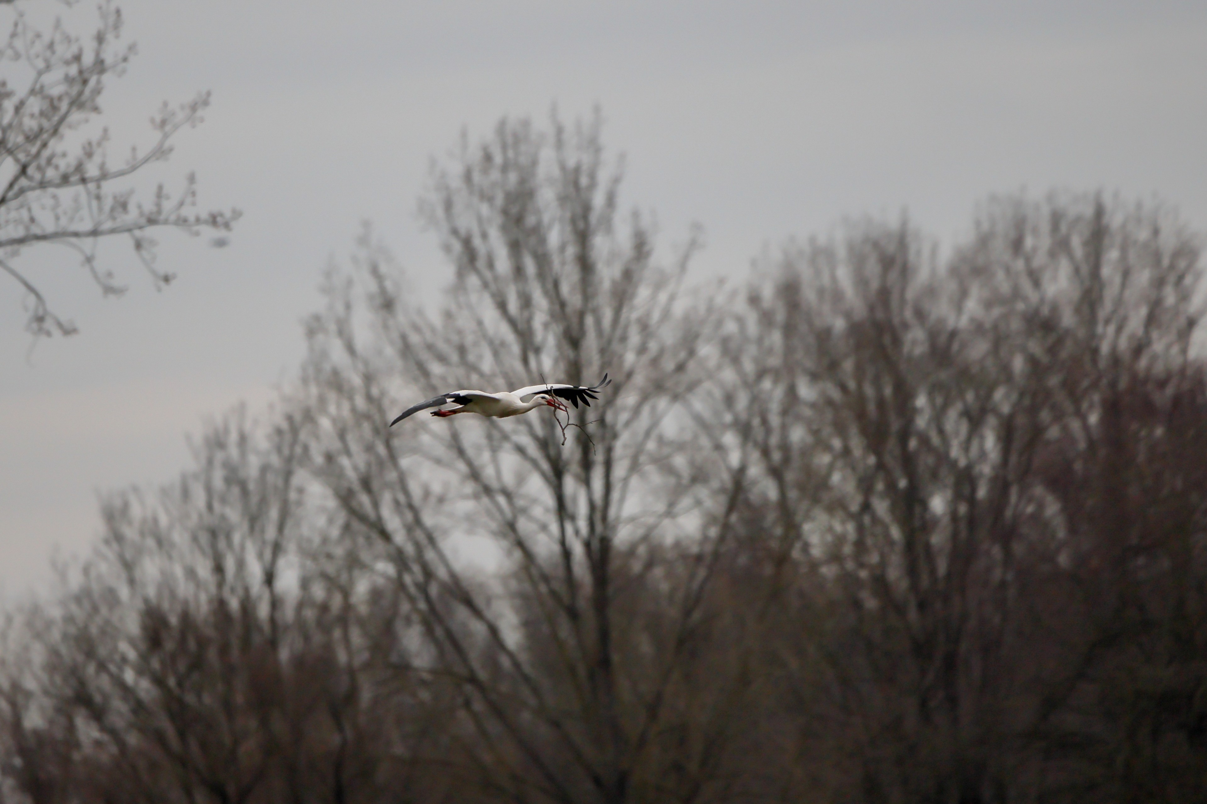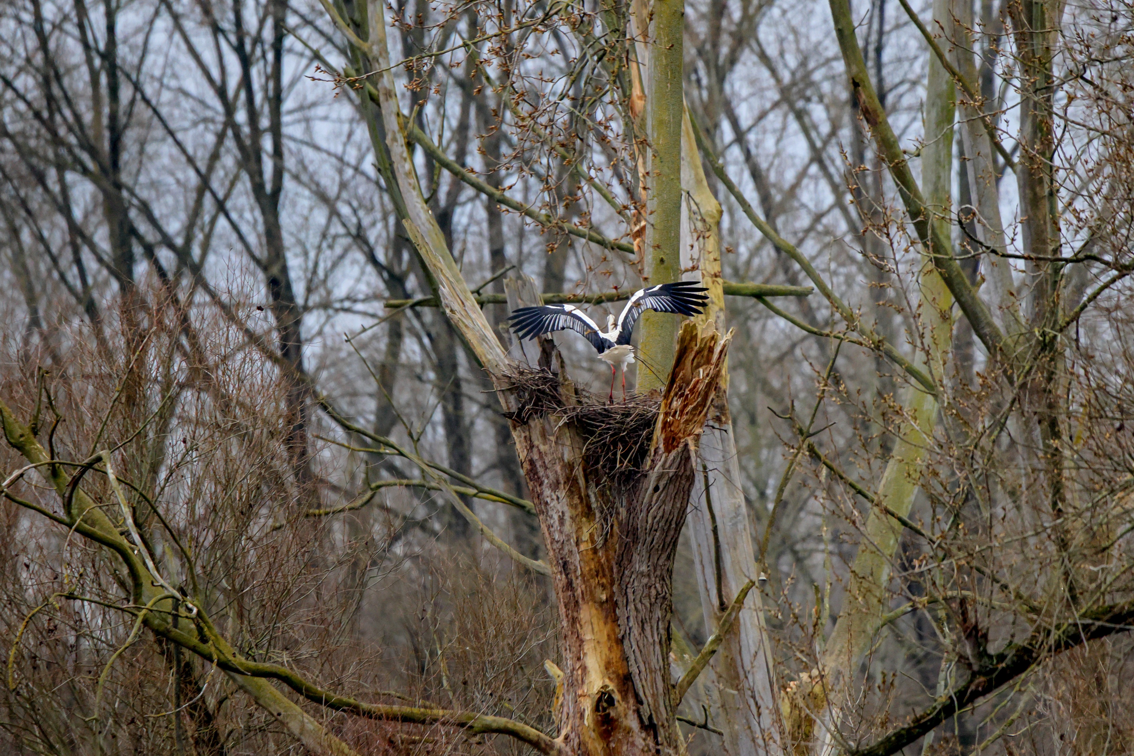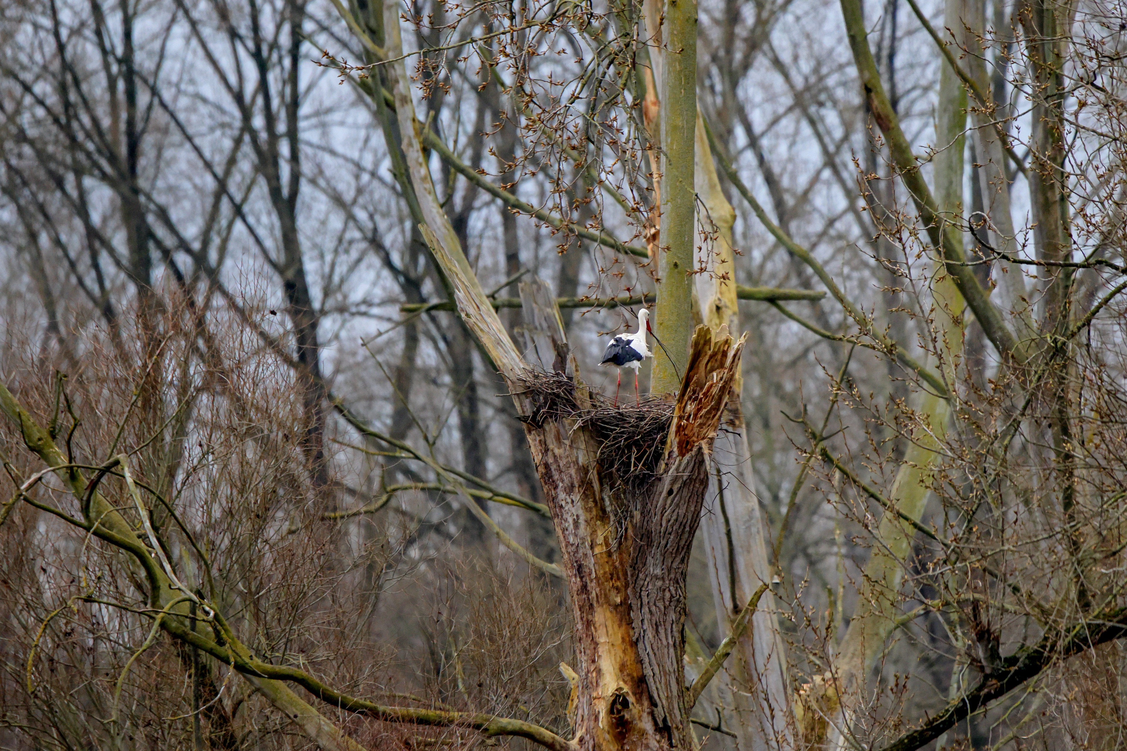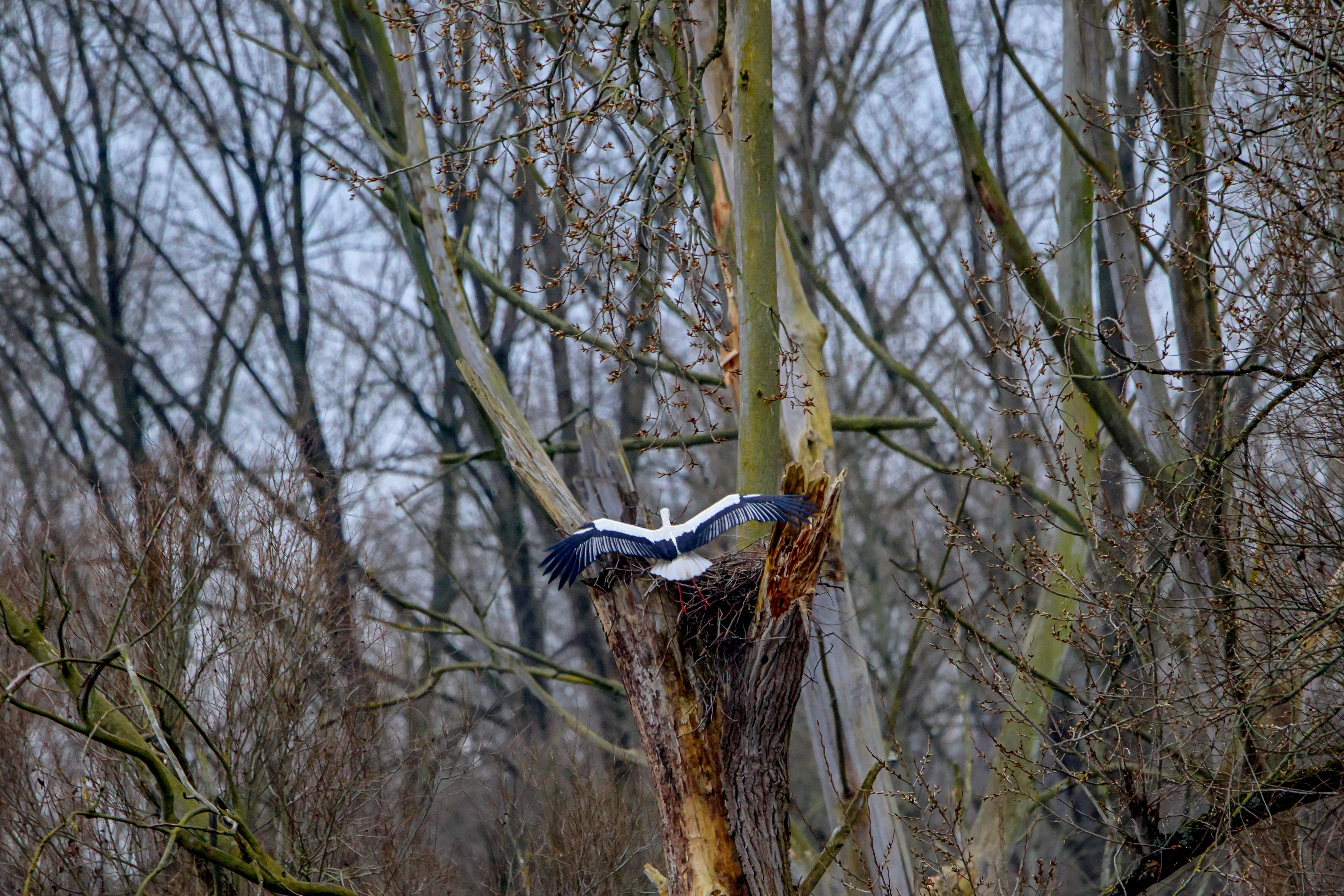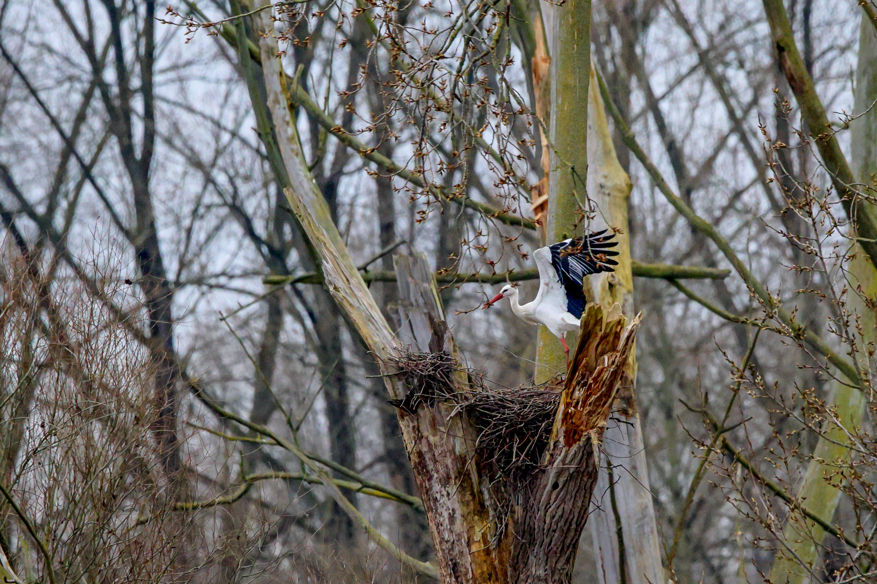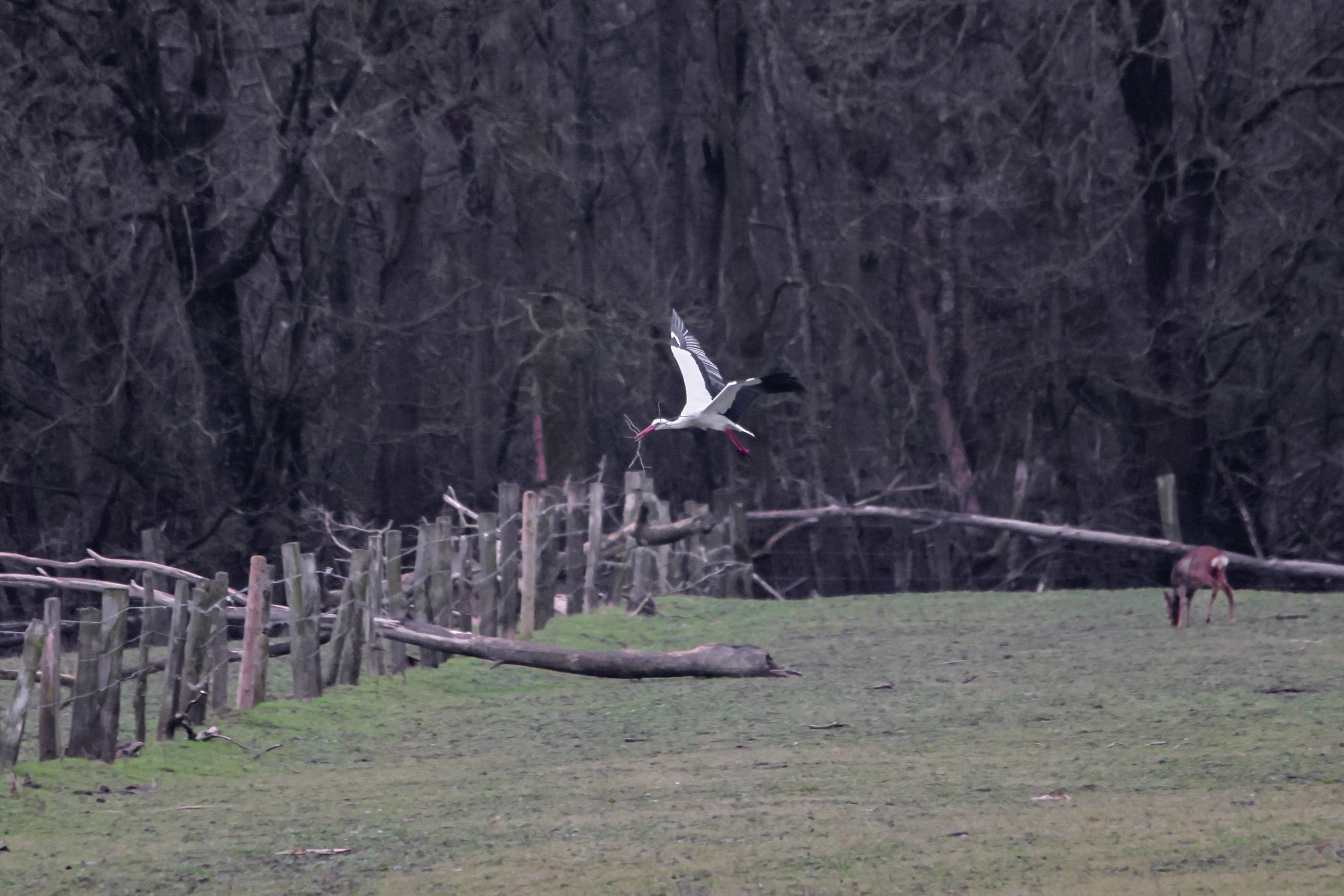 Das Anfang des Winters durch einen Sturm zerstörte Storchenest im Bereich der Beobachtungshütte II muss nun durch das Storchenmännchen eine Etage tiefer, in den Überresten des abgebrochenen Baumes, wieder aufgebaut werden. Sein etwas später eintreffendes Storchenweibchen wird seine Fleißarbeit mit goßer Zuneigung belohnen.