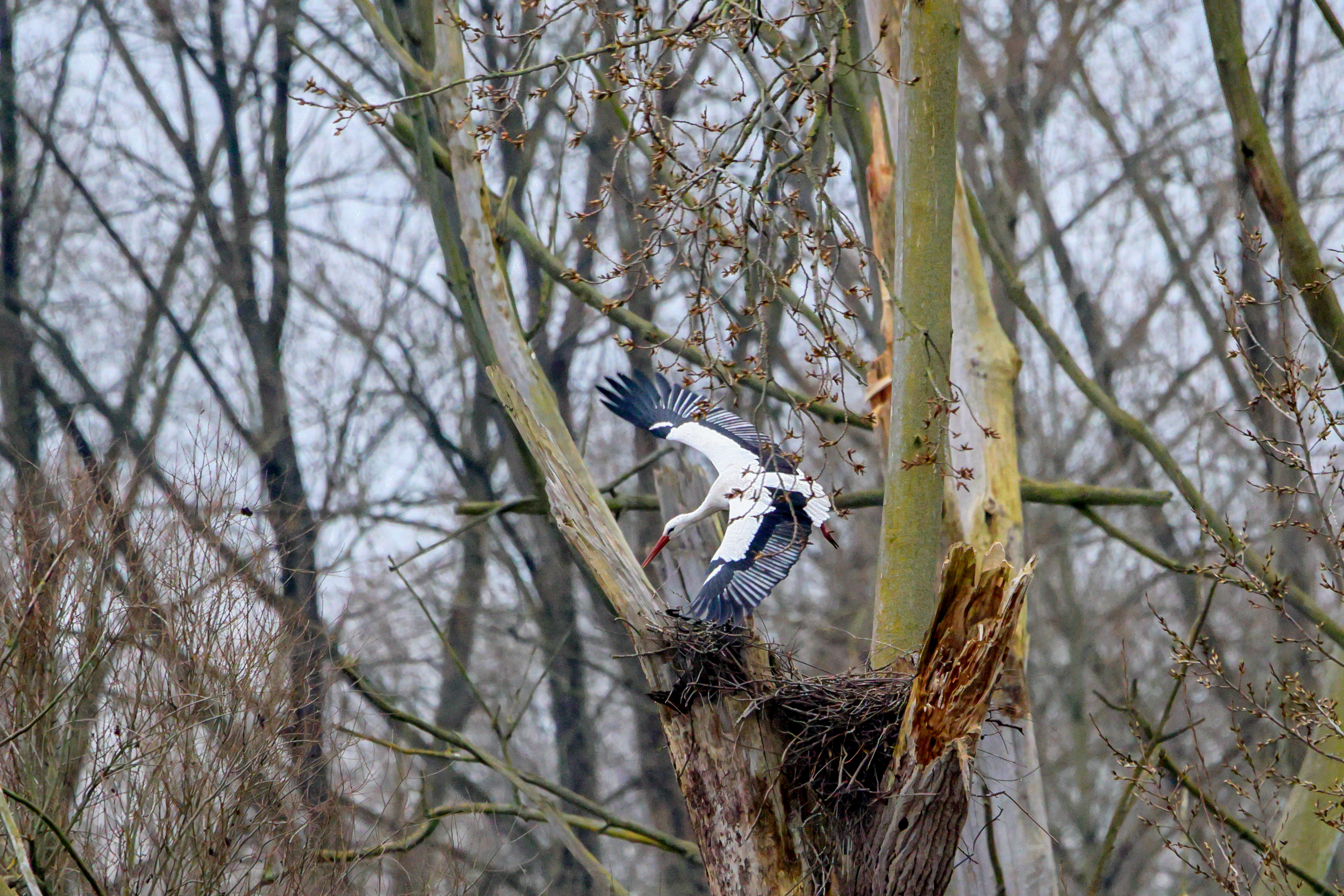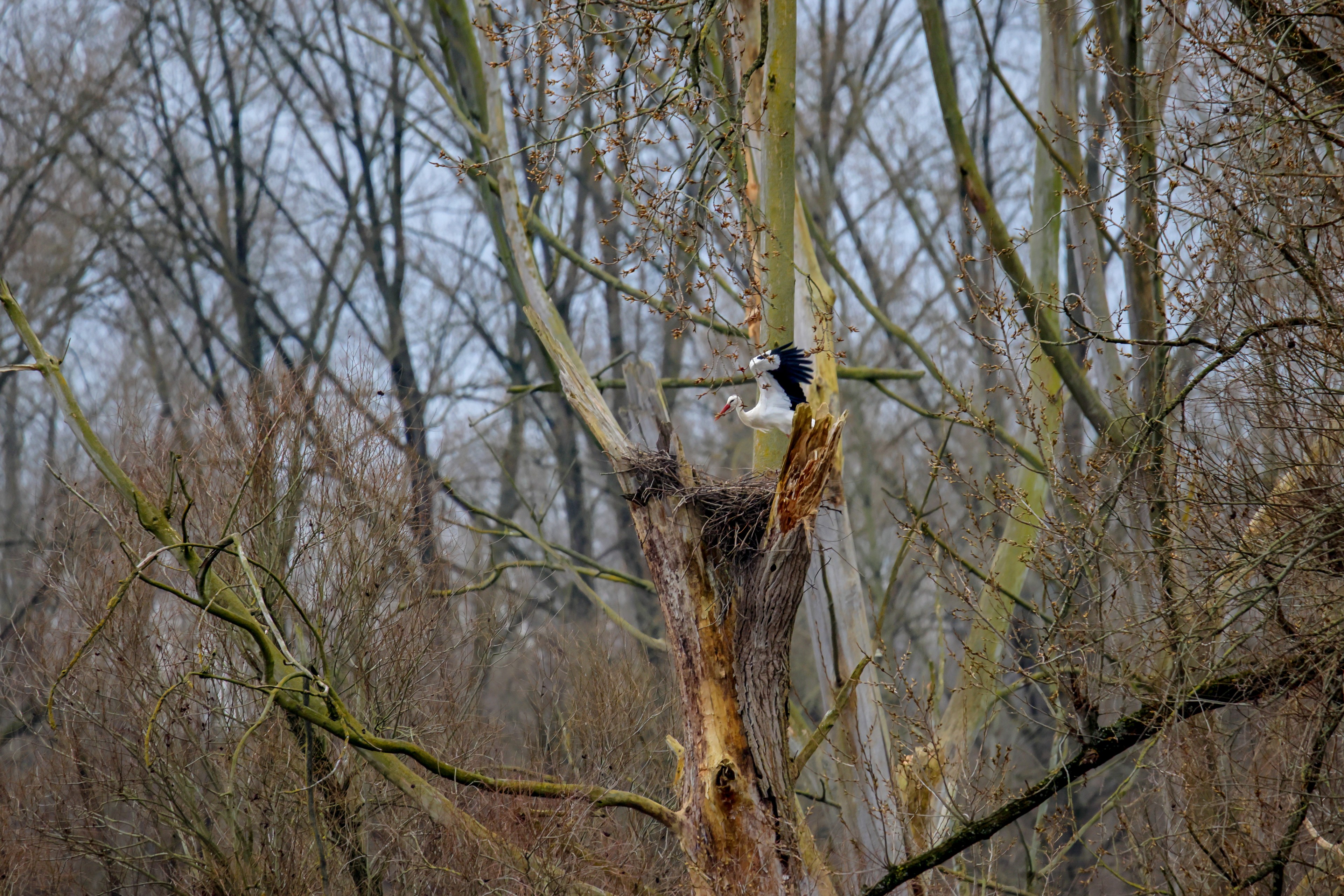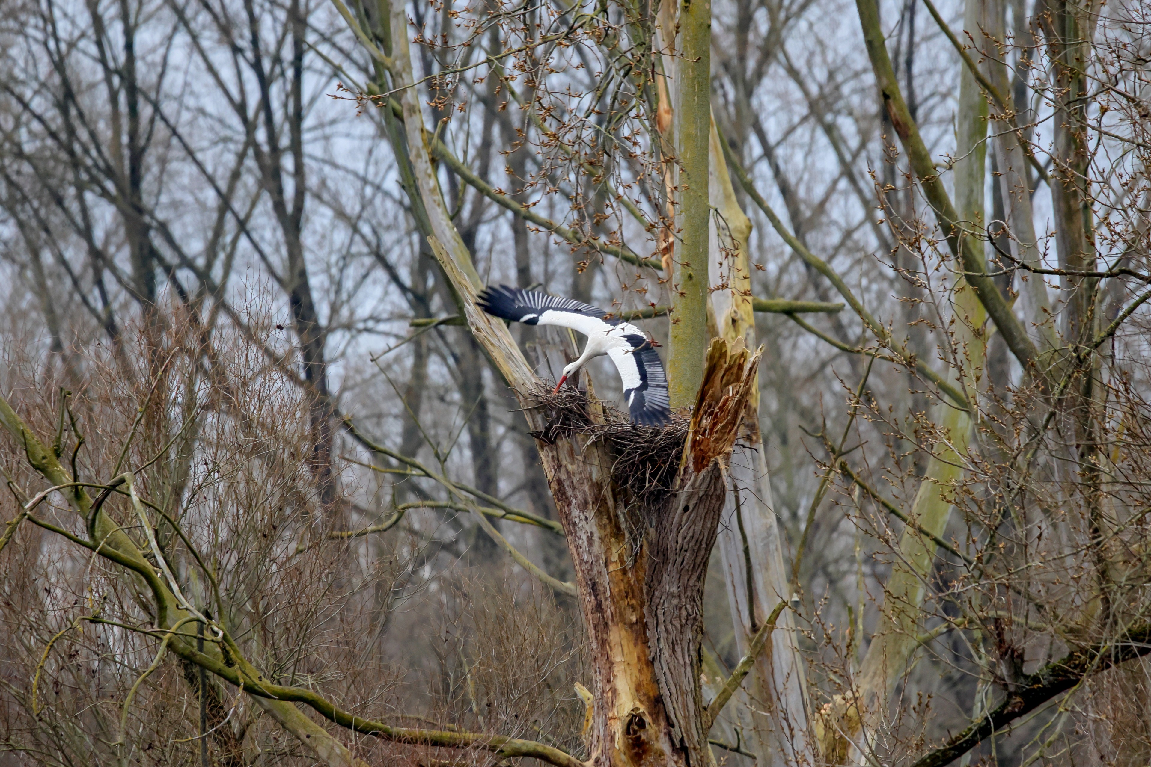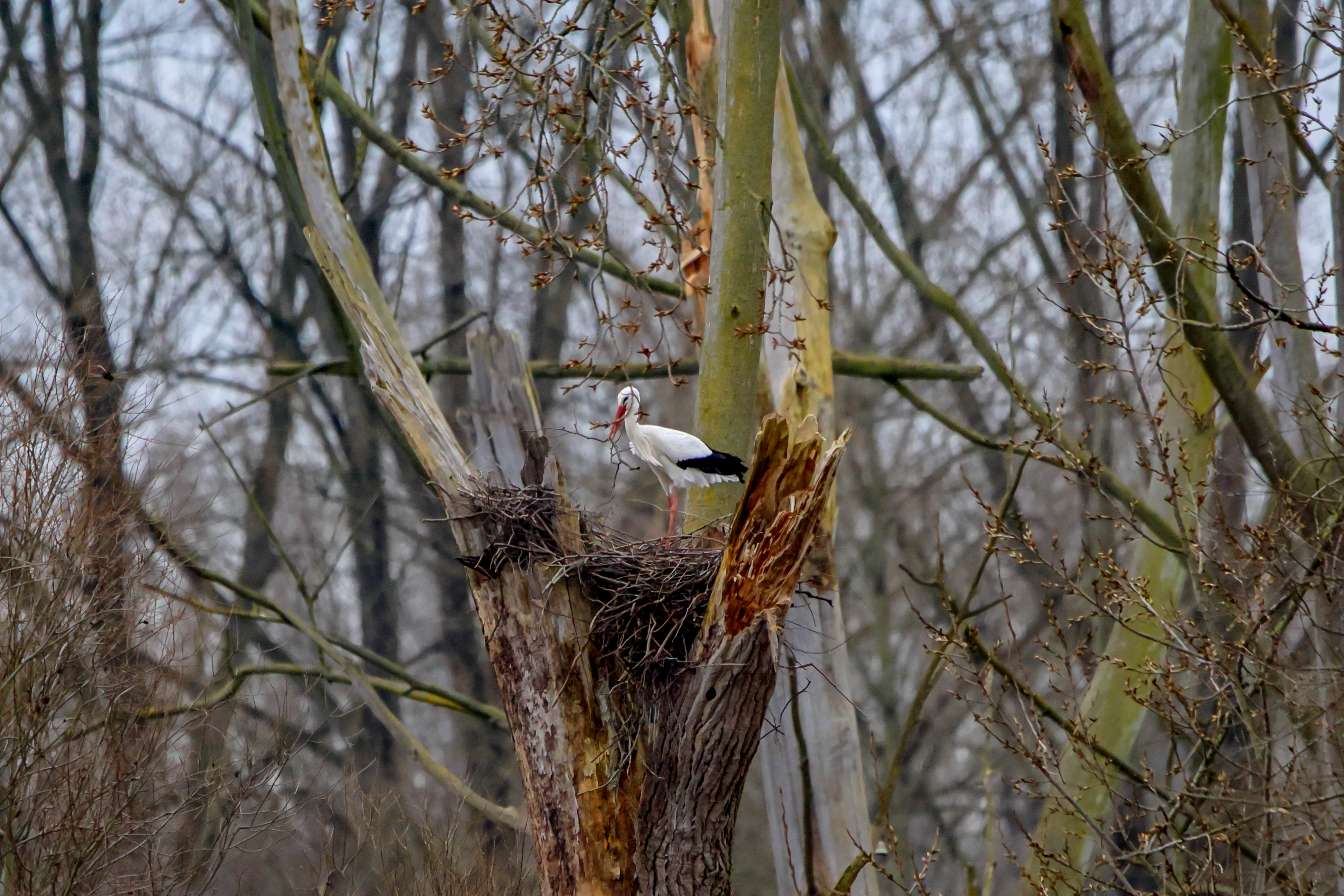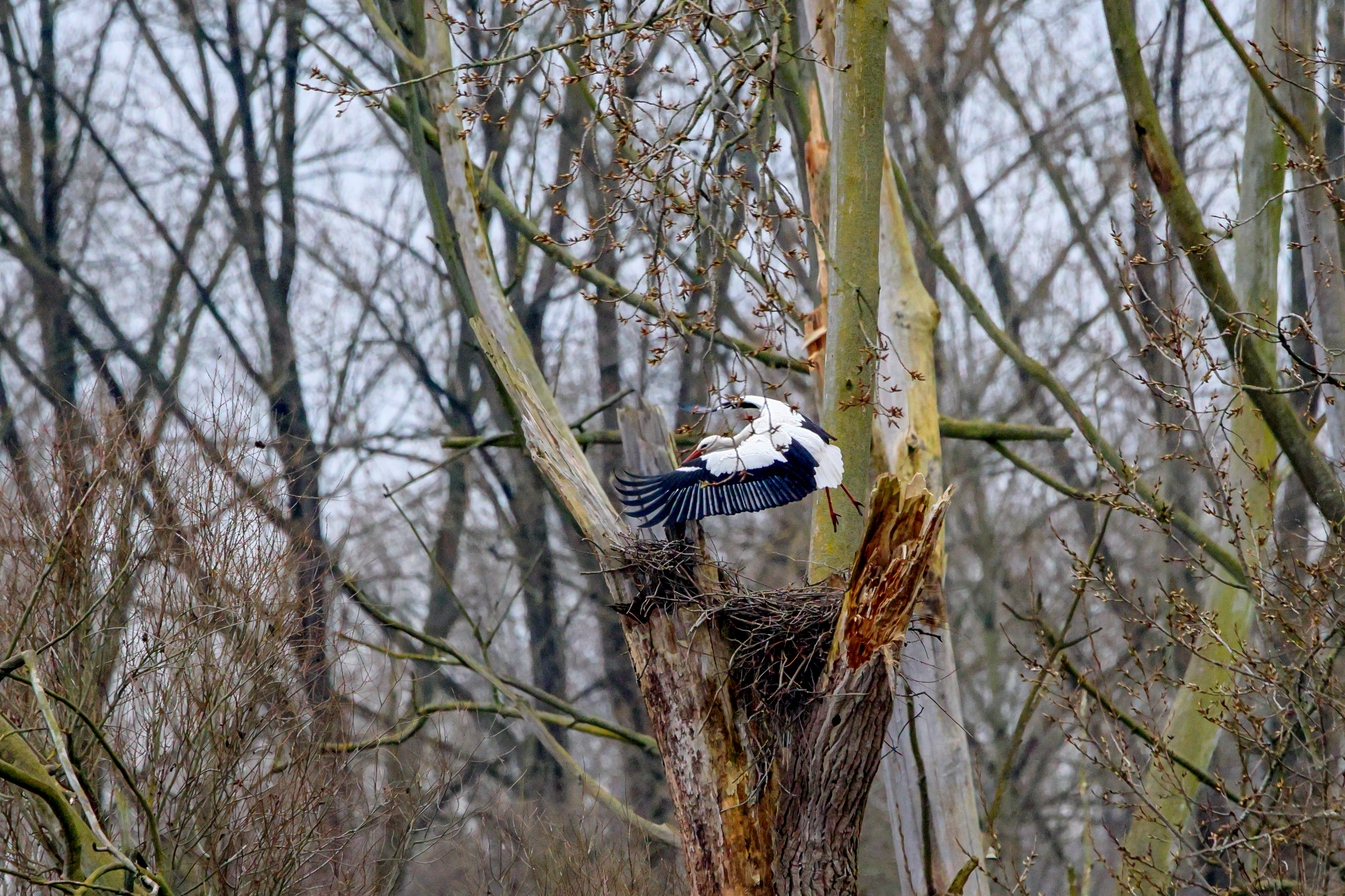 Das Anfang des Winters durch einen Sturm zerstörte Storchenest im Bereich der Beobachtungshütte II muss nun durch das Storchenmännchen eine Etage tiefer, in den Überresten des abgebrochenen Baumes, wieder aufgebaut werden. Sein etwas später eintreffendes Storchenweibchen wird seine Fleißarbeit mit goßer Zuneigung belohnen.