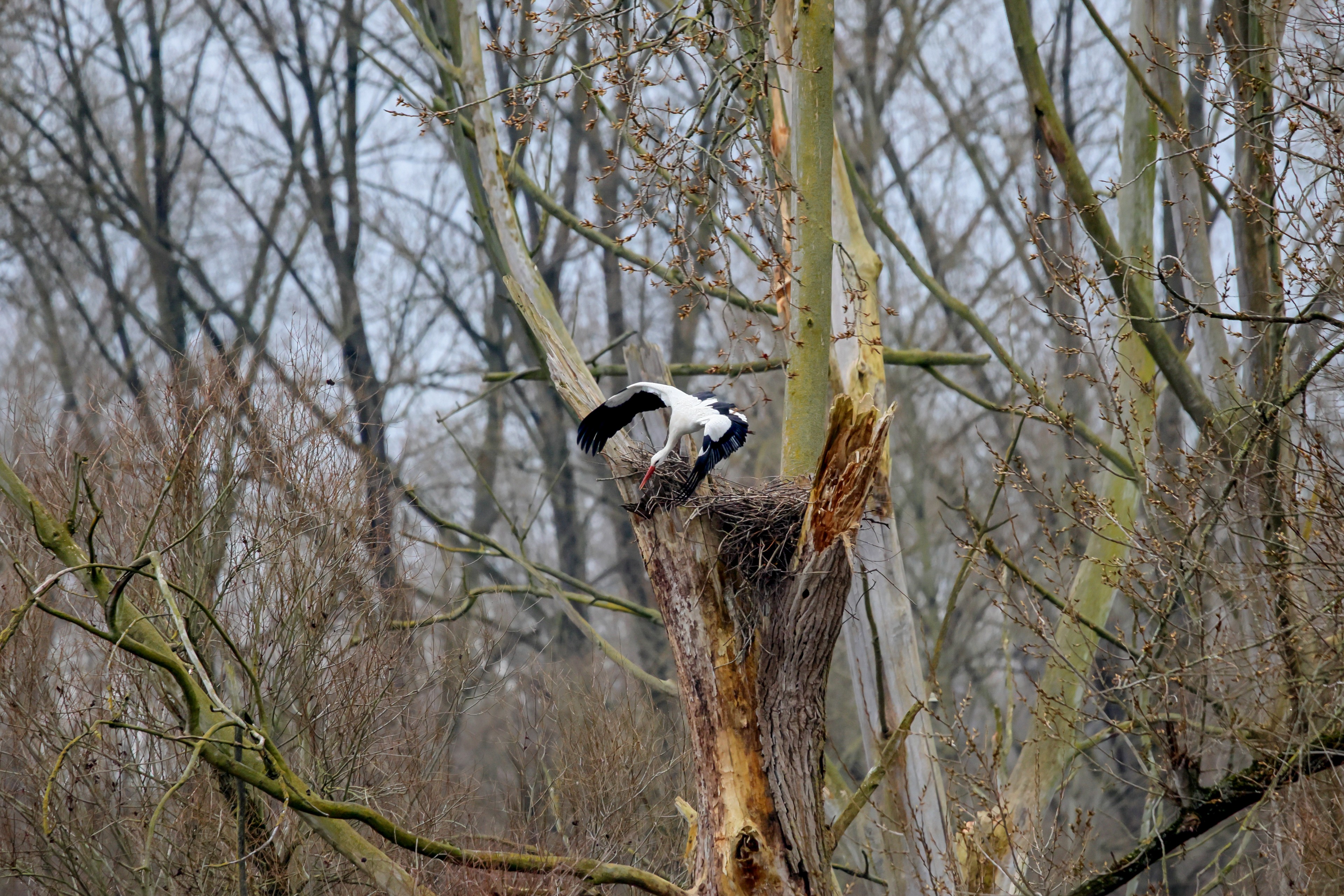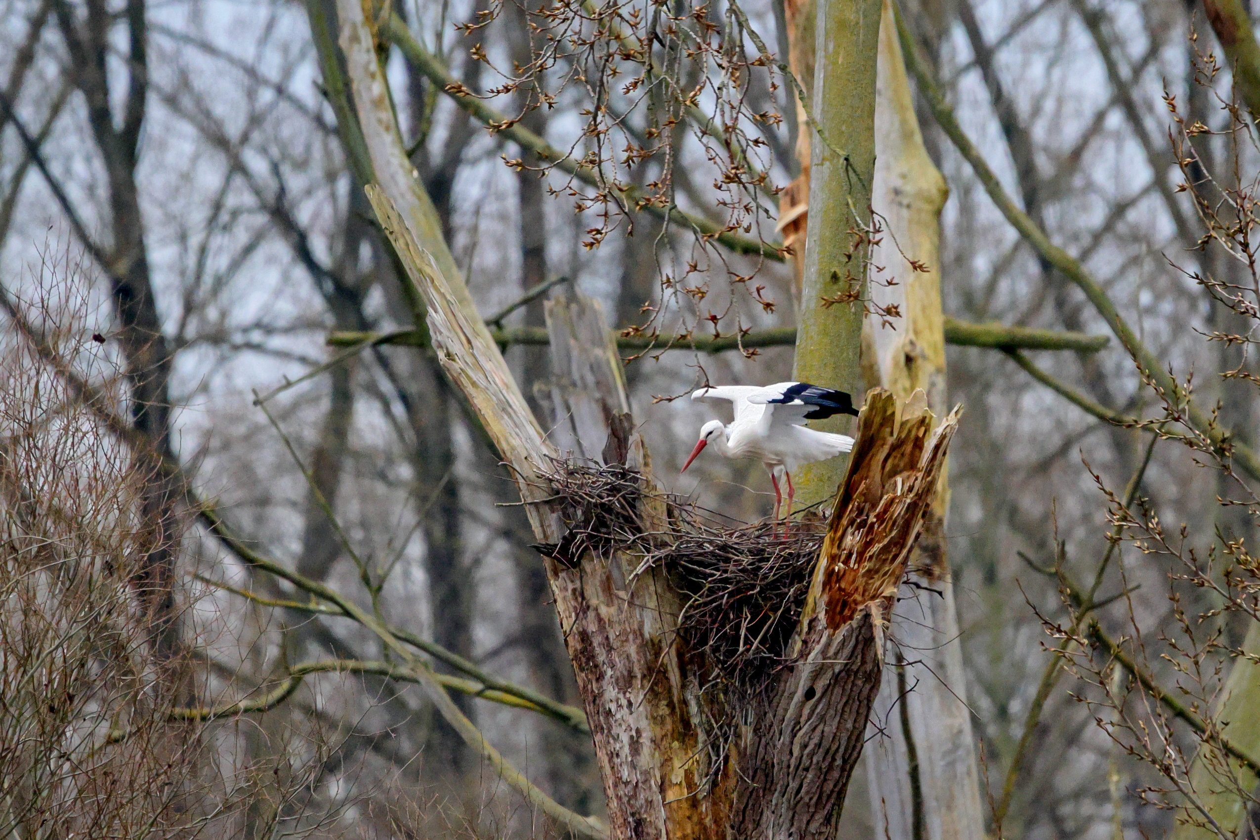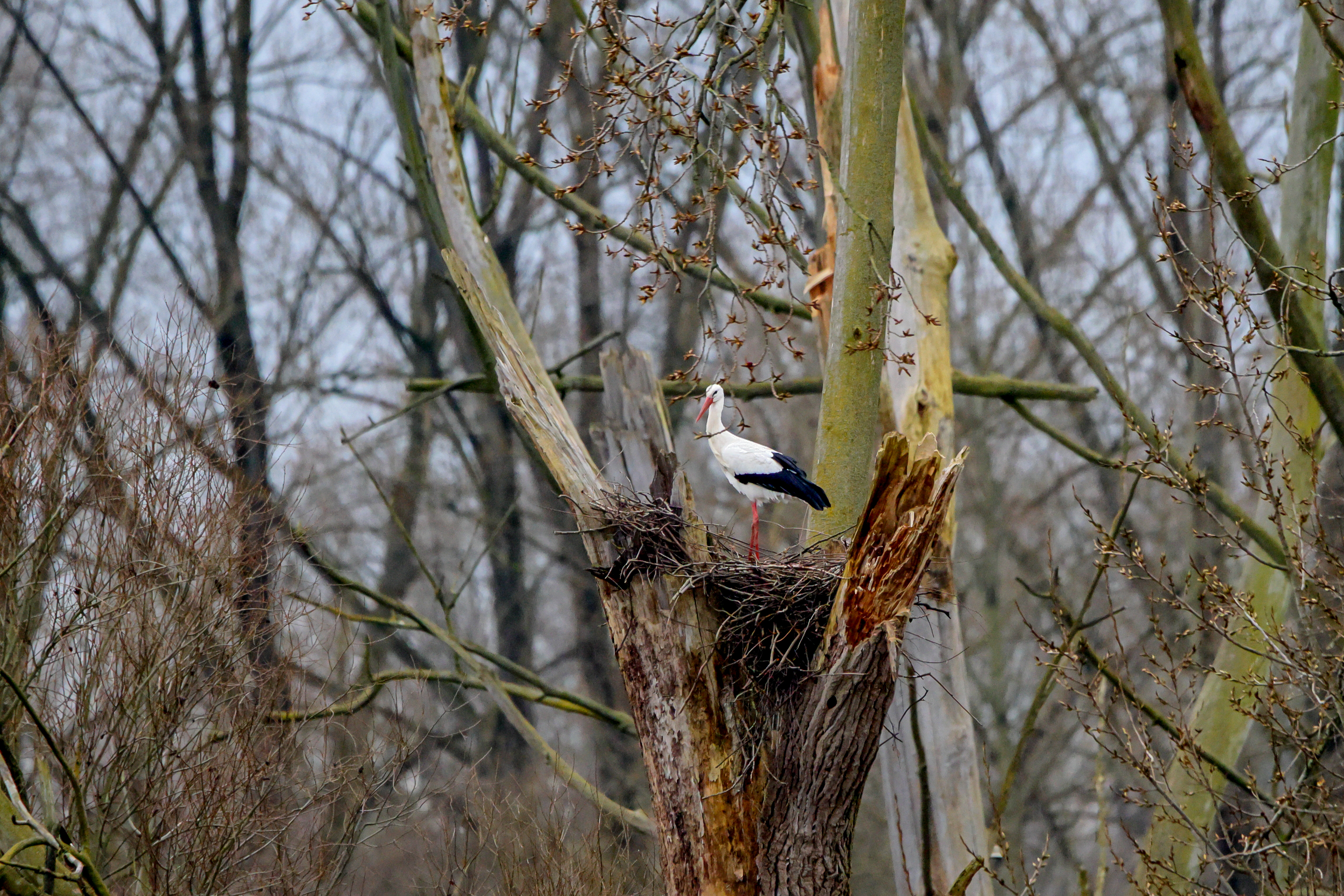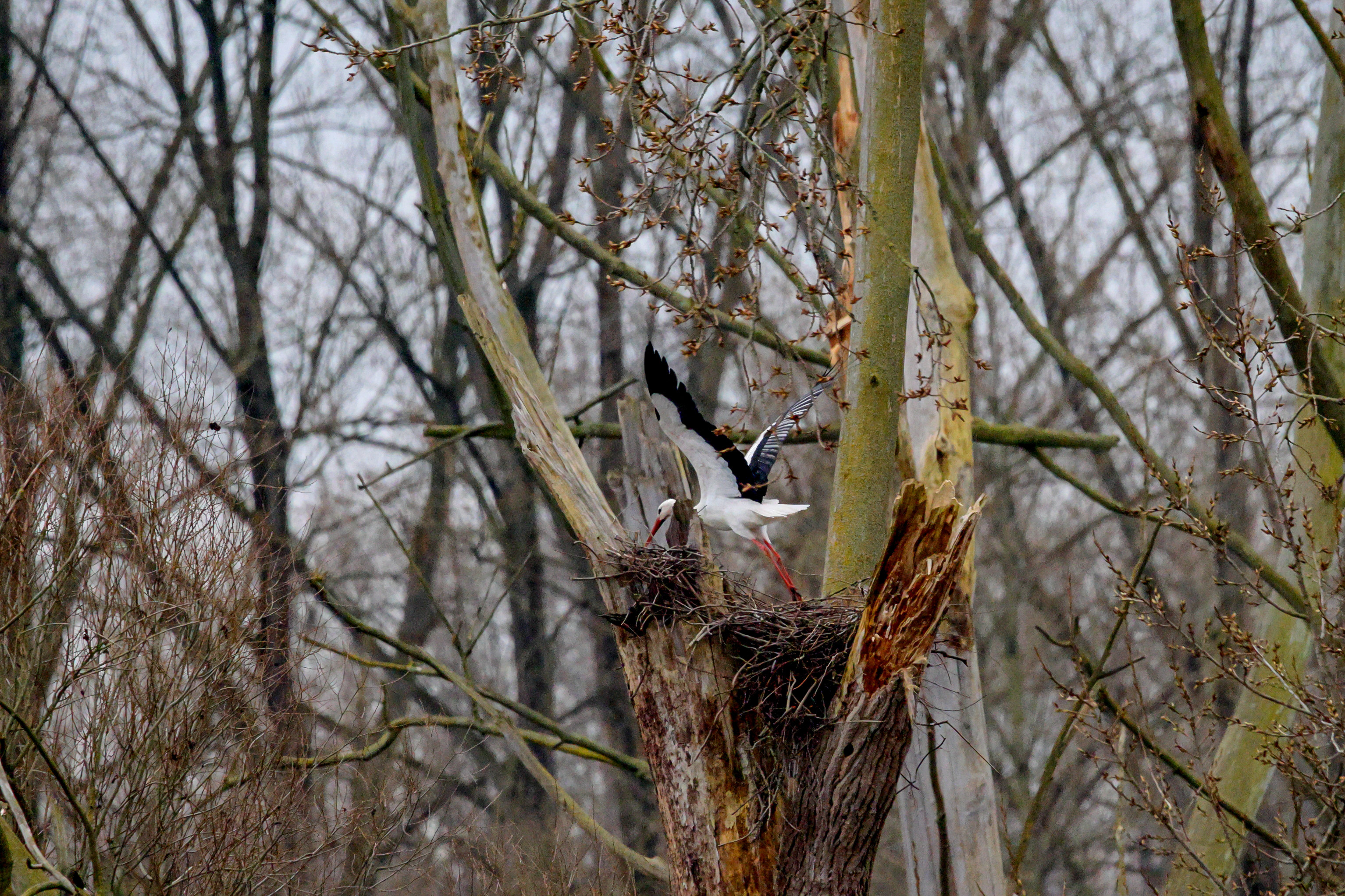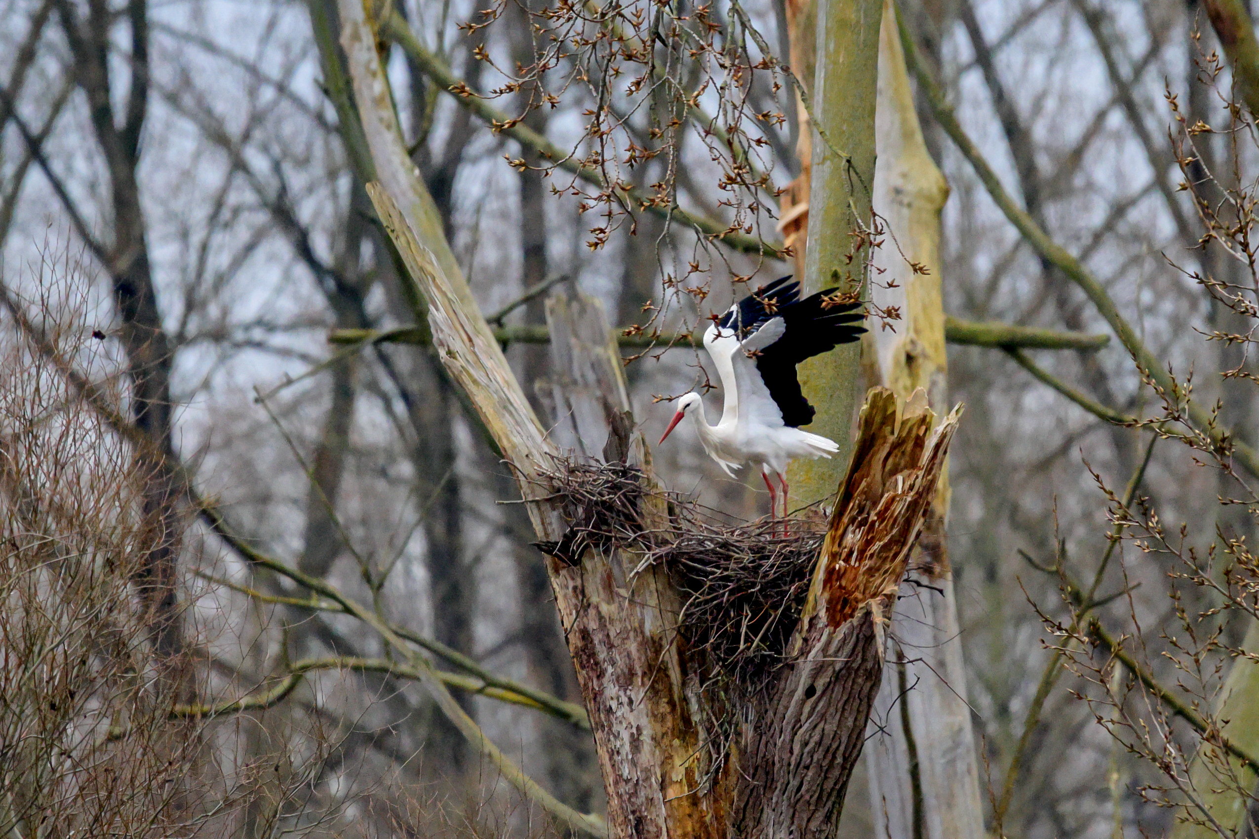 Das Anfang des Winters durch einen Sturm zerstörte Storchenest im Bereich der Beobachtungshütte II muss nun durch das Storchenmännchen eine Etage tiefer, in den Überresten des abgebrochenen Baumes, wieder aufgebaut werden. Sein etwas später eintreffendes Storchenweibchen wird seine Fleißarbeit mit goßer Zuneigung belohnen.