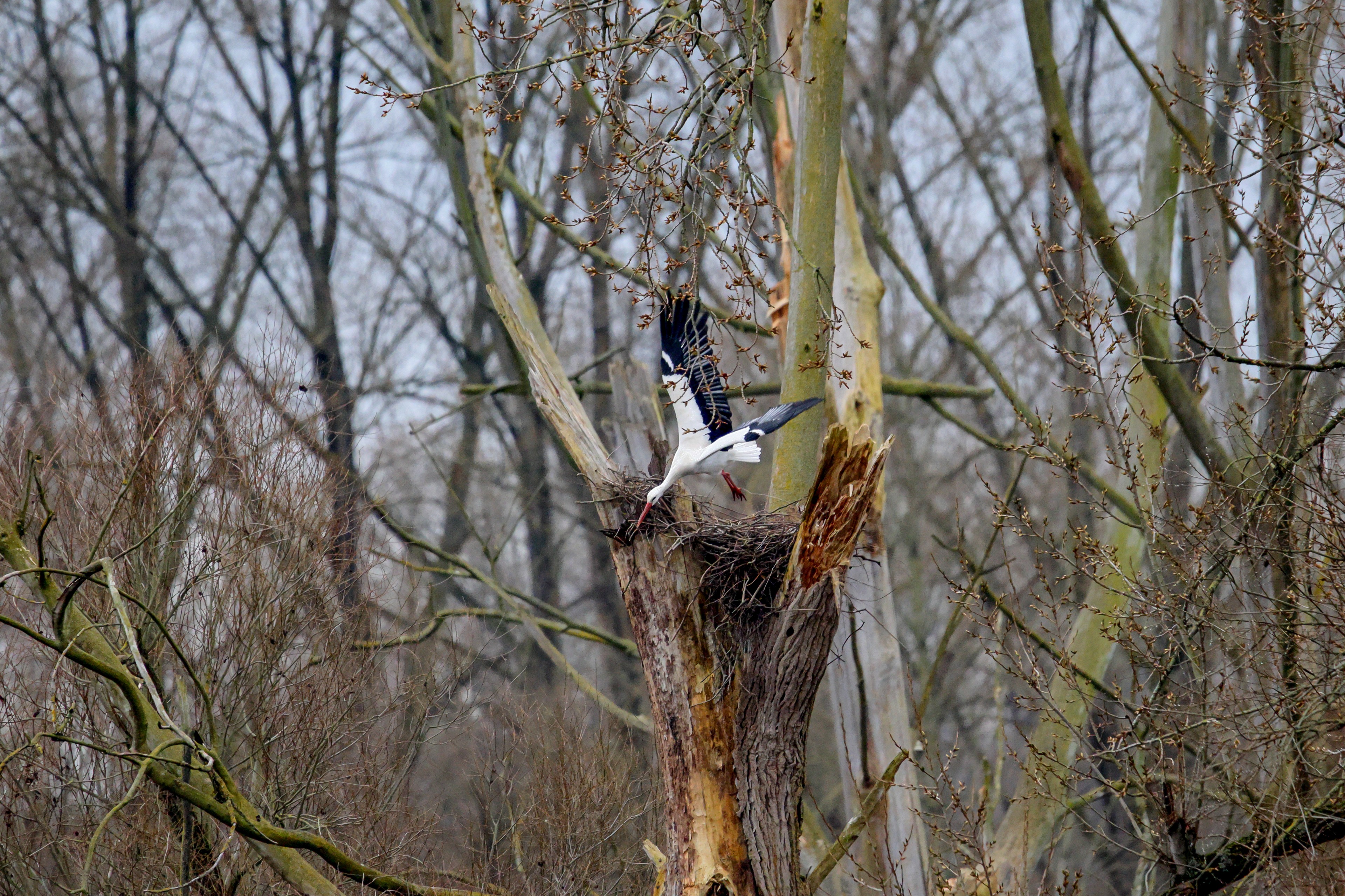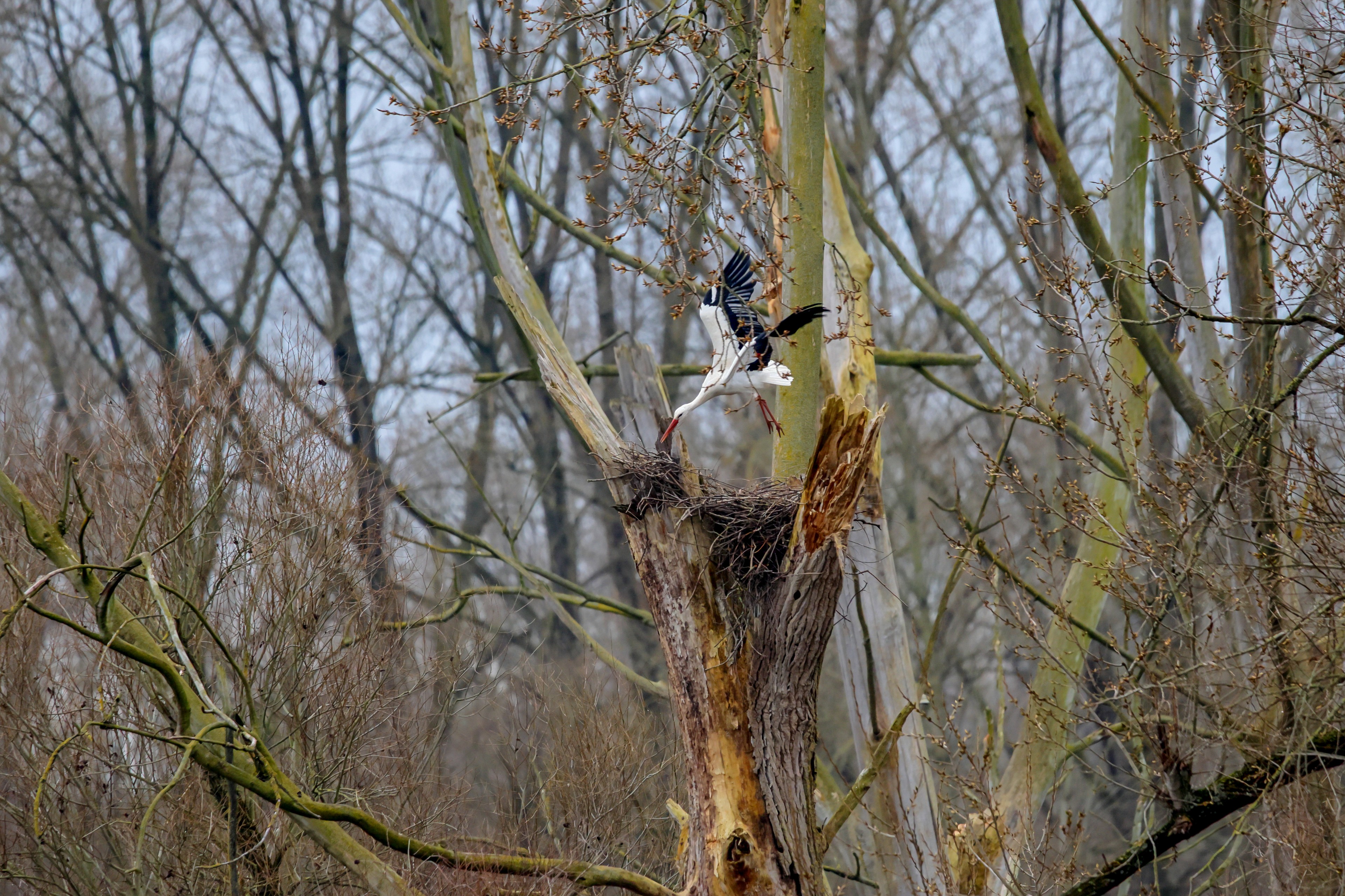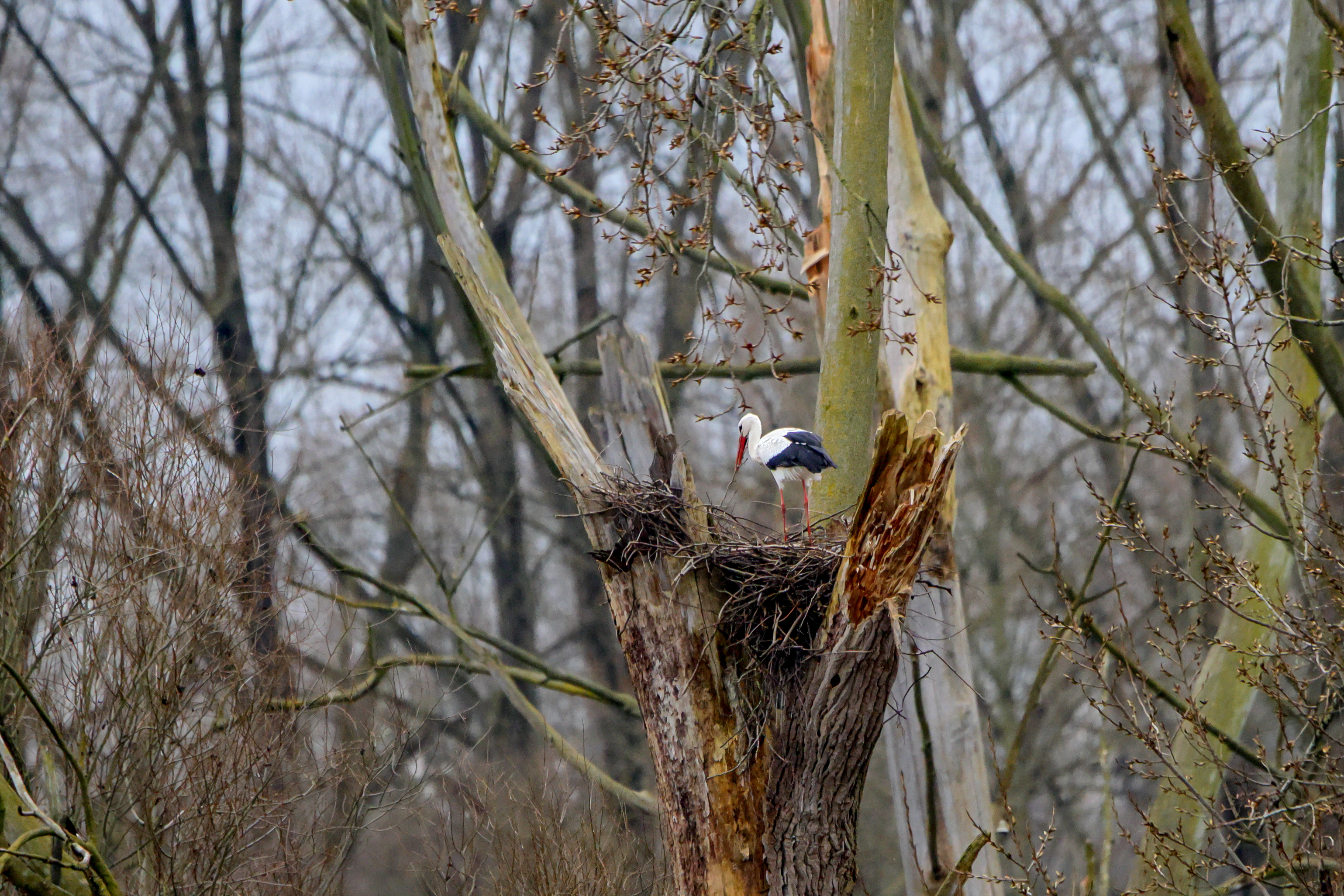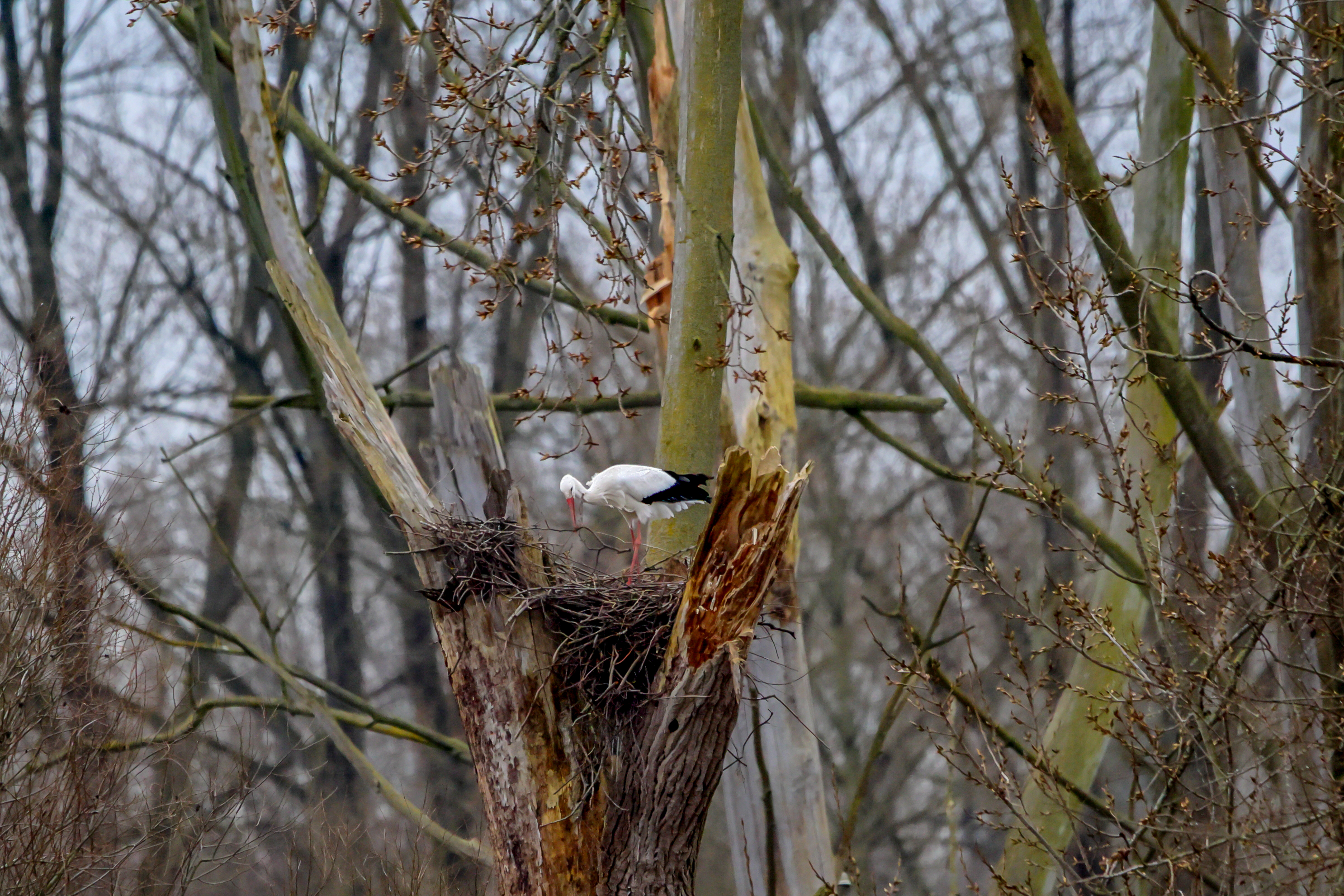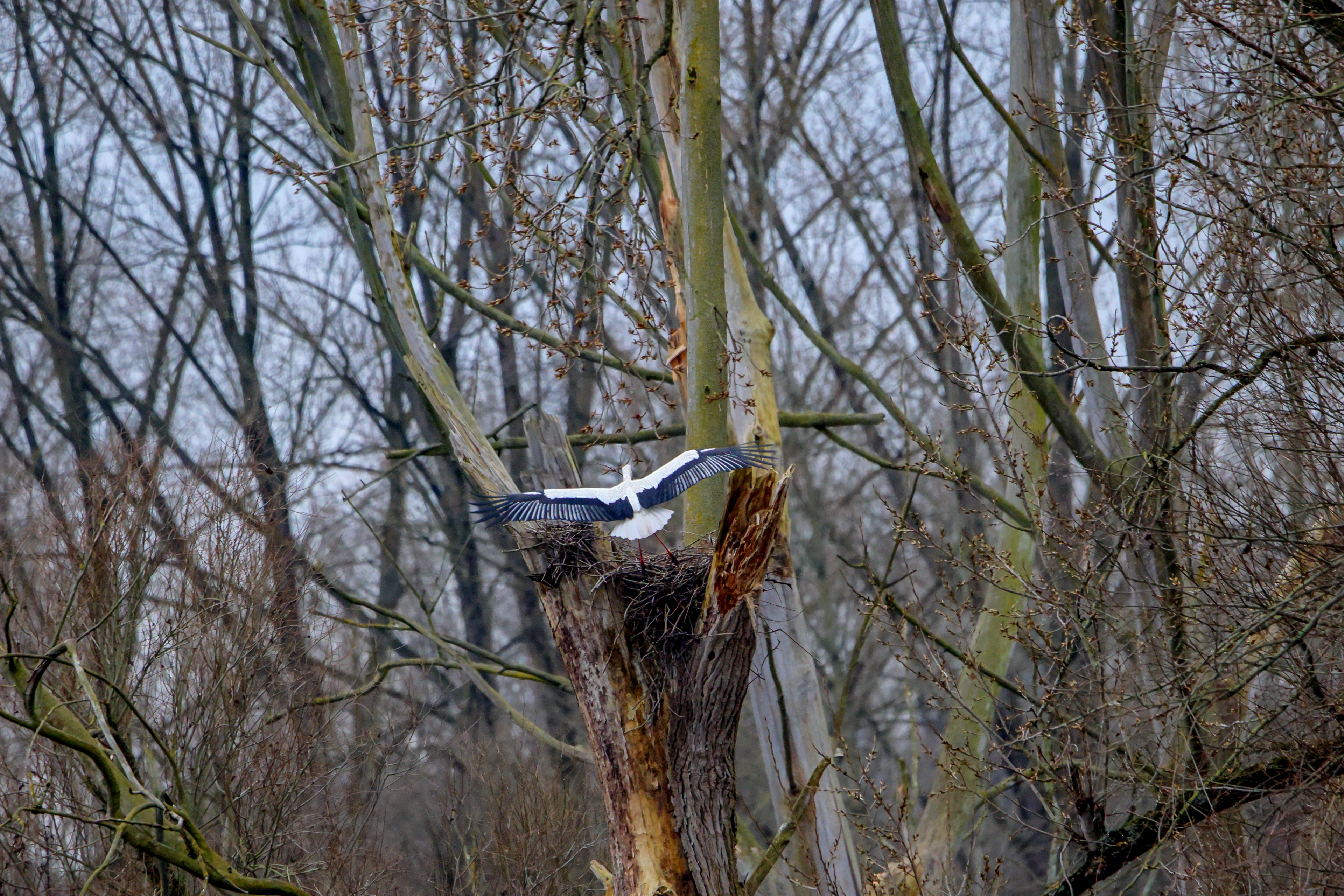 Das Anfang des Winters durch einen Sturm zerstörte Storchenest im Bereich der Beobachtungshütte II muss nun durch das Storchenmännchen eine Etage tiefer, in den Überresten des abgebrochenen Baumes, wieder aufgebaut werden. Sein etwas später eintreffendes Storchenweibchen wird seine Fleißarbeit mit goßer Zuneigung belohnen.