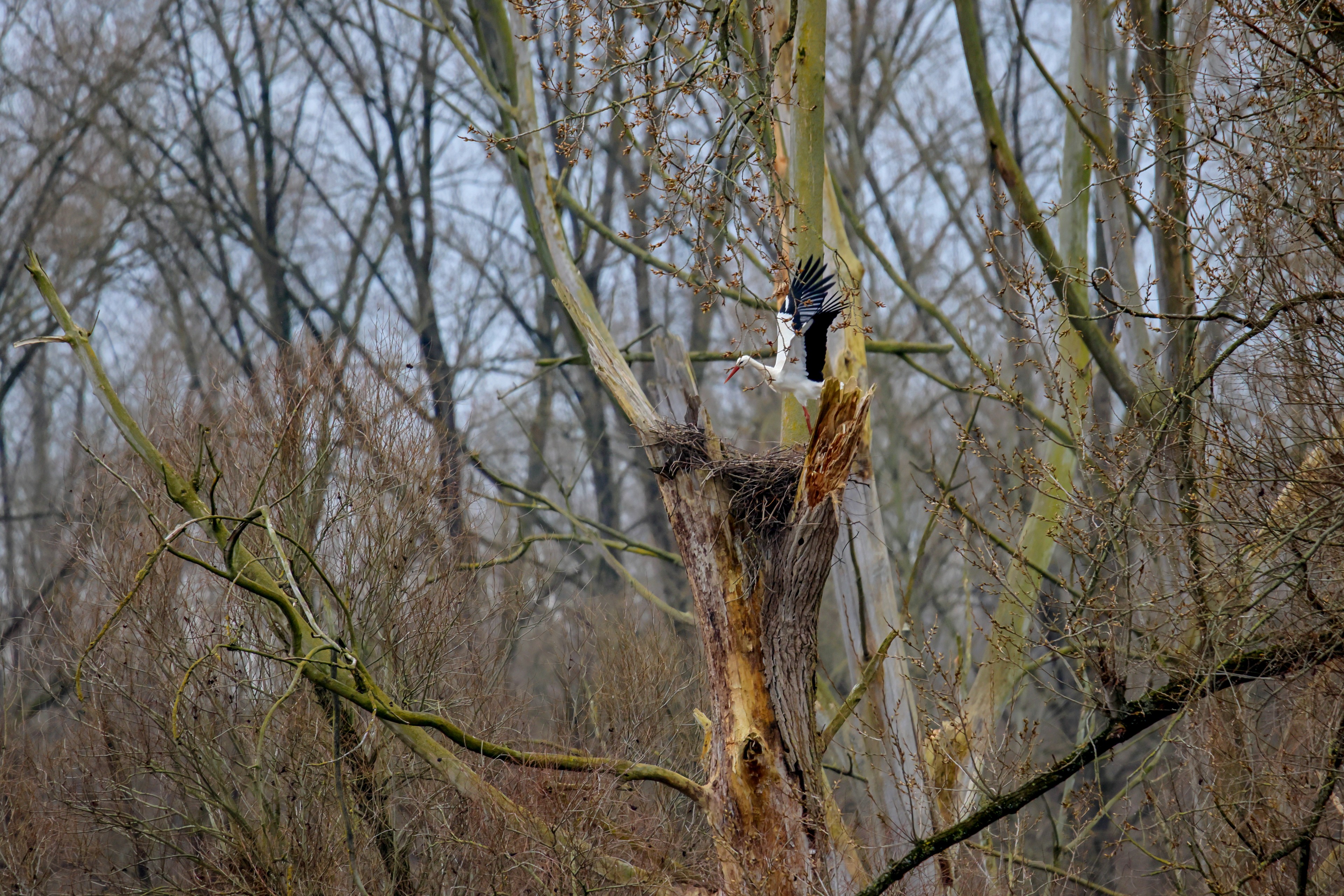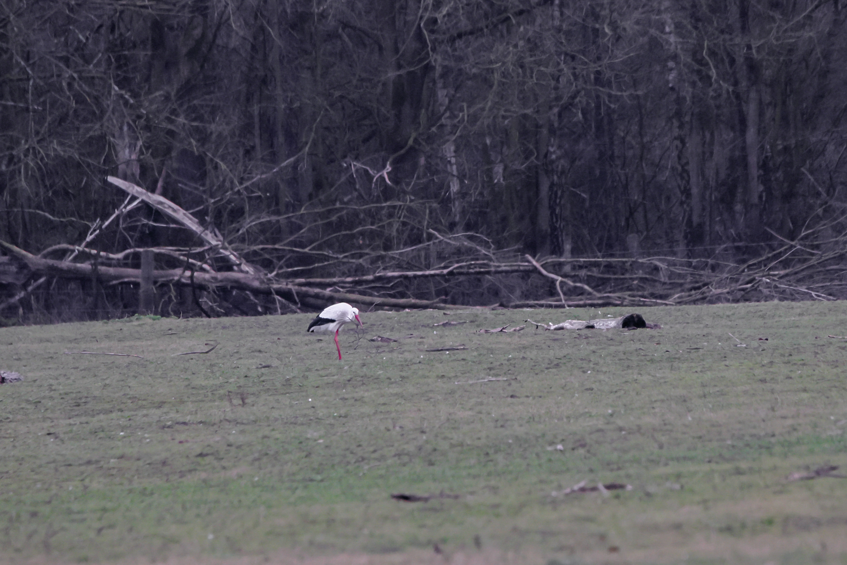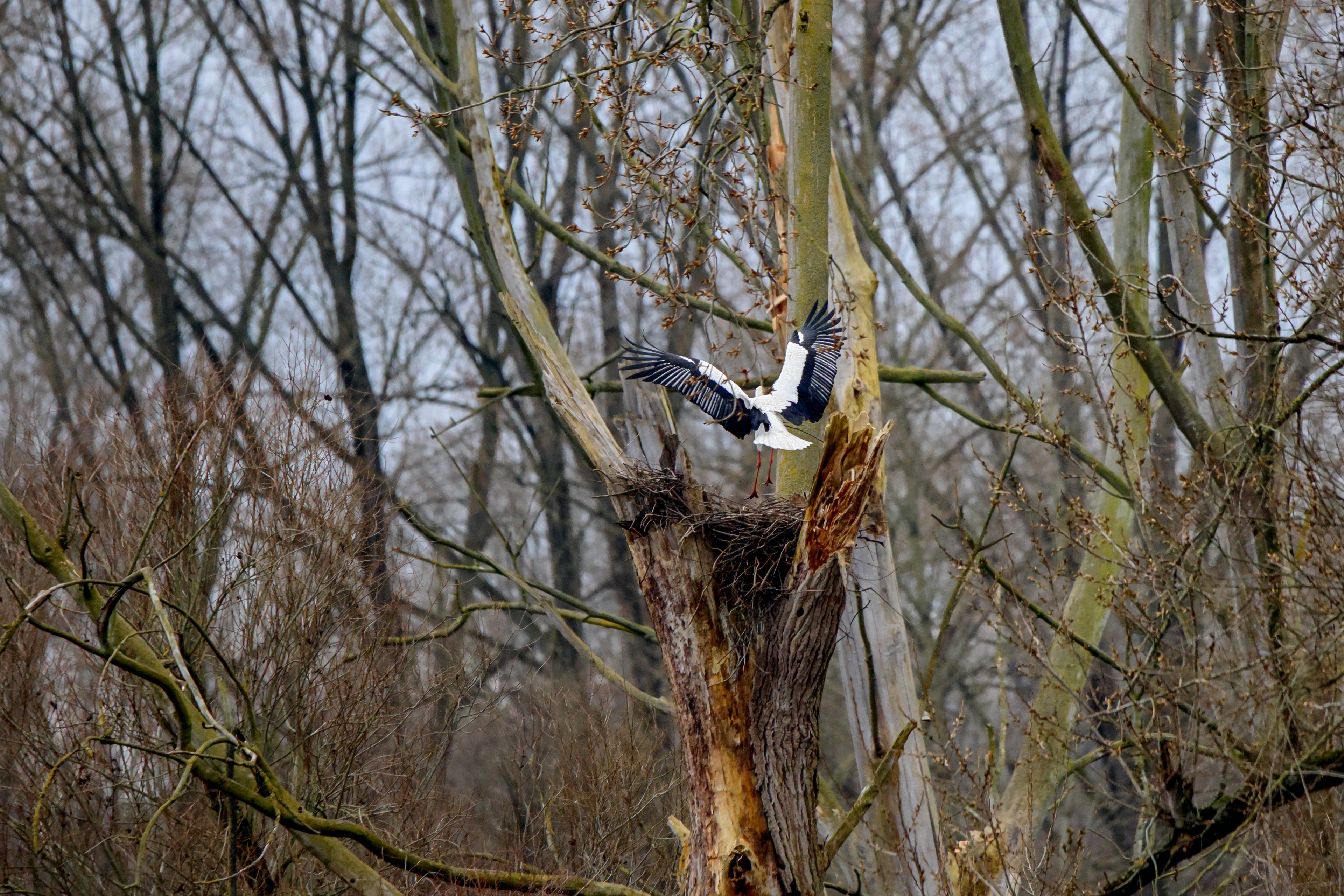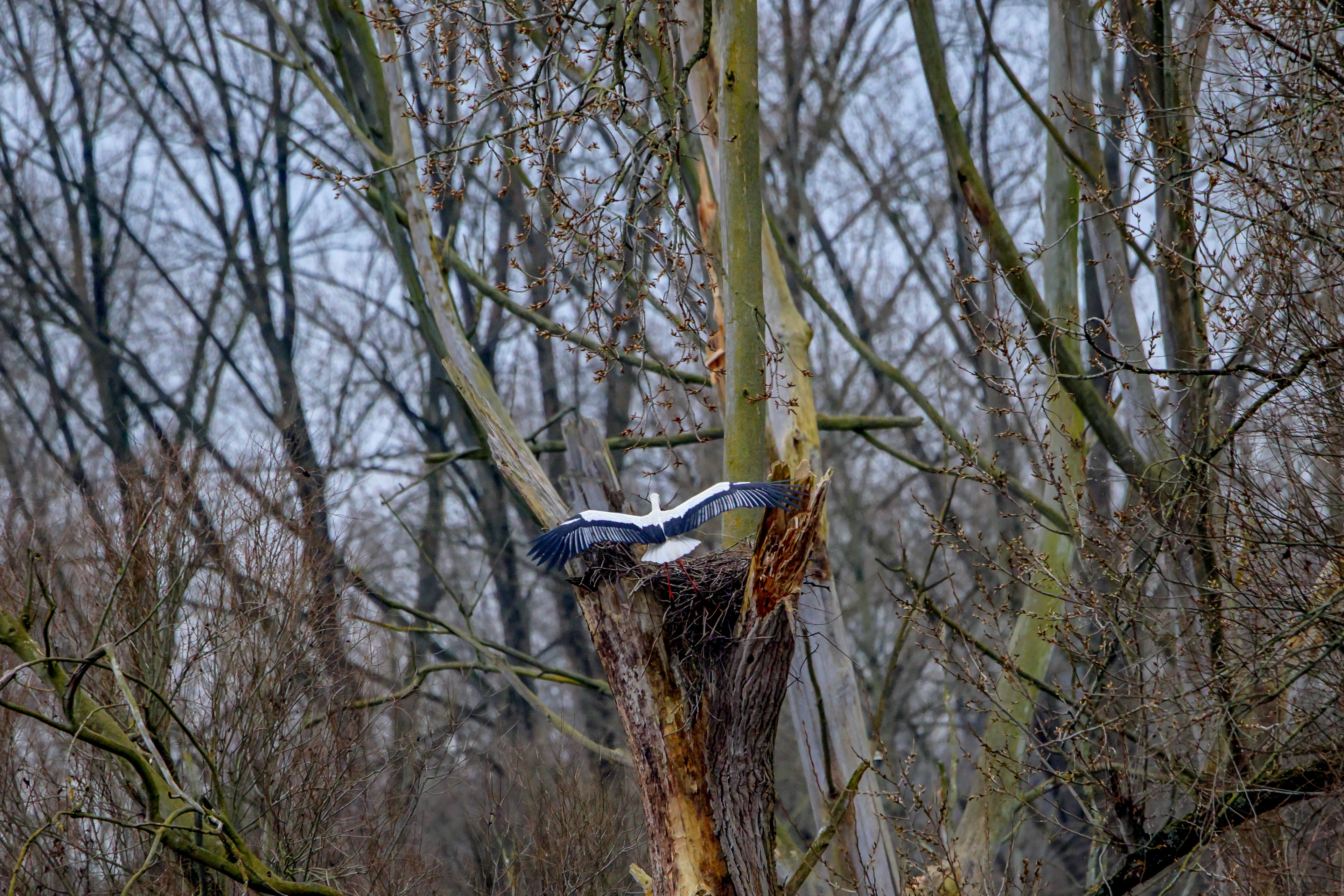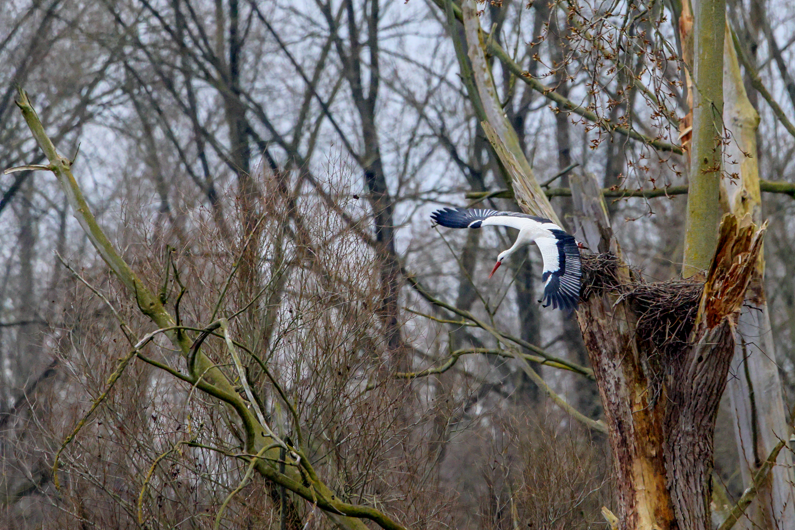 Das Anfang des Winters durch einen Sturm zerstörte Storchenest im Bereich der Beobachtungshütte II muss nun durch das Storchenmännchen eine Etage tiefer, in den Überresten des abgebrochenen Baumes, wieder aufgebaut werden. Sein etwas später eintreffendes Storchenweibchen wird seine Fleißarbeit mit goßer Zuneigung belohnen.