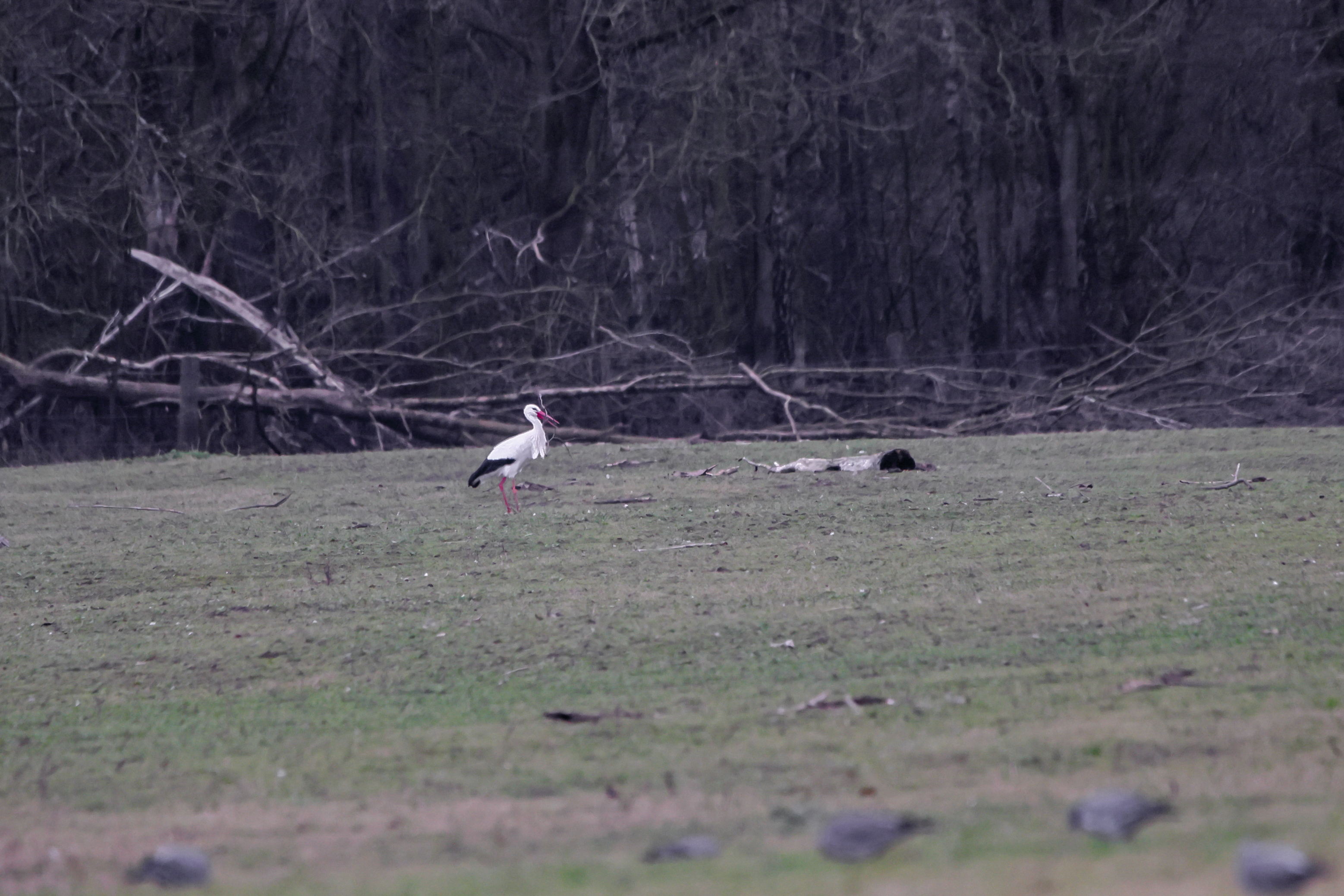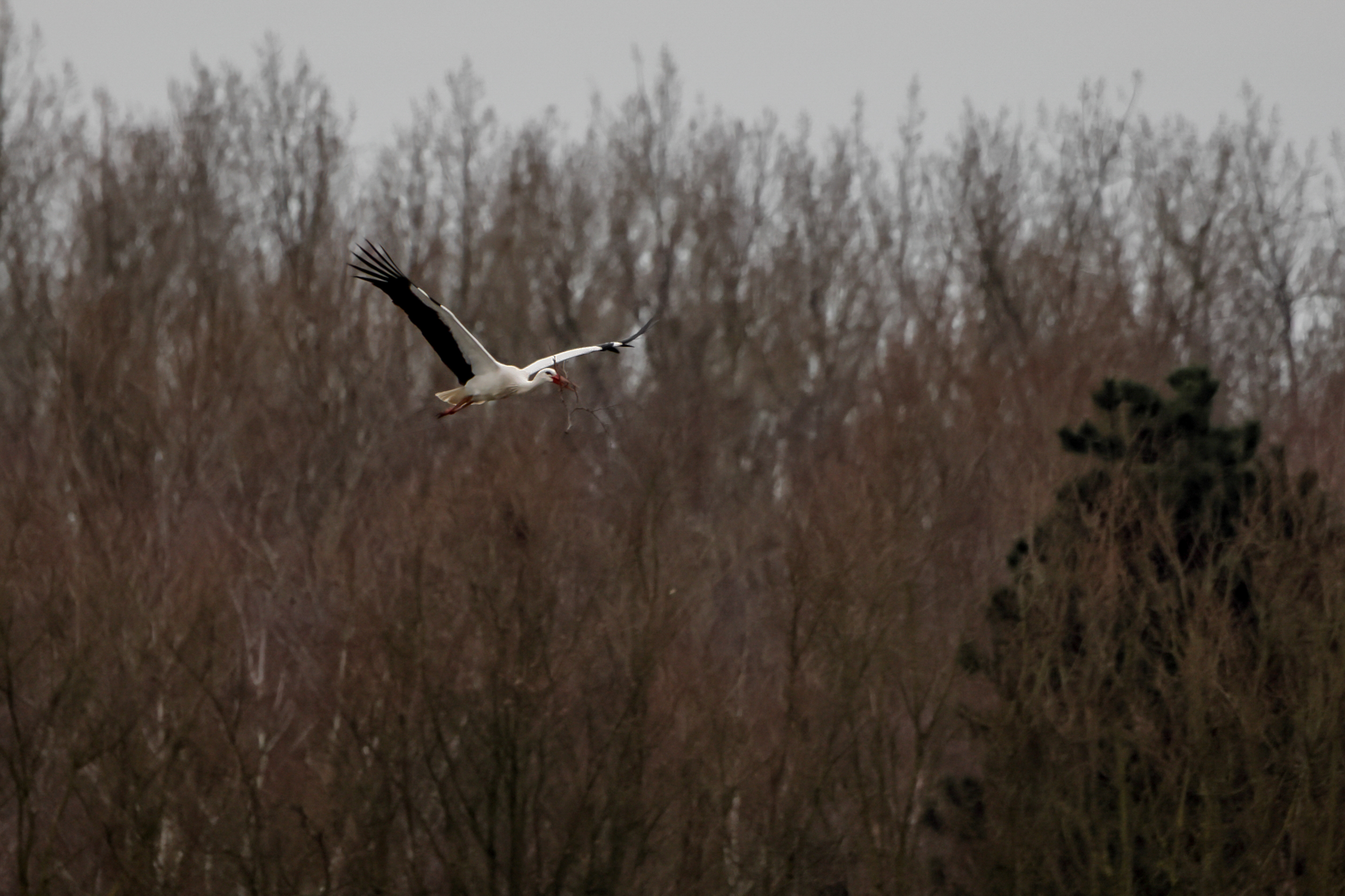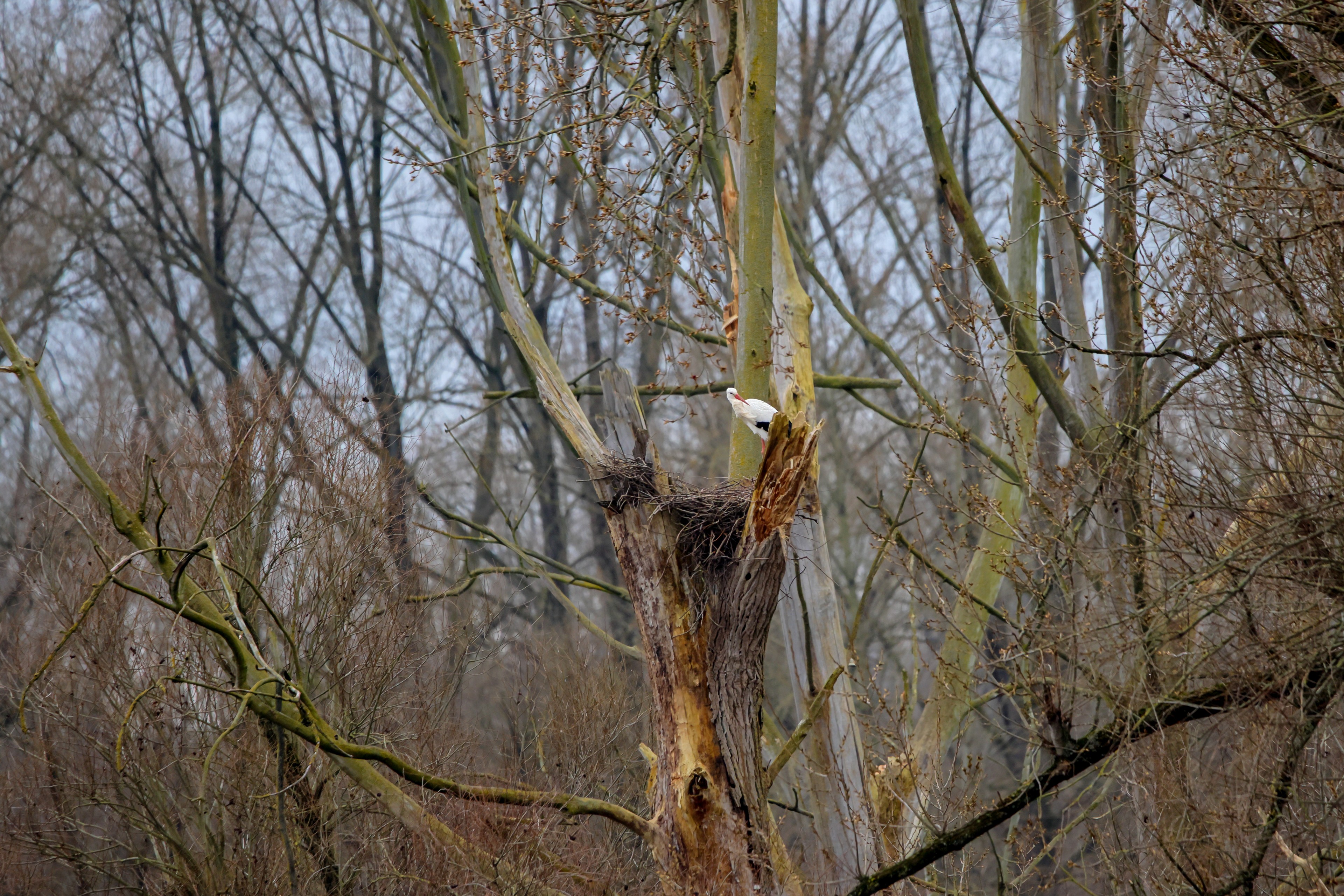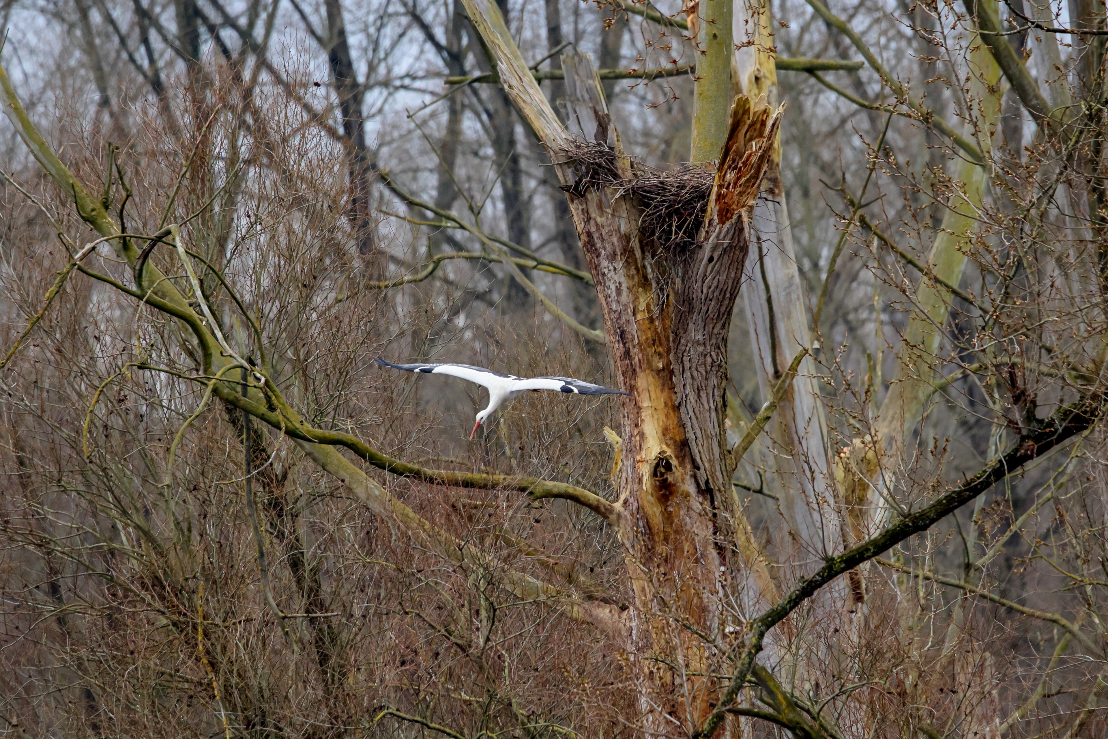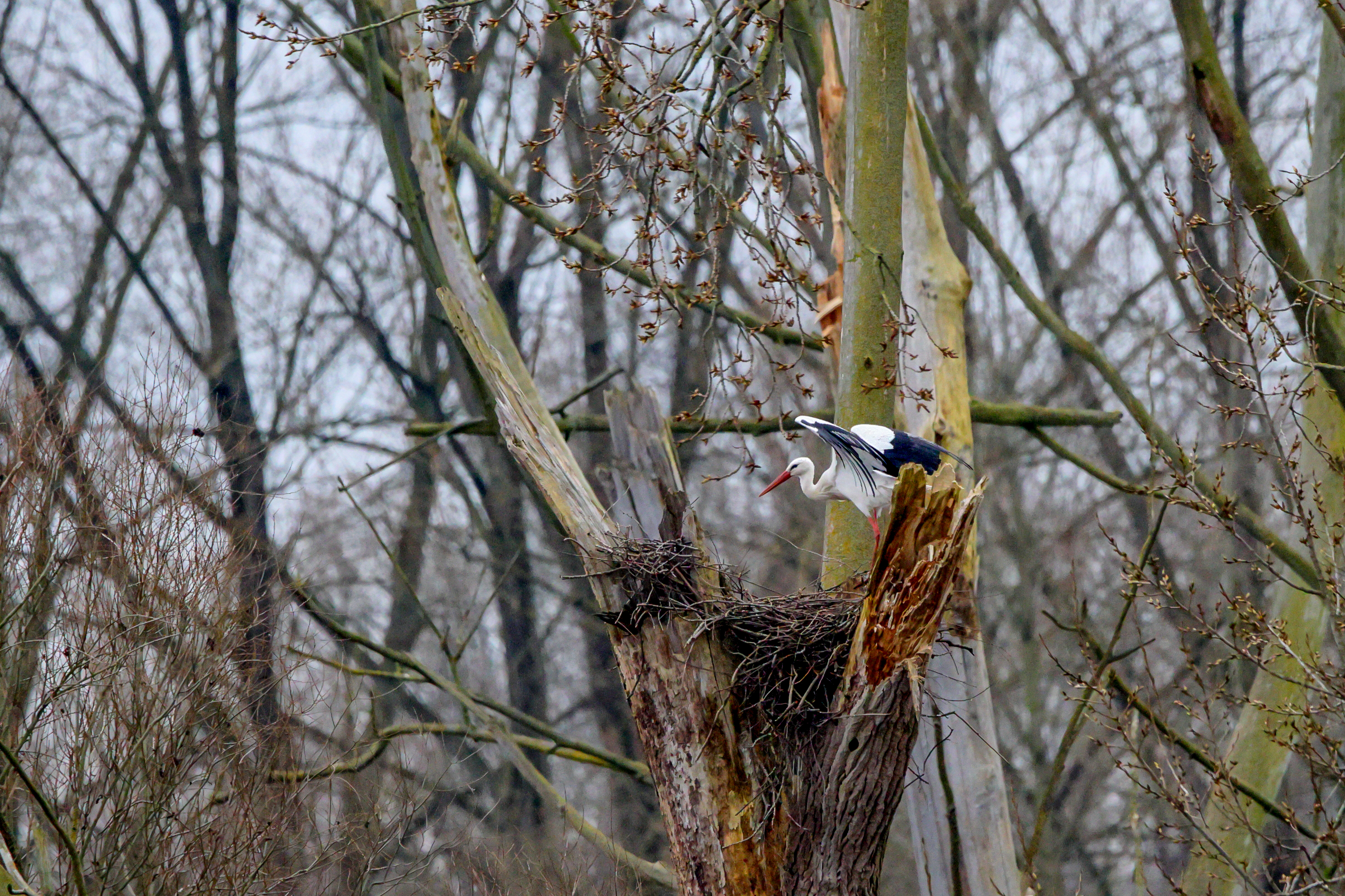 Das Anfang des Winters durch einen Sturm zerstörte Storchenest im Bereich der Beobachtungshütte II muss nun durch das Storchenmännchen eine Etage tiefer, in den Überresten des abgebrochenen Baumes, wieder aufgebaut werden. Sein etwas später eintreffendes Storchenweibchen wird seine Fleißarbeit mit goßer Zuneigung belohnen.