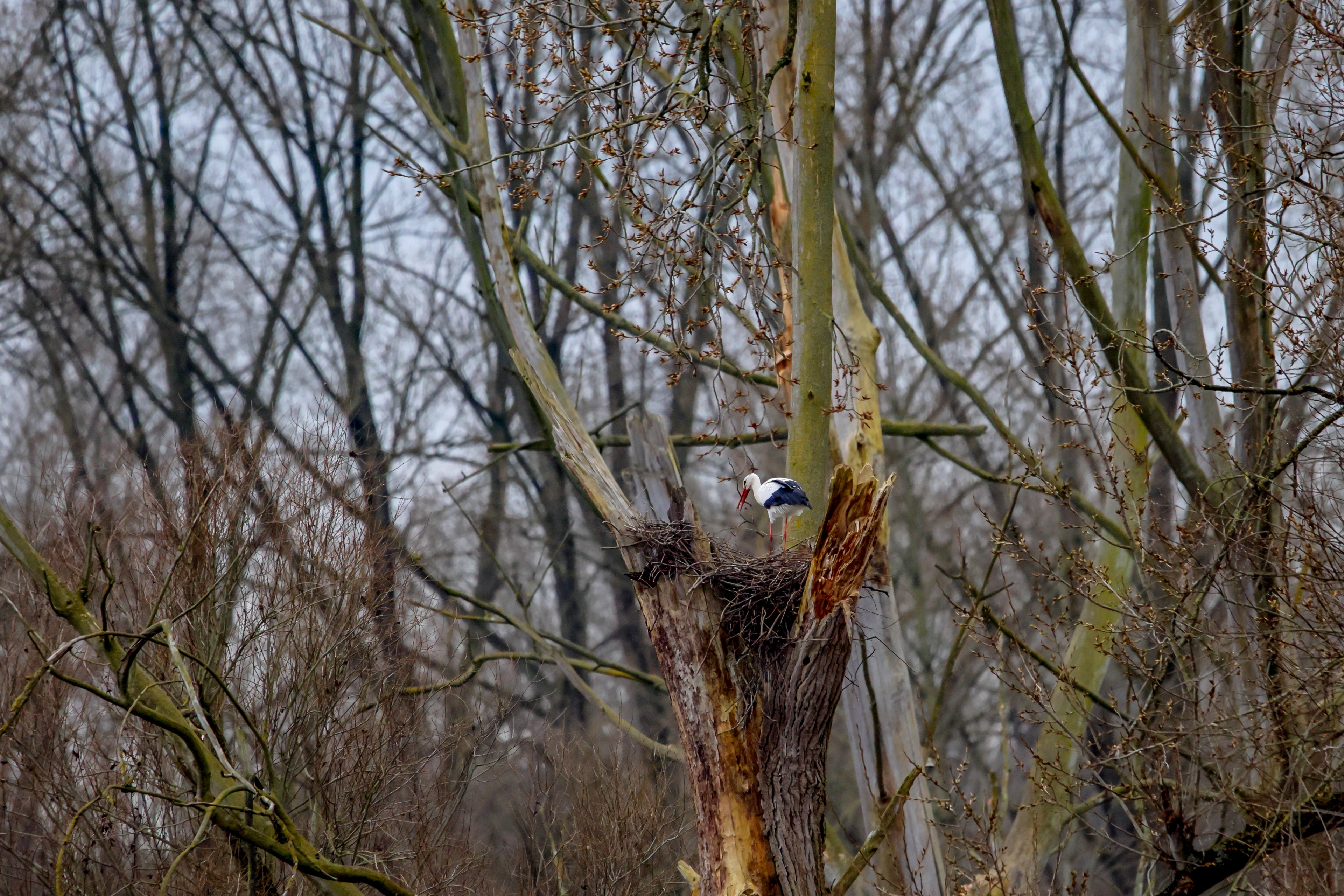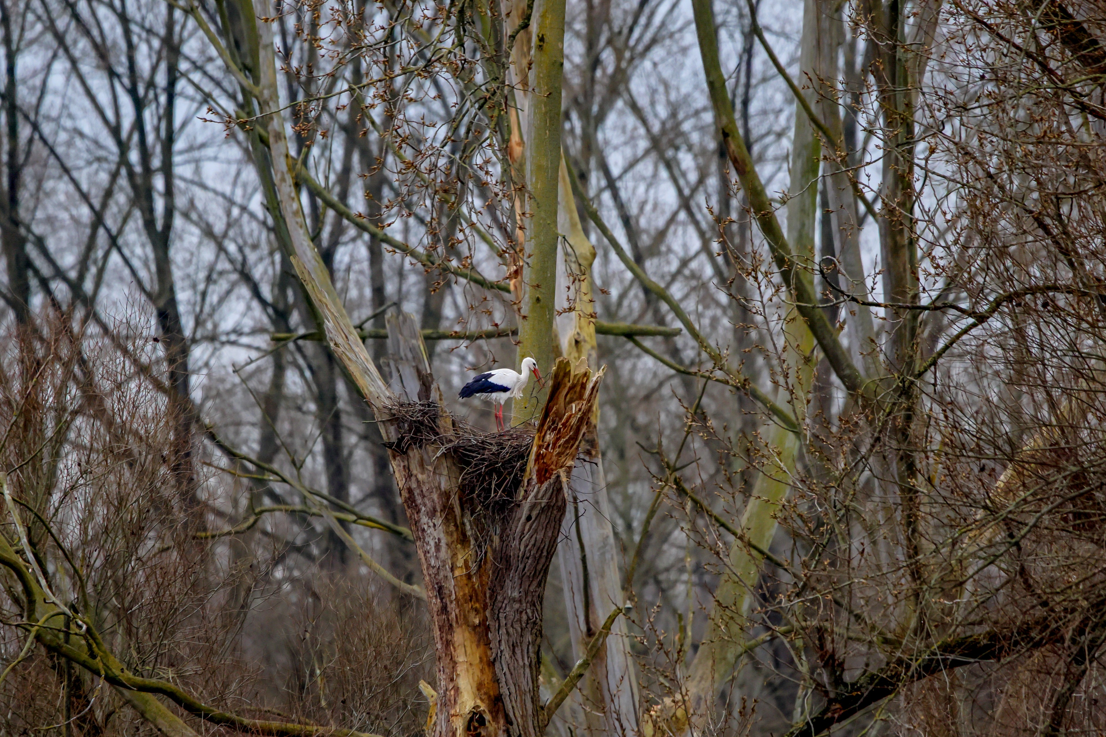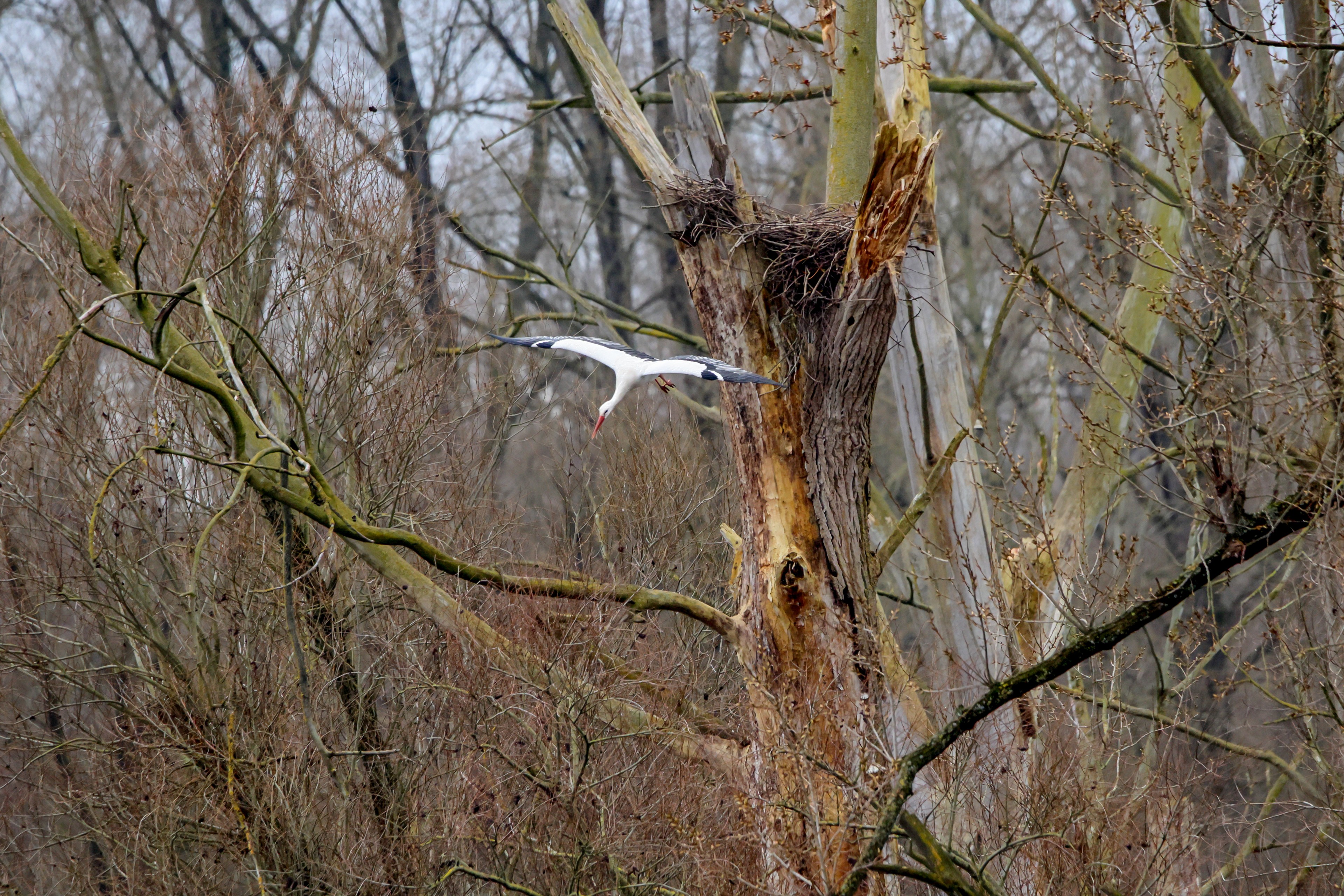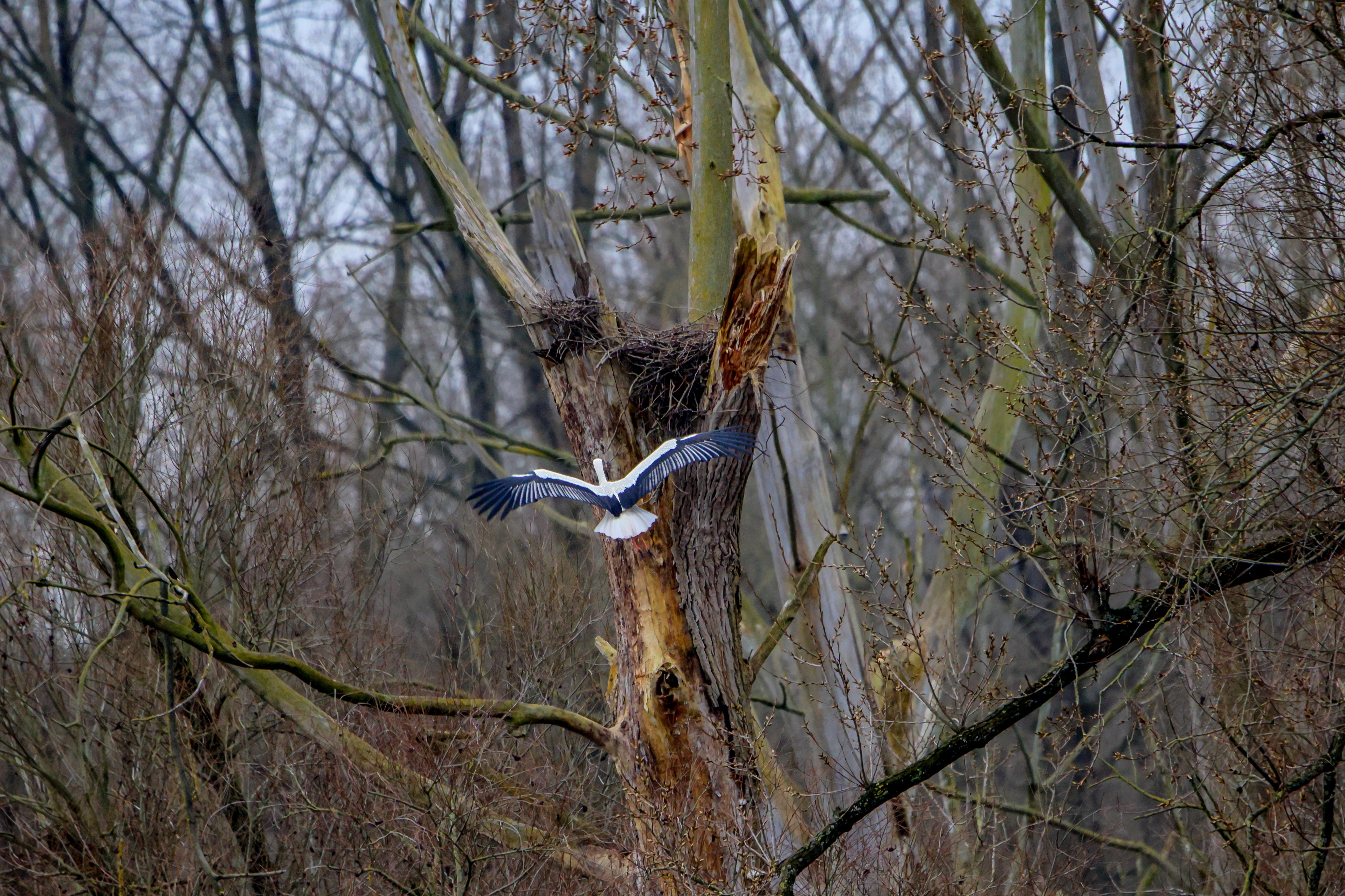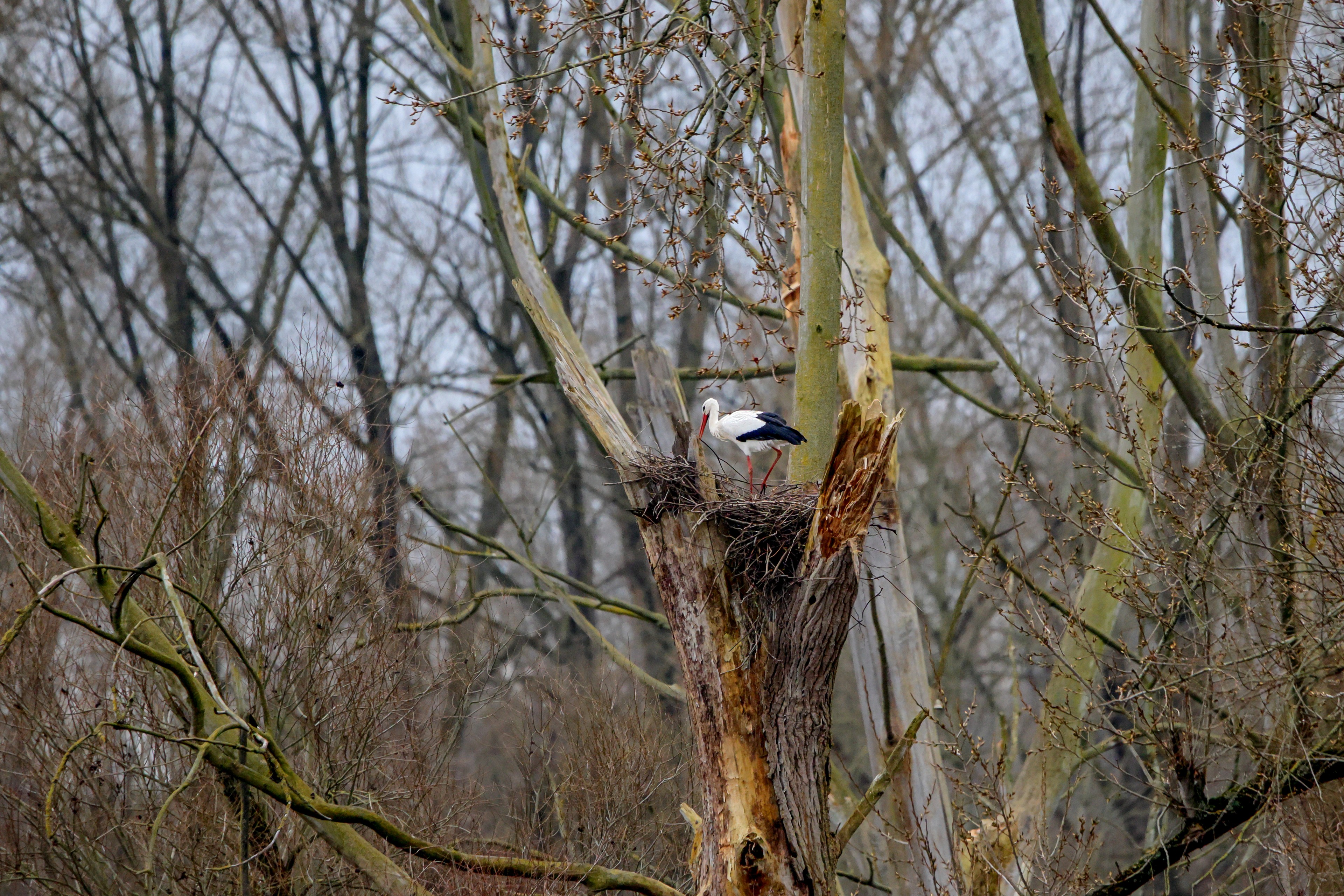 Das Anfang des Winters durch einen Sturm zerstörte Storchenest im Bereich der Beobachtungshütte II muss nun durch das Storchenmännchen eine Etage tiefer, in den Überresten des abgebrochenen Baumes, wieder aufgebaut werden. Sein etwas später eintreffendes Storchenweibchen wird seine Fleißarbeit mit goßer Zuneigung belohnen.
