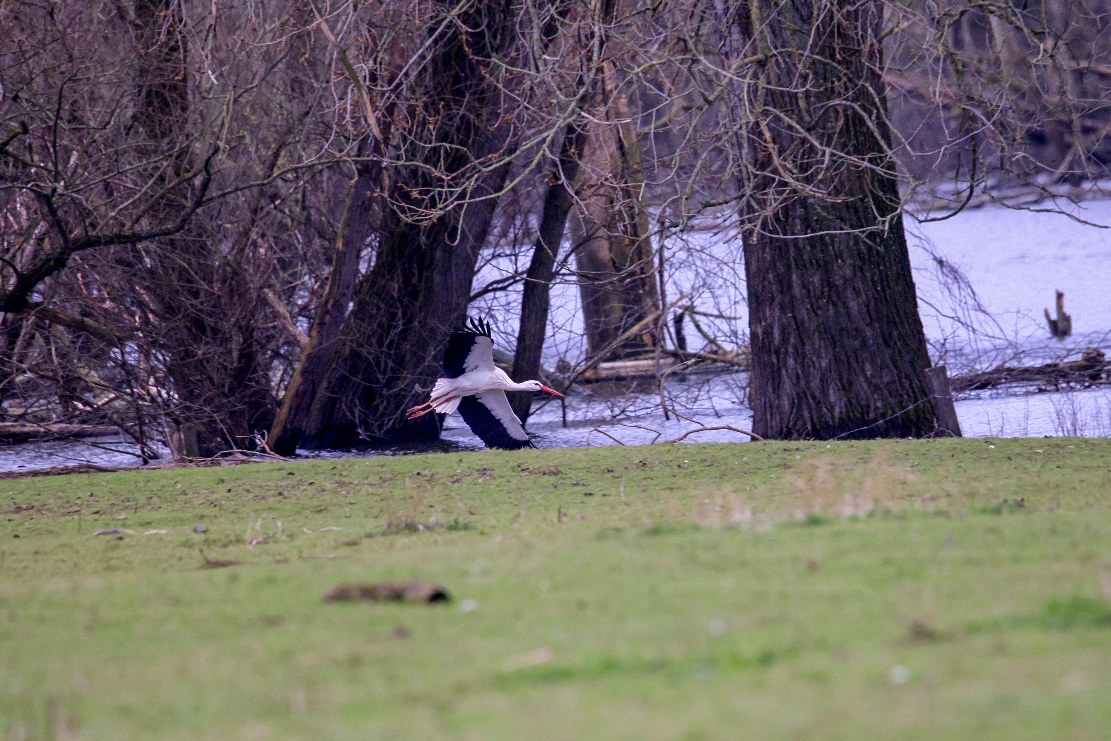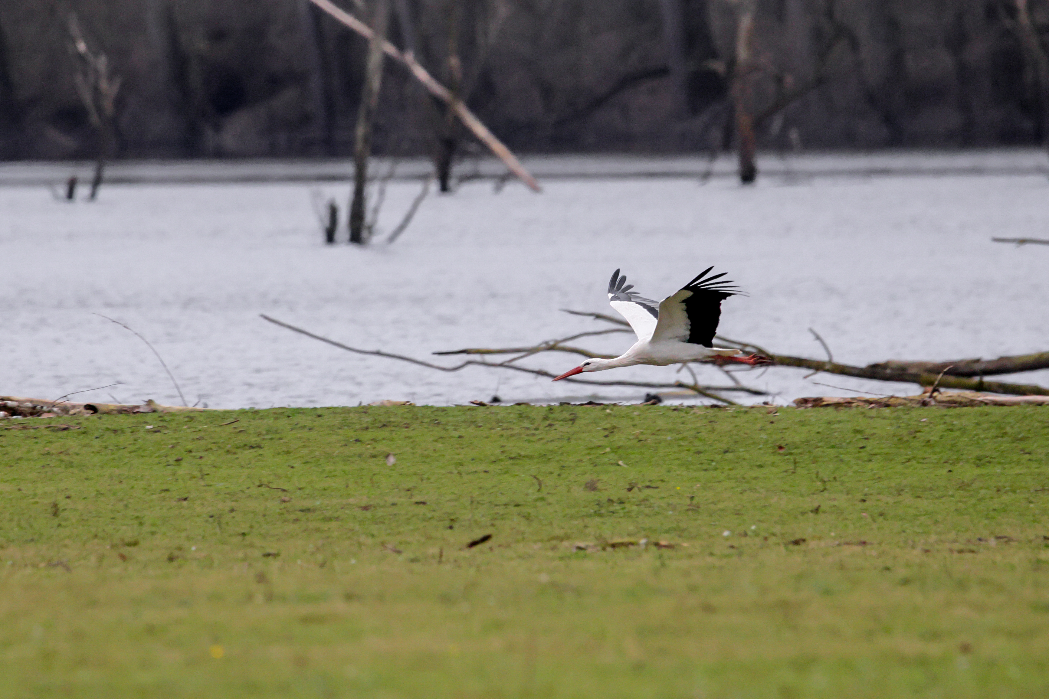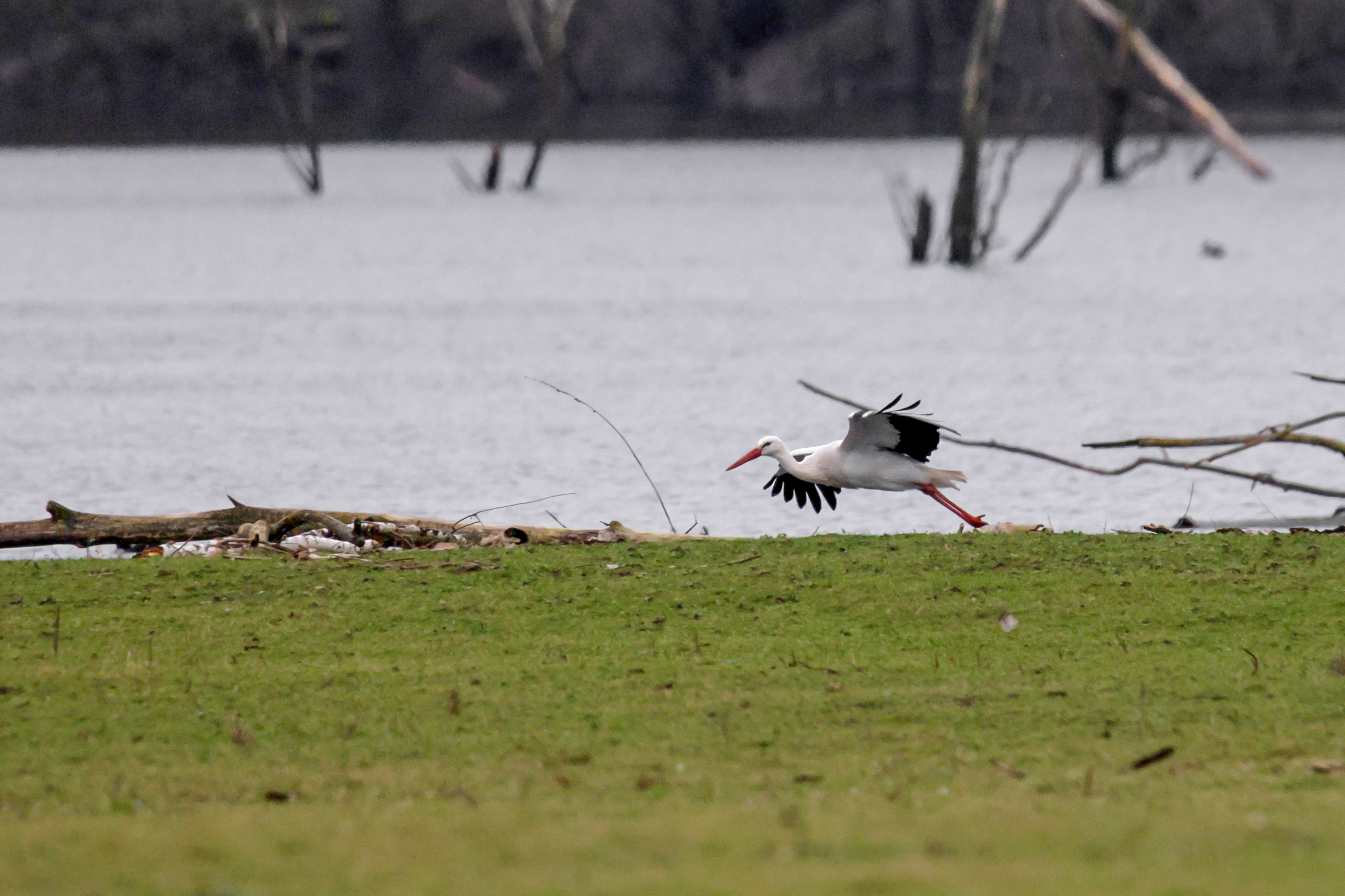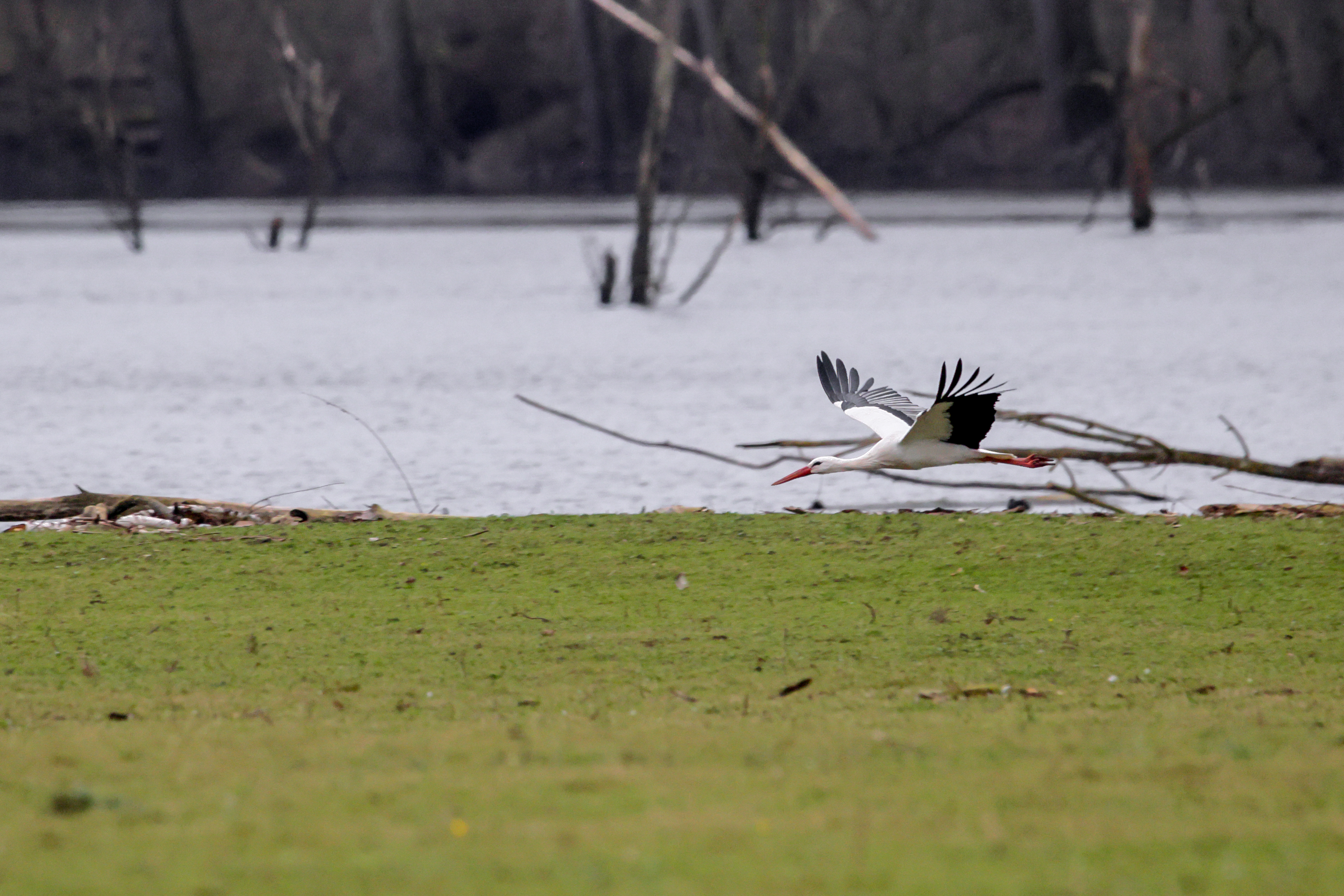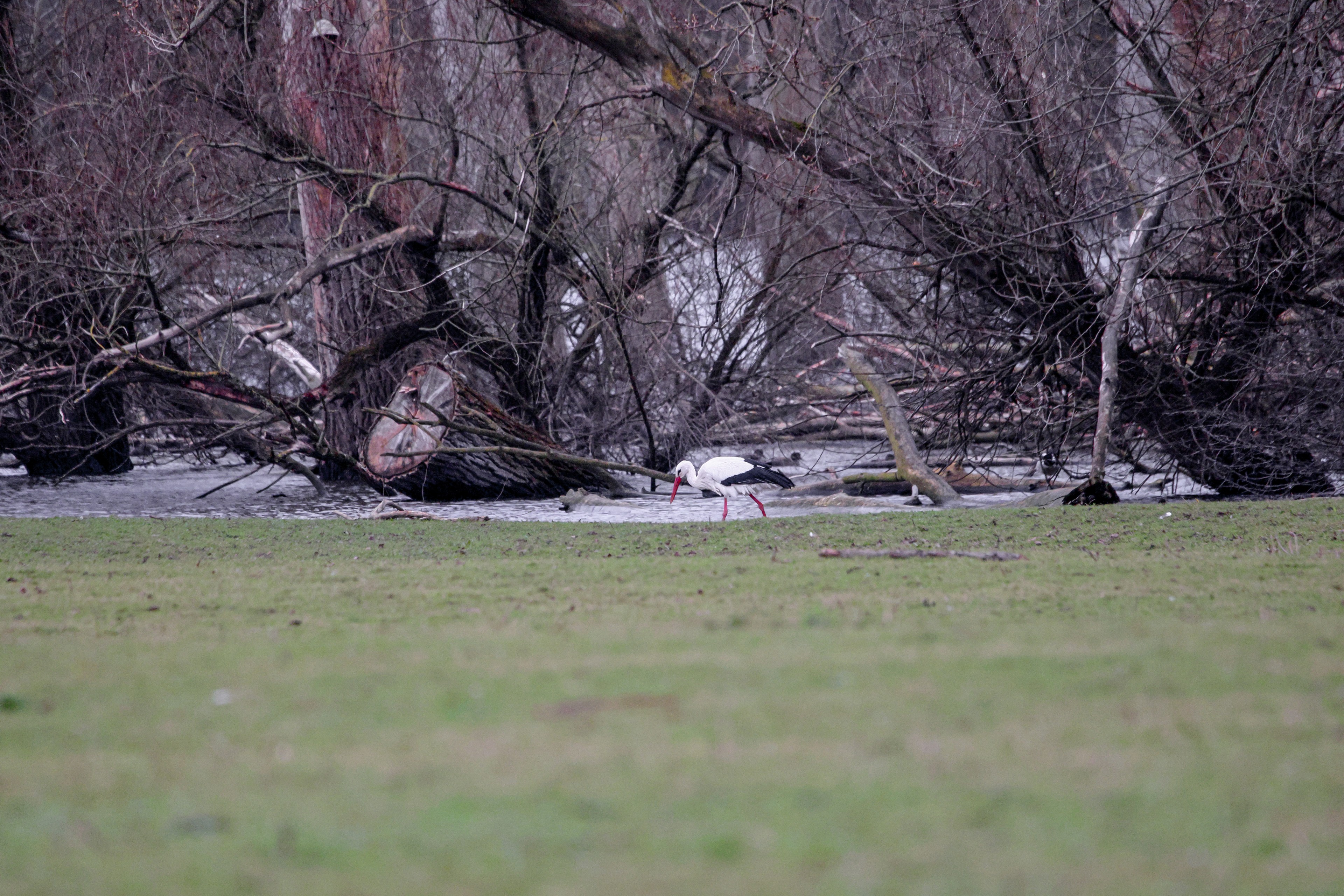 Das Anfang des Winters durch einen Sturm zerstörte Storchenest im Bereich der Beobachtungshütte II muss nun durch das Storchenmännchen eine Etage tiefer, in den Überresten des abgebrochenen Baumes, wieder aufgebaut werden. Sein etwas später eintreffendes Storchenweibchen wird seine Fleißarbeit mit goßer Zuneigung belohnen.