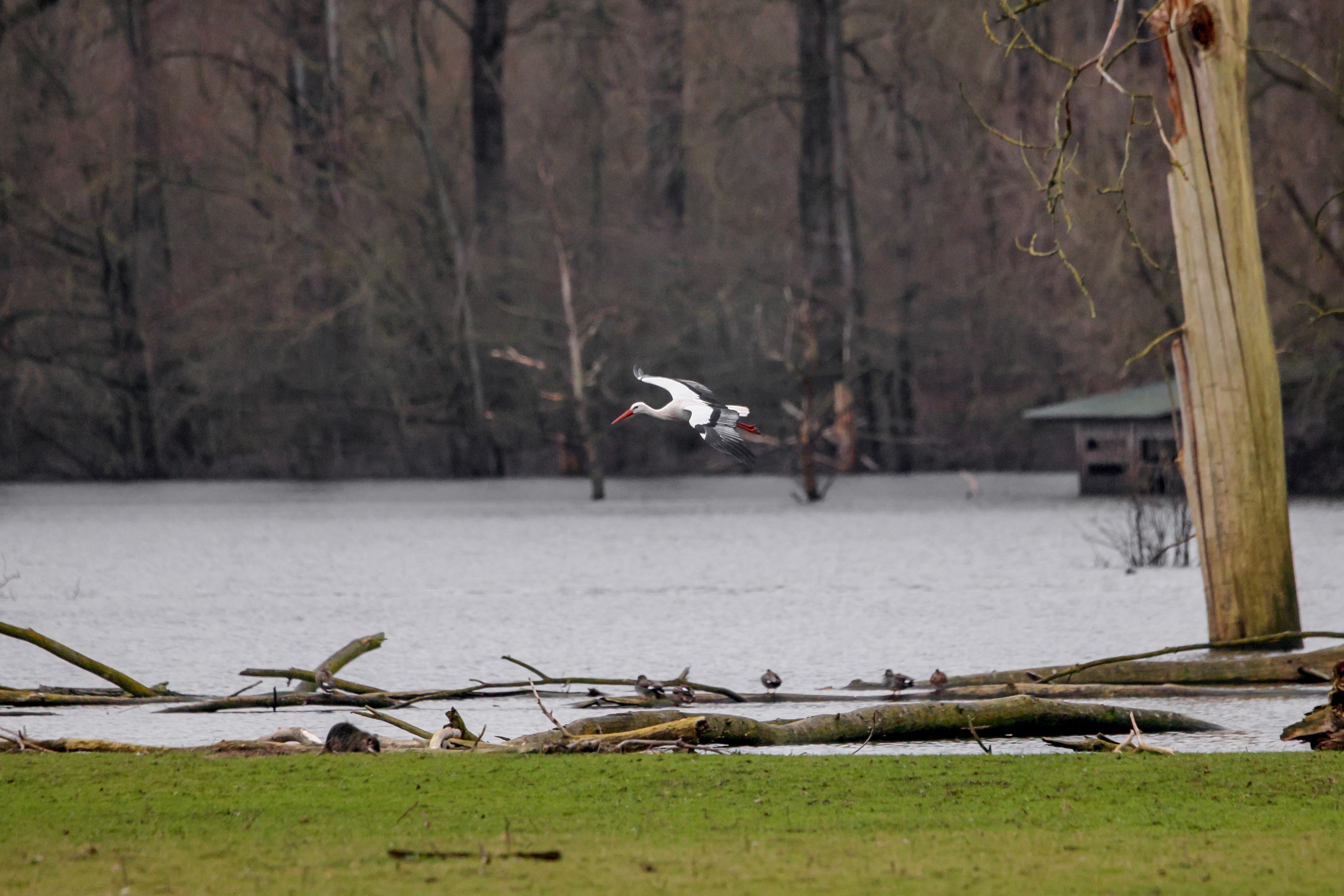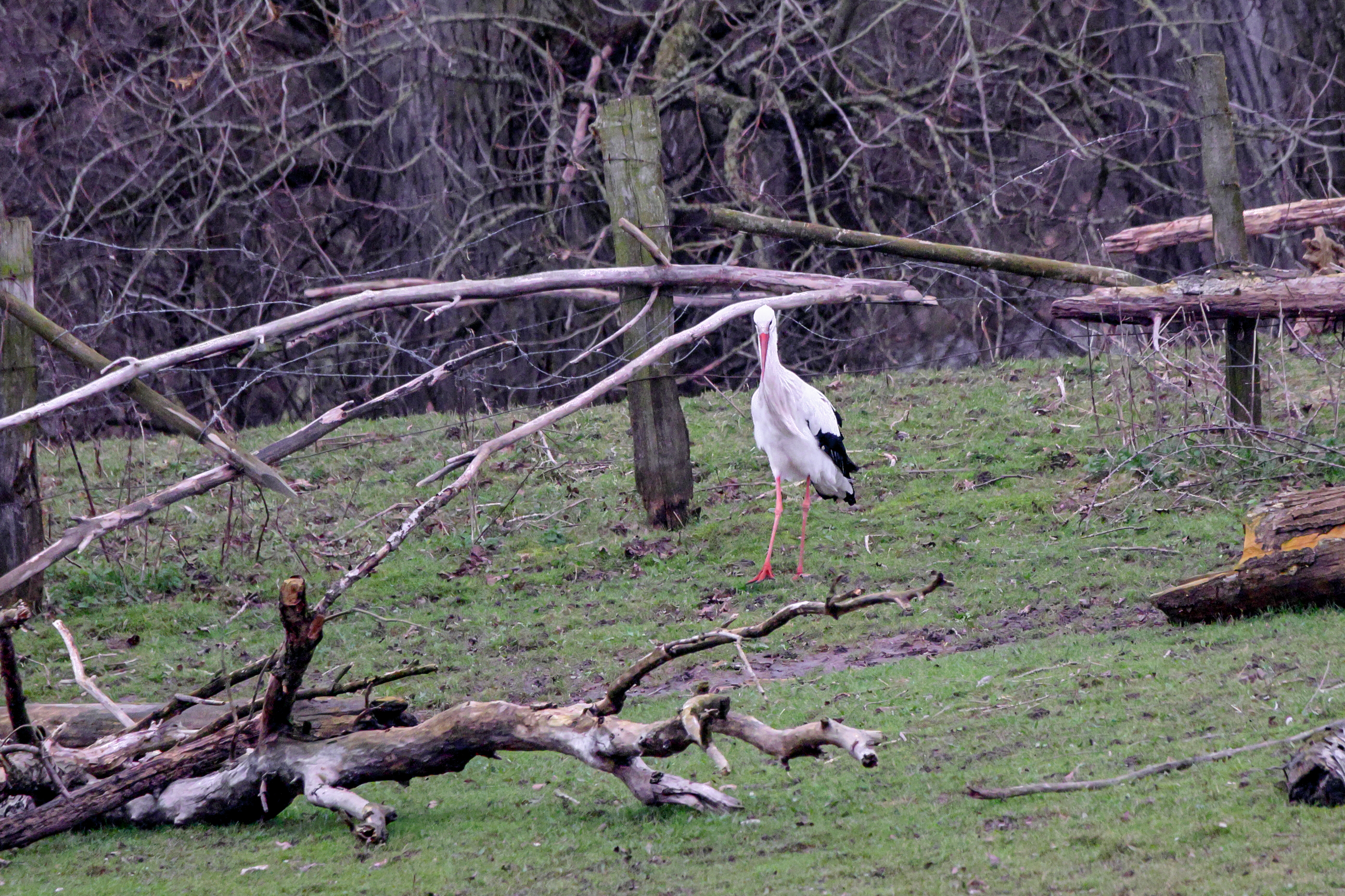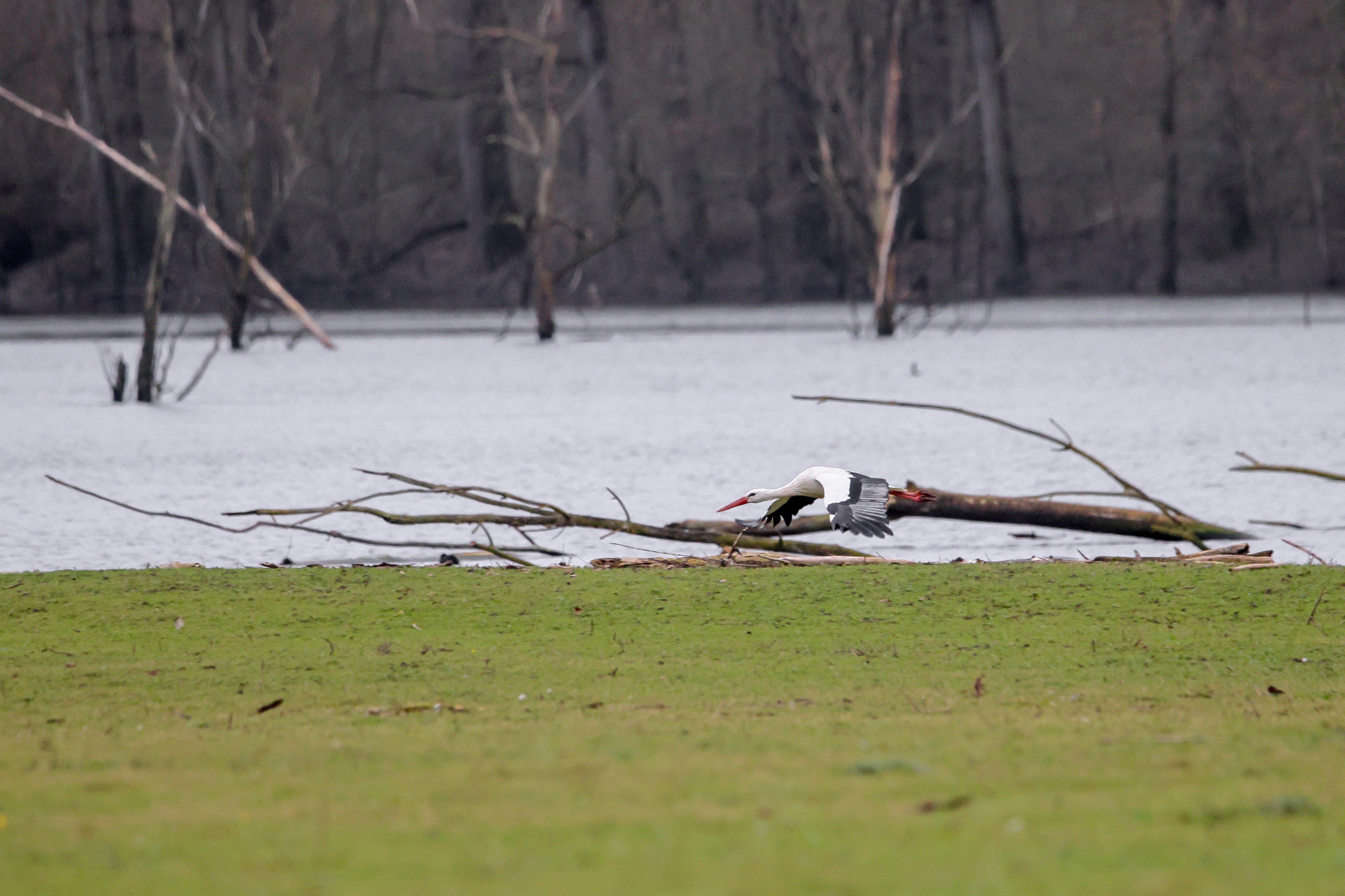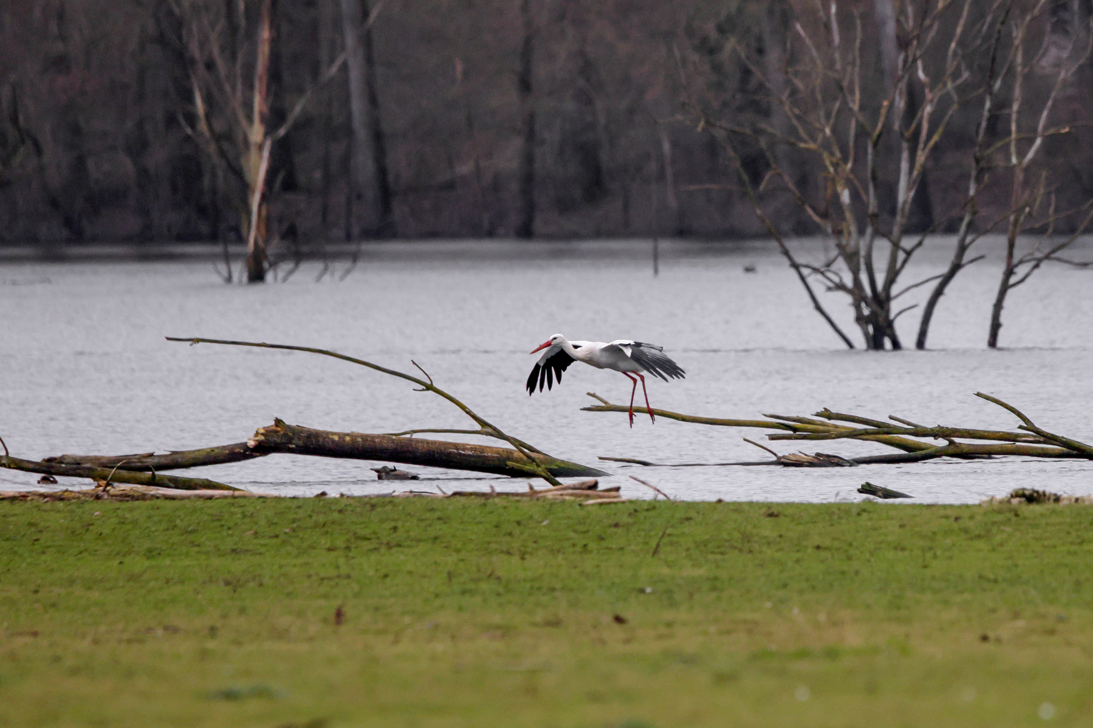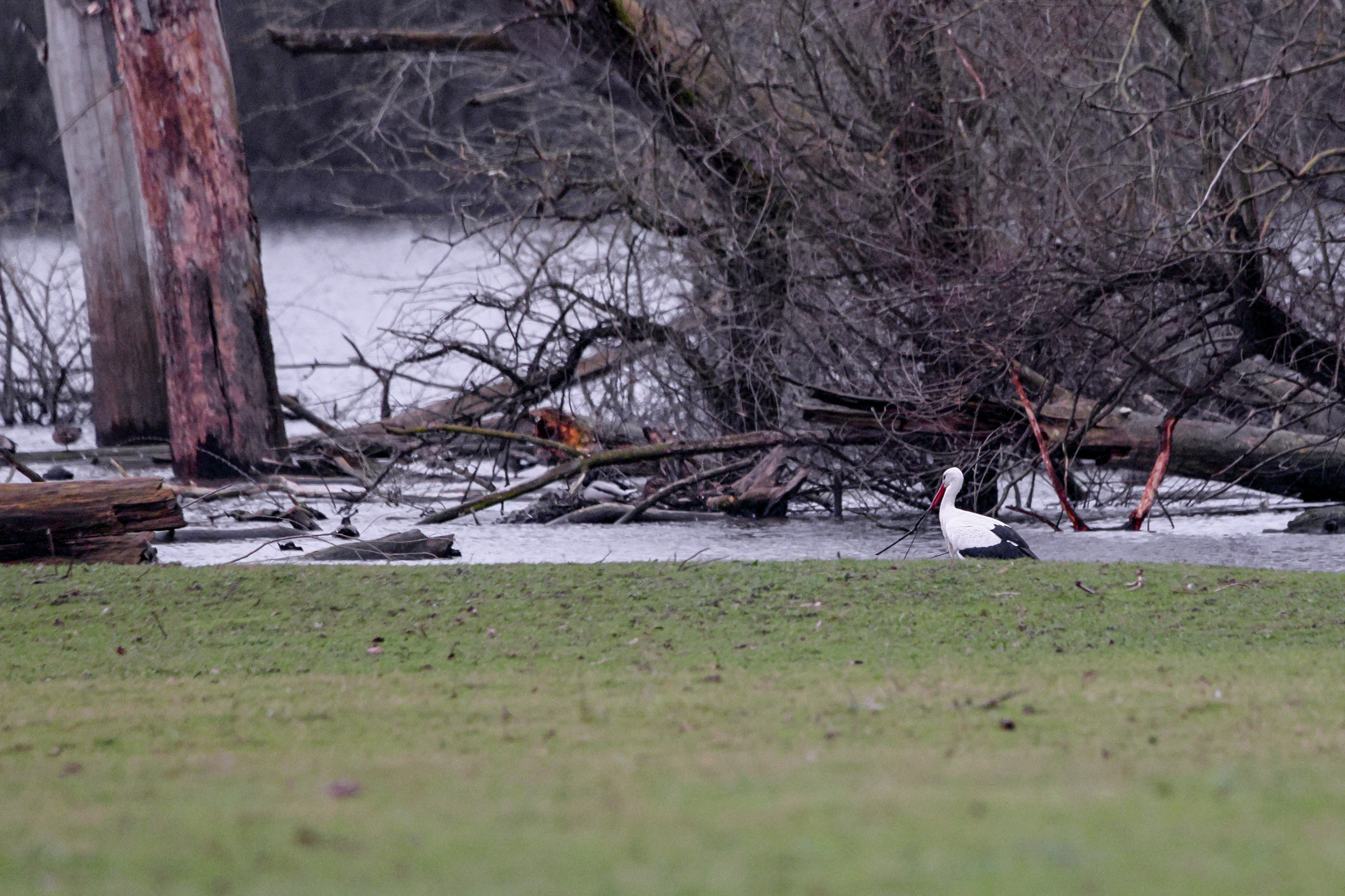 Das Anfang des Winters durch einen Sturm zerstörte Storchenest im Bereich der Beobachtungshütte II muss nun durch das Storchenmännchen eine Etage tiefer, in den Überresten des abgebrochenen Baumes, wieder aufgebaut werden. Sein etwas später eintreffendes Storchenweibchen wird seine Fleißarbeit mit goßer Zuneigung belohnen.