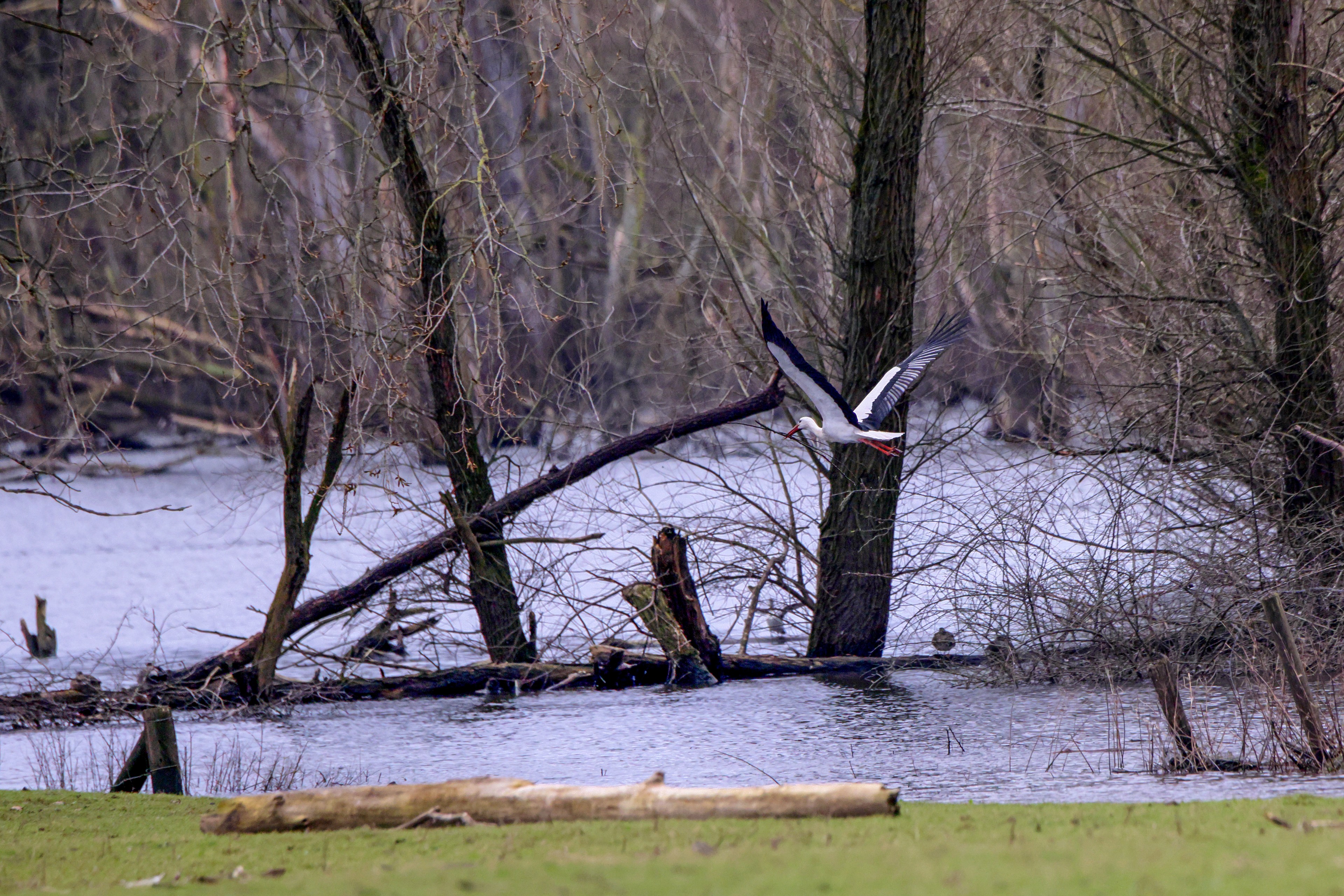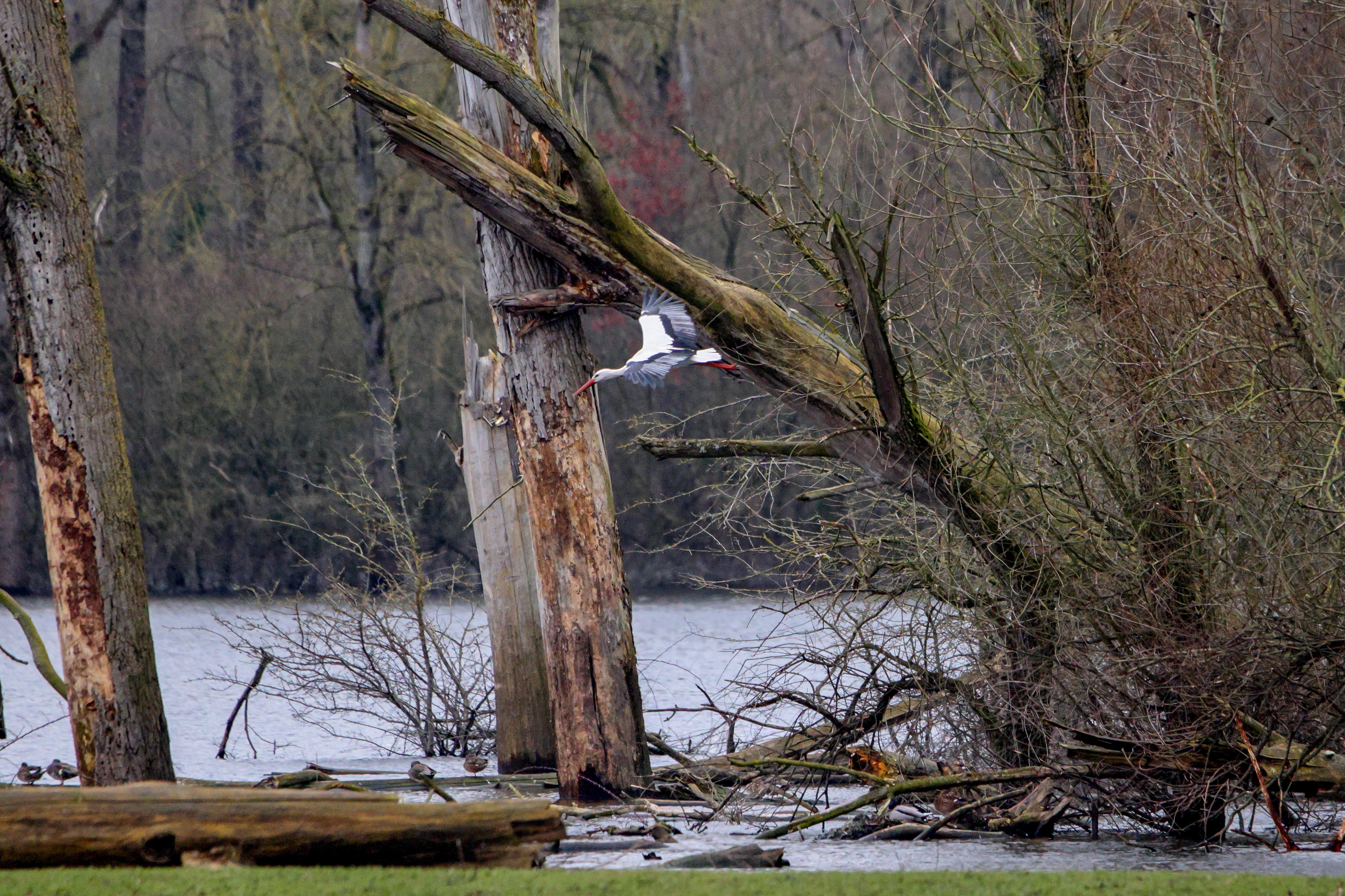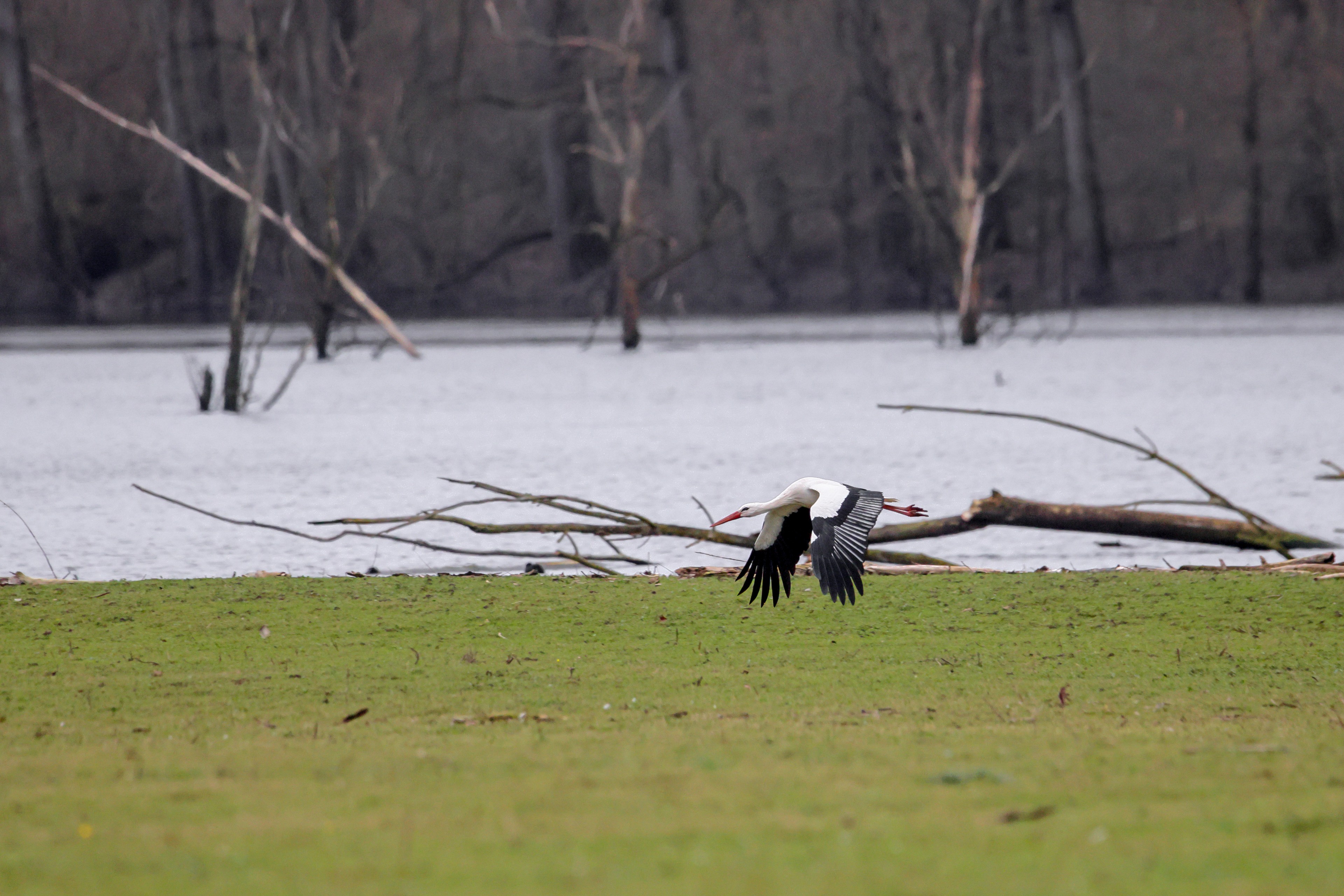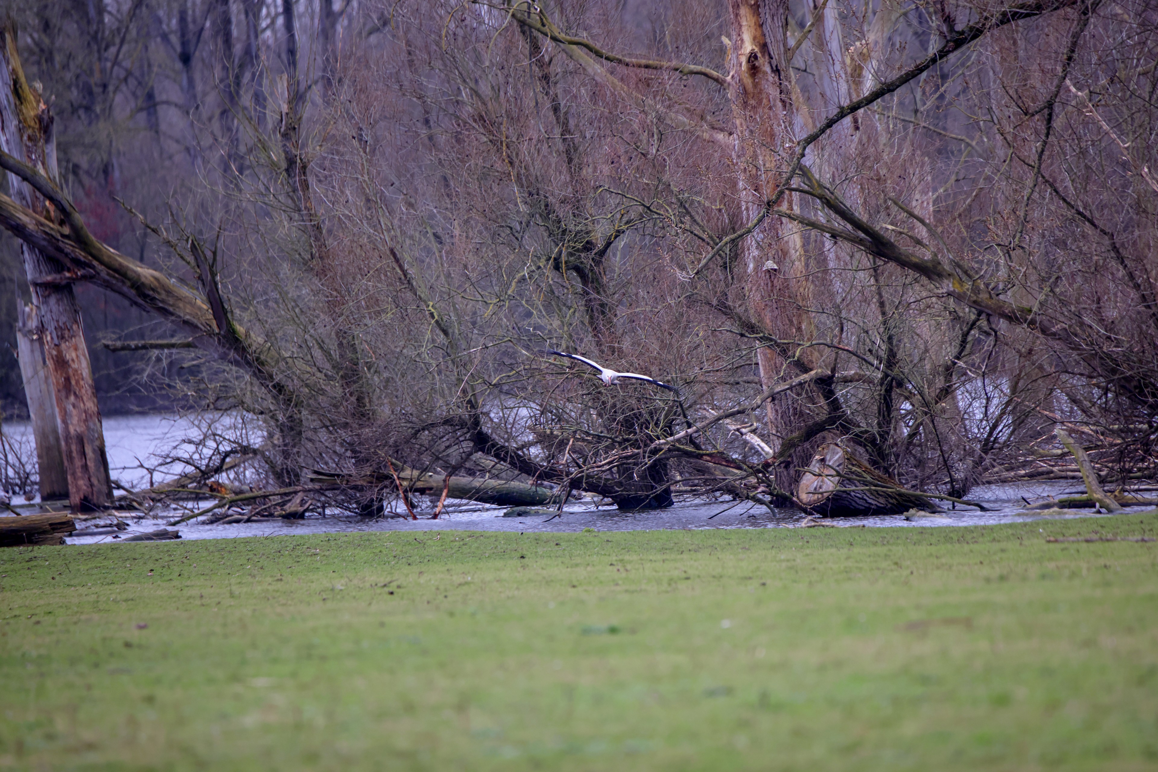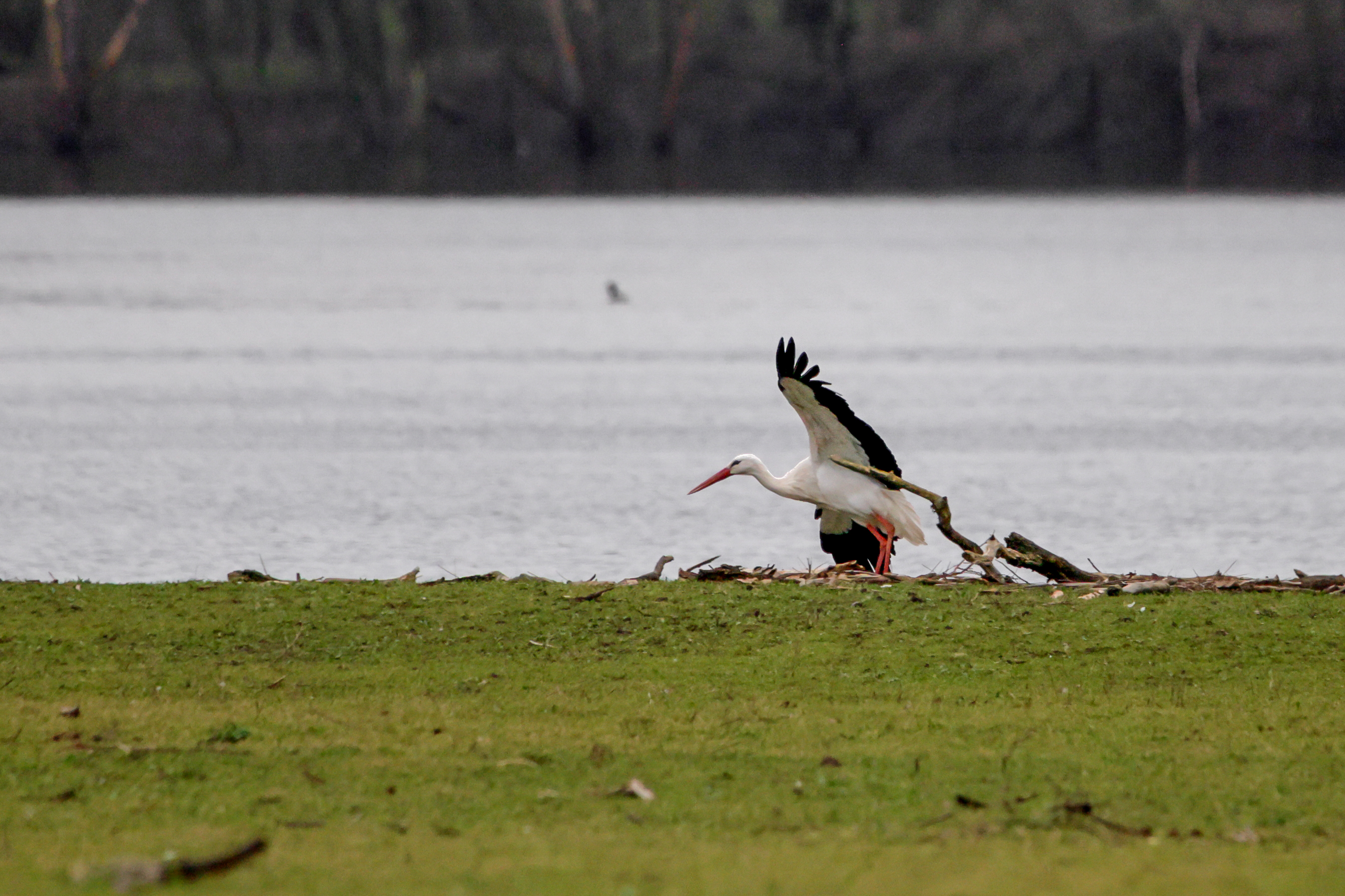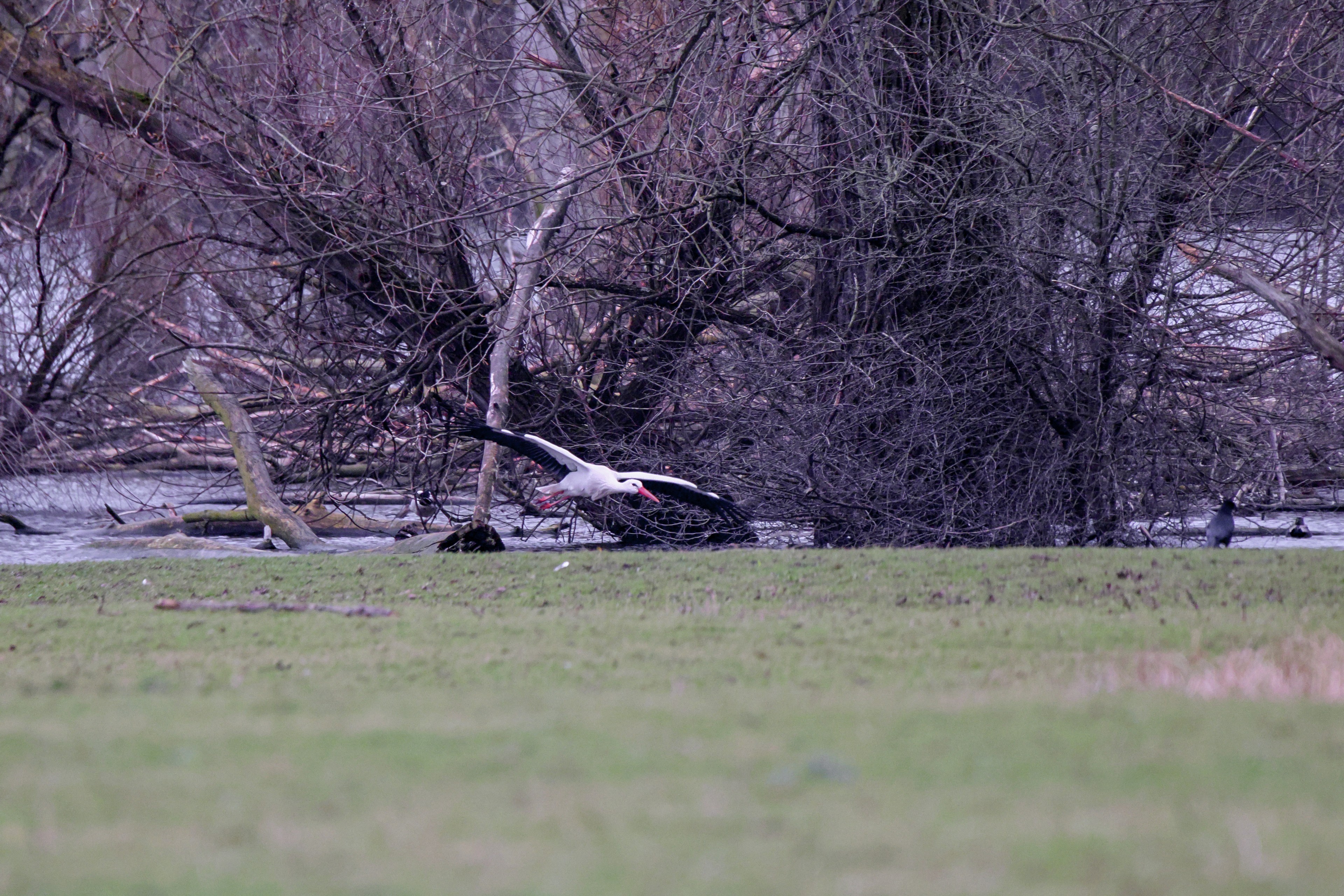 Das Anfang des Winters durch einen Sturm zerstörte Storchenest im Bereich der Beobachtungshütte II muss nun durch das Storchenmännchen eine Etage tiefer, in den Überresten des abgebrochenen Baumes, wieder aufgebaut werden. Sein etwas später eintreffendes Storchenweibchen wird seine Fleißarbeit mit goßer Zuneigung belohnen.