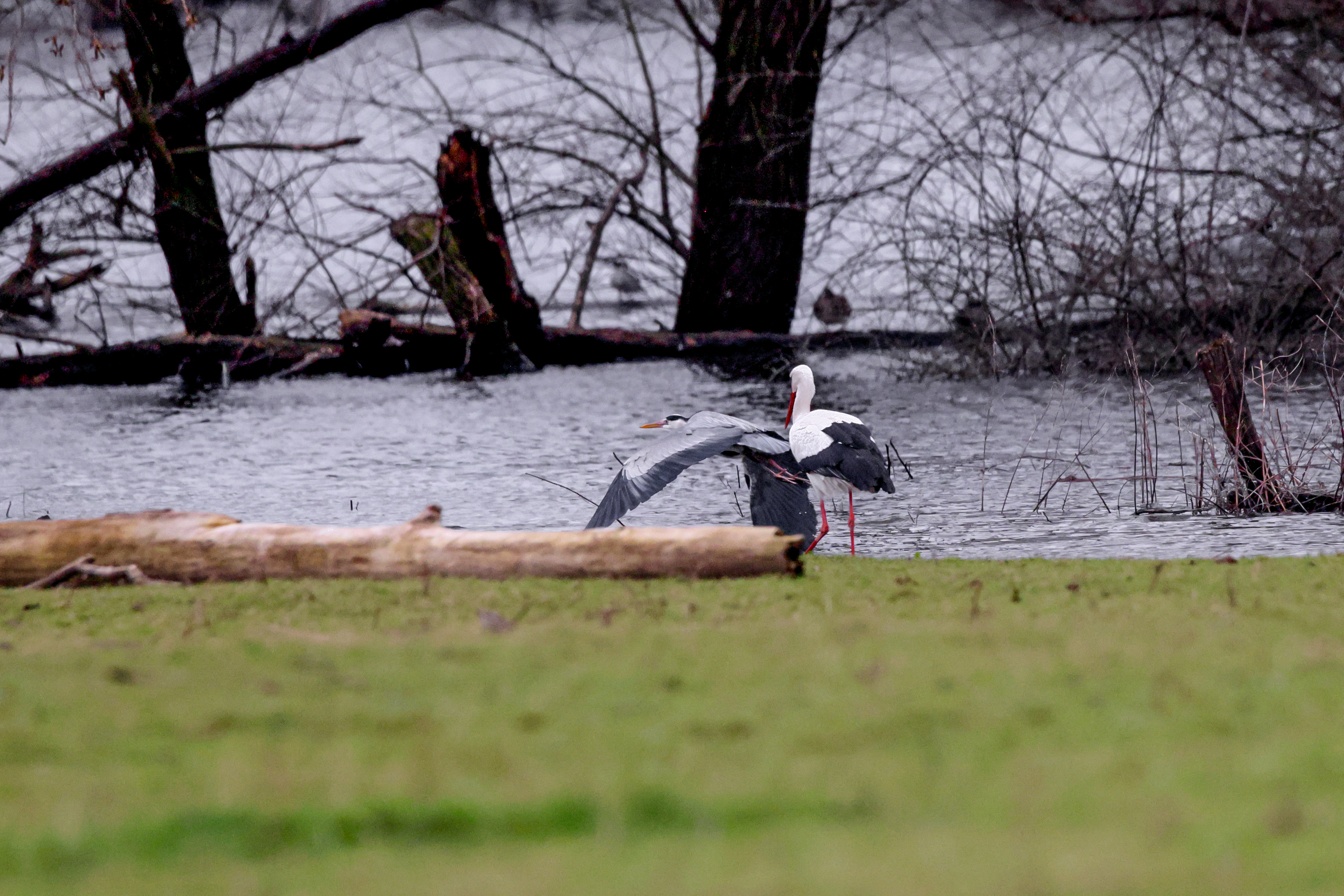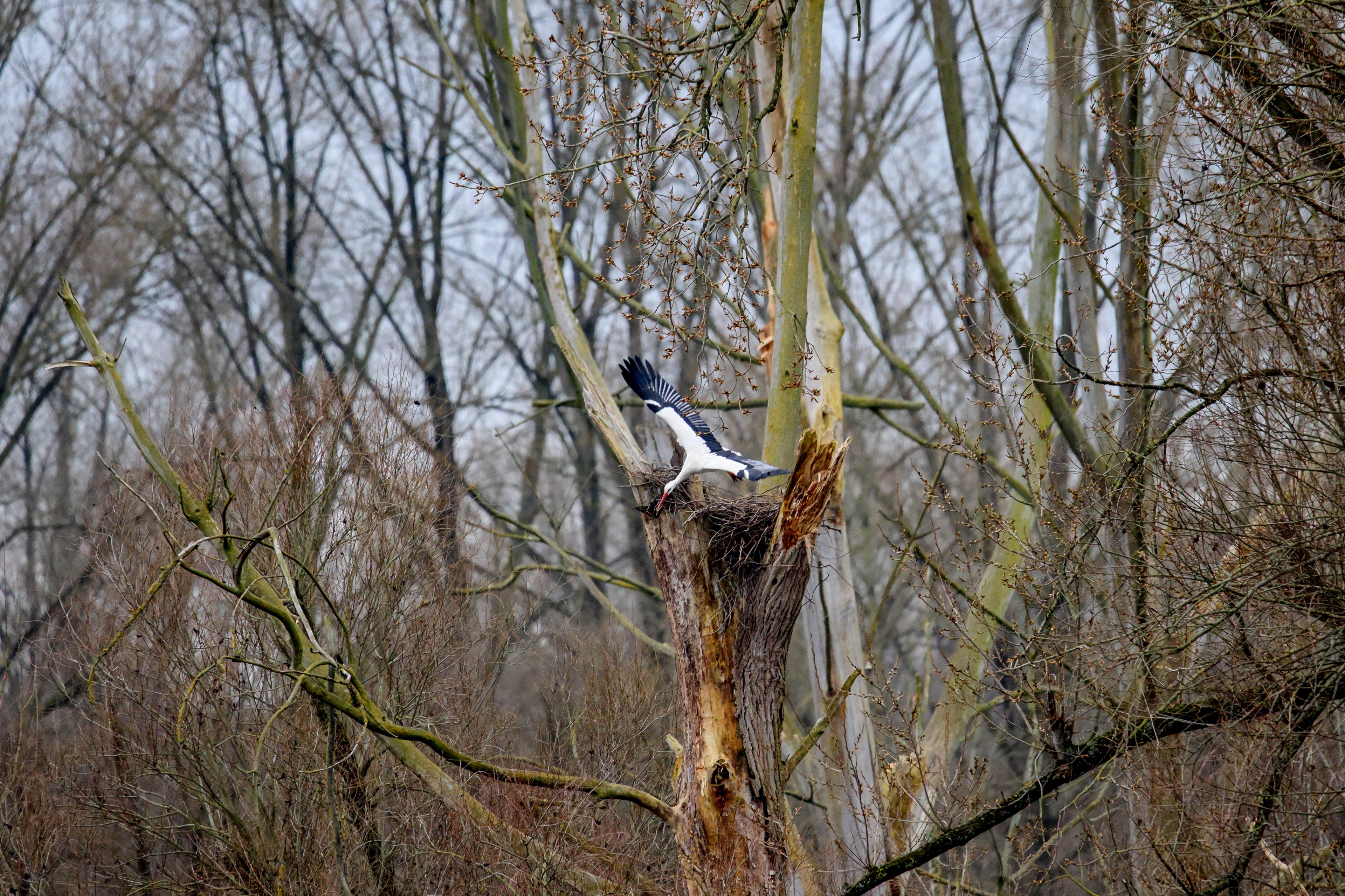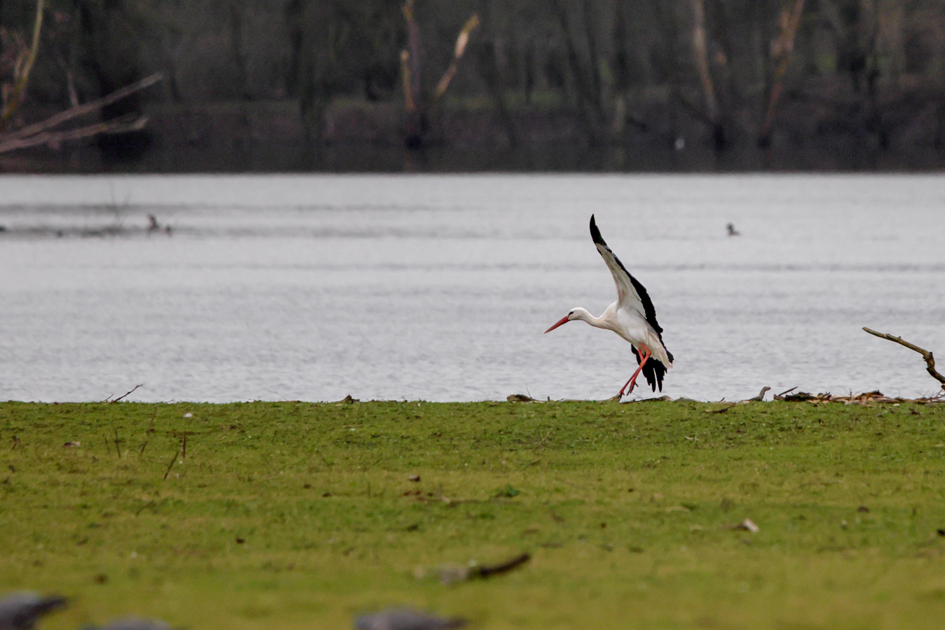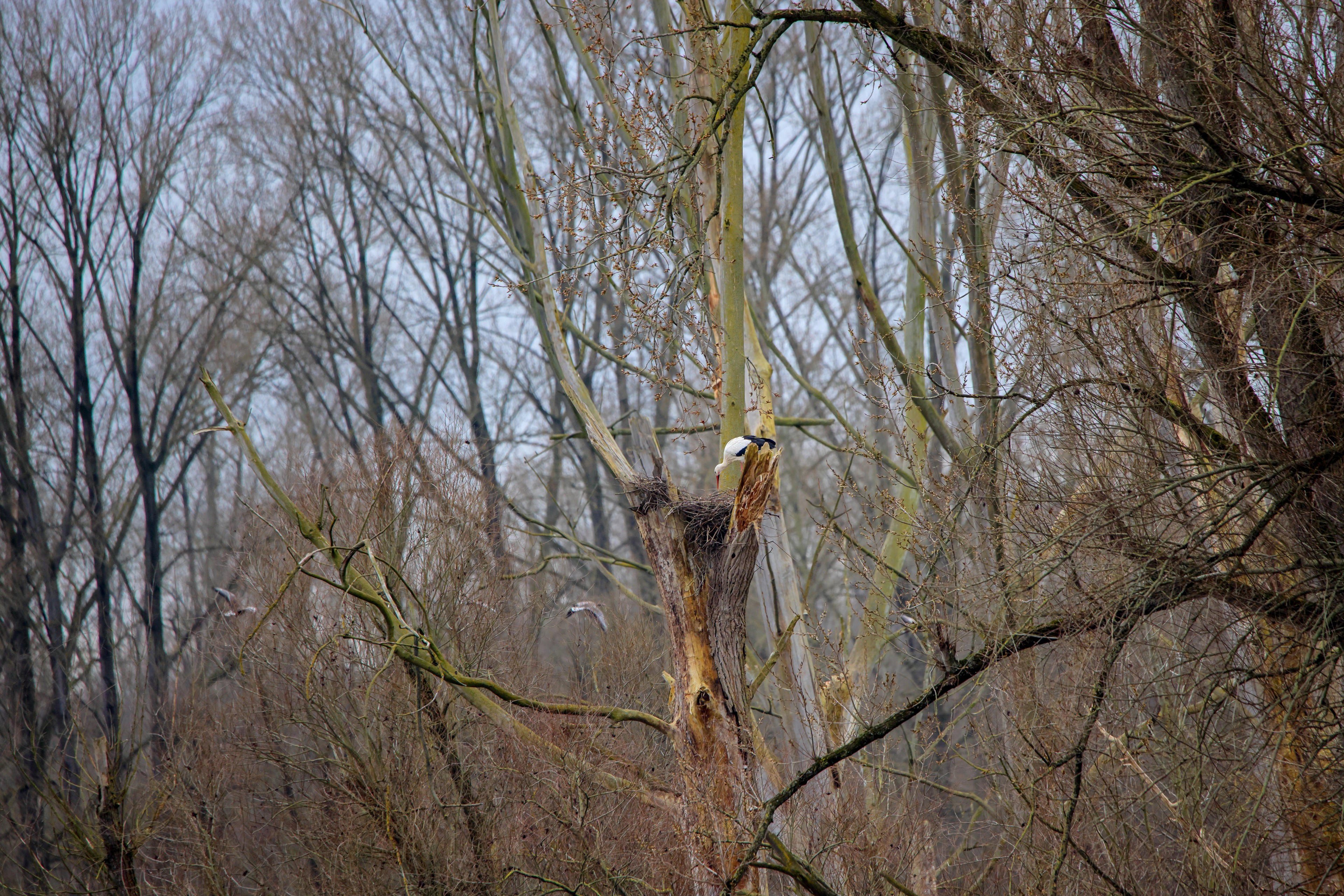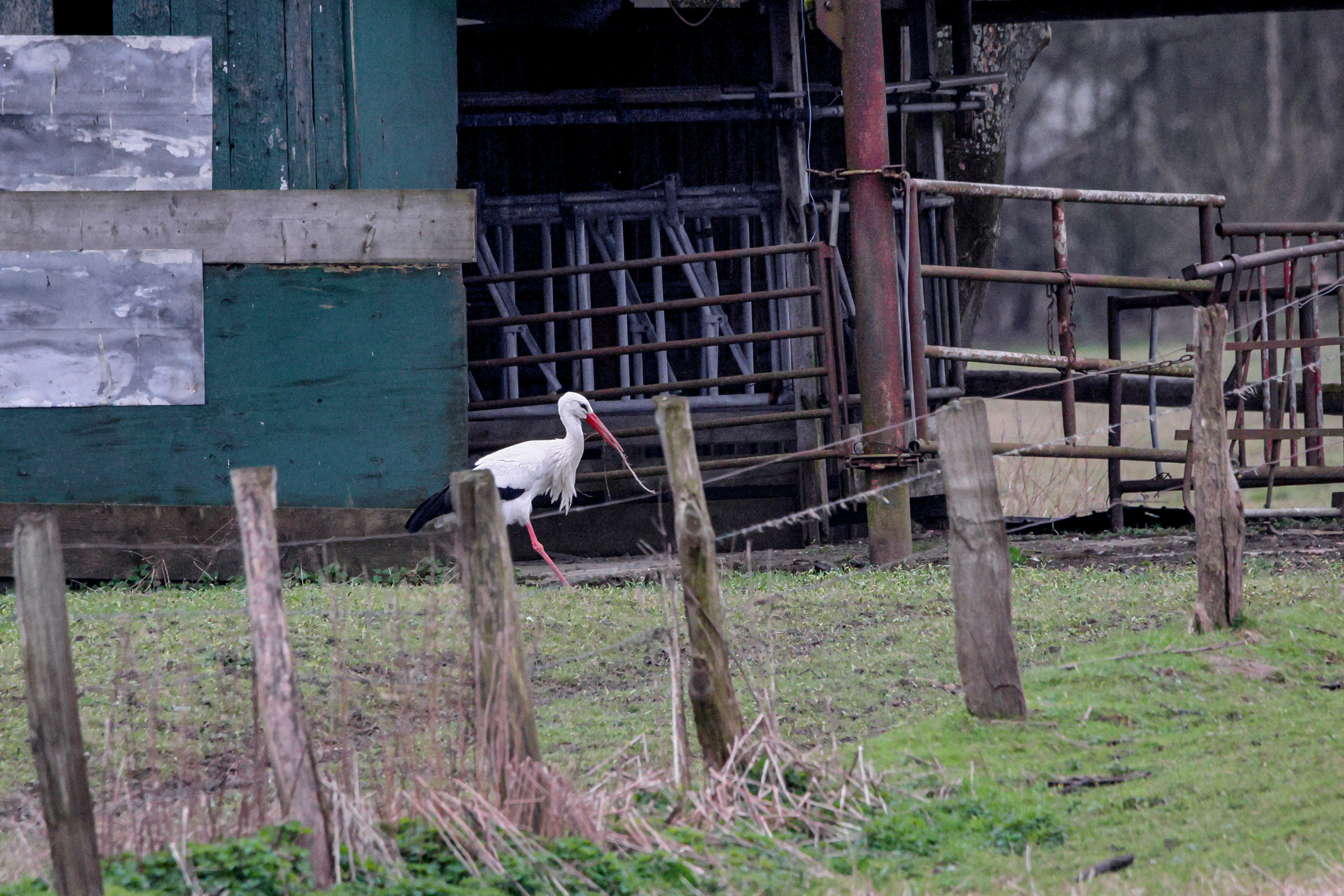 Das Anfang des Winters durch einen Sturm zerstörte Storchenest im Bereich der Beobachtungshütte II muss nun durch das Storchenmännchen eine Etage tiefer, in den Überresten des abgebrochenen Baumes, wieder aufgebaut werden. Sein etwas später eintreffendes Storchenweibchen wird seine Fleißarbeit mit goßer Zuneigung belohnen.