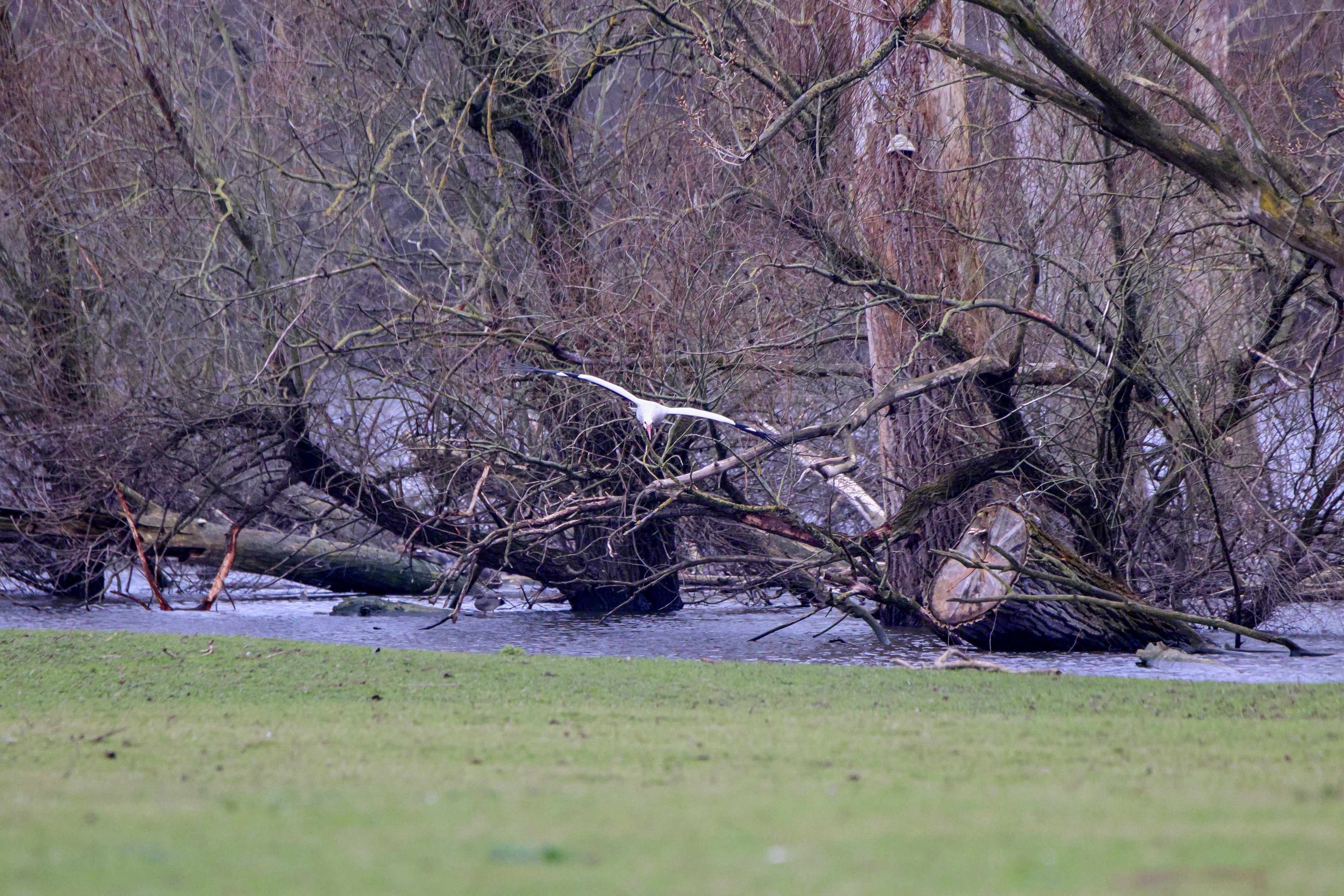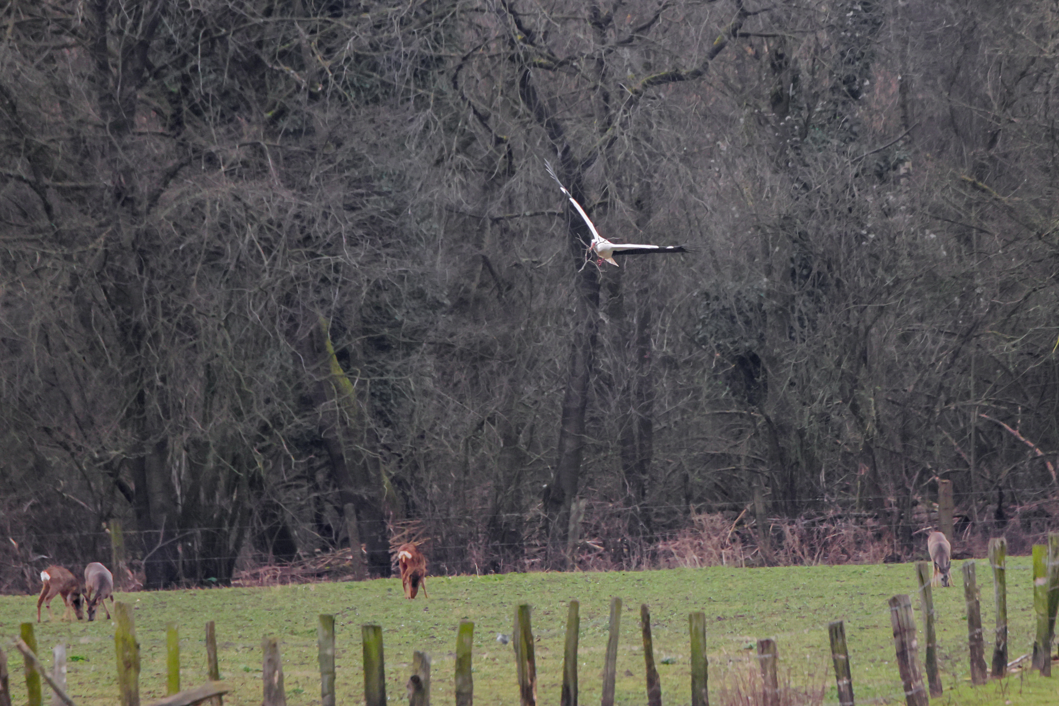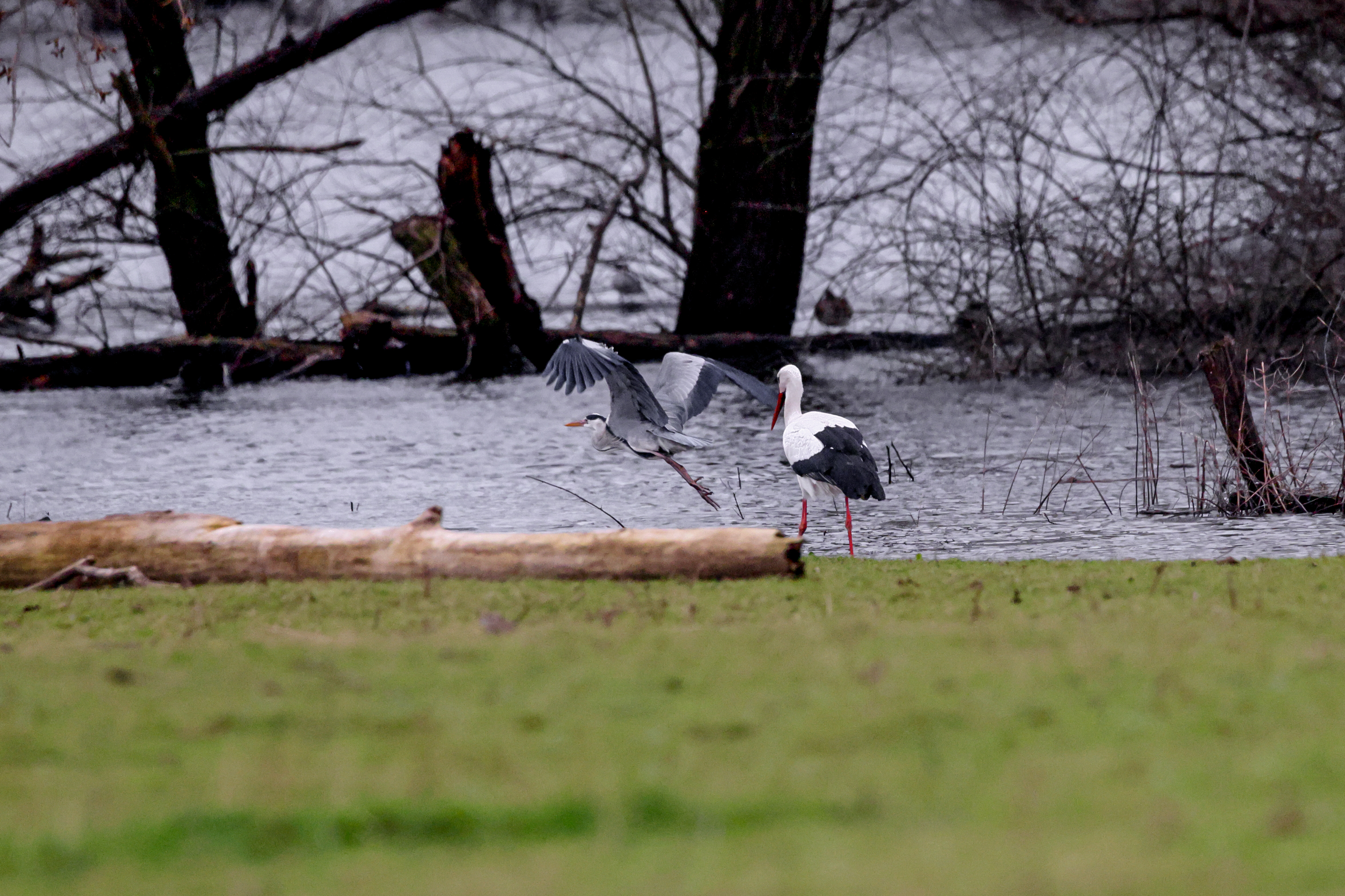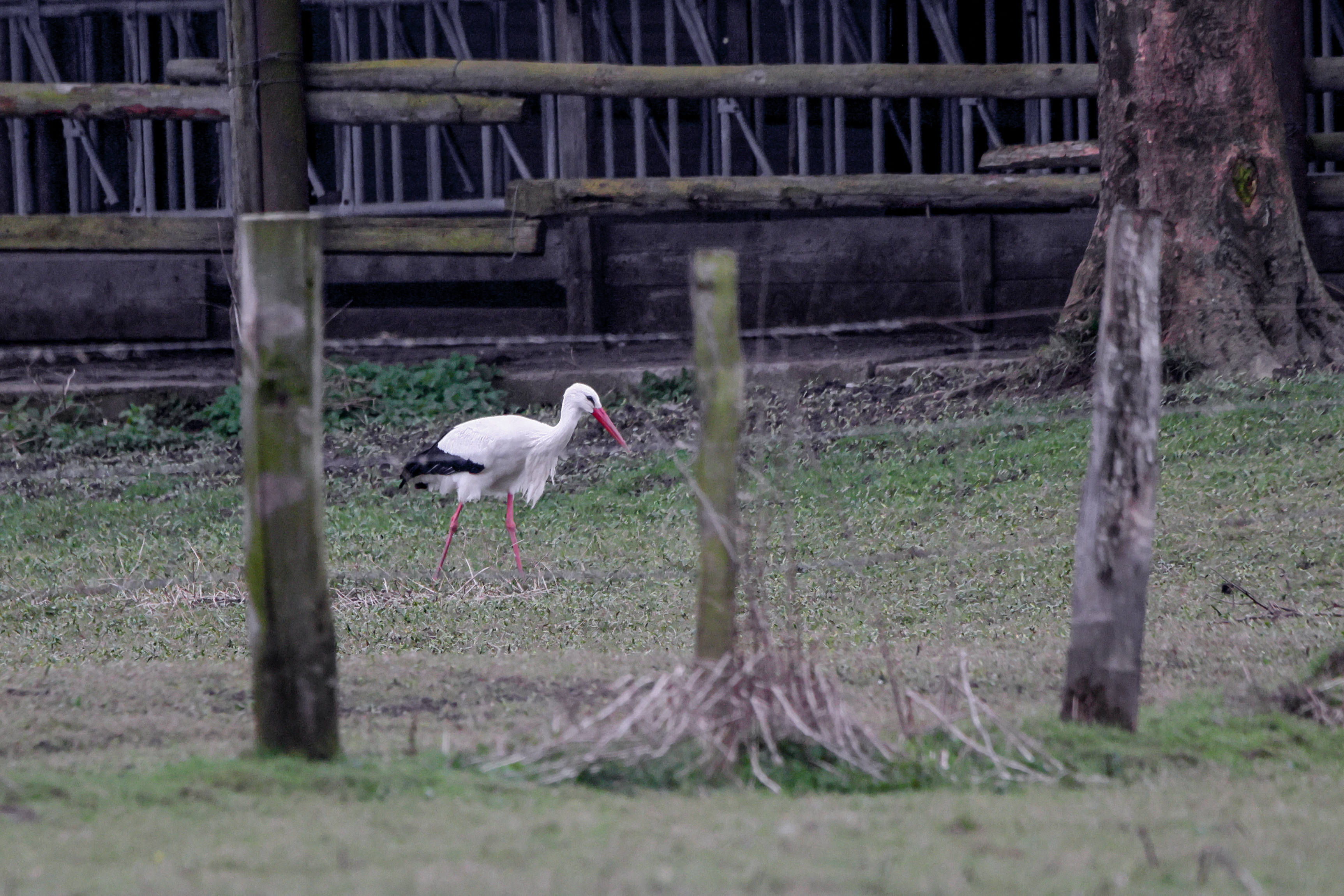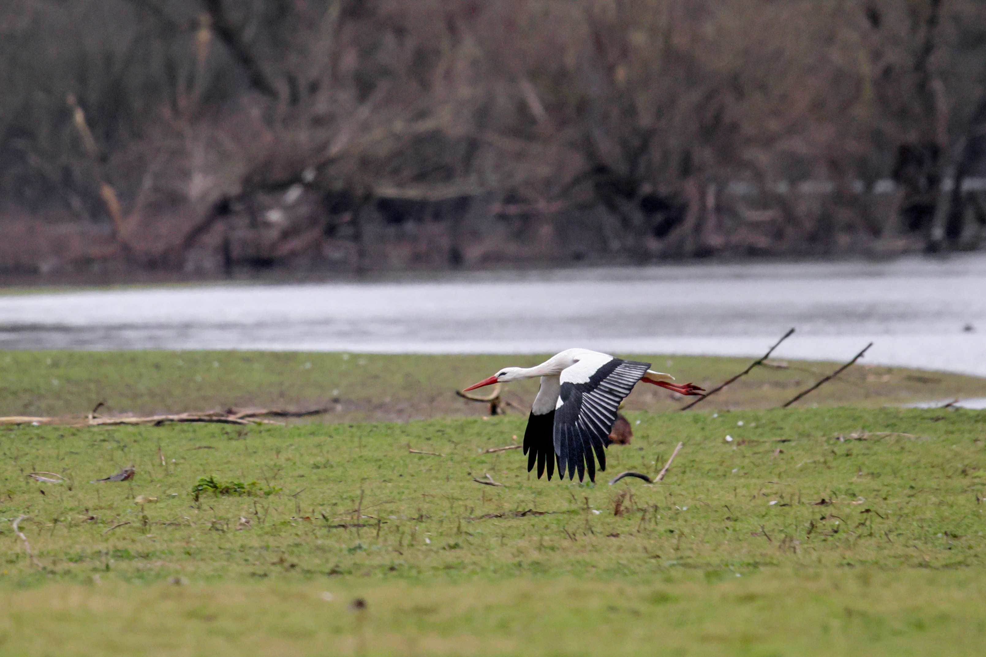 Das Anfang des Winters durch einen Sturm zerstörte Storchenest im Bereich der Beobachtungshütte II muss nun durch das Storchenmännchen eine Etage tiefer, in den Überresten des abgebrochenen Baumes, wieder aufgebaut werden. Sein etwas später eintreffendes Storchenweibchen wird seine Fleißarbeit mit goßer Zuneigung belohnen.