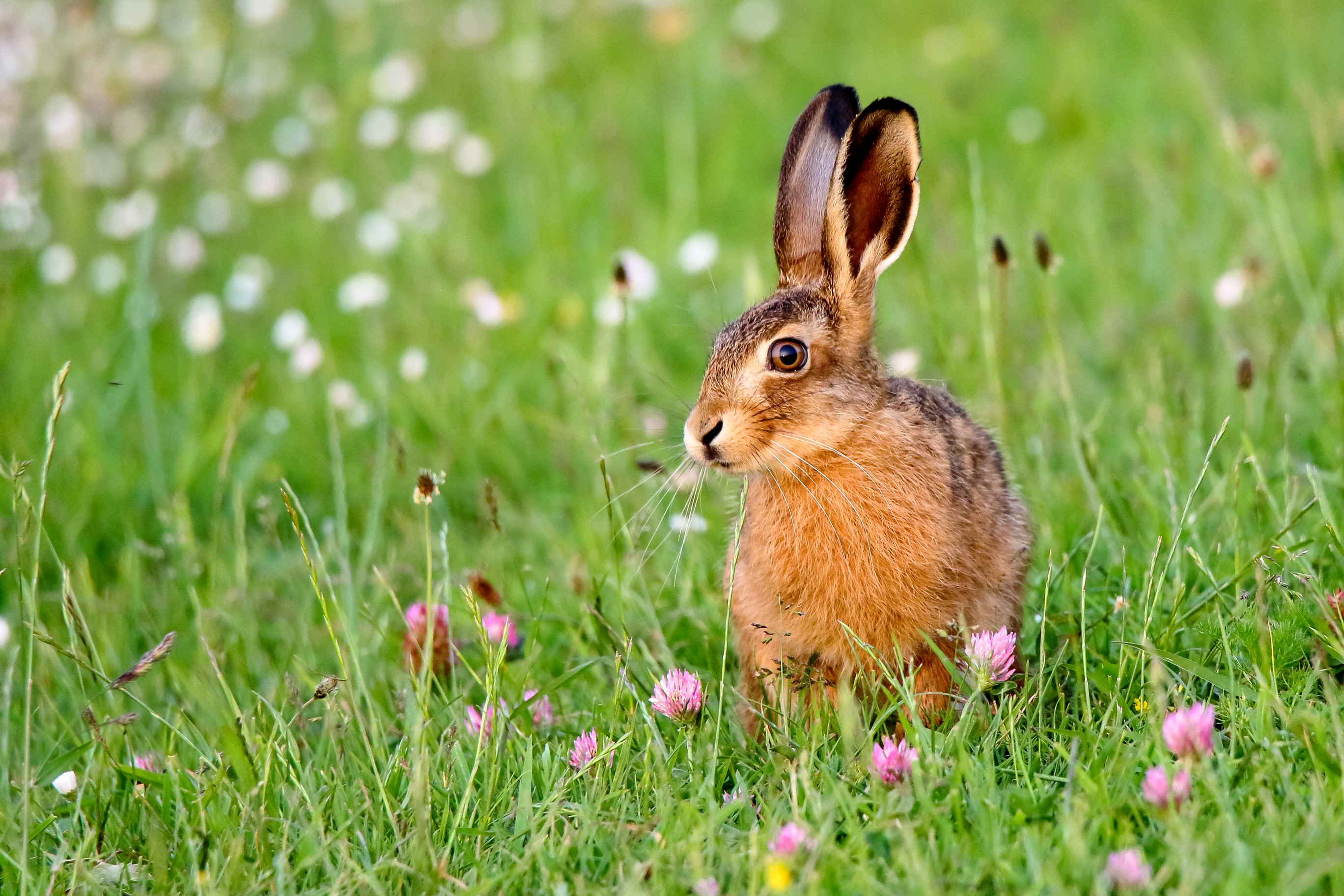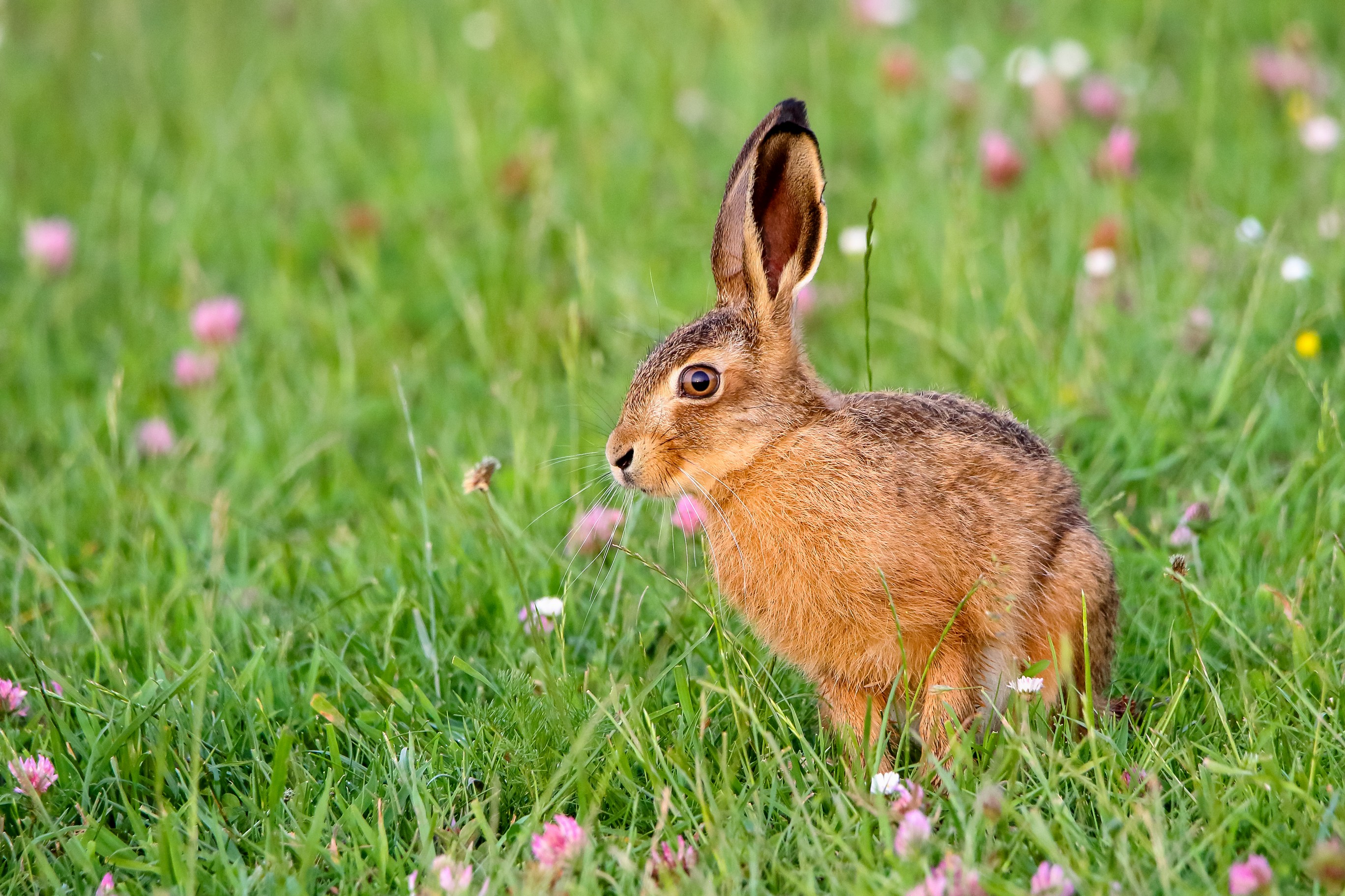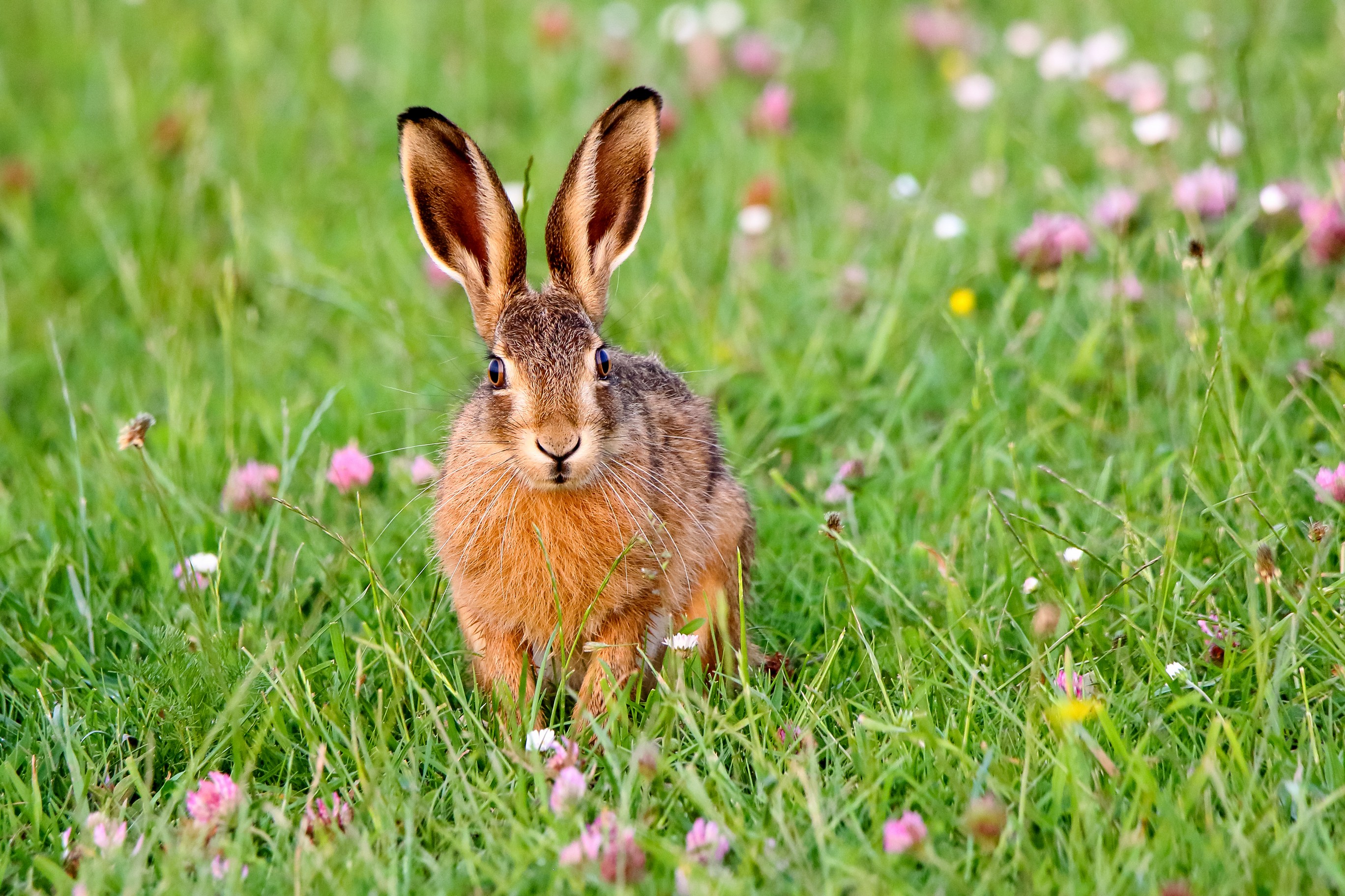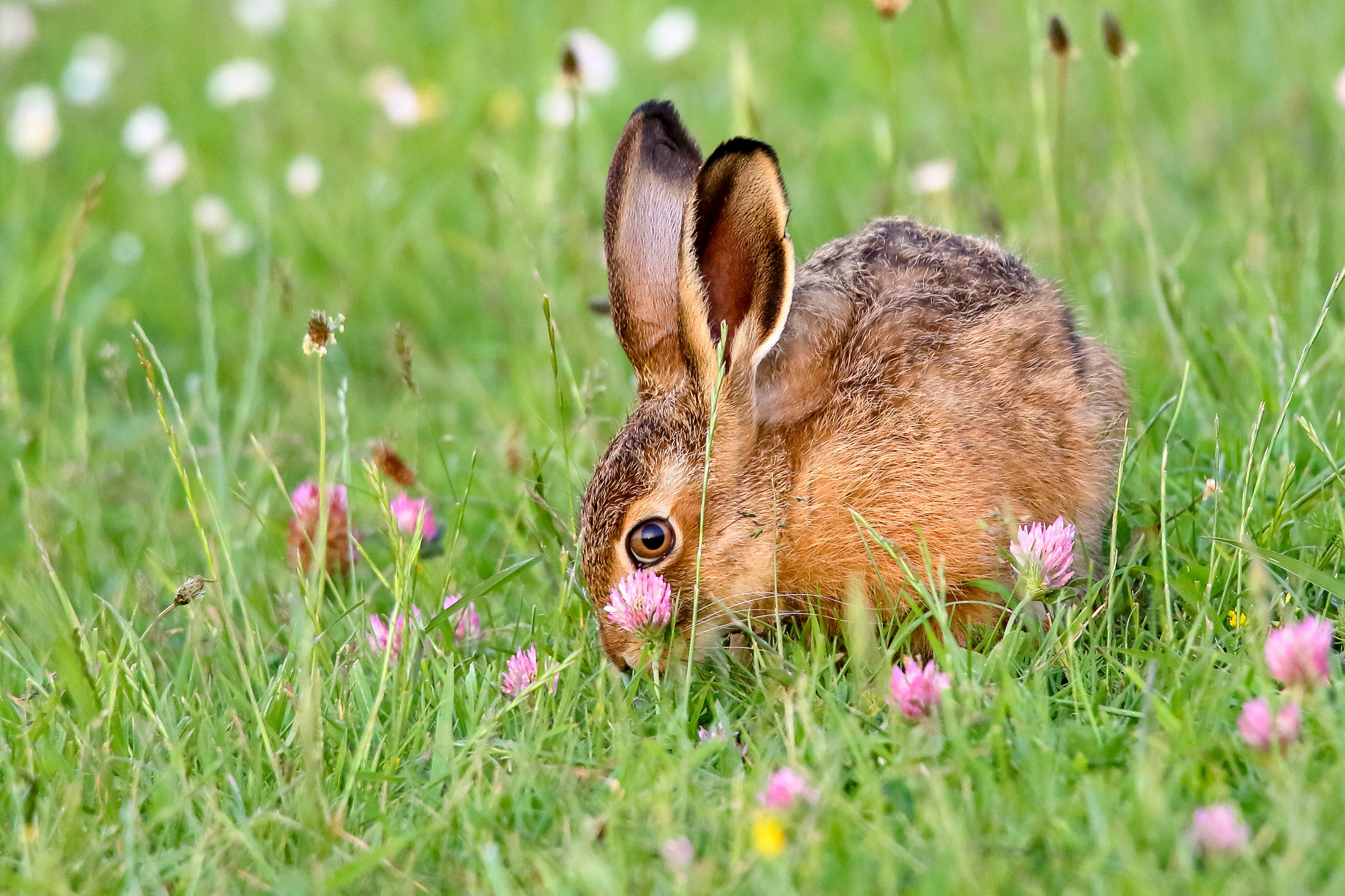 Im späten Sonnenlicht zeigt sich ein Junghase